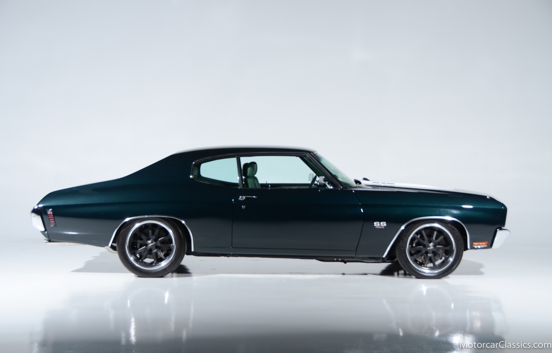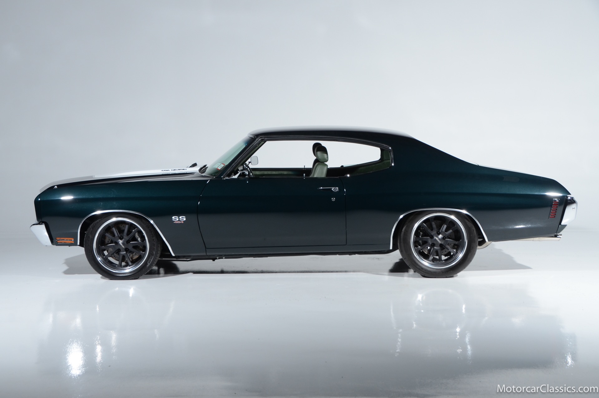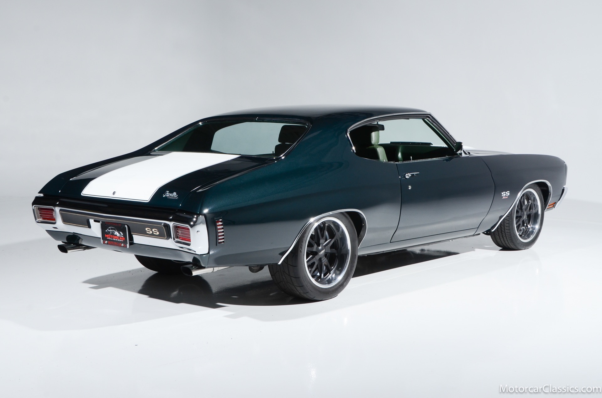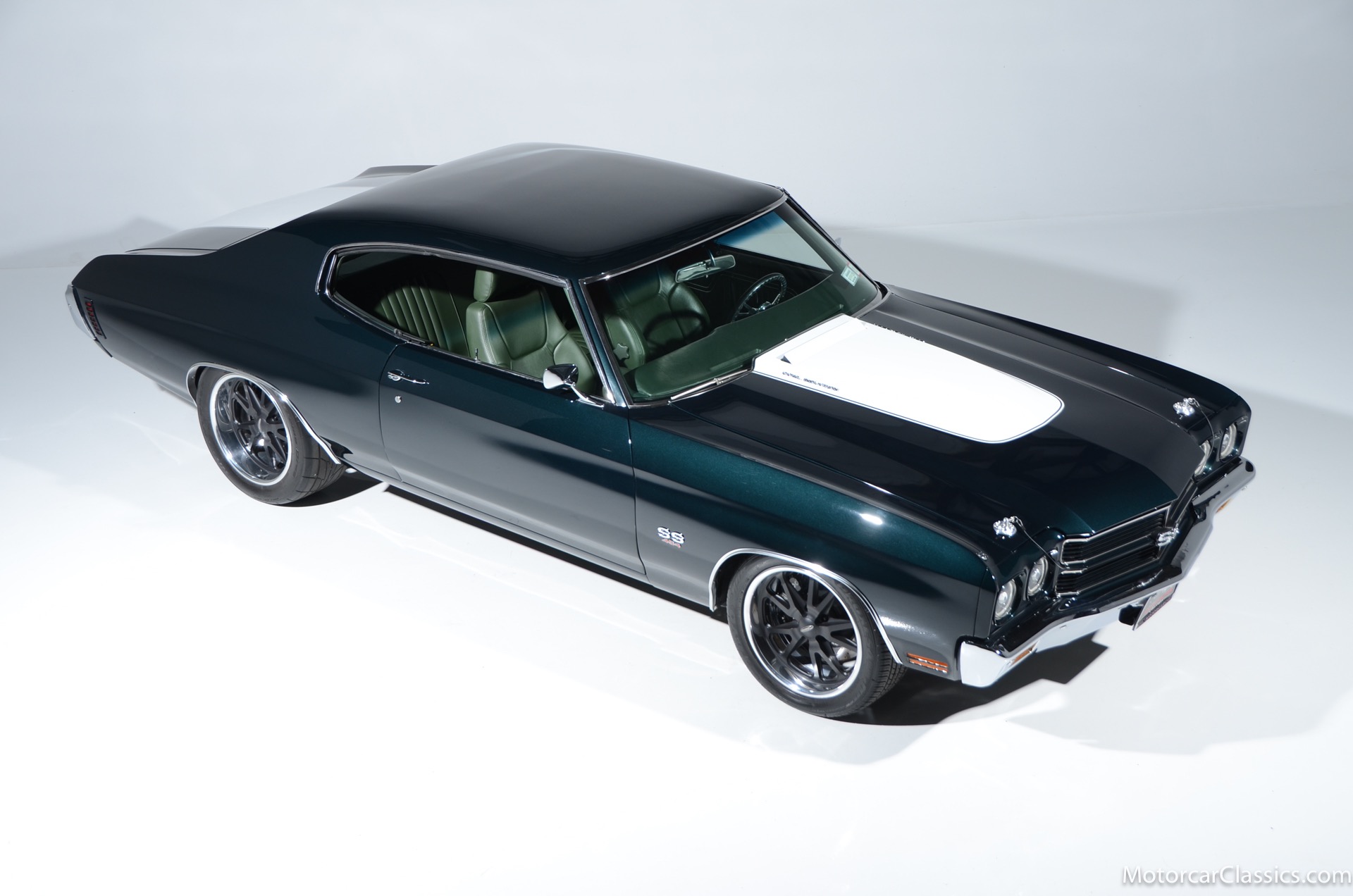 1970 Chevrolet Chevelle SS for sale! Motorcar Classics is proud to present this awesome 1970 Chevelle Big Block Restomod featured in Deep Forest Green Metallic with a stunning green custom interior. The 1970 Chevelle two-door hardtop is arguably the most popular of this era's muscle cars, and this professionally-built restomod has all the right stuff for performance and style. The car was subjected to a documented body-off nut & bolt restoration with all of the finest upgrades. Features include: Fuel injection, Quick-ratio steering gear box, 540CI 675hp Balanced & Blueprinted BBC, Wilwood 14* big brakes with drilled & slotted rotors and six piston calipers, Hooker Black Heart Long Tube Headers ceramic coated with X-Pipe and Stainless Borla exhaust, Hydroboost braking system, Billet Specialties polished aluminum Serpentine system with 150A Alternator, Custom Budnik wheels, Tremec TK0-600, Classic Auto A/C, American Powertrain AutoX Crossmember, Custom aluminum 4-core radiator, Custom driveline loop, Custom radiator plumbing, GM 12-bolt 3.73 Eaton Tru-Trac Posi, Dual SPAL Ultra fans, RideTech coil-over suspension, RideTech musclebar front & rear, Flaming River steering column & knuckle, ChassisWorks Billet drop spindles, Budnik custom steering wheel, Custom interior, AutoMeter electronic gauges & cluster, S/S EF baffled Gas Tank, Custom Plumbing: Fuel, PS & Brakes, Custom billet cowl vents, Functional Cowl Induction hood, Ring Brothers hood & trunk hinges, Ring Brothers hood tie-downs, LED projector headlights with DRL ring, and incredible custom paint. The car comes with a huge build book and it is fully-sorted and ready for immediate enjoyment. The performance is thrilling, the sound is spectacular, and the car will attract attention at any show.