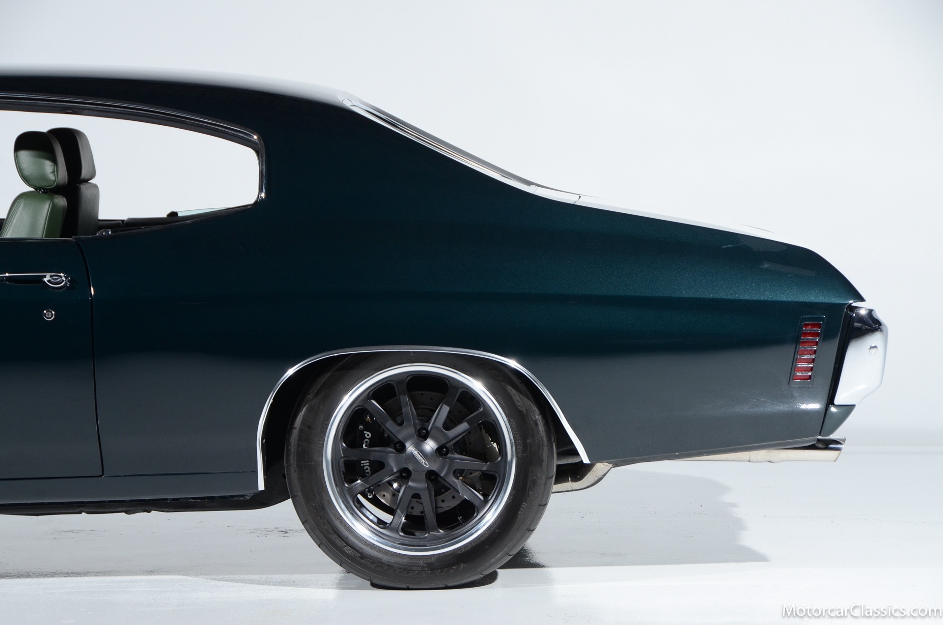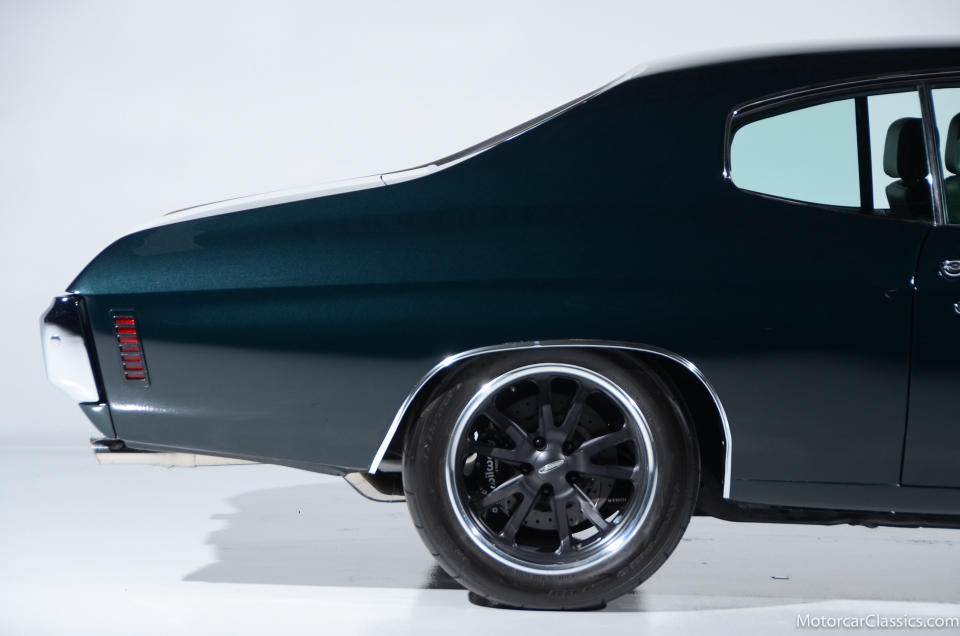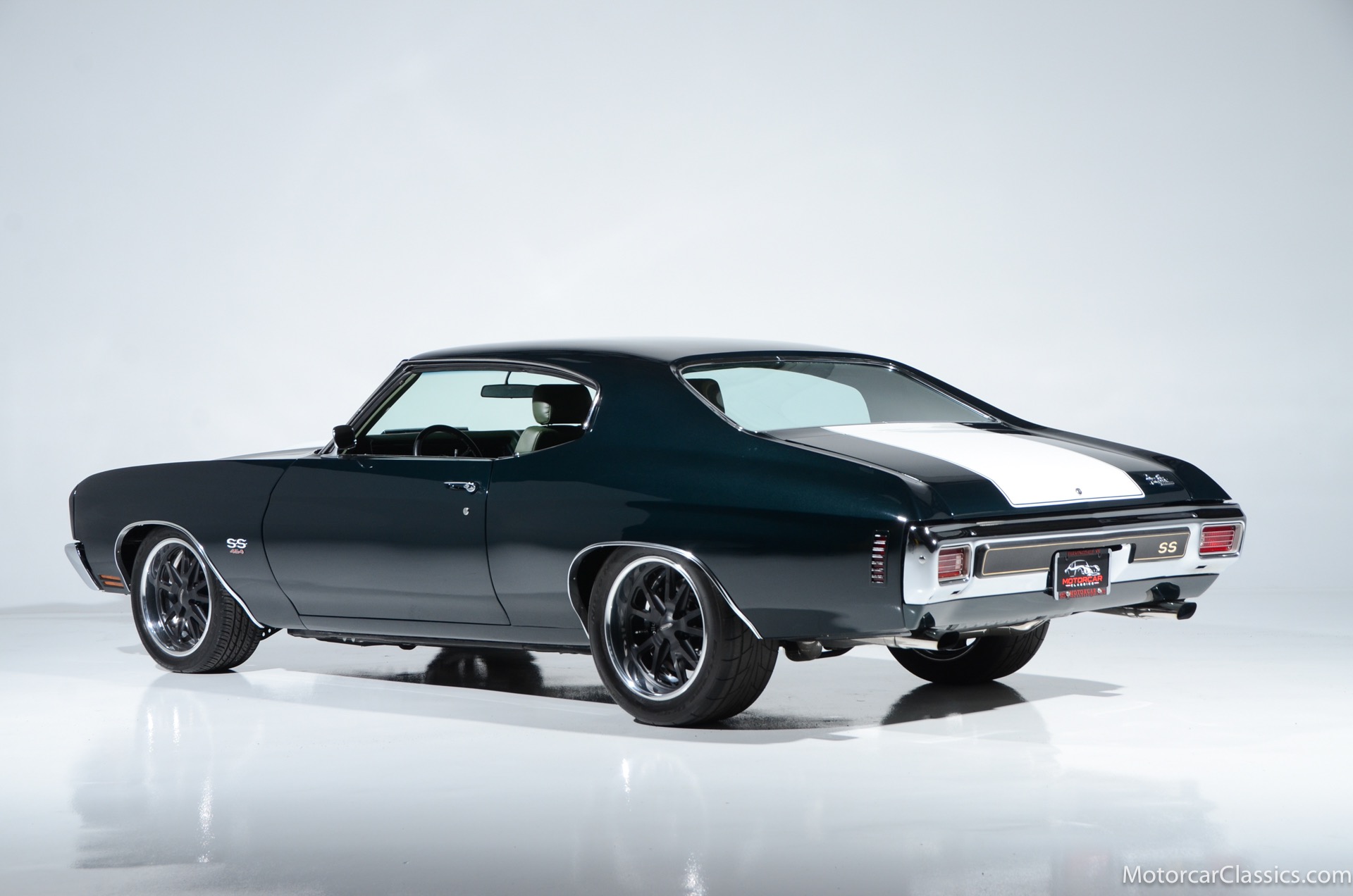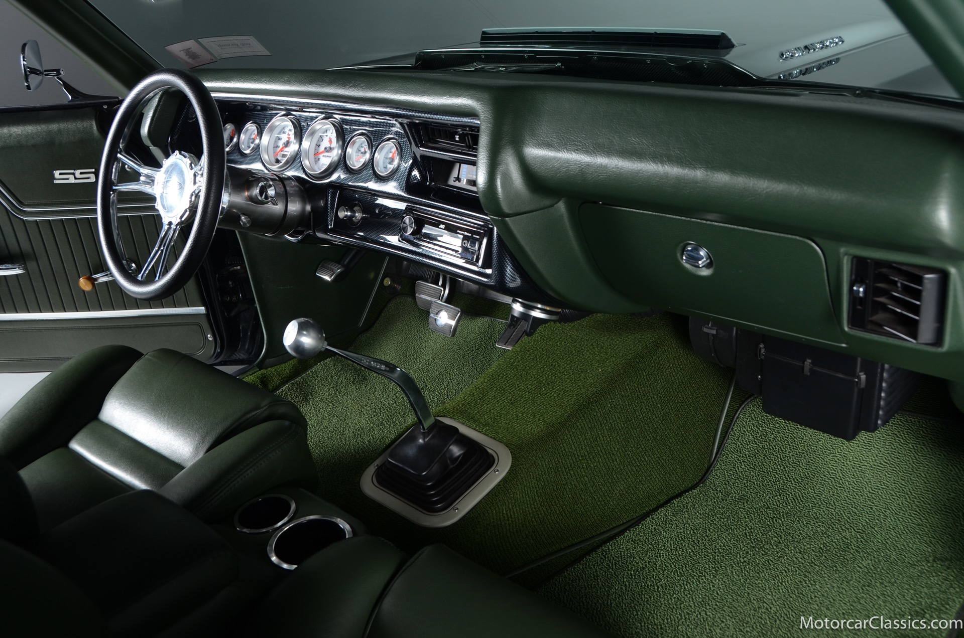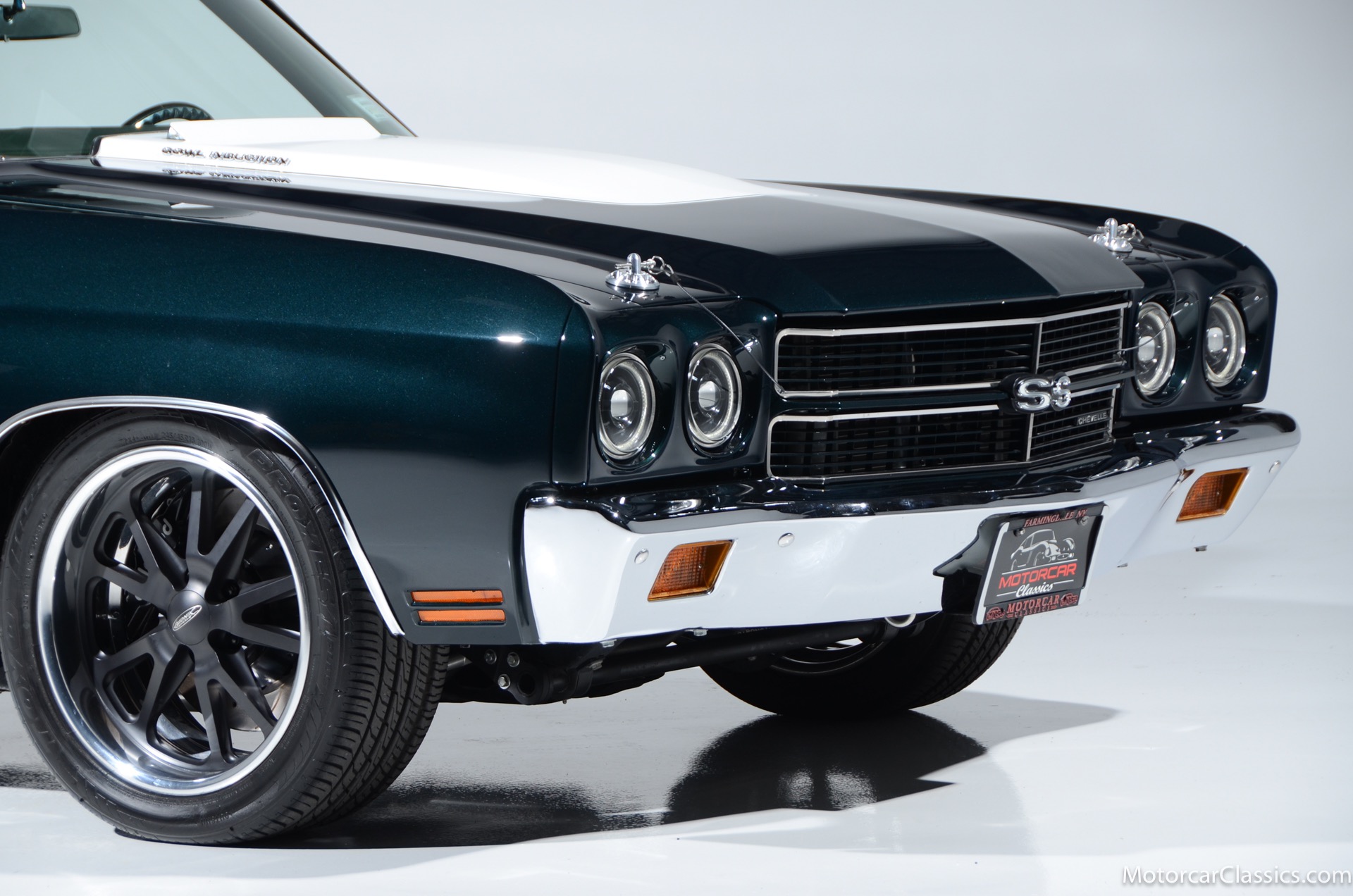 1970 Chevrolet Chevelle SS for sale! Motorcar Classics is proud to present this awesome 1970 Chevelle Big Block Restomod featured in Deep Forest Green Metallic with a stunning green custom interior. The 1970 Chevelle two-door hardtop is arguably the most popular of this era's muscle cars, and this professionally-built restomod has all the right stuff for performance and style. The car was subjected to a documented body-off nut & bolt restoration with all of the finest upgrades. Features include: Fuel injection, Quick-ratio steering gear box, 540CI 675hp Balanced & Blueprinted BBC, Wilwood 14* big brakes with drilled & slotted rotors and six piston calipers, Hooker Black Heart Long Tube Headers ceramic coated with X-Pipe and Stainless Borla exhaust, Hydroboost braking system, Billet Specialties polished aluminum Serpentine system with 150A Alternator, Custom Budnik wheels, Tremec TK0-600, Classic Auto A/C, American Powertrain AutoX Crossmember, Custom aluminum 4-core radiator, Custom driveline loop, Custom radiator plumbing, GM 12-bolt 3.73 Eaton Tru-Trac Posi, Dual SPAL Ultra fans, RideTech coil-over suspension, RideTech musclebar front & rear, Flaming River steering column & knuckle, ChassisWorks Billet drop spindles, Budnik custom steering wheel, Custom interior, AutoMeter electronic gauges & cluster, S/S EF baffled Gas Tank, Custom Plumbing: Fuel, PS & Brakes, Custom billet cowl vents, Functional Cowl Induction hood, Ring Brothers hood & trunk hinges, Ring Brothers hood tie-downs, LED projector headlights with DRL ring, and incredible custom paint. The car comes with a huge build book and it is fully-sorted and ready for immediate enjoyment. The performance is thrilling, the sound is spectacular, and the car will attract attention at any show.