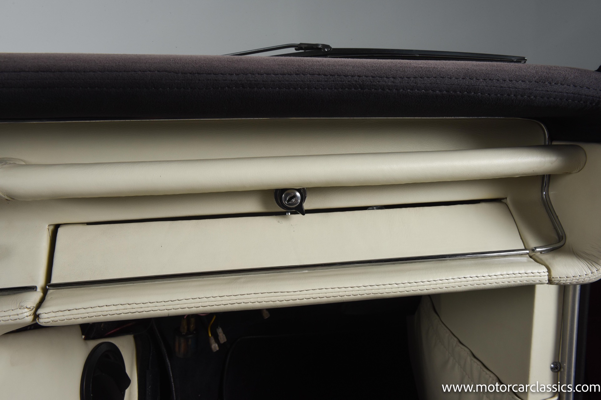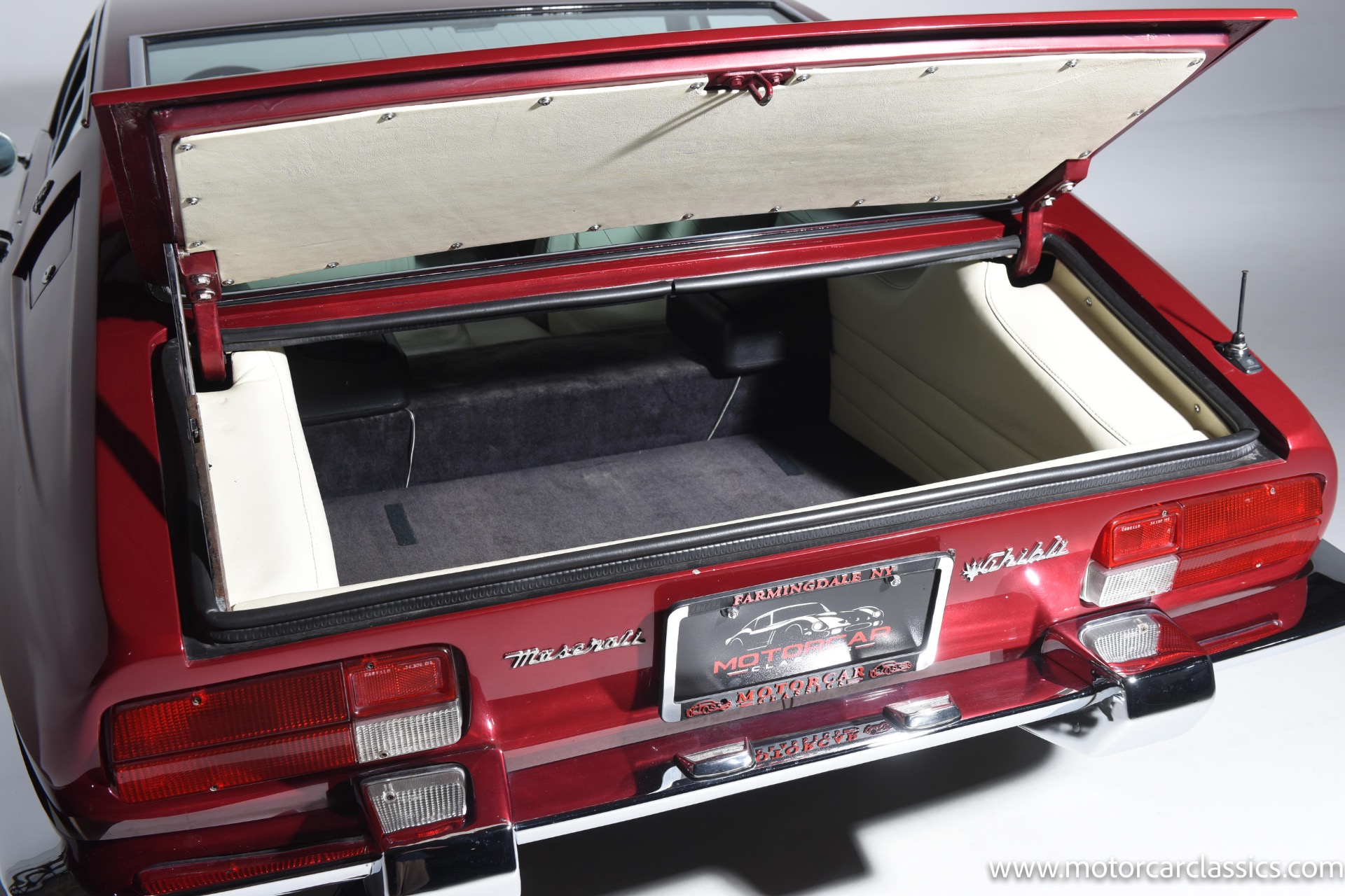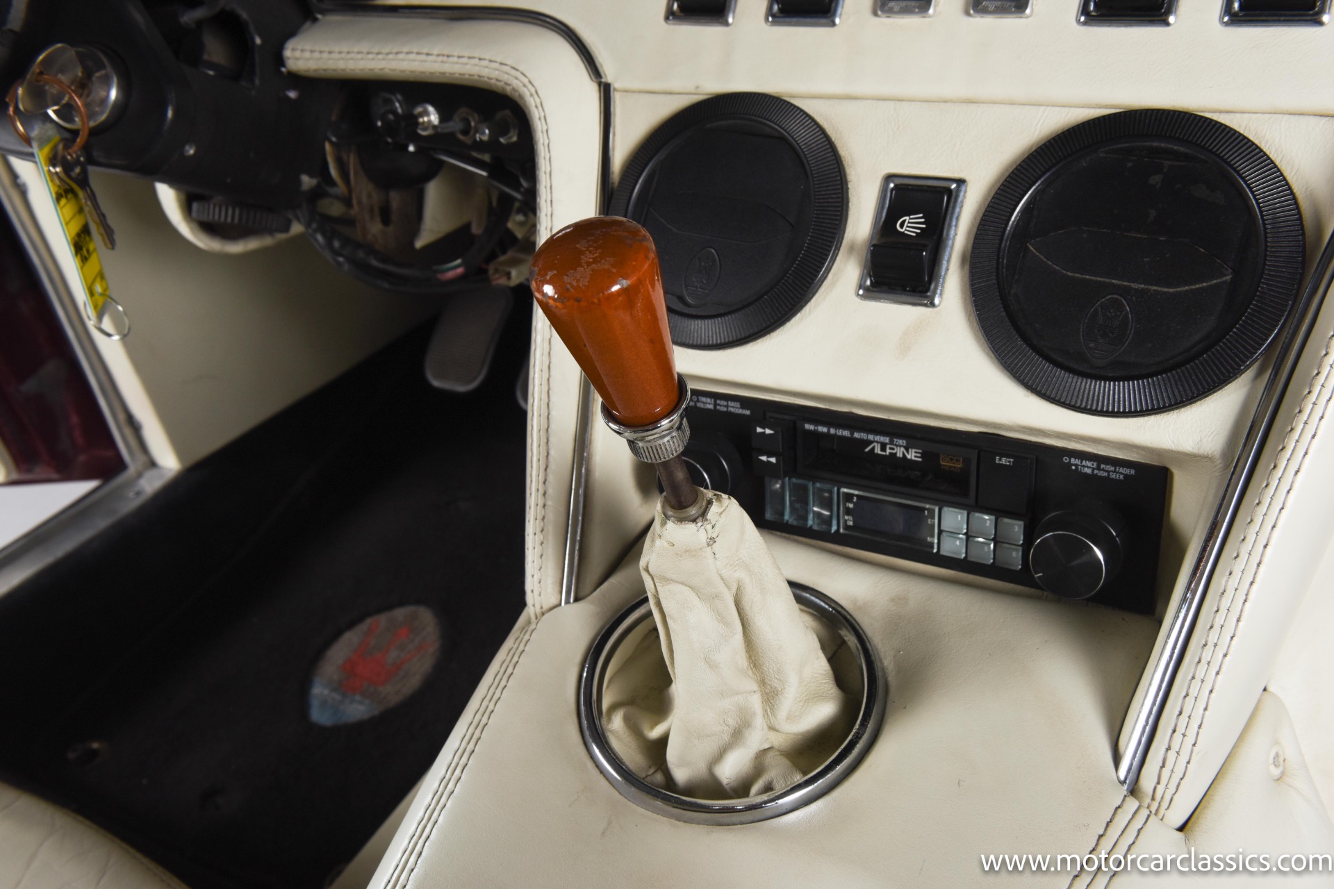 The Ghibli was designed by Giorgetto Giugiaro while at Ghia, and its sleek, low-slung body remains a masterpiece of automotive design. This particular example features a striking metallic burgundy exterior, a color change from its original pale blue that beautifully complements the original white upholstery and chrome wire wheels. The interior is in excellent condition, with well-preserved dash fuzz, instruments, carpets, and glass. The car has been meticulously maintained as part of a multi-Maserati collection during 30 years of ownership, benefiting from regular use and attentive servicing.