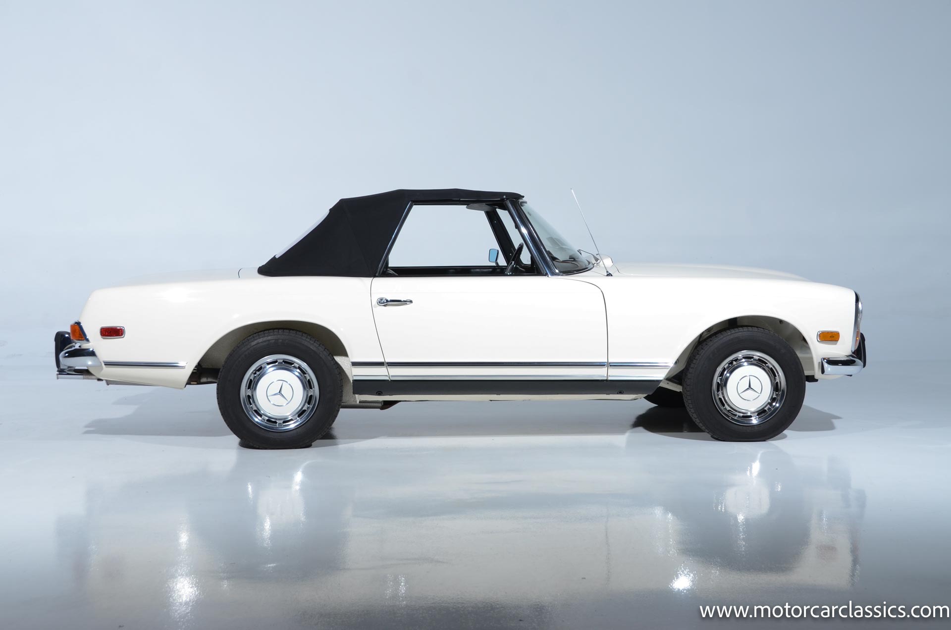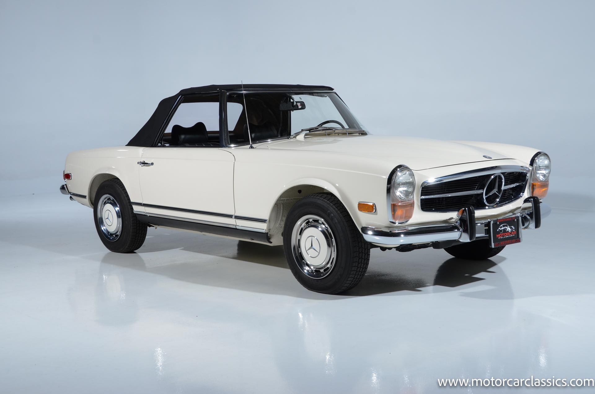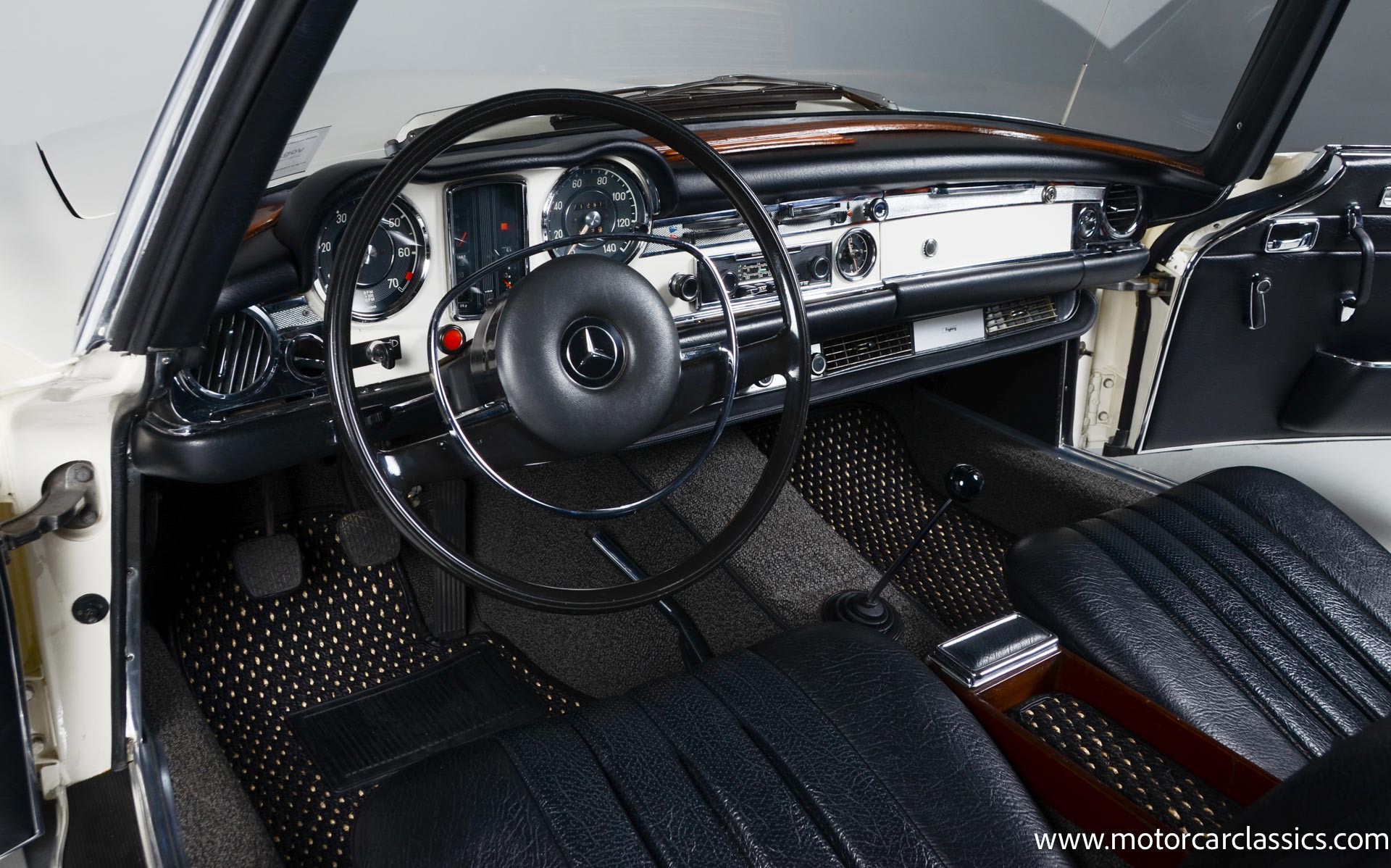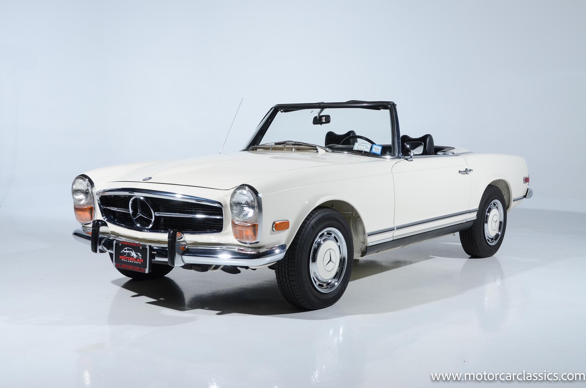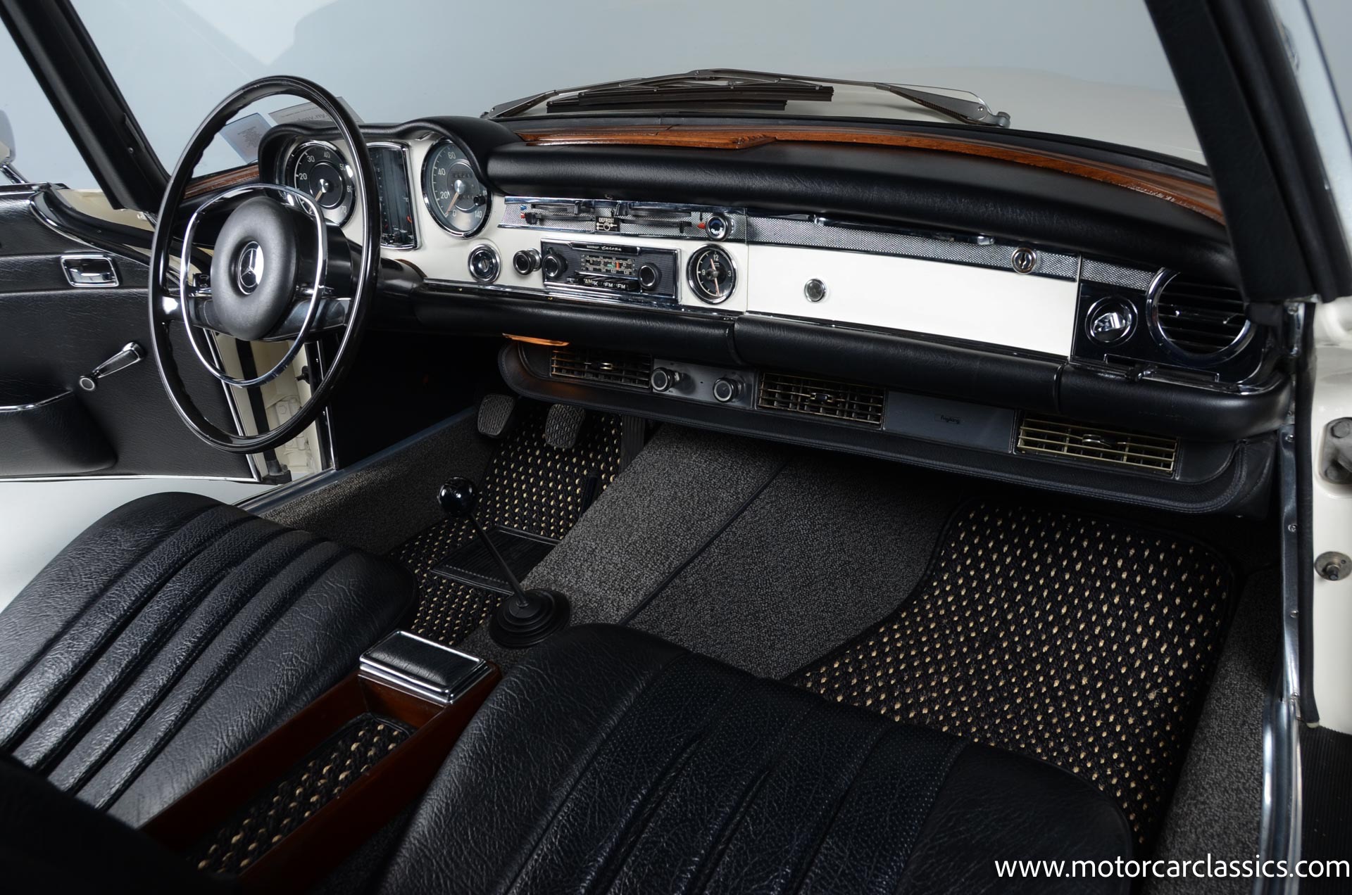 1970 Mercedes-Benz 280SL for sale! Motorcar Classics is pleased to present this stunning 280SL presented in refinished White (DB 050) with Black MB-Tex vinyl and matching carpets. This Mercedes was refurbished by Gus Kidonakis of Beverly Hill Motors in Houston, Texas prior to the seller's acquisition in a process that involved the body being stripped to bare metal, repaired and straightened, and epoxy-primed prior to being refinished in white with clear coat. The underside, engine compartment, and wheel wells were cleaned, repaired, and stone-guarded prior to painting and the rocker panels were painted black. The token spot welds are retained as well as the notches inside both front fenders. The air-conditioning drain was redirected to exit behind the front passenger tire.