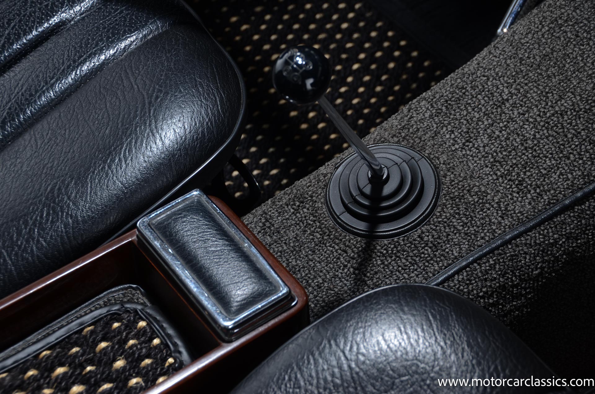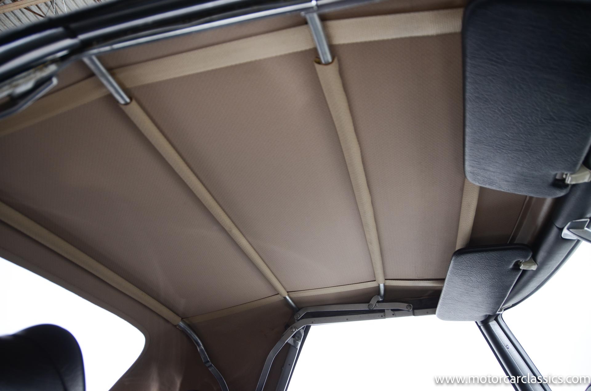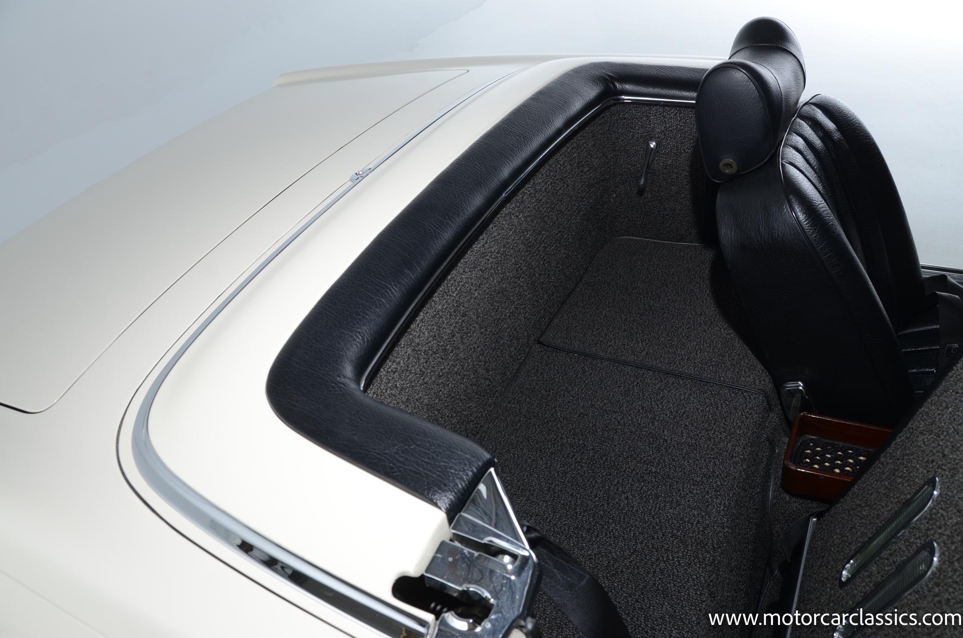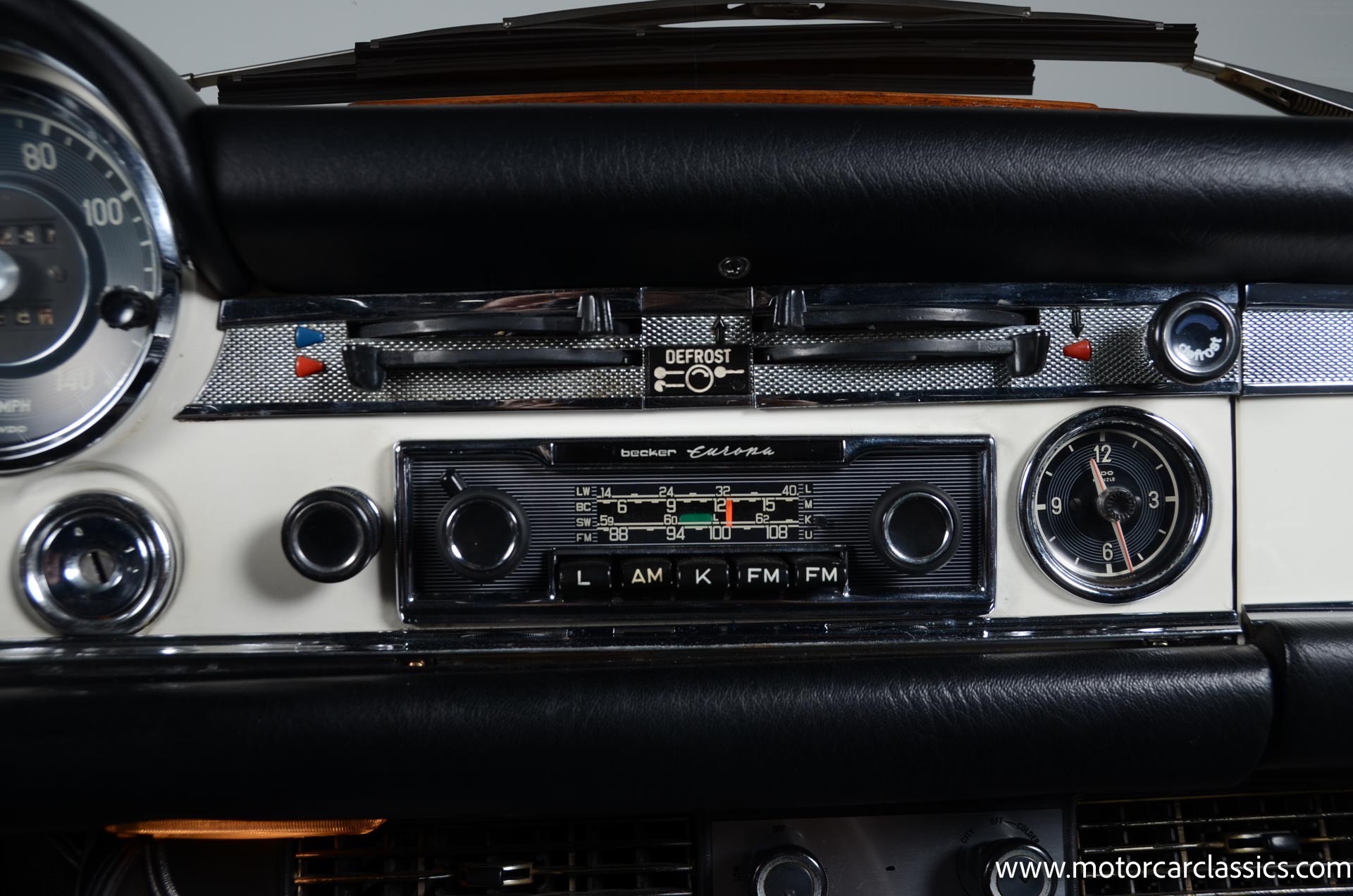 The cabin is upholstered in black MB-Tex vinyl with matching carpets and trim with wood finishes at the top of the dashboard and between the seats. Equipment includes air conditioning, Becker Europa radio, clock and floor mats. The dashboard was re-covered with MB-Tex by Beverly Hill Motors, and the seats and carpeting were replaced prior to the refurbishment.