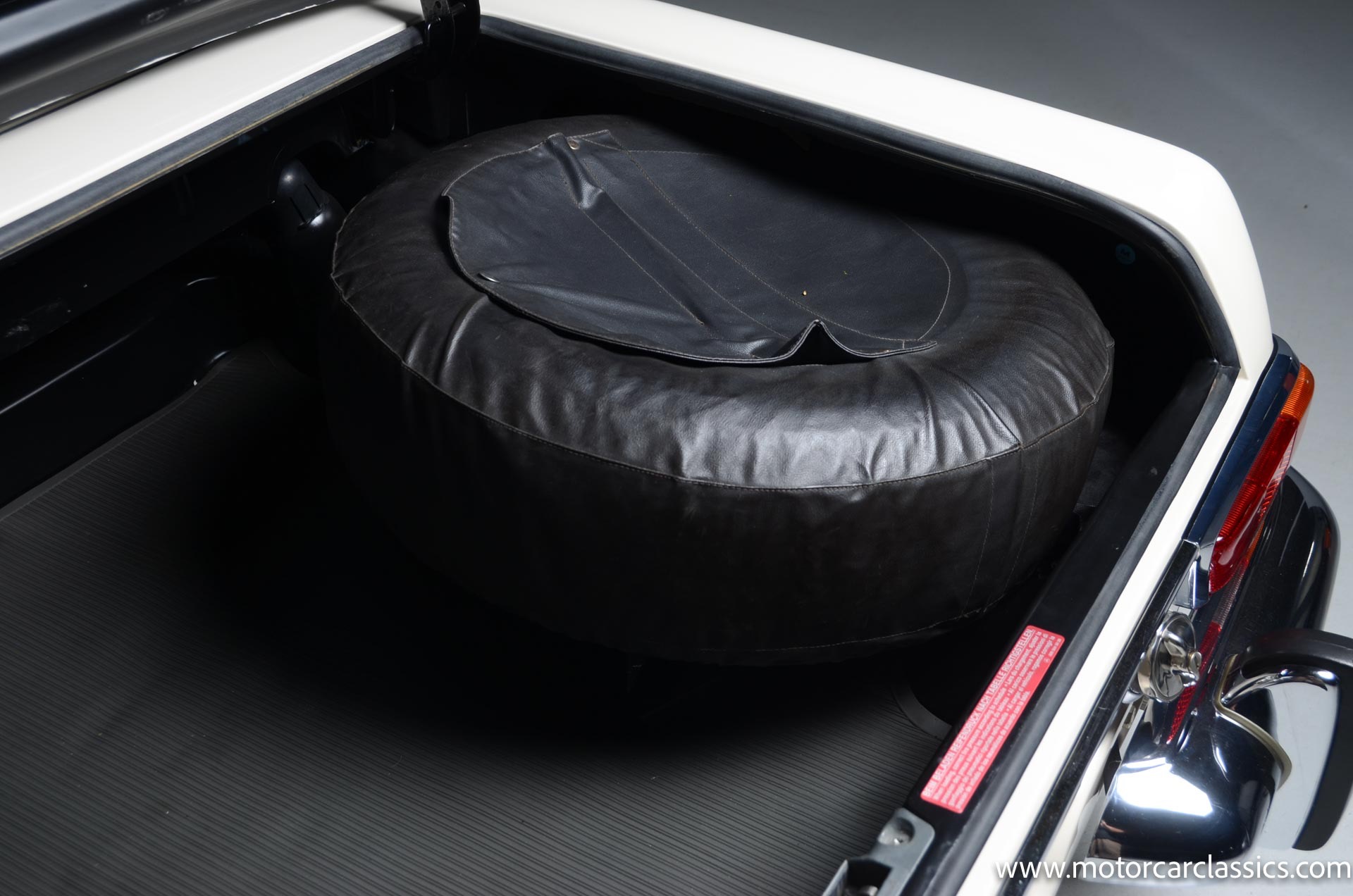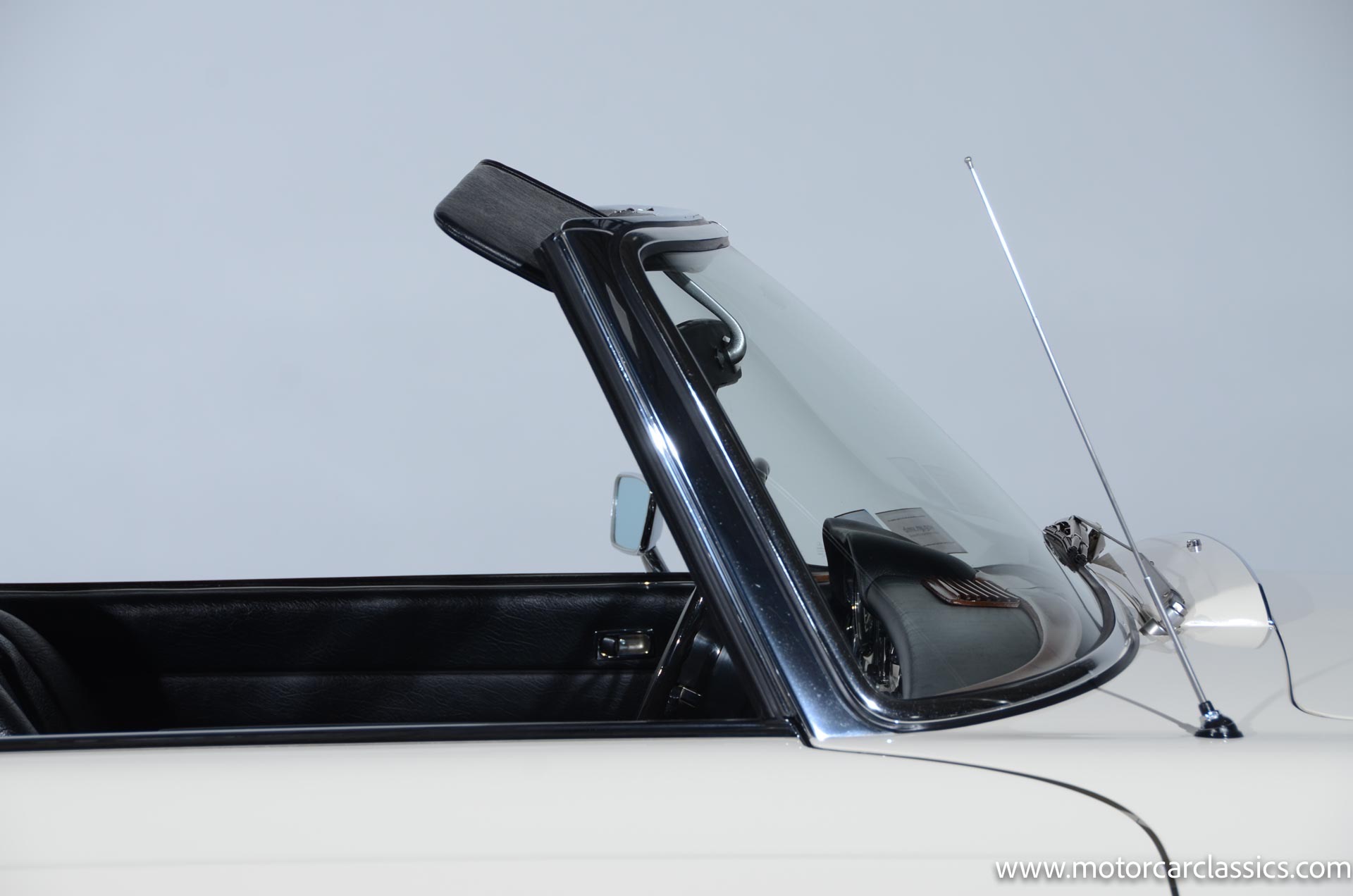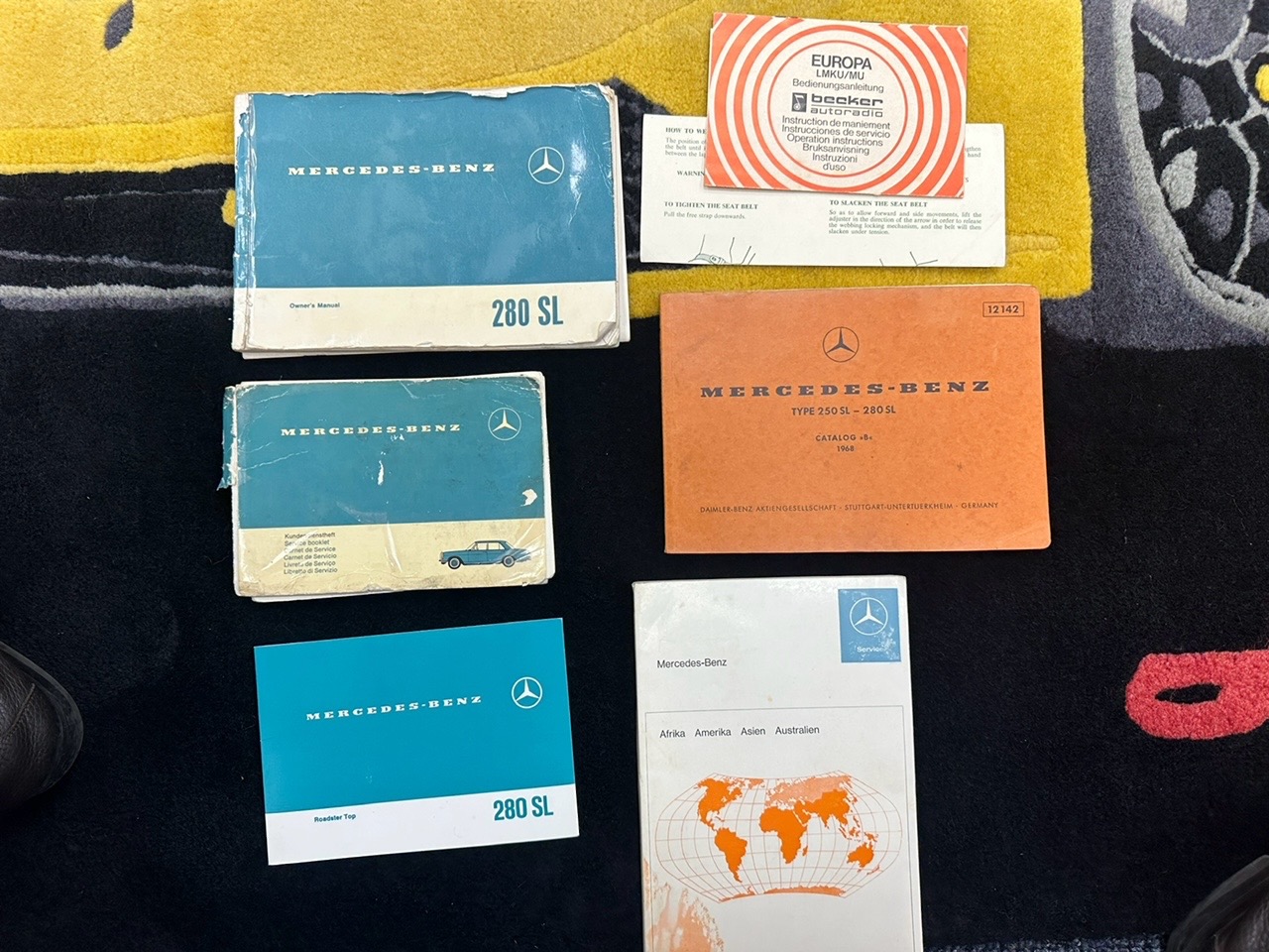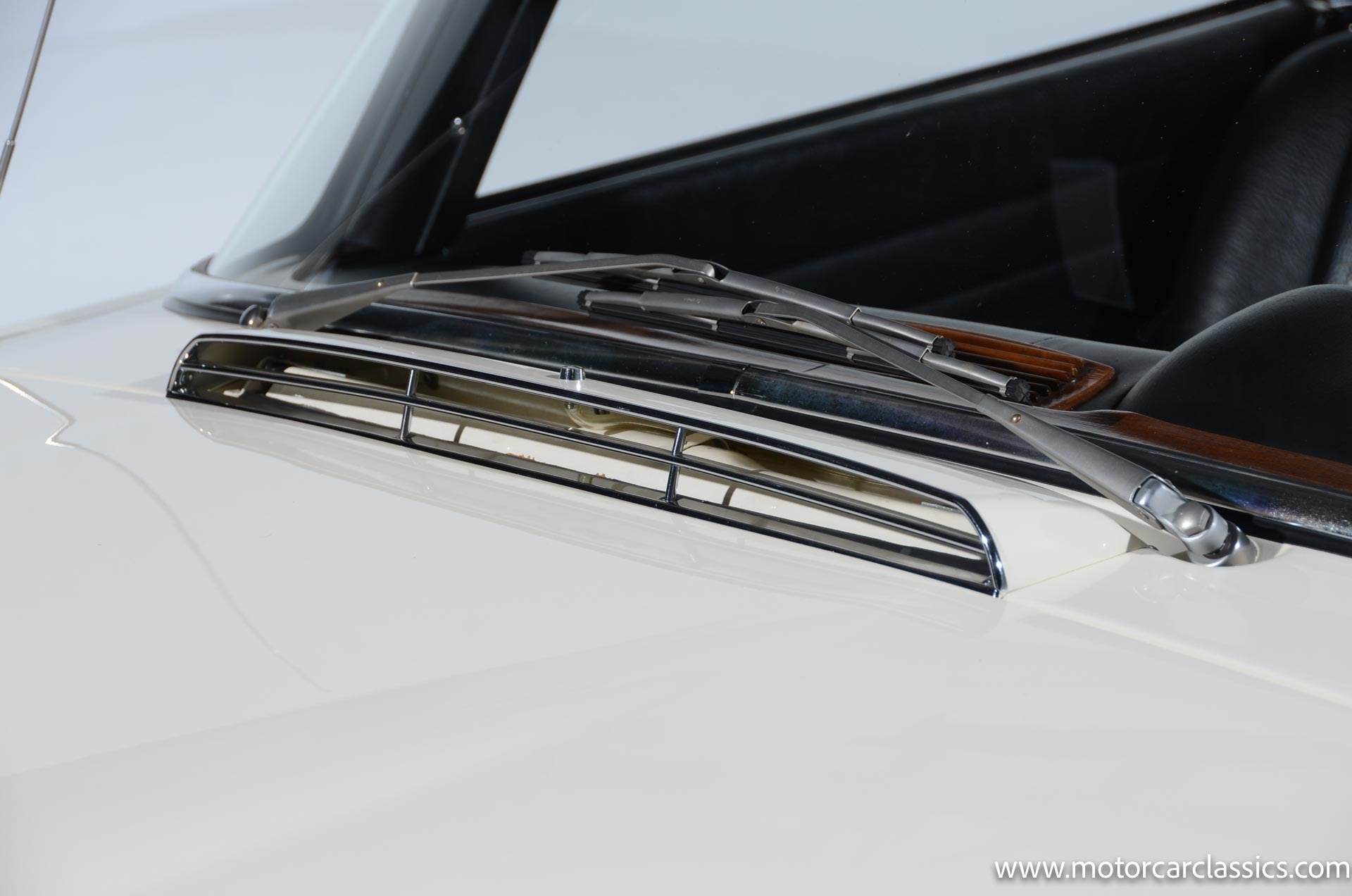 The cabin is upholstered in black MB-Tex vinyl with matching carpets and trim with wood finishes at the top of the dashboard and between the seats. Equipment includes air conditioning, Becker Europa radio, clock and floor mats. The dashboard was re-covered with MB-Tex by Beverly Hill Motors, and the seats and carpeting were replaced prior to the refurbishment.