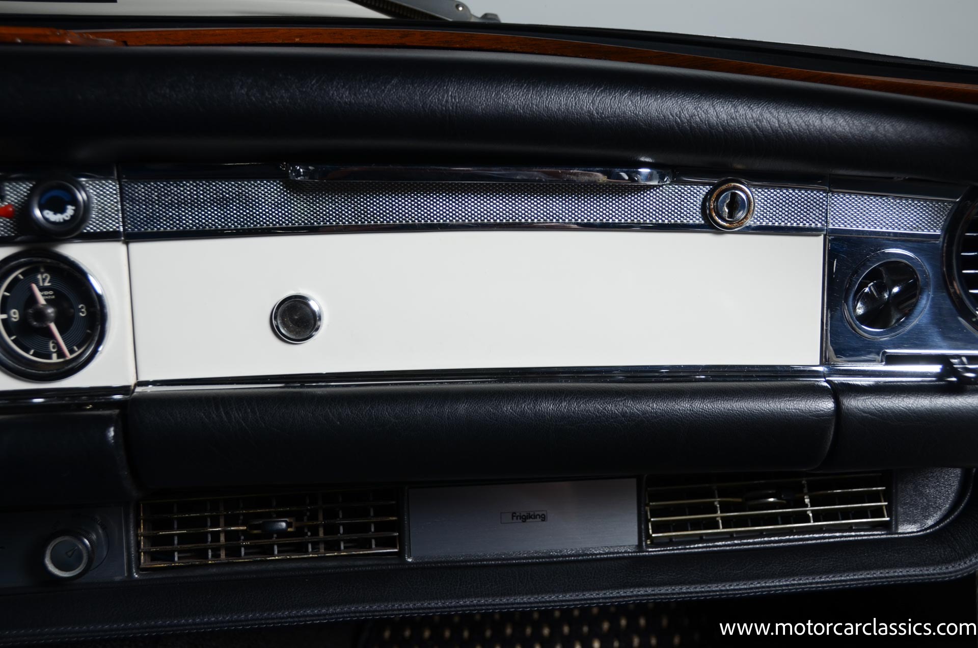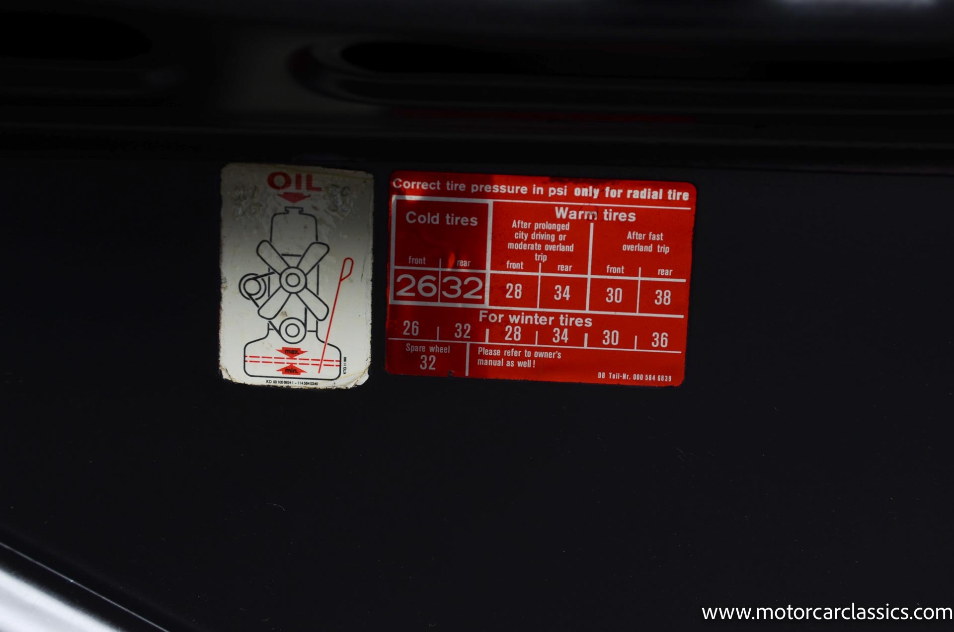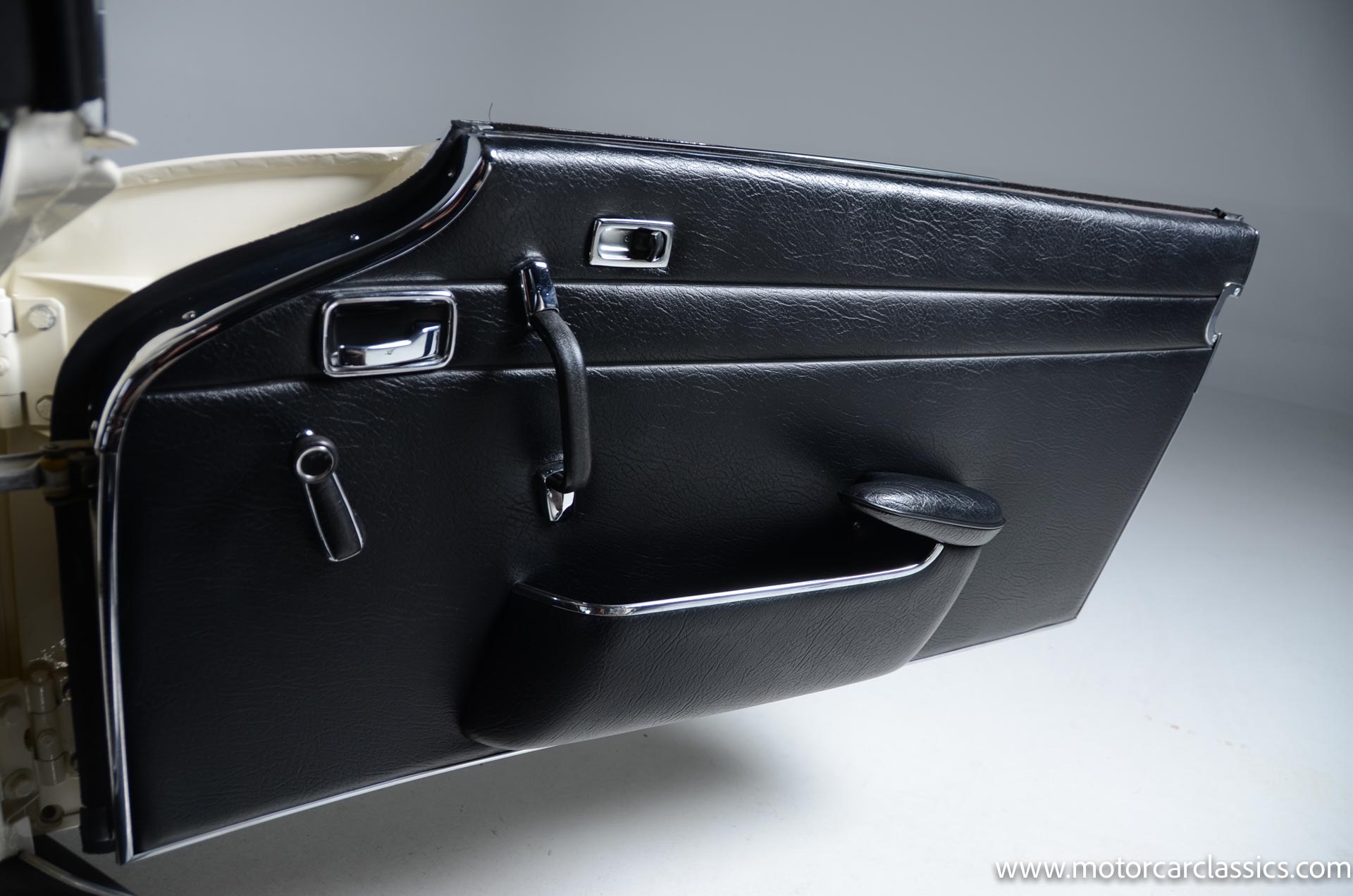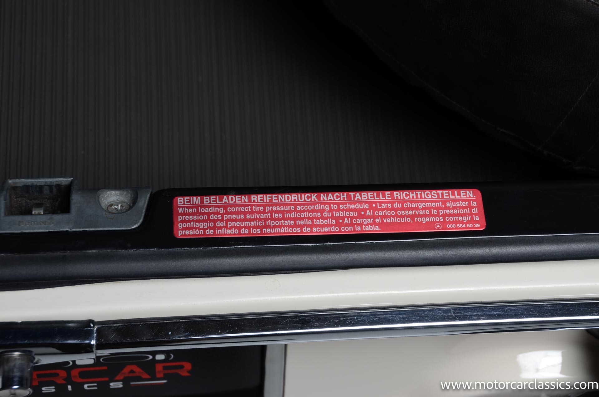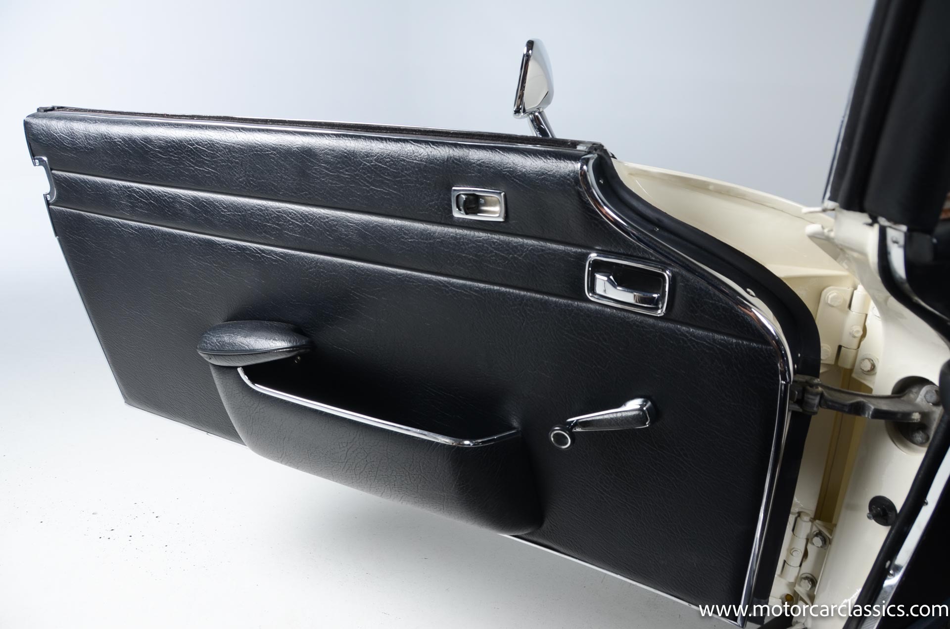 The cabin is upholstered in black MB-Tex vinyl with matching carpets and trim with wood finishes at the top of the dashboard and between the seats. Equipment includes air conditioning, Becker Europa radio, clock and floor mats. The dashboard was re-covered with MB-Tex by Beverly Hill Motors, and the seats and carpeting were replaced prior to the refurbishment.