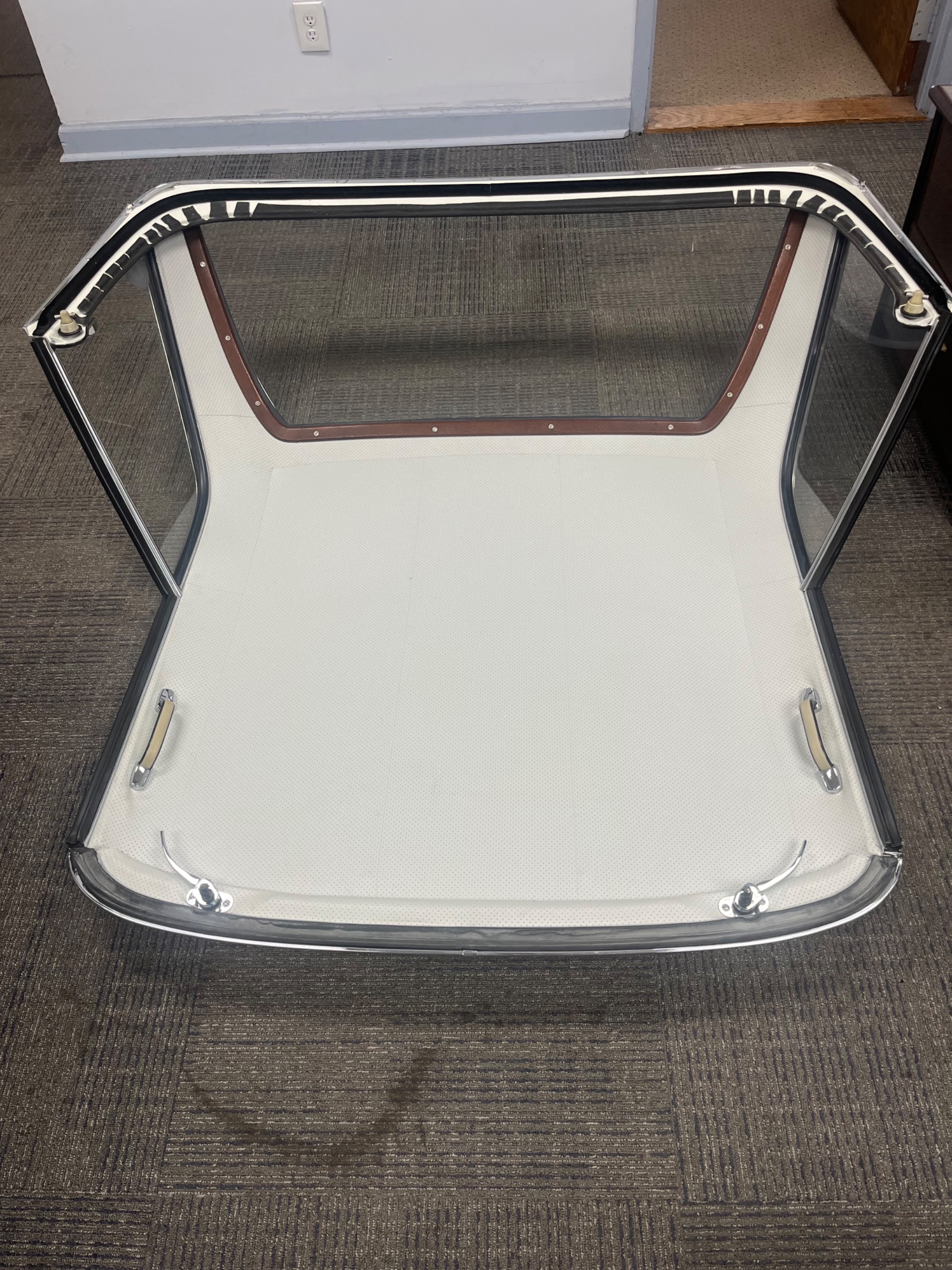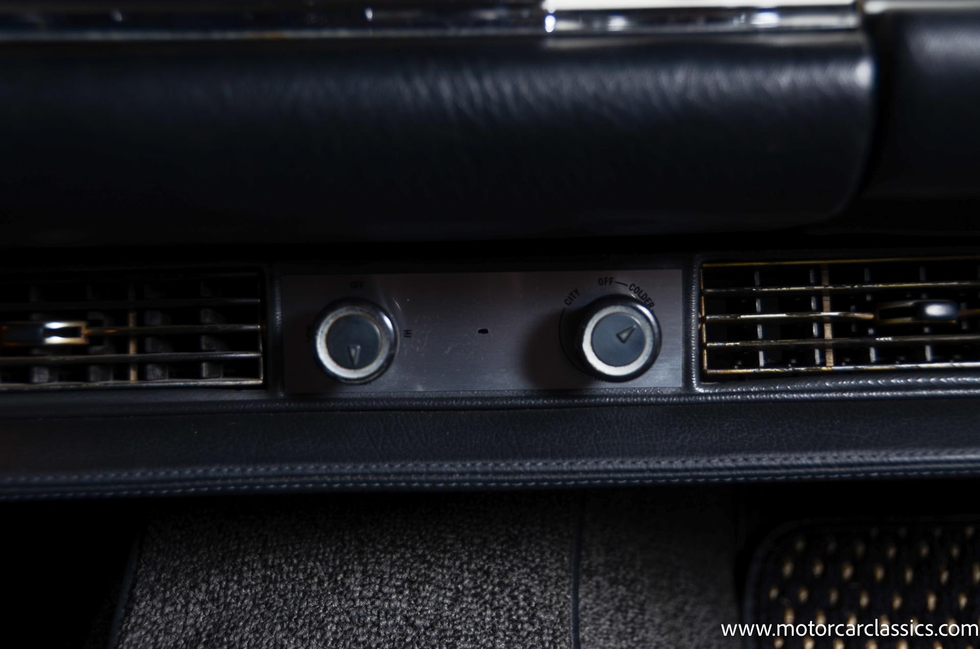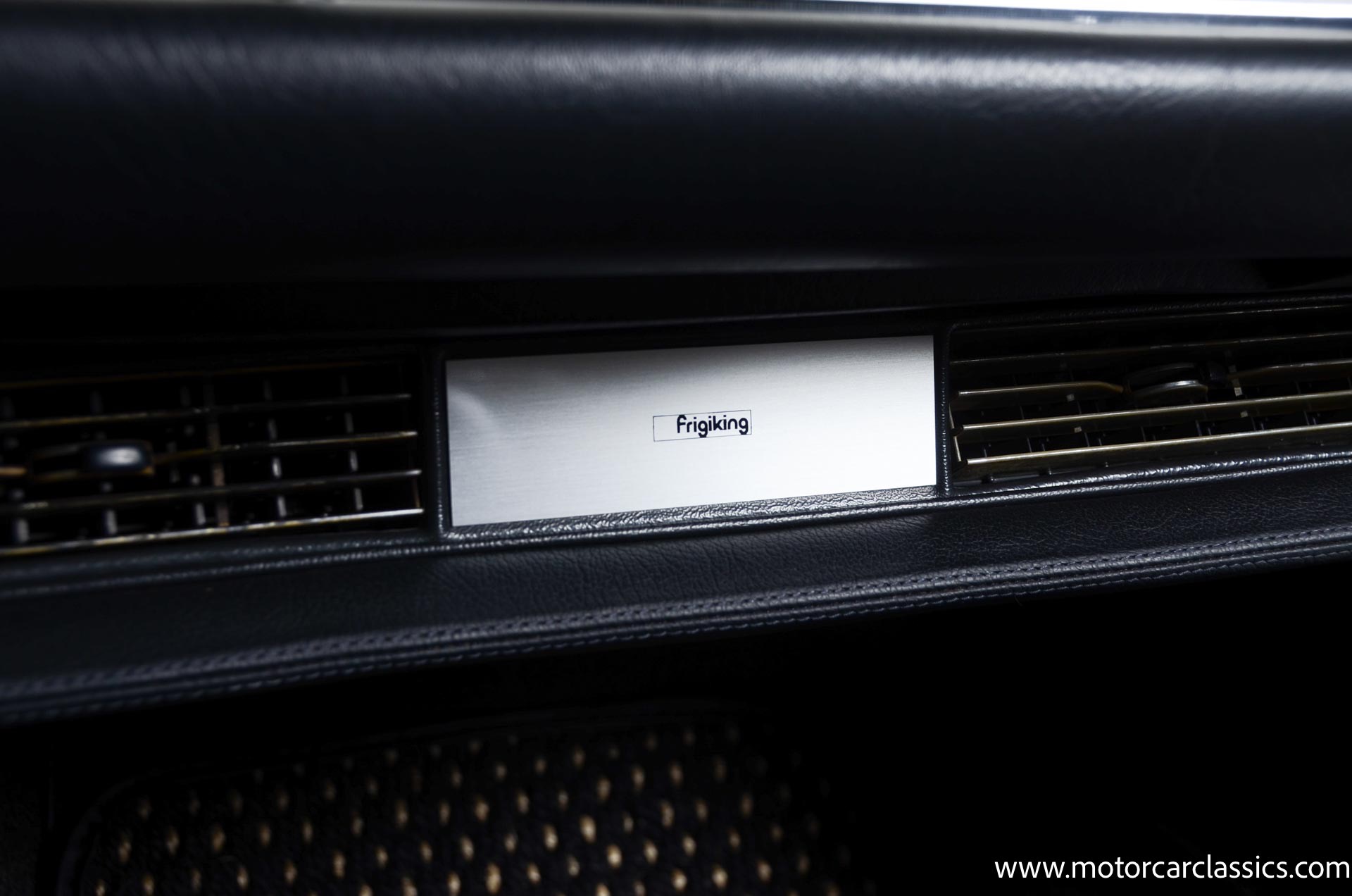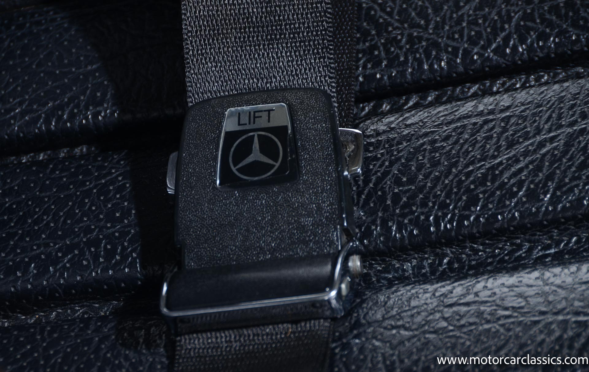 The cabin is upholstered in black MB-Tex vinyl with matching carpets and trim with wood finishes at the top of the dashboard and between the seats. Equipment includes air conditioning, Becker Europa radio, clock and floor mats. The dashboard was re-covered with MB-Tex by Beverly Hill Motors, and the seats and carpeting were replaced prior to the refurbishment.