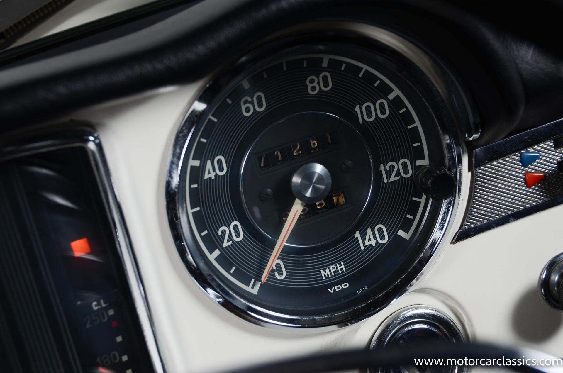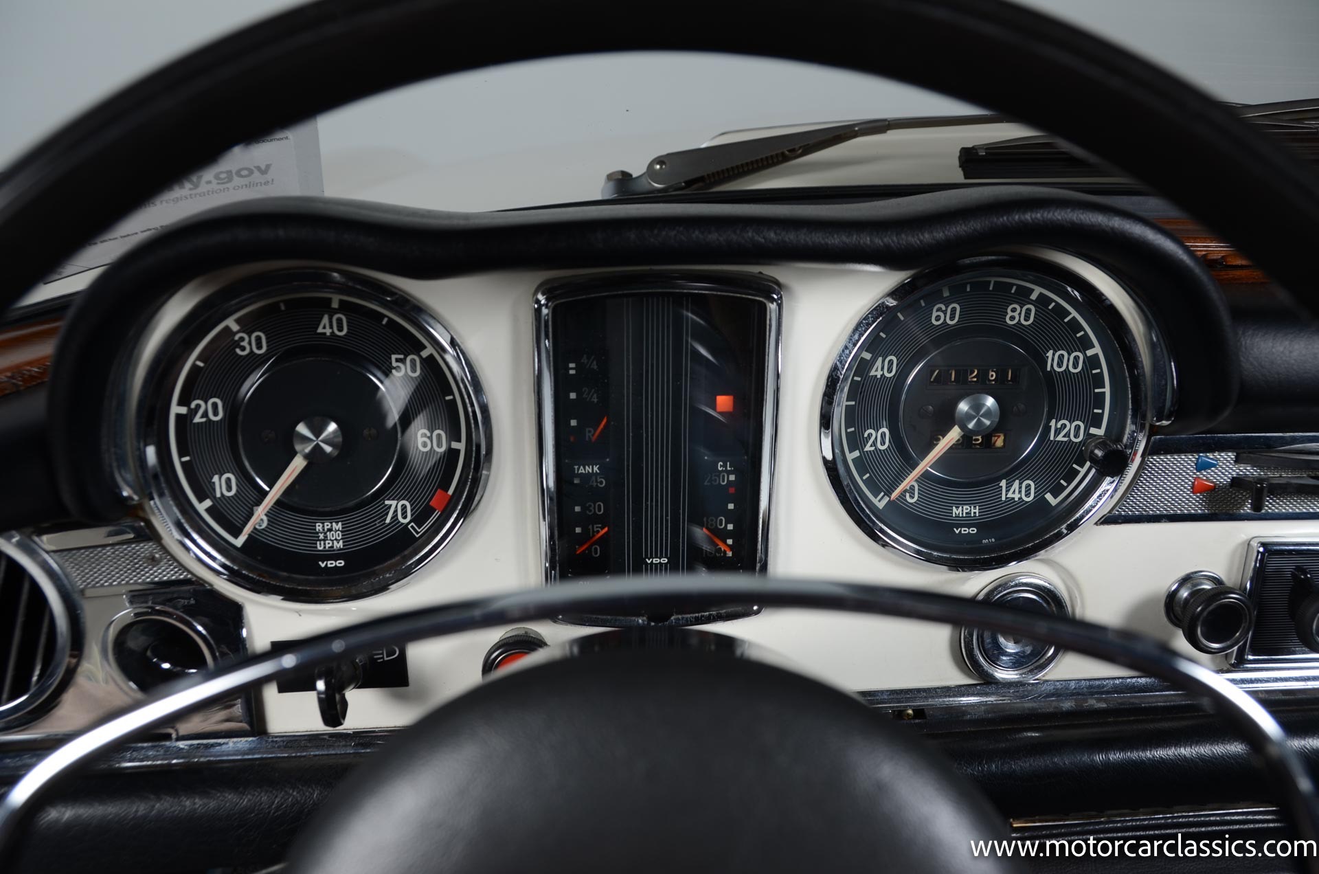 The black steering wheel features a chrome horn ring and frames VDO instrumentation that includes a 140-mph speedometer, a 7k-rpm tachometer, and auxiliary gauges monitoring oil pressure, coolant temperature, and fuel level. The five-digit odometer shows 71k miles and the current owner has accounted for roughly 5000 of those, however we are representing the car as true mileage unknown.