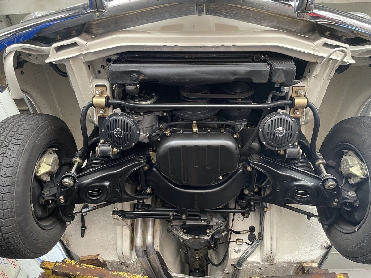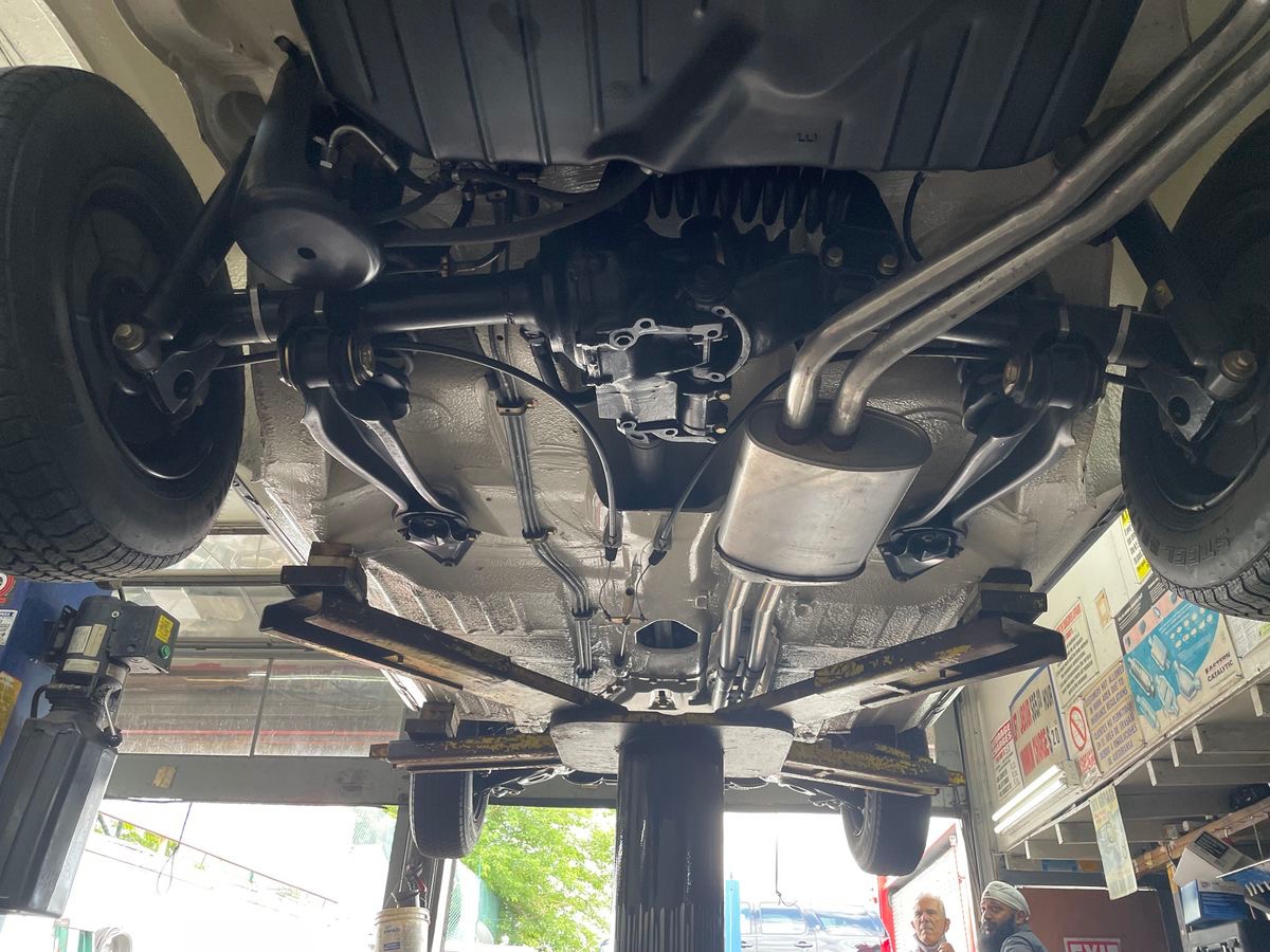 The 2.8-liter inline-six was rated at 180 horsepower and 193 lb-ft of torque when new. The engine received a valve job and was detailed during the refurbishment. Additionally, the electric fuel pump was rebuilt with new pump and tank hoses, the radiator was recorded, and the steering pump, steering gearbox, water pump, thermostat, belts, and injection system were replaced or rebuilt. The air-conditioning compressor was replaced with a rotary-type Sanden unit, and the hoses, condenser, and blower motor were replaced.