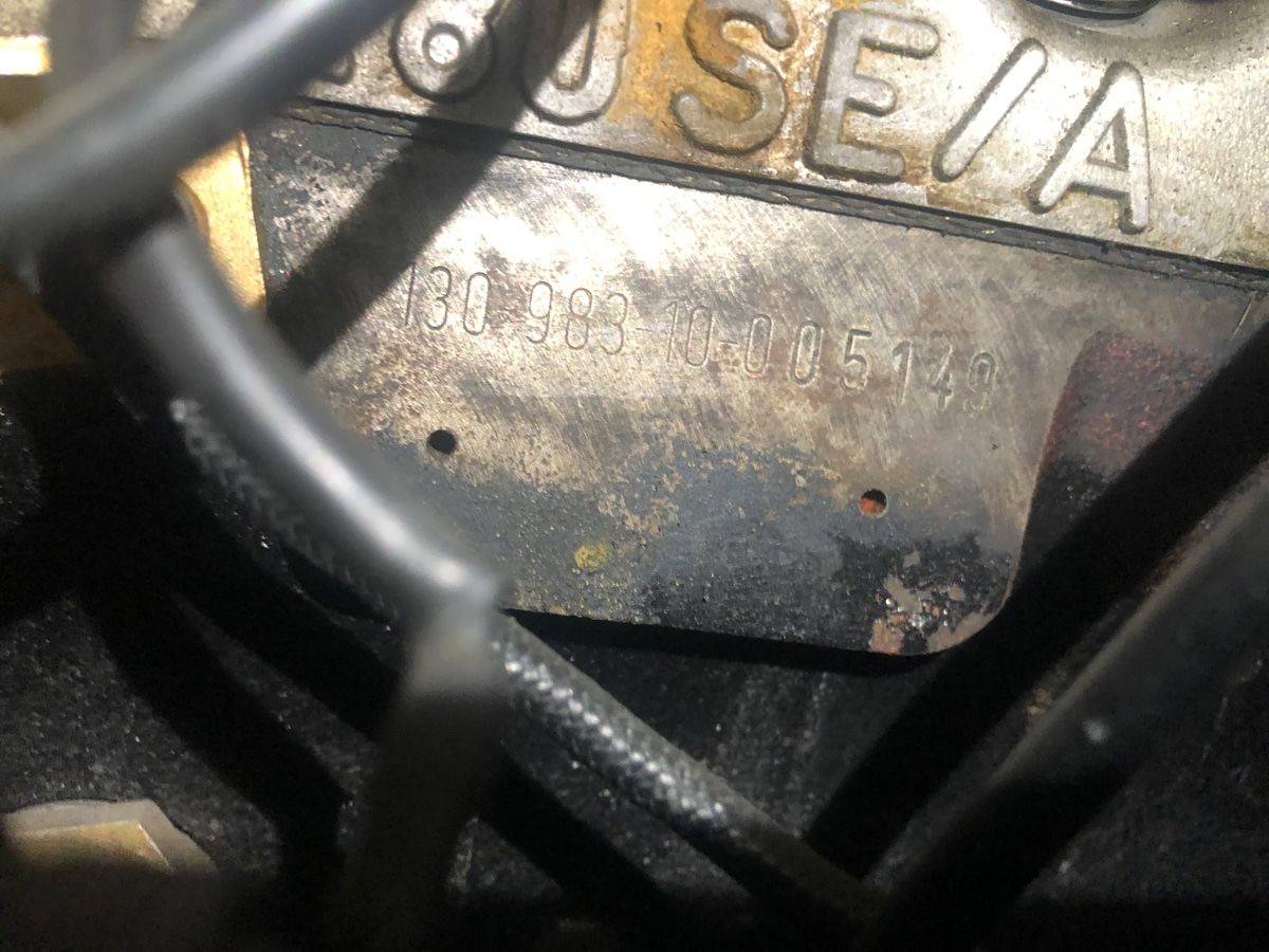Serial number 130983-10-005149 is stamped into the engine block, matching the vehicles data card.