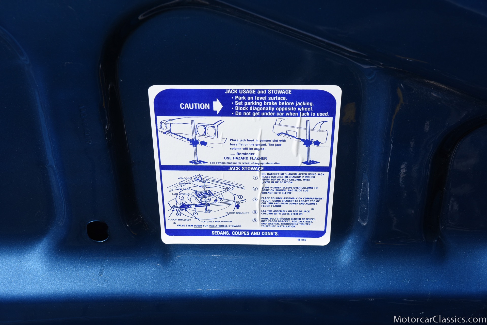 The undercarriage is clean with fresh springs and shocks. The floors are finished in the correct satin finish. All E-brake cables are complete and working. It has boxed in control arms with sway bar, a newer gas tank and straps and a dual FlowMaster exhaust with correct exhaust tips running out the back. It has a Safe-T-Track rear end. Other features are power steering and power front disc brakes. The trunk is rock solid and detailed with splatter paint. It also comes with a trunk mat, spare tire, jack assembly including lug wrench. It also has new weather stripping.