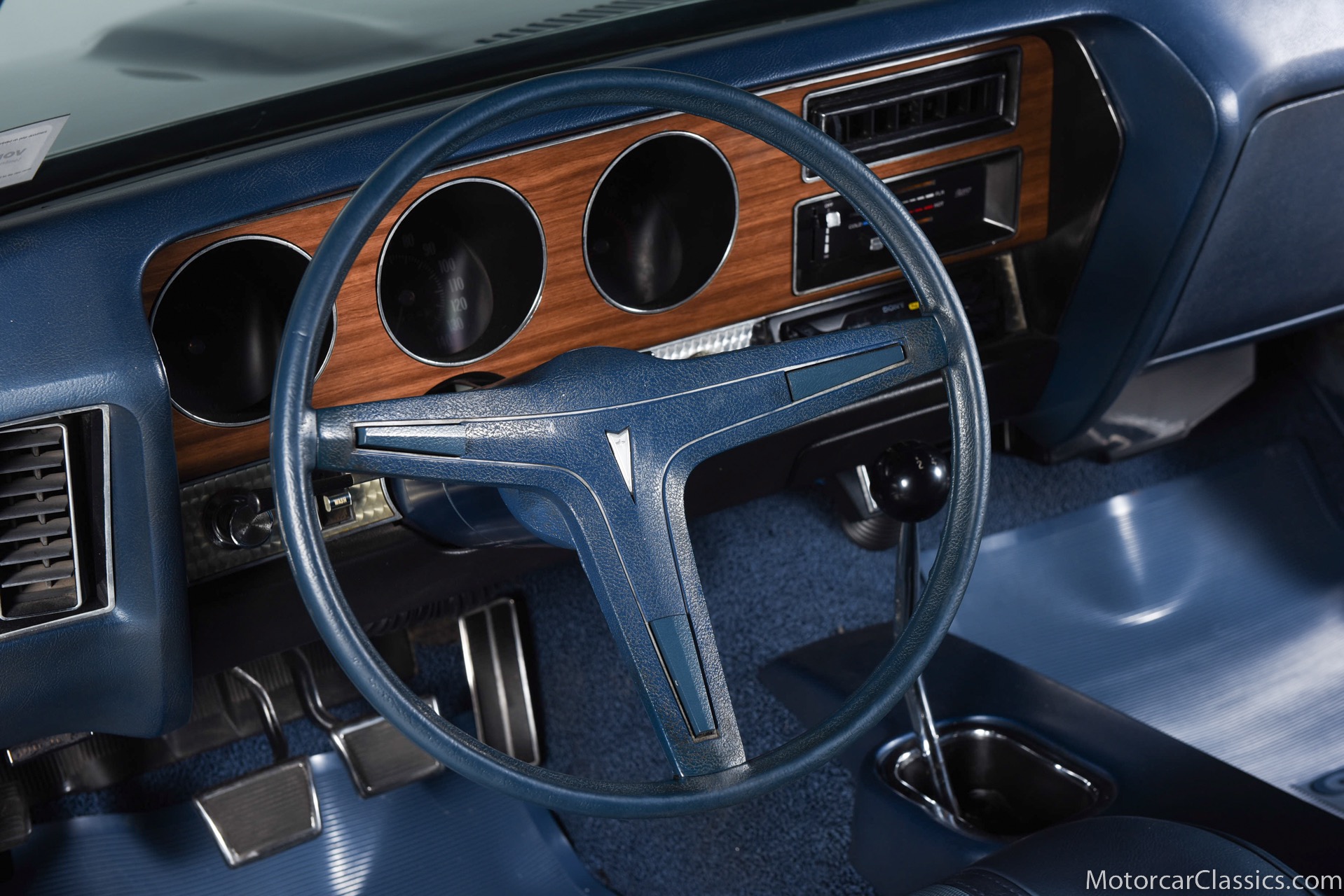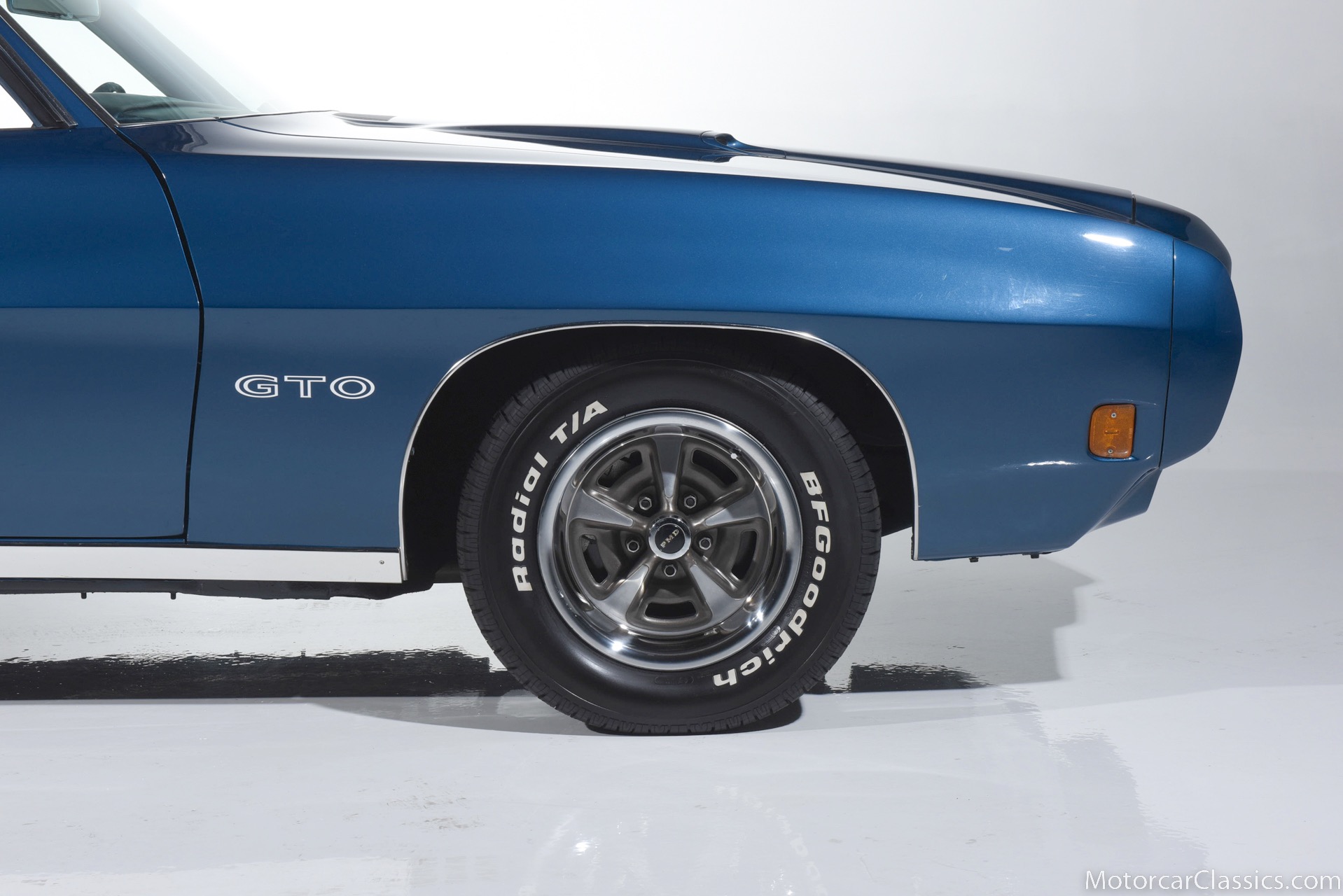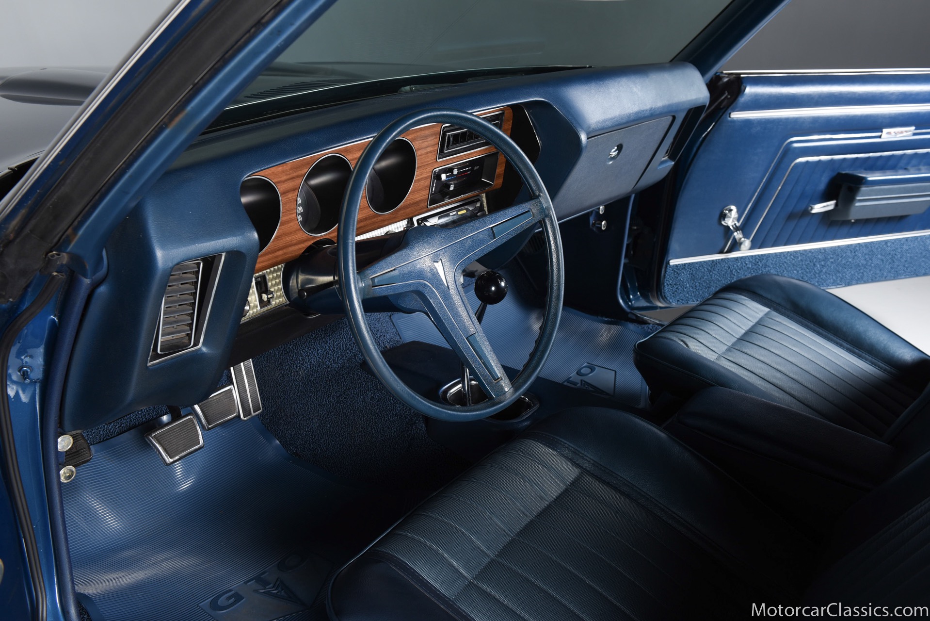 This 1970 GTO is a rust-free car that is straight from every angle. All the gaps are square and flush. The door handles and mirrors have been replaced. The back bumper is original and in good condition. The taillight lenses look new. The weather stripping around the doors and the window seals have been replaced. The front windshield has been replaced. All the tinted glass is in good shape. It sits on a set of 15X7 Pontiac Rally Il wheels with new PMD center caps and correct lug nuts and a set of 245/60/15 BFG T/A radial tires. The original blue interior was completely re-done. The door panels, seat upholstery and cushions, carpet and headliner have been replaced. The dash was recovered. It has factory tach in the dash, new sill plates, AM/FM radio, and factory seat belts (front and rear).