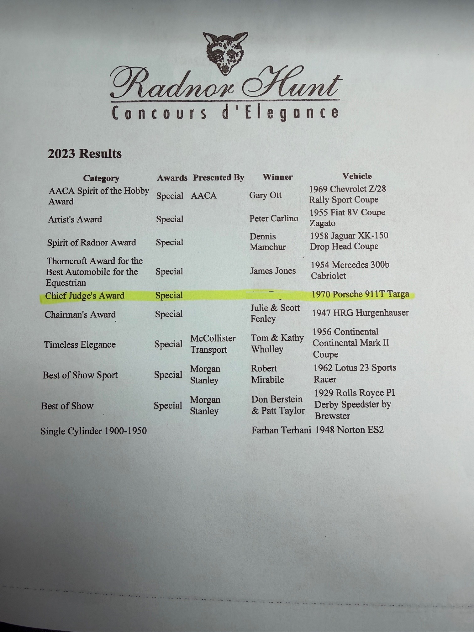 With its matching-numbers drivetrain, factory 2.2-liter specification, and extensively documented concours-level rotisserie restoration, this 911T Targa stands as a highly attractive, investment-grade collectible in the classic 911 hierarchy, especially for enthusiasts who appreciate authenticity, usability, and the unique charm of the Targa format. Early long-hood 911s have long been celebrated for their light, communicative feel and timeless design, and the combination of a period-correct color scheme, five-speed manual gearbox, and carefully restored details makes this example particularly appealing as both a cars-and-coffee centerpiece and a confidence-inspiring weekend driver. For the collector seeking an early 911 that marries significant historical relevance with open-top enjoyment and show-ready presentation, this 1970 911T Targa offers a compelling opportunity to acquire a cornerstone model from one of Porsche's most formative eras.