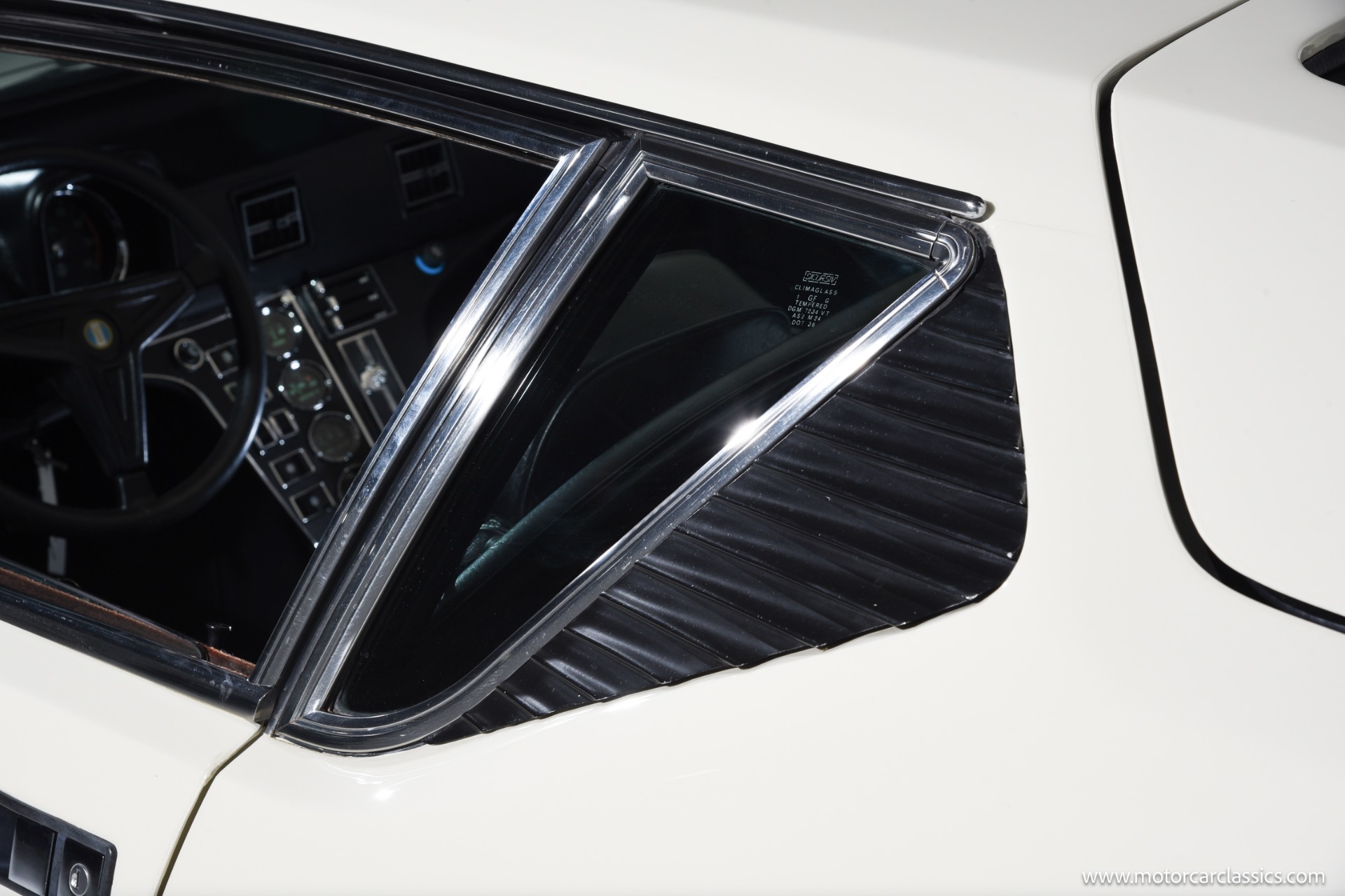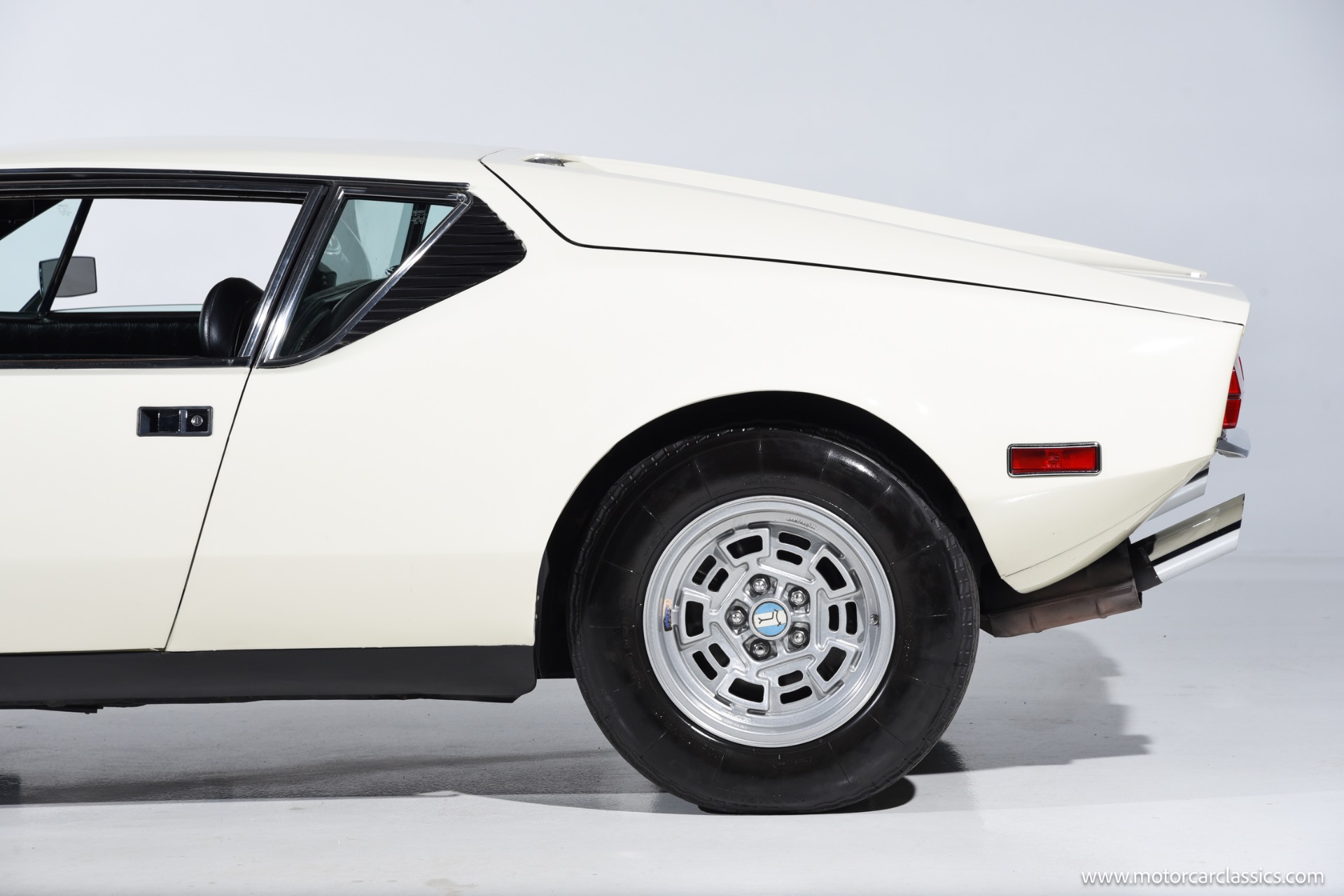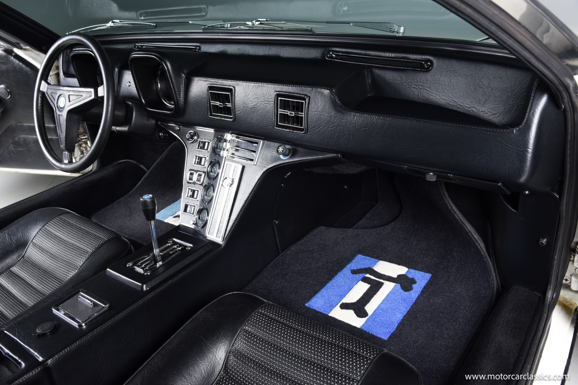 As a 1972 car, this Pantera benefits from early series purity of design combined with the key drive line refinements that arrived after initial production, including the improved four bolt main Cleveland block and more aggressive Cobra Jet cam profile that helped restore much of the output lost to tightening emissions rules. The white exterior flatters the car's crisp wedge profile and flared haunches, emphasizing the low stance, deep side scoops and dramatic engine cover that announce its mid engine layout, while the untouched black interior underscores the car's originality and offers a purposeful environment with simple, driver oriented instrumentation.