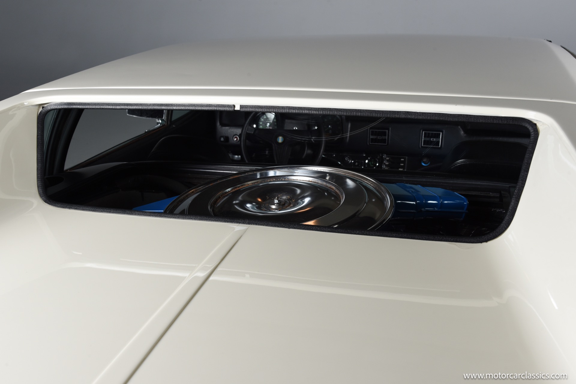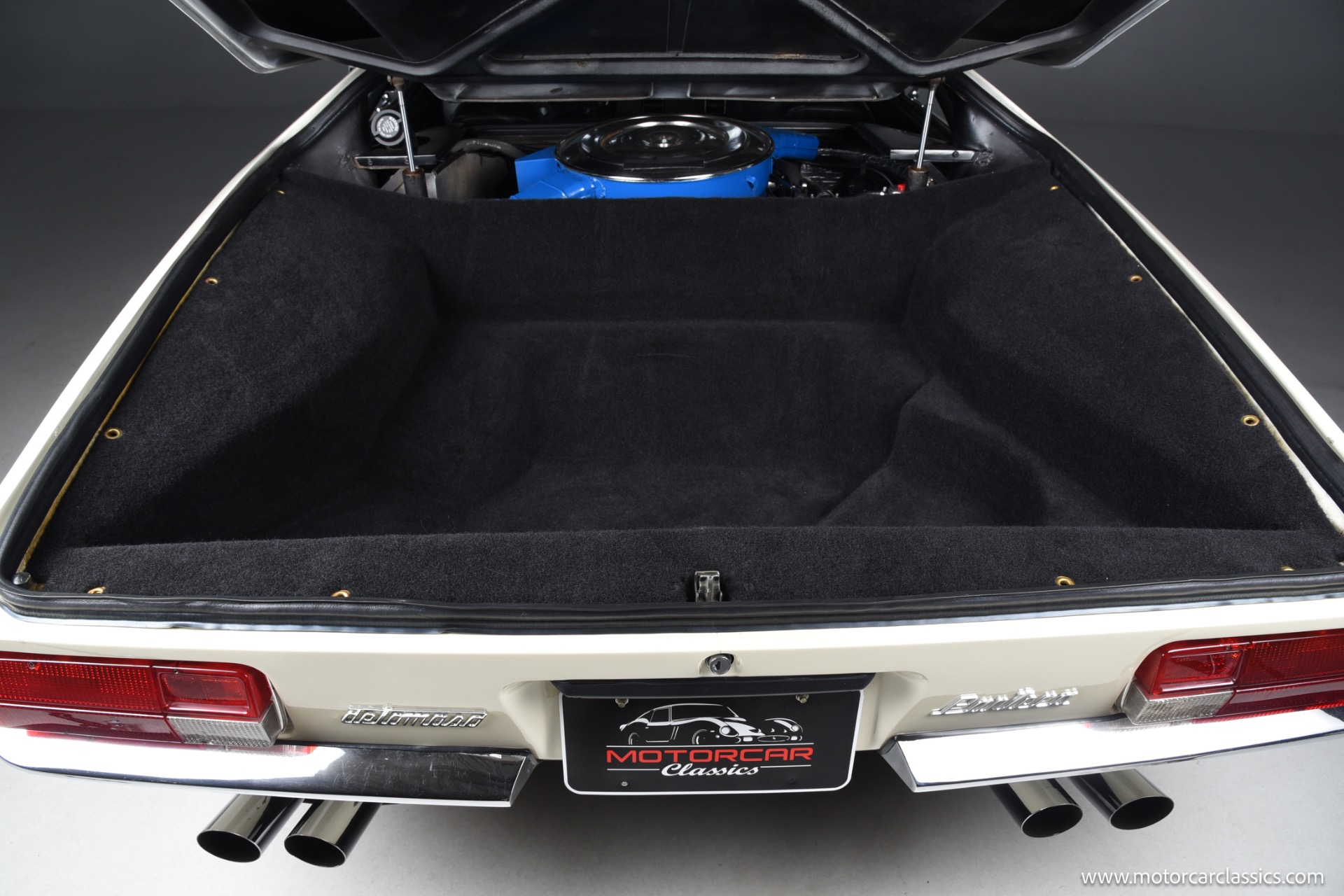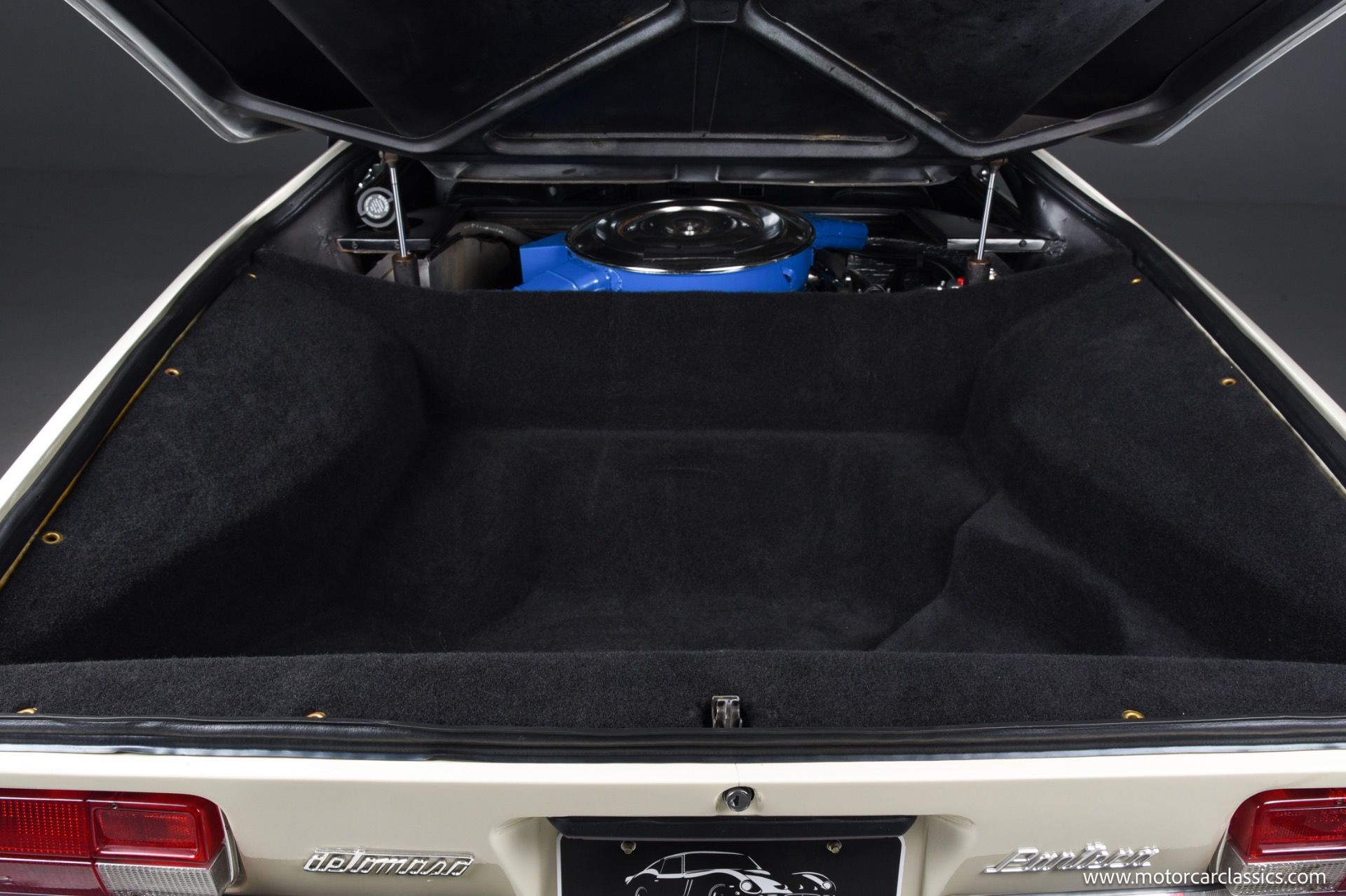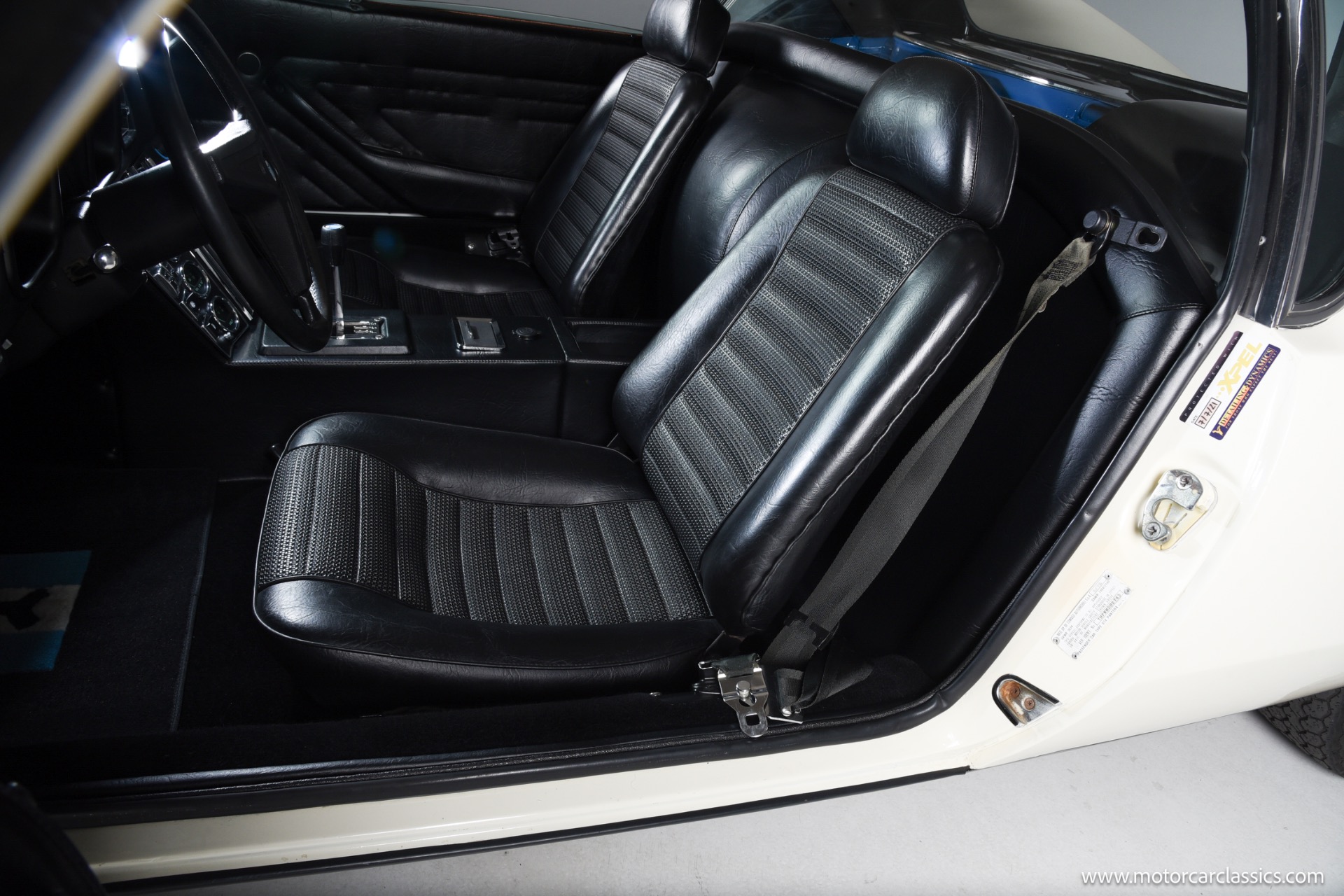 As a 1972 car, this Pantera benefits from early series purity of design combined with the key drive line refinements that arrived after initial production, including the improved four bolt main Cleveland block and more aggressive Cobra Jet cam profile that helped restore much of the output lost to tightening emissions rules. The white exterior flatters the car's crisp wedge profile and flared haunches, emphasizing the low stance, deep side scoops and dramatic engine cover that announce its mid engine layout, while the untouched black interior underscores the car's originality and offers a purposeful environment with simple, driver oriented instrumentation.