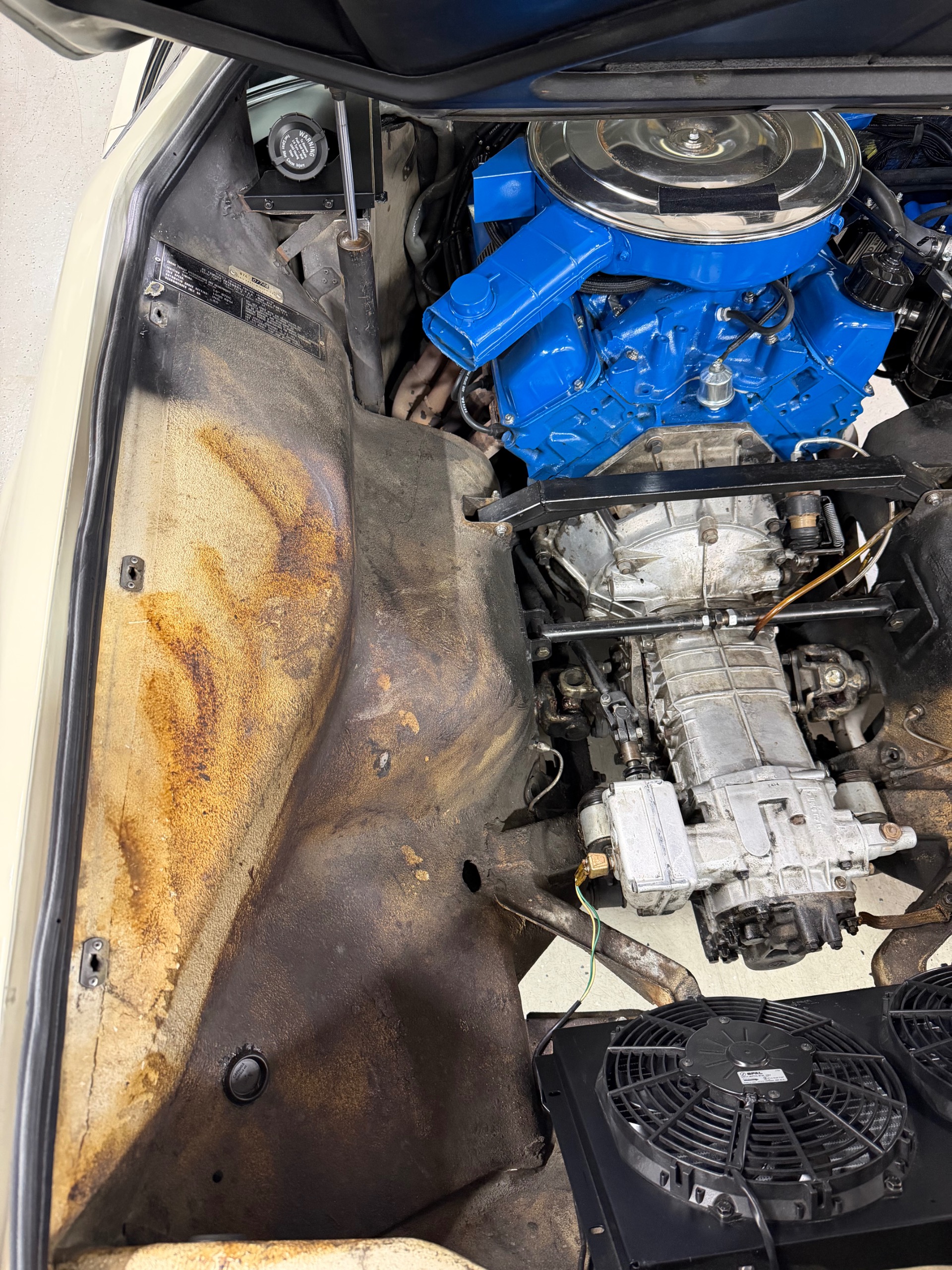 Recent services and upgrades to the car include an updated modern aluminum radiator with new electric fans and an electric fan controller, new headlight actuators and headlights, updated AC components, electronic ignition, new water pump, new alternator, all new belts and hoses.