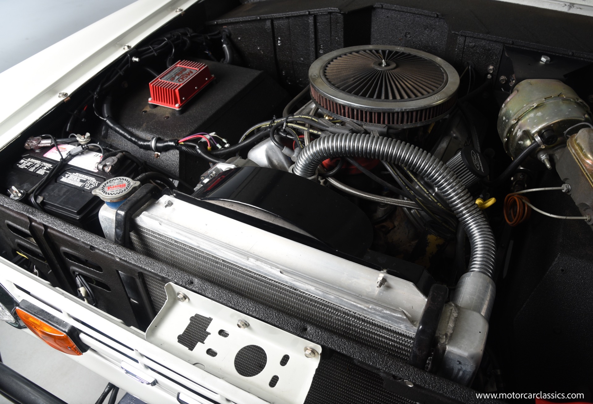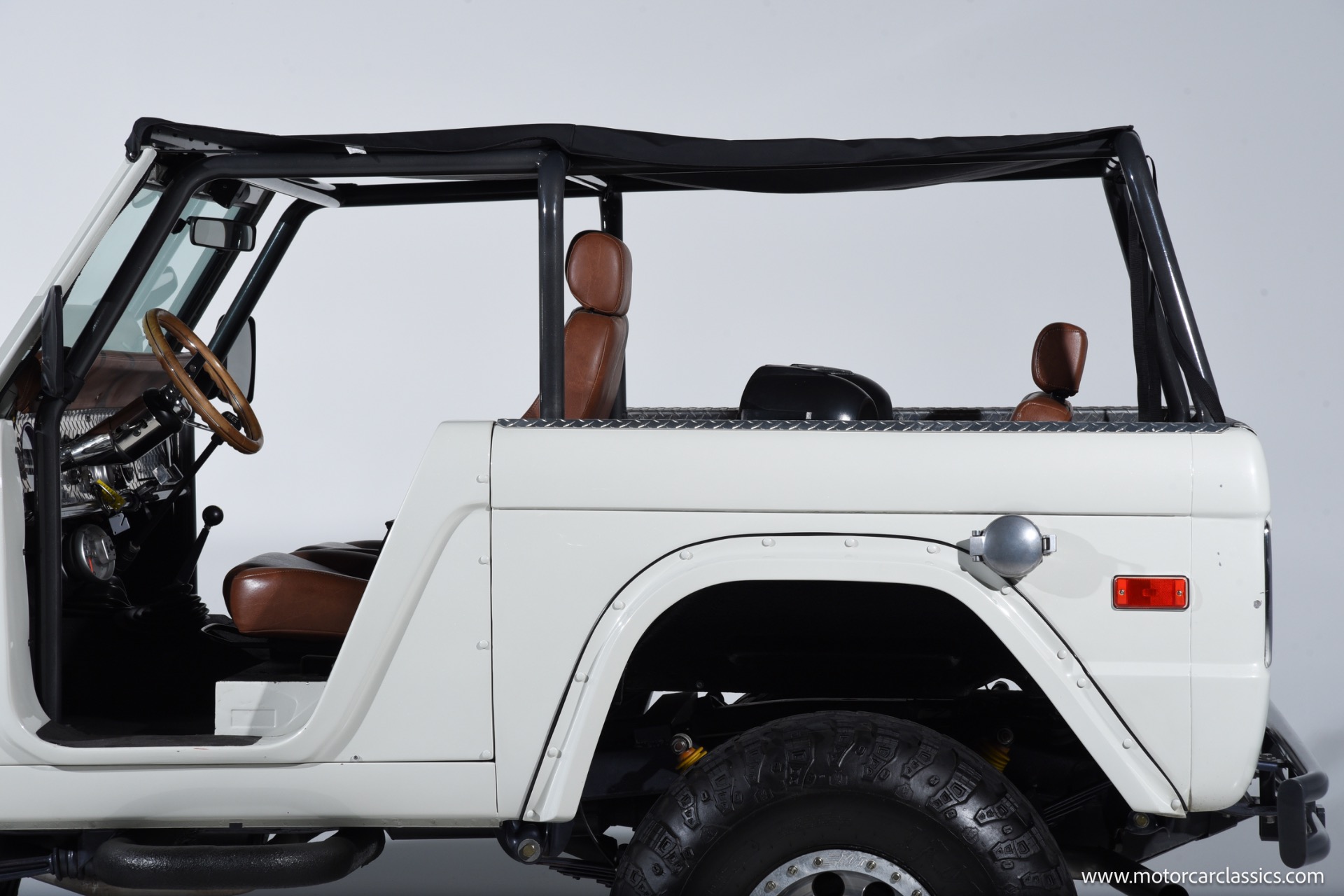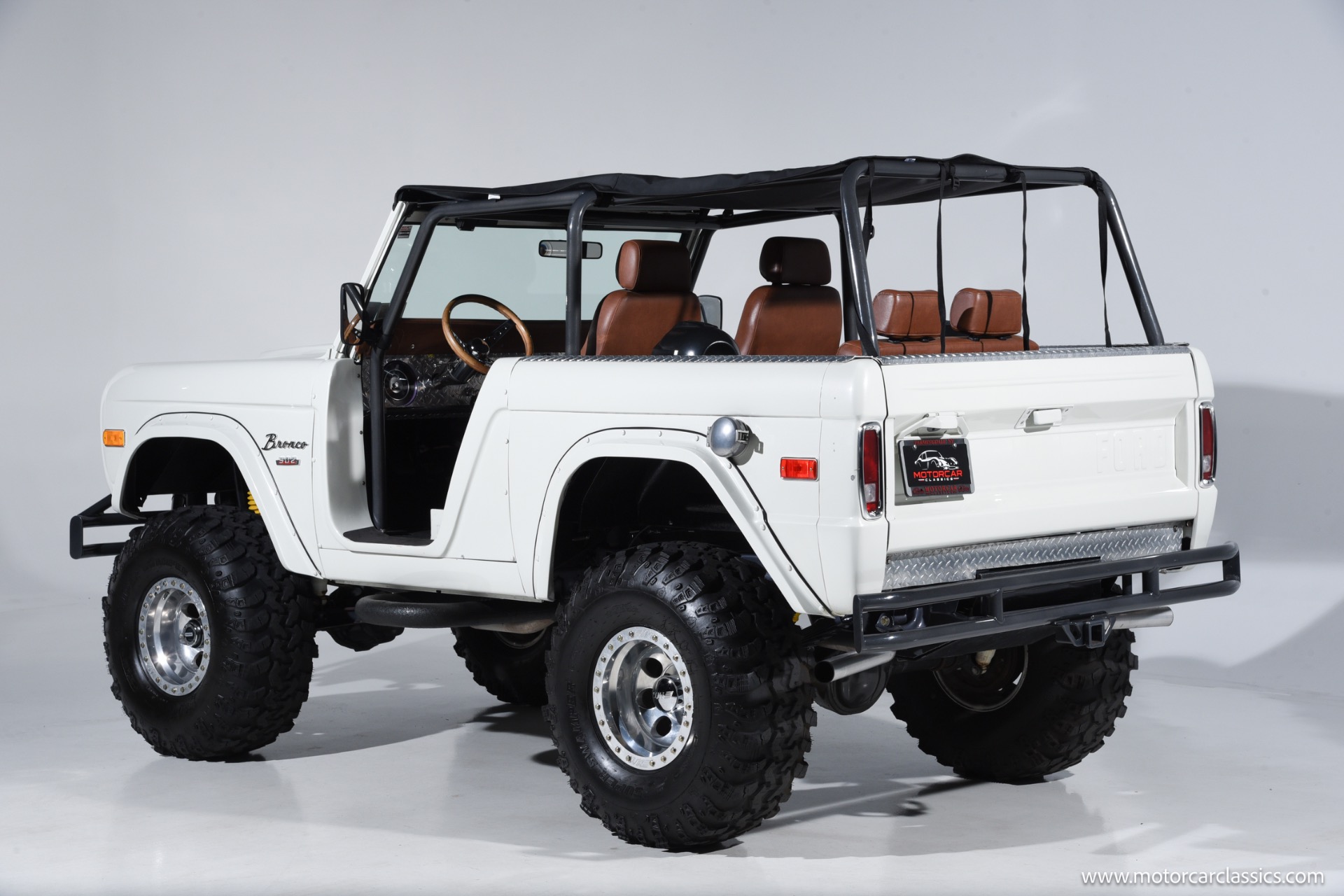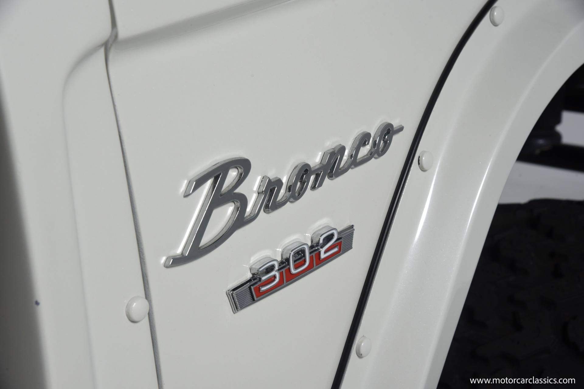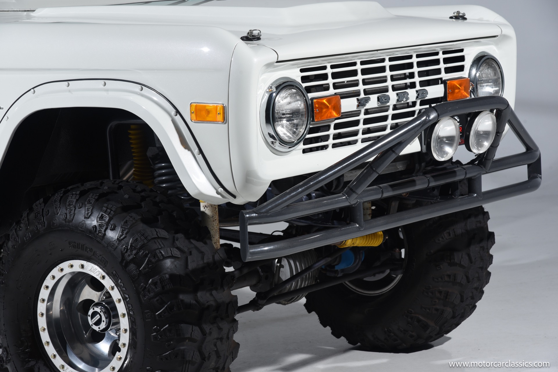 1974 Ford Bronco for sale! Motorcar Classics is pleased to offer this Bronco presented in Wimbledon White with Cognac interior. 6962 miles. Equipped with a 302ci V8 engine and 5 speed manual transmission with 4WD. This Bronco was subject to a frame off restoration. Upgrades include: Edelbrock intake, Edelbrock four-barrel carburetor, Flaming River steering shaft, dual front shocks, Autometer Pro Comp gauges, MSD ignition, aluminum radiator with electric fan, dual exhaust and polished Mickey Thompson wheels on 35 MT tires, waterproof Marine sound system, waterproofed flooring, electronic emergency brake, Vintage Bronco custom interior and more! Your inspection is invited.
