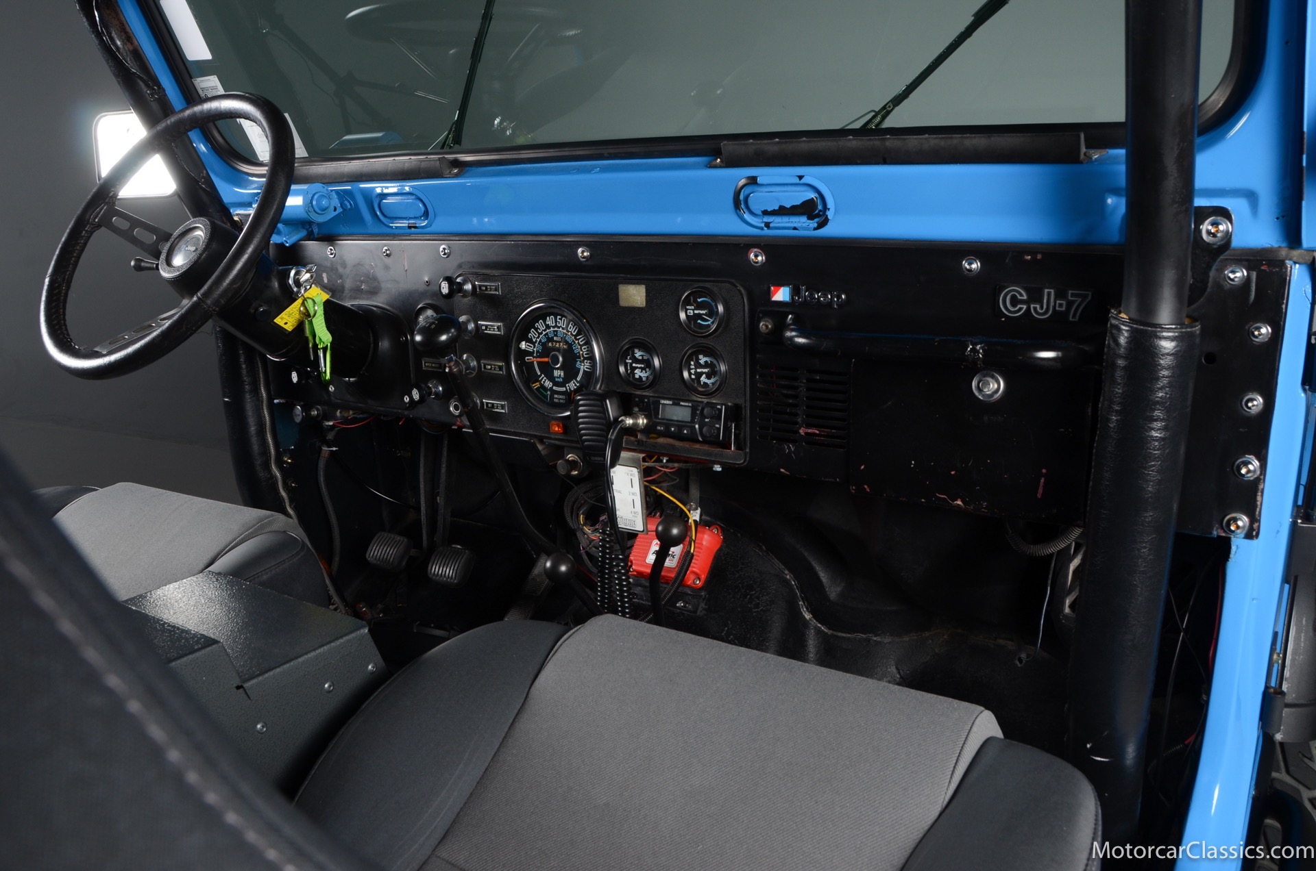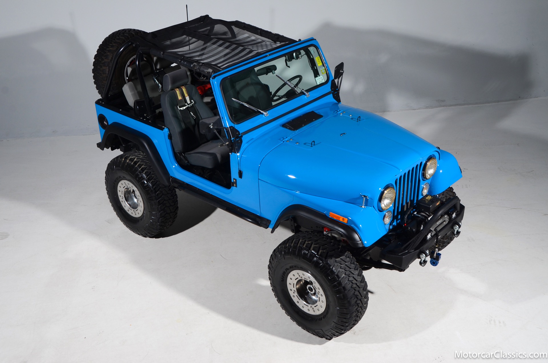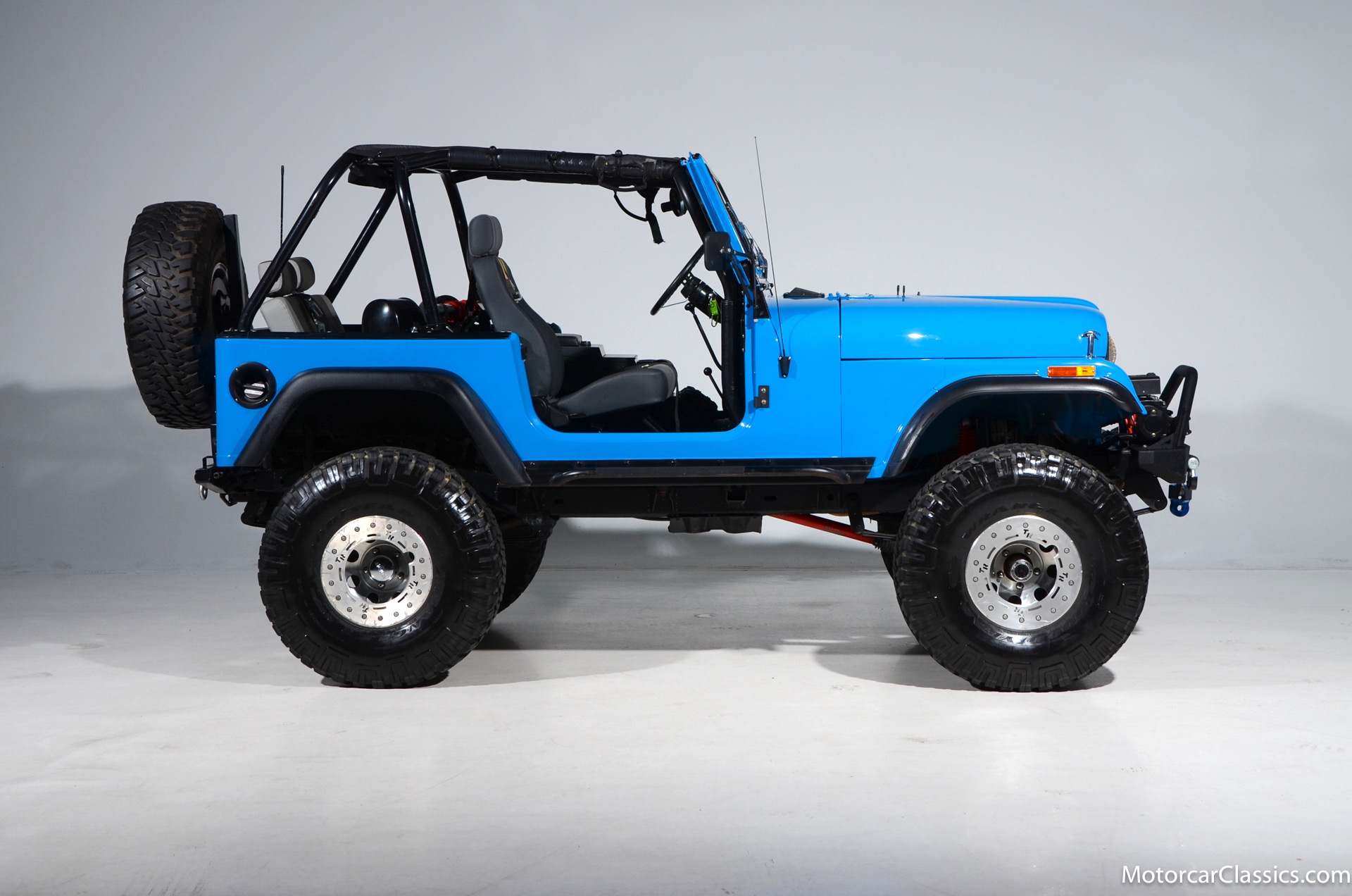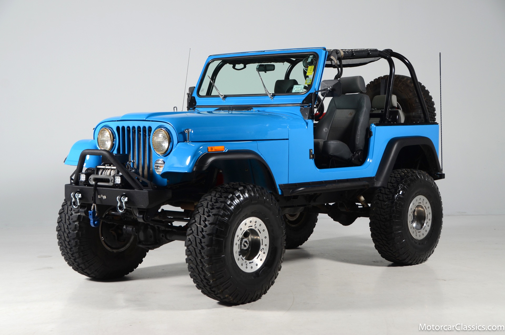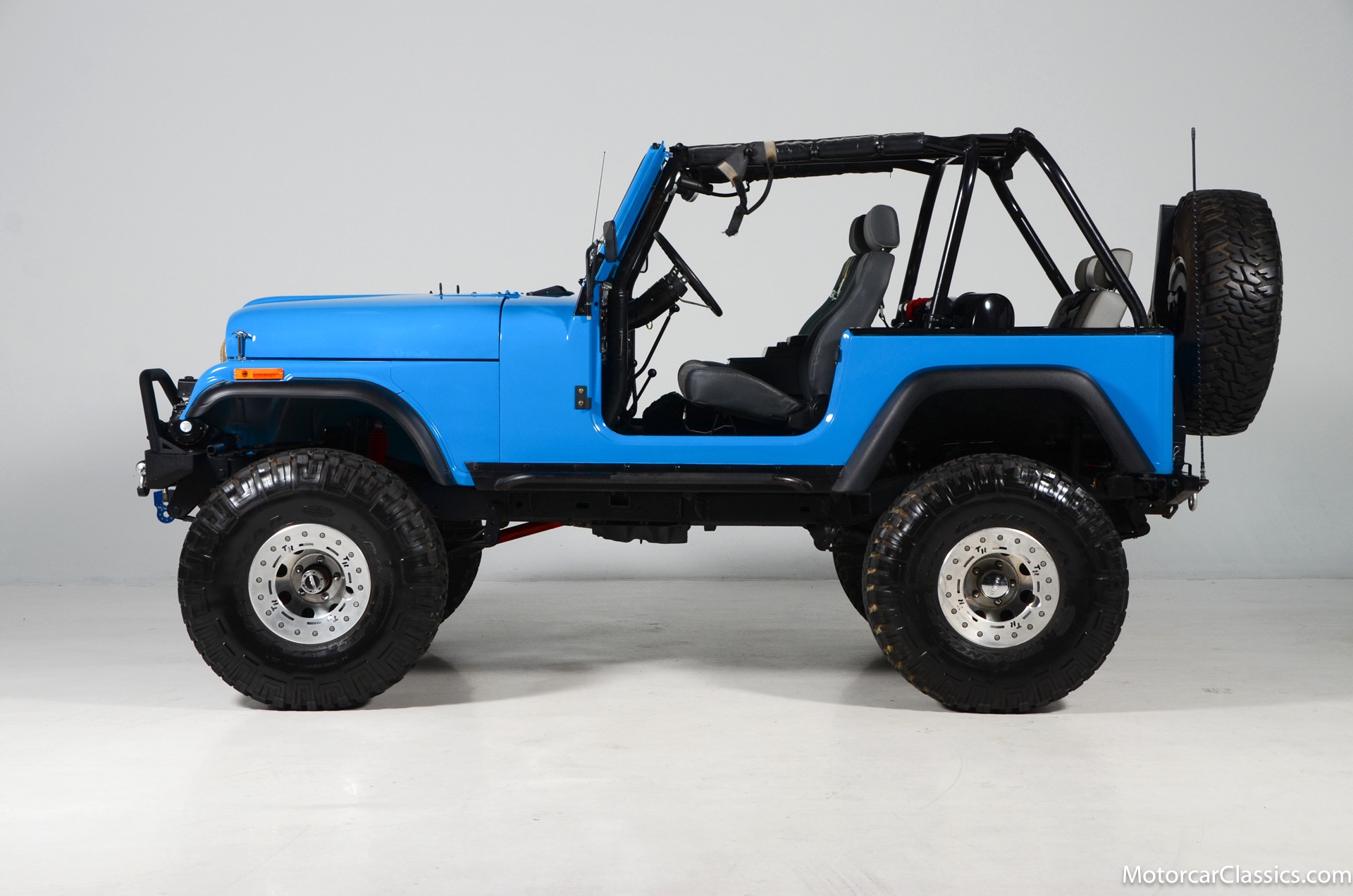 1977 Jeep CJ7 Custom for sale! Motorcar Classics is pleased to present this awesome 1977 Jeep CJ7 custom featured in medium blue with black interior. This Jeep is powered by the 304CI V8, mated to a 4-speed manual gearbox with Twin-Stick transfer case. It has MSD ignition, Line Lock, CB radio, fiberglass tub, custom roll bar and frenched taillights. It has Dana 44 axles, Goodyear 37 x 12.5 x 15 tires with plenty of tread on bead locks. There is a Bluetooth stereo in a locking console compartment with new Rockford Fosgate speaker front and rear. The interior features Bestop Trailmax seats with 5-point racing harnesses up front, and 4-point harnesses in the rear. This classic Jeep is street-legal but it was professionally built and equipped for some serious off-roading. It is turn-key and ready to take you and three friends pretty much anywhere!