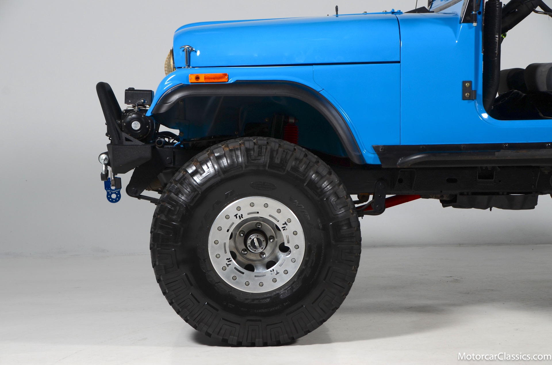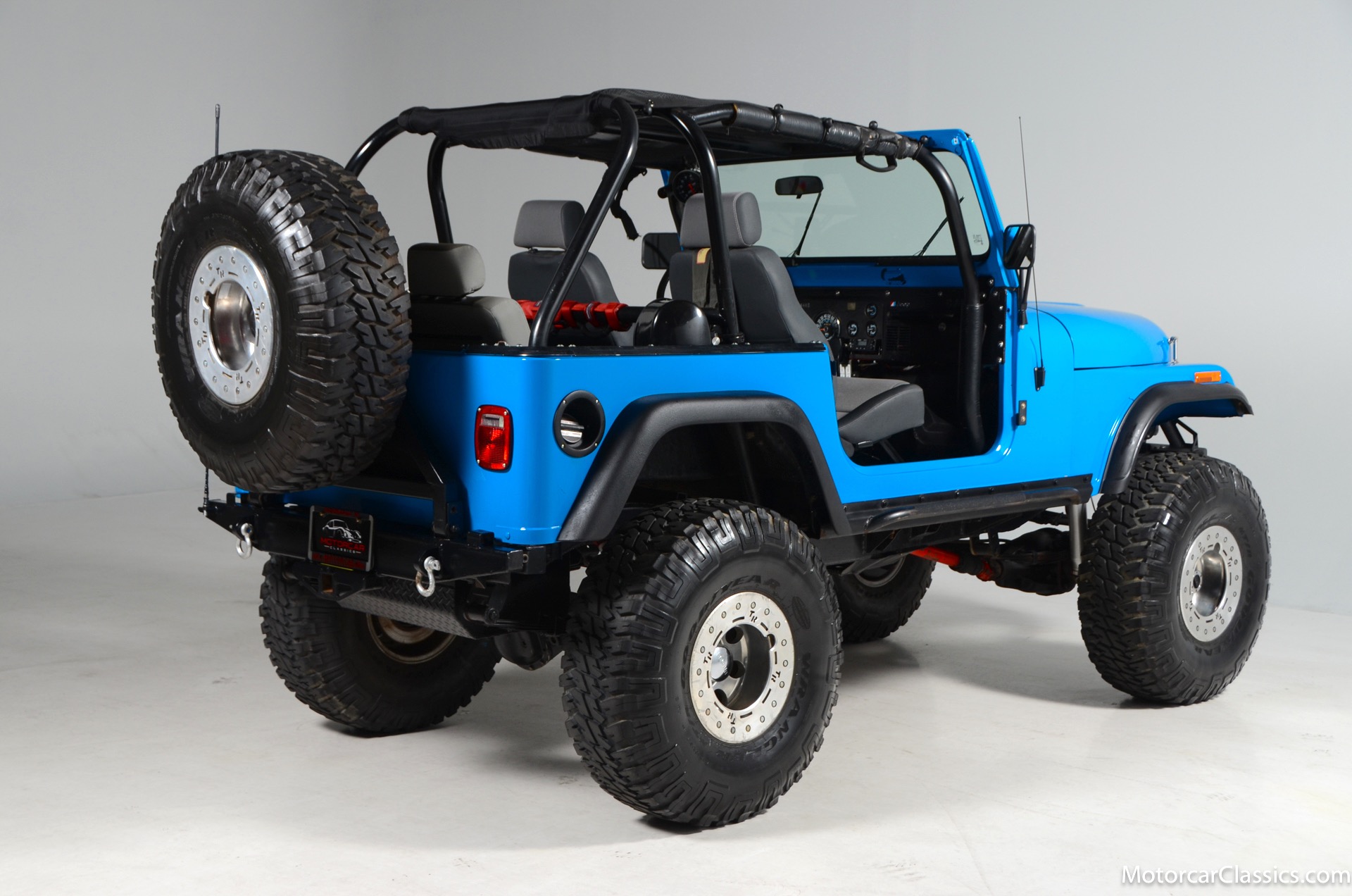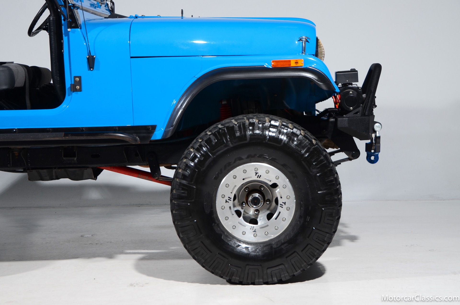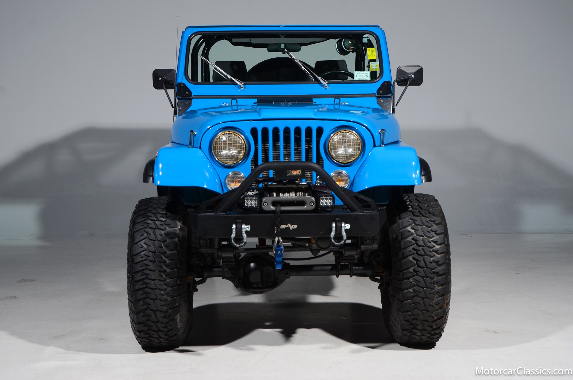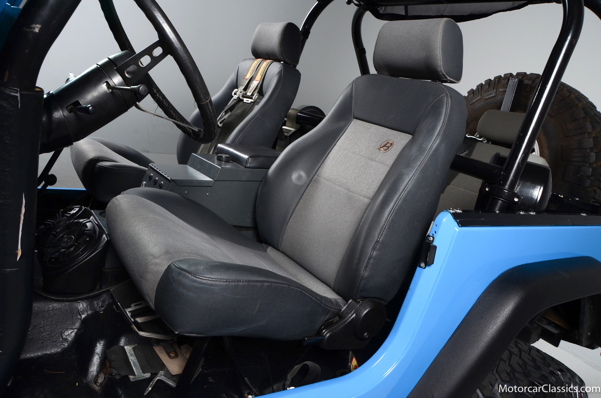 1977 Jeep CJ7 Custom for sale! Motorcar Classics is pleased to present this awesome 1977 Jeep CJ7 custom featured in medium blue with black interior. This Jeep is powered by the 304CI V8, mated to a 4-speed manual gearbox with Twin-Stick transfer case. It has MSD ignition, Line Lock, CB radio, fiberglass tub, custom roll bar and frenched taillights. It has Dana 44 axles, Goodyear 37 x 12.5 x 15 tires with plenty of tread on bead locks. There is a Bluetooth stereo in a locking console compartment with new Rockford Fosgate speaker front and rear. The interior features Bestop Trailmax seats with 5-point racing harnesses up front, and 4-point harnesses in the rear. This classic Jeep is street-legal but it was professionally built and equipped for some serious off-roading. It is turn-key and ready to take you and three friends pretty much anywhere!