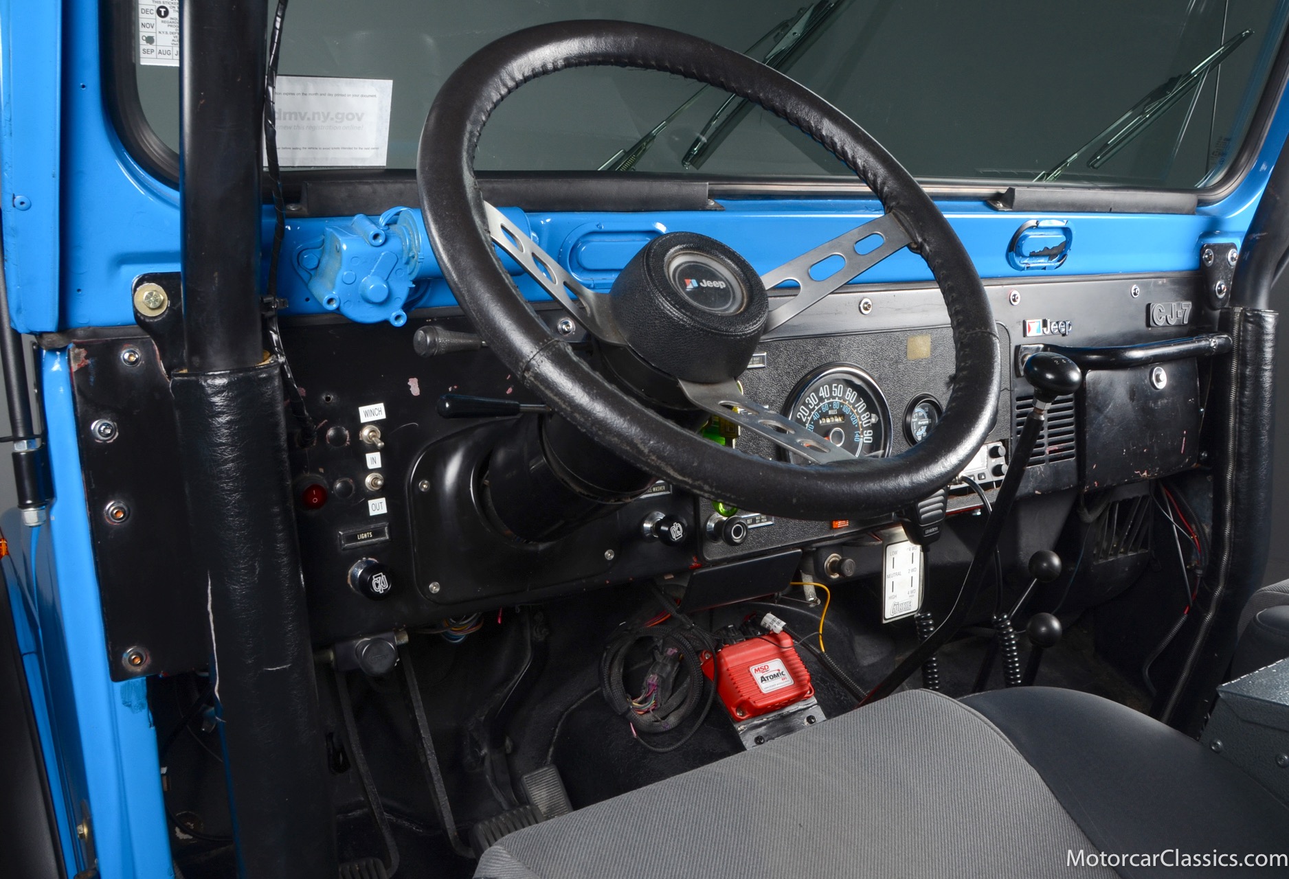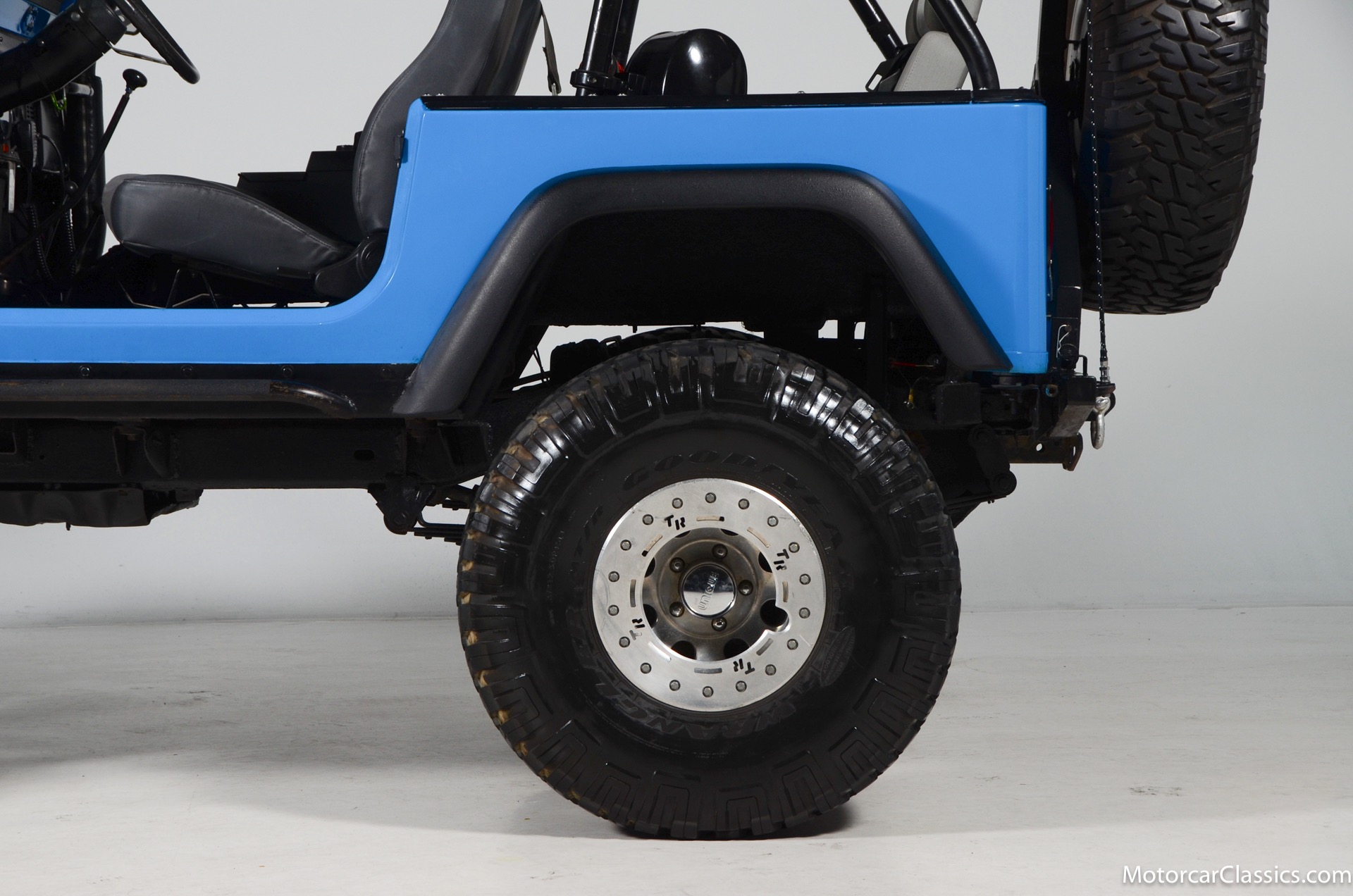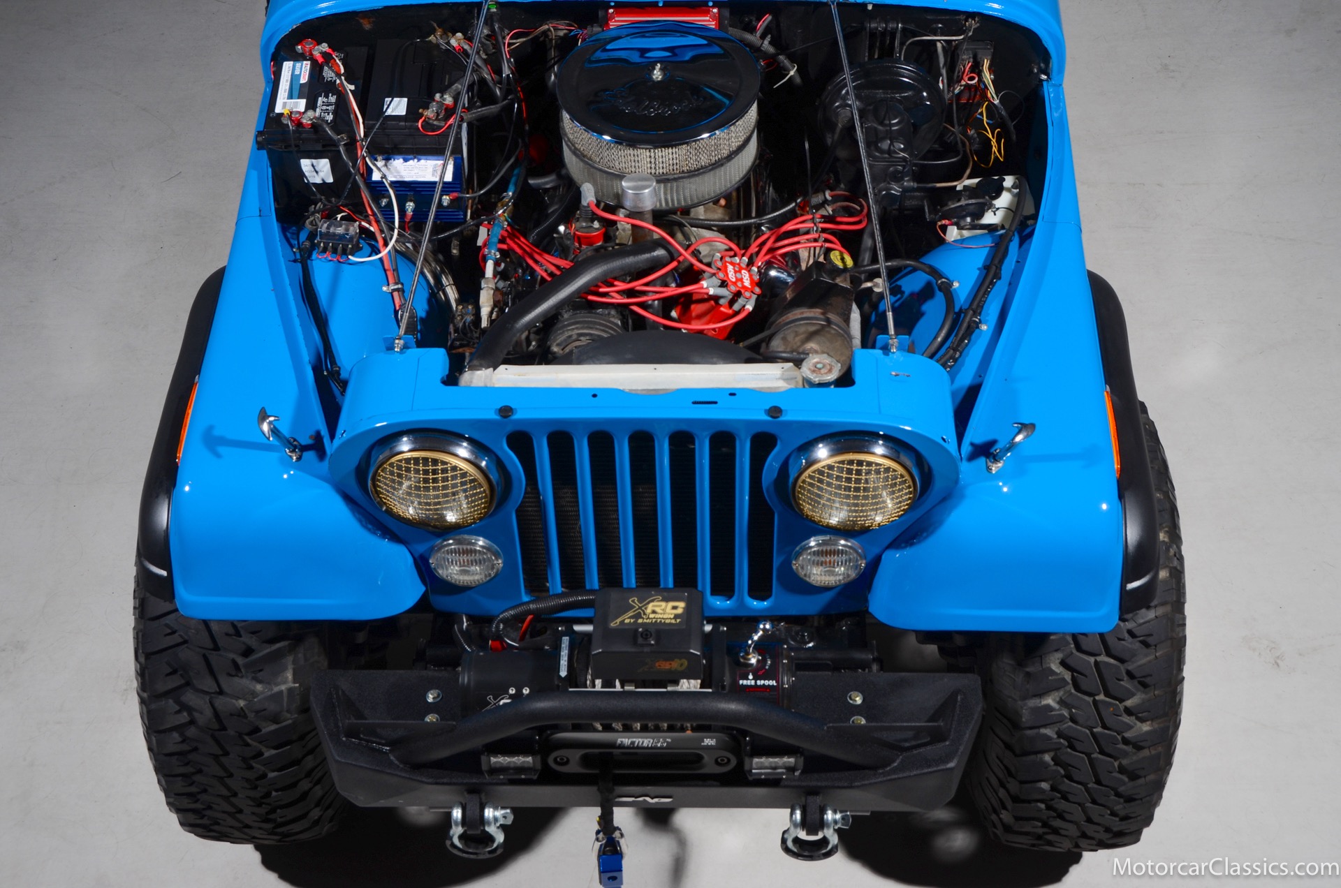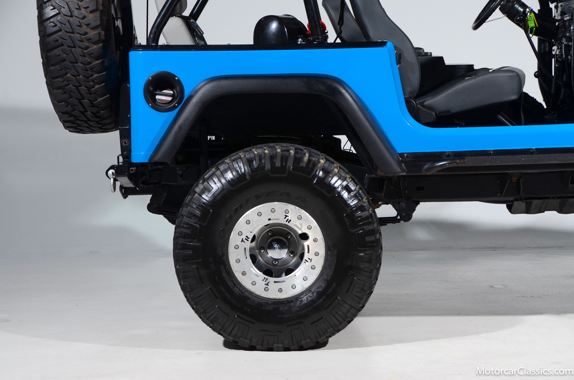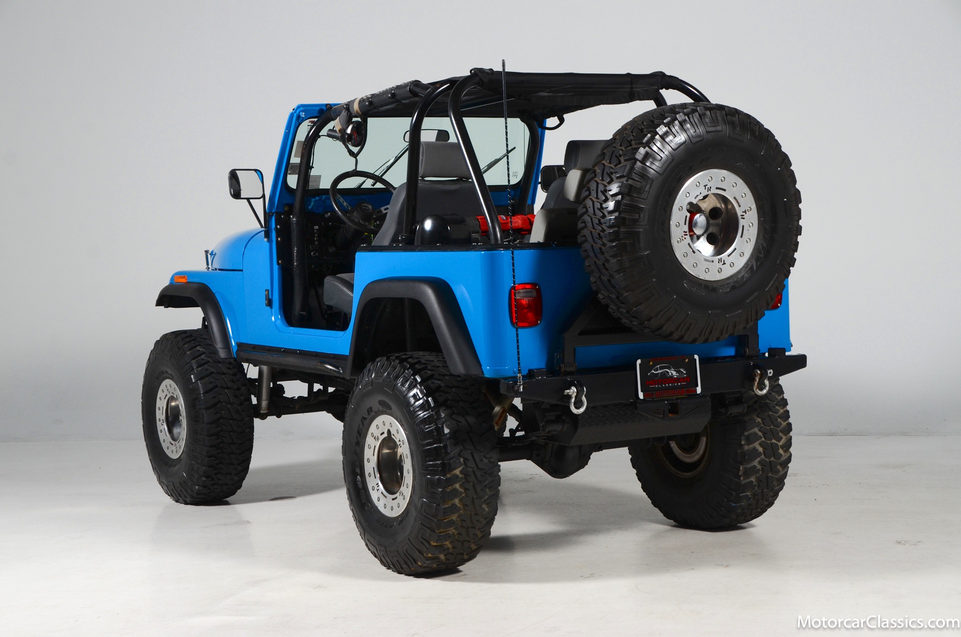 1977 Jeep CJ7 Custom for sale! Motorcar Classics is pleased to present this awesome 1977 Jeep CJ7 custom featured in medium blue with black interior. This Jeep is powered by the 304CI V8, mated to a 4-speed manual gearbox with Twin-Stick transfer case. It has MSD ignition, Line Lock, CB radio, fiberglass tub, custom roll bar and frenched taillights. It has Dana 44 axles, Goodyear 37 x 12.5 x 15 tires with plenty of tread on bead locks. There is a Bluetooth stereo in a locking console compartment with new Rockford Fosgate speaker front and rear. The interior features Bestop Trailmax seats with 5-point racing harnesses up front, and 4-point harnesses in the rear. This classic Jeep is street-legal but it was professionally built and equipped for some serious off-roading. It is turn-key and ready to take you and three friends pretty much anywhere!