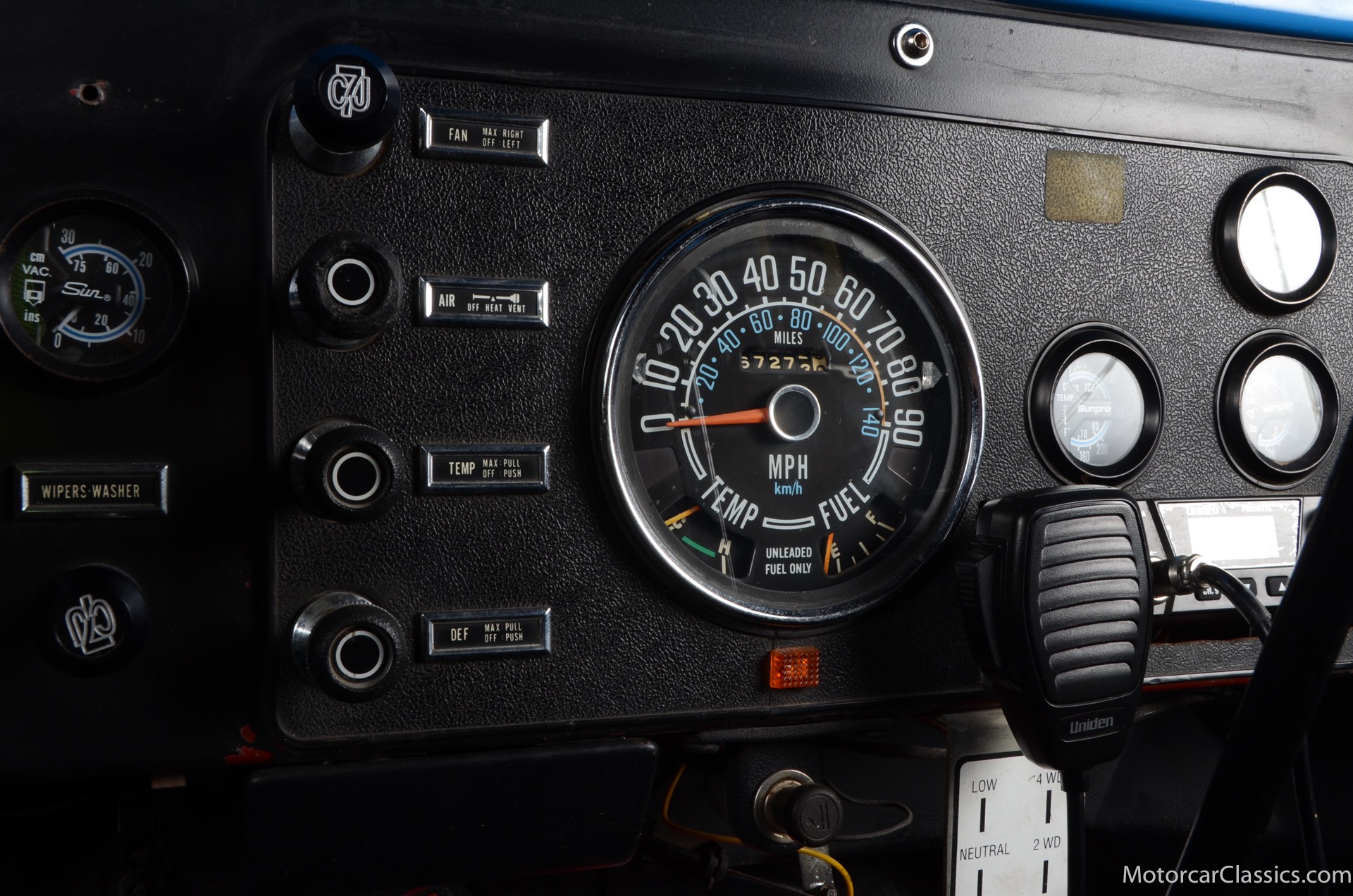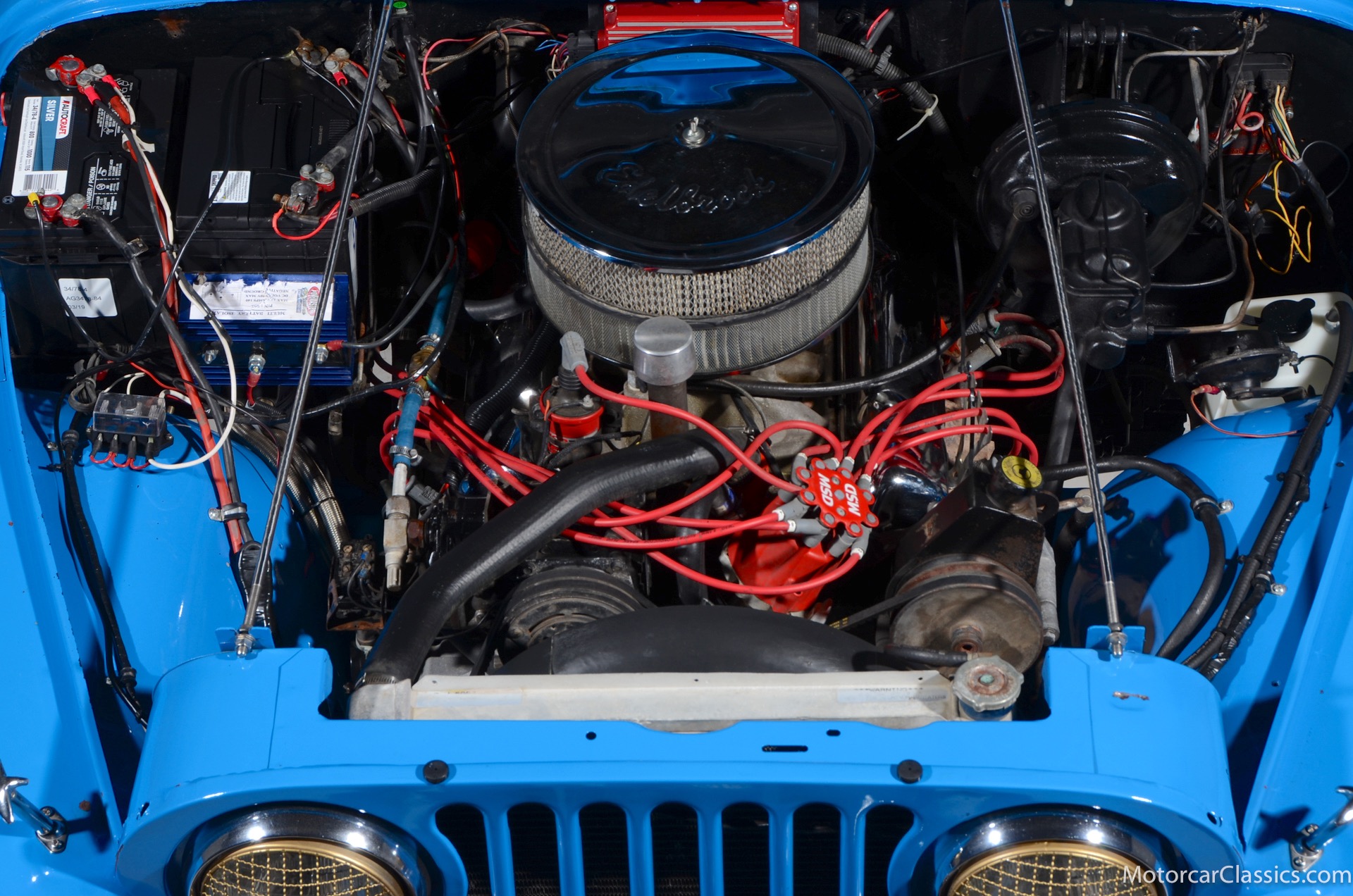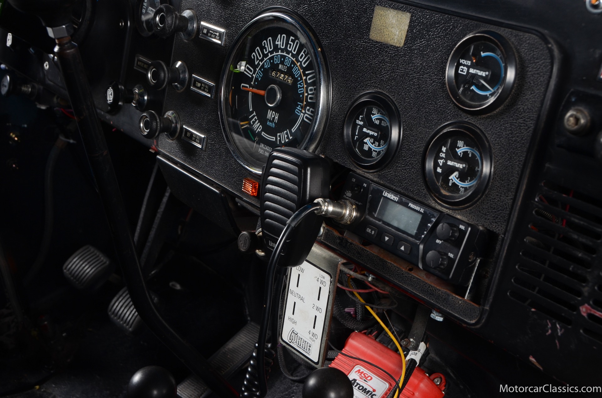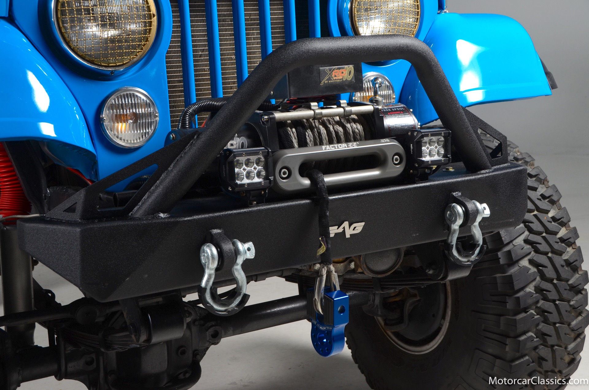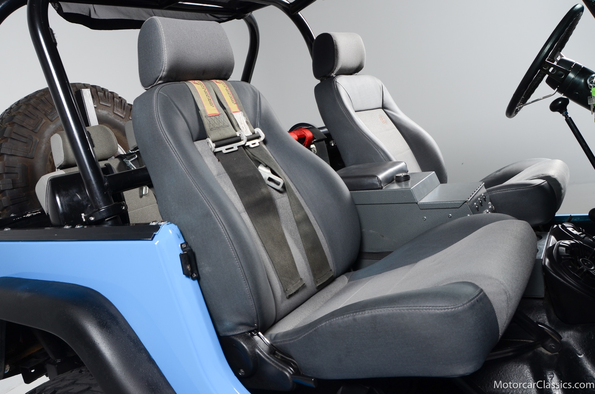 1977 Jeep CJ7 Custom for sale! Motorcar Classics is pleased to present this awesome 1977 Jeep CJ7 custom featured in medium blue with black interior. This Jeep is powered by the 304CI V8, mated to a 4-speed manual gearbox with Twin-Stick transfer case. It has MSD ignition, Line Lock, CB radio, fiberglass tub, custom roll bar and frenched taillights. It has Dana 44 axles, Goodyear 37 x 12.5 x 15 tires with plenty of tread on bead locks. There is a Bluetooth stereo in a locking console compartment with new Rockford Fosgate speaker front and rear. The interior features Bestop Trailmax seats with 5-point racing harnesses up front, and 4-point harnesses in the rear. This classic Jeep is street-legal but it was professionally built and equipped for some serious off-roading. It is turn-key and ready to take you and three friends pretty much anywhere!