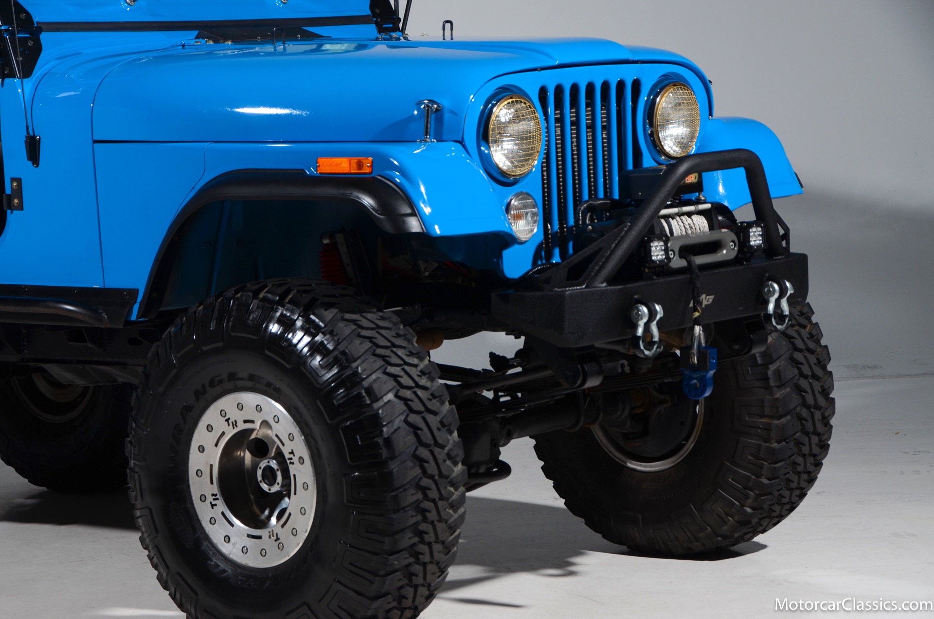 1977 Jeep CJ7 Custom for sale! Motorcar Classics is pleased to present this awesome 1977 Jeep CJ7 custom featured in medium blue with black interior. This Jeep is powered by the 304CI V8, mated to a 4-speed manual gearbox with Twin-Stick transfer case. It has MSD ignition, Line Lock, CB radio, fiberglass tub, custom roll bar and frenched taillights. It has Dana 44 axles, Goodyear 37 x 12.5 x 15 tires with plenty of tread on bead locks. There is a Bluetooth stereo in a locking console compartment with new Rockford Fosgate speaker front and rear. The interior features Bestop Trailmax seats with 5-point racing harnesses up front, and 4-point harnesses in the rear. This classic Jeep is street-legal but it was professionally built and equipped for some serious off-roading. It is turn-key and ready to take you and three friends pretty much anywhere!