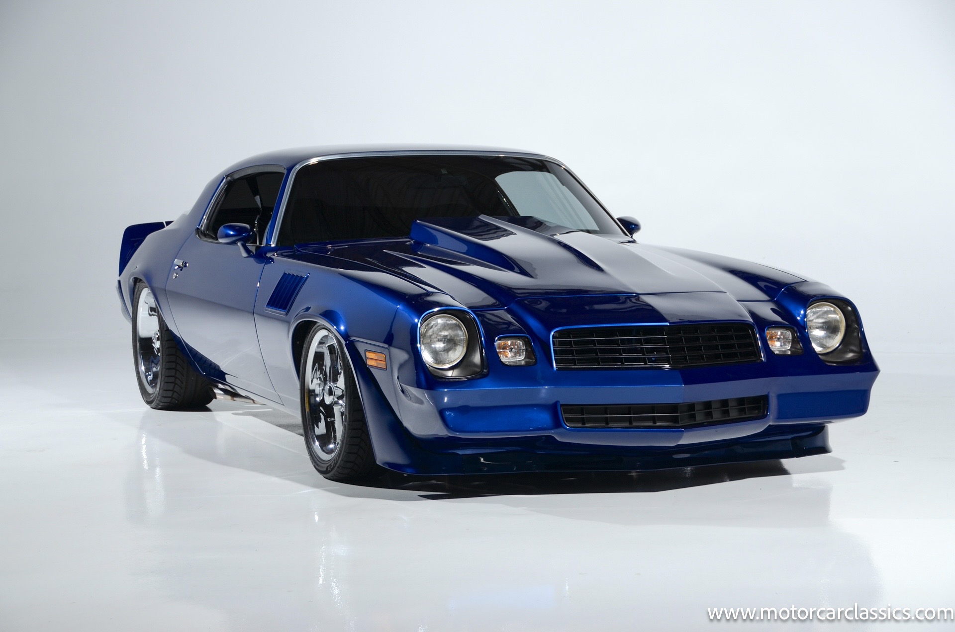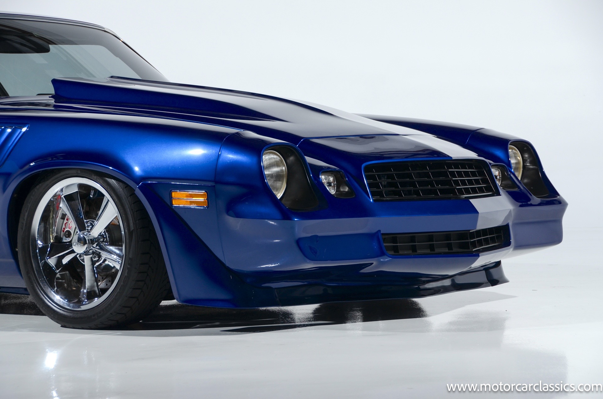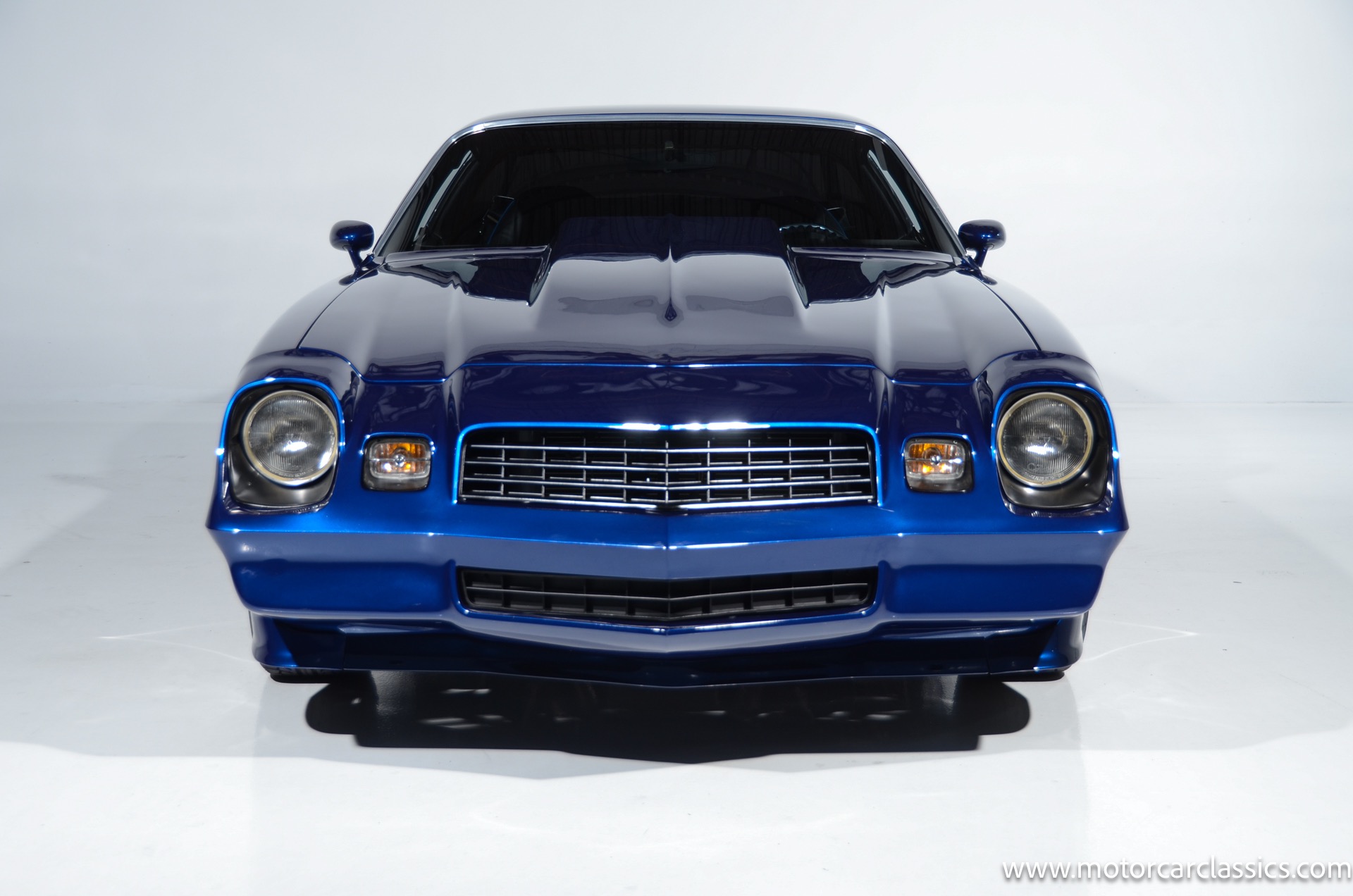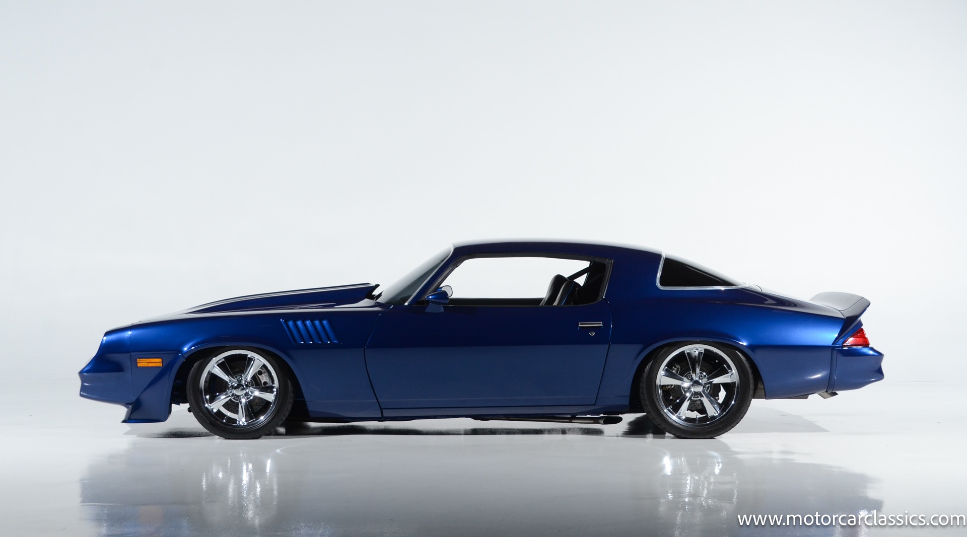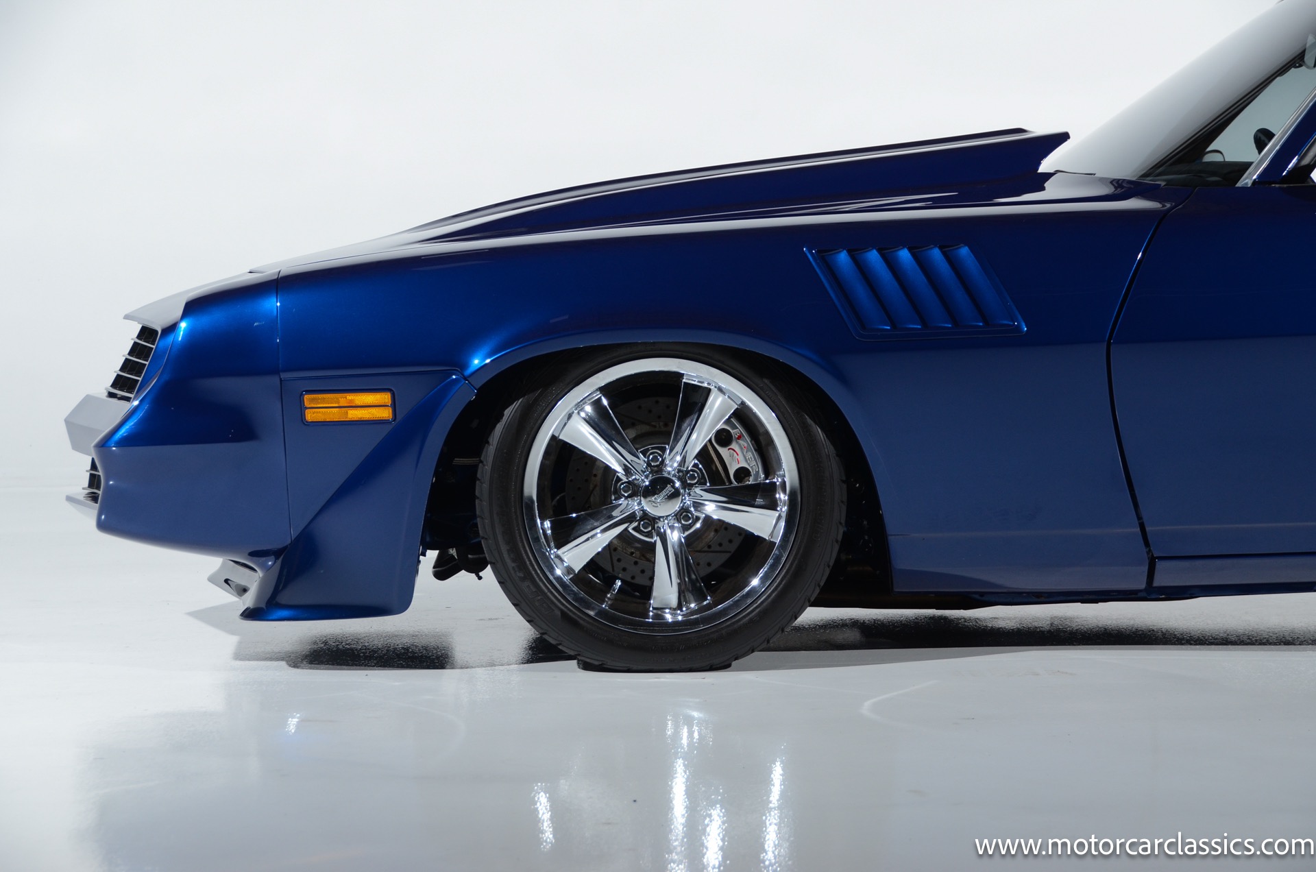 1979 Chevrolet Camaro Z28 for sale! Motorcar Classics is pleased to present this awesome 1979 Camaro Z28 restomod featured in metallic blue with a black custom interior, with blue inserts. This is a professionally built car with the highest quality components, including: 350 CI 5.7L Chevrolet V8 with Brodix aluminum heads and intake manifold and Edelbrock carburetor mated to a Turbo 350 automatic transmission. The engine was built by McBetts racing engine and stroked to 383 CI with approximately 650 HP! The engine has a TrueTrac Billet Specialities serpentine system and polished aluminum water pump. Under the hood you will find a BeCool 4-row aluminum radiator, MSD ignition, stainless steel braided AC lines and heater hoses, American Racing stainless steel headers, and Vintage Air Heat & AC System. There is a 3" stainless steel exhaust with X pipe and Magnaflow mufflers, and an electric Dual Y Dump exhaust cutouts that exit forward of the rear tires. The car rides on Air Ride suspension, with 4-Link rear suspension and Baer 4-wheel disc brakes. The interior features power windows, Ididit billet aluminum tilt steering column and a Pioneer sound system.The car has been fully-sorted and is a thrill to drive. Your inspection is invited.