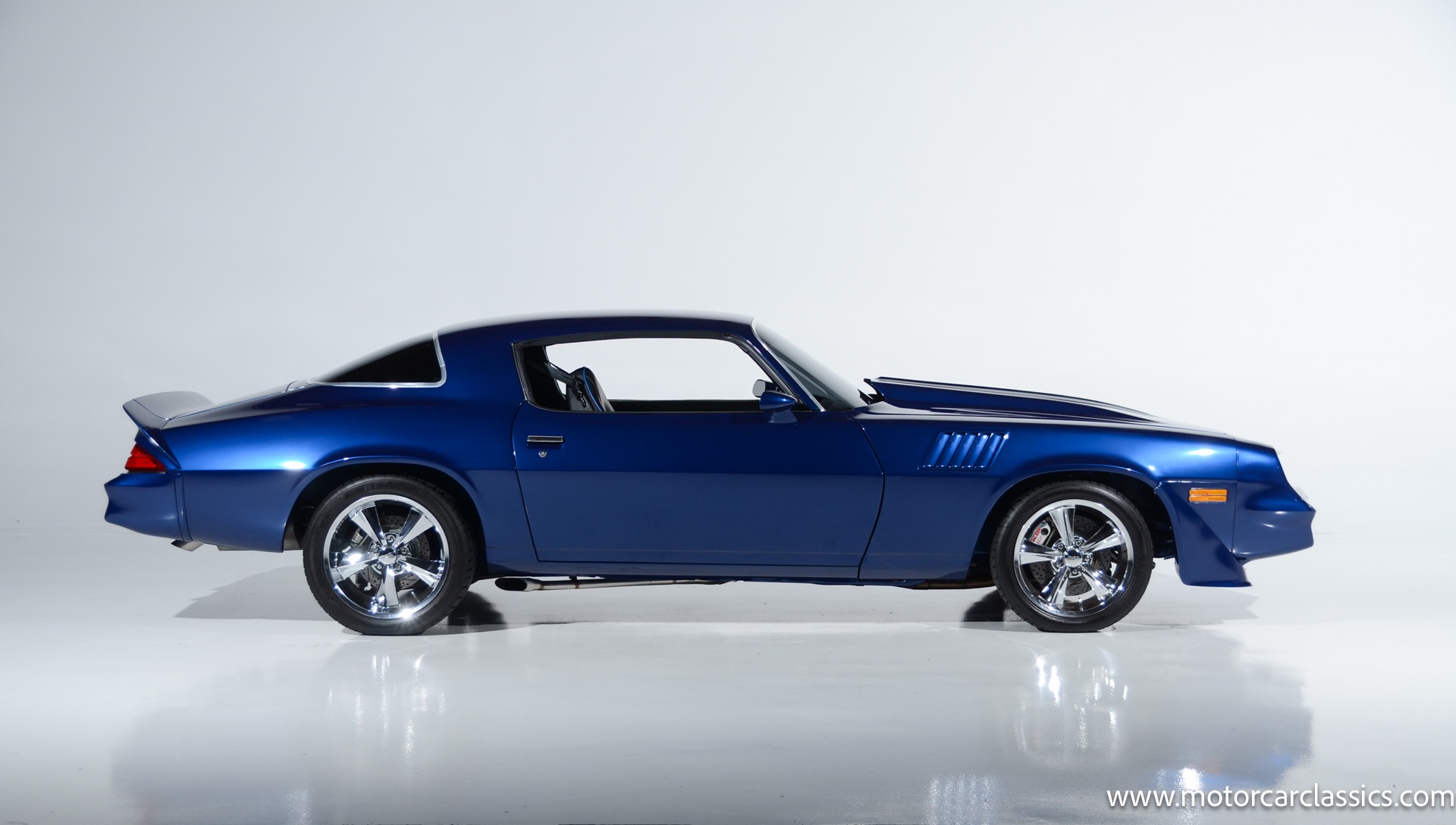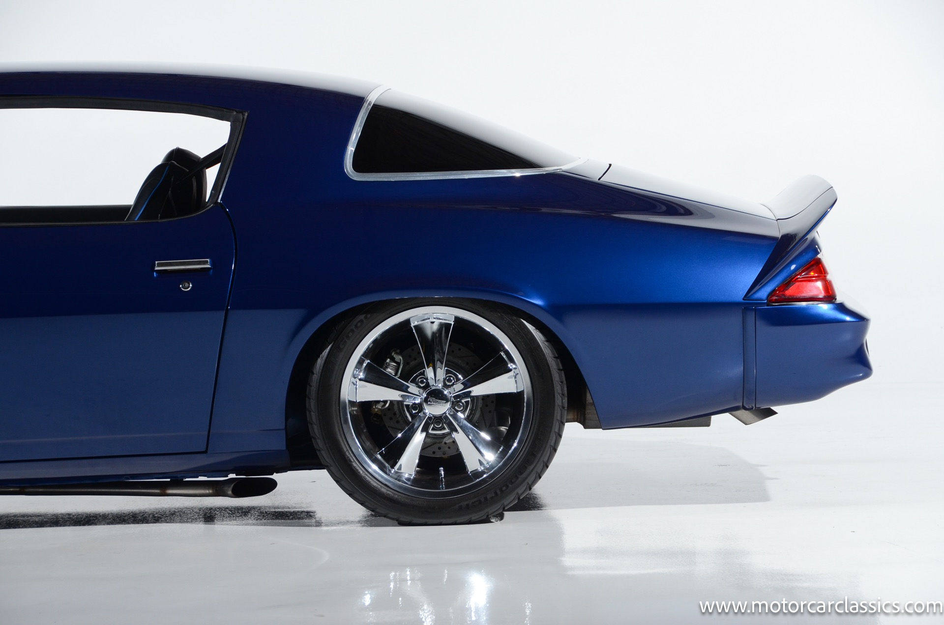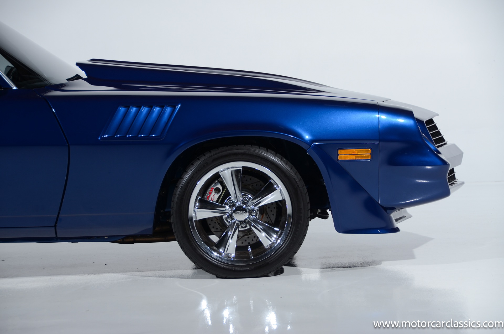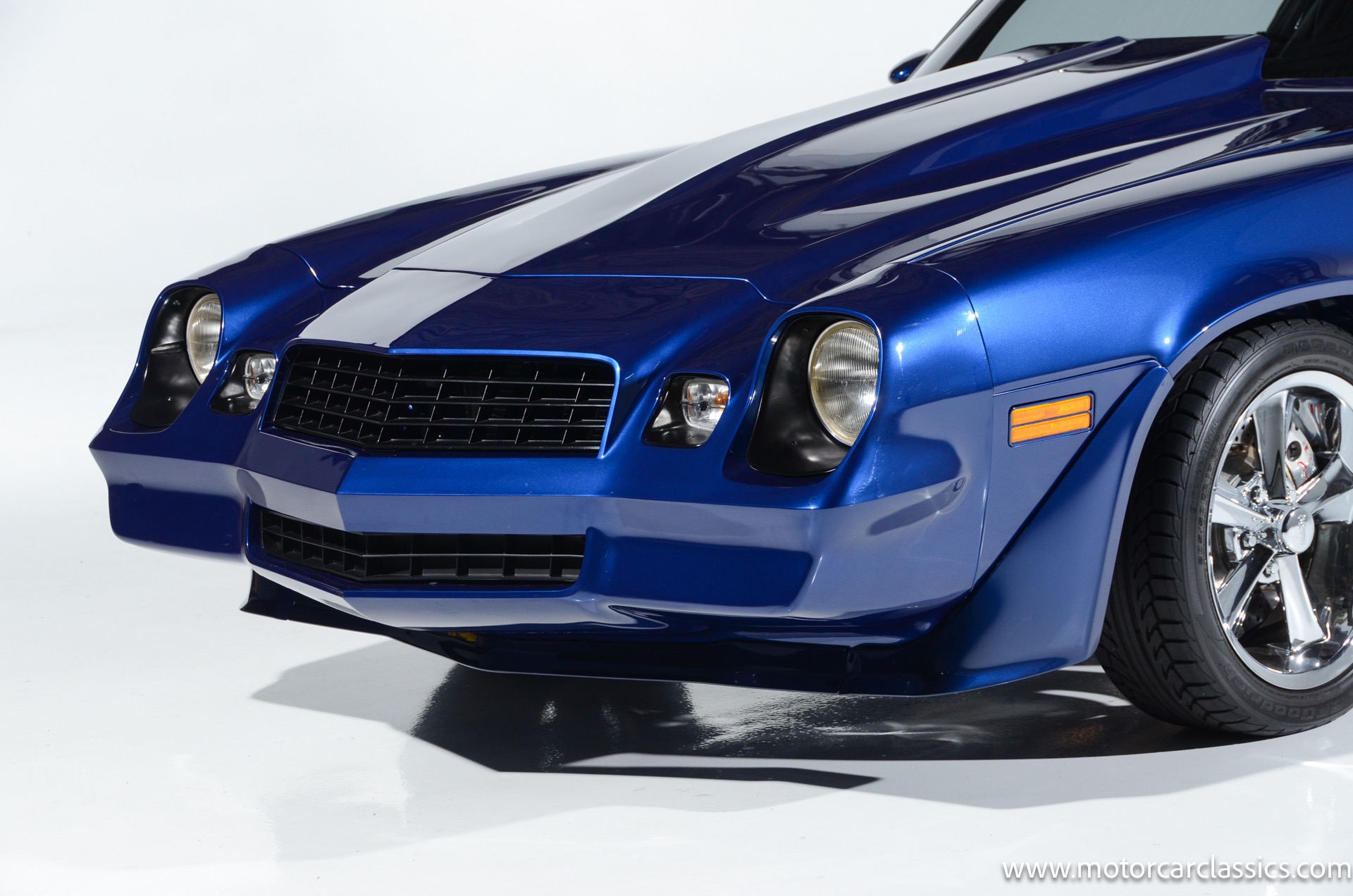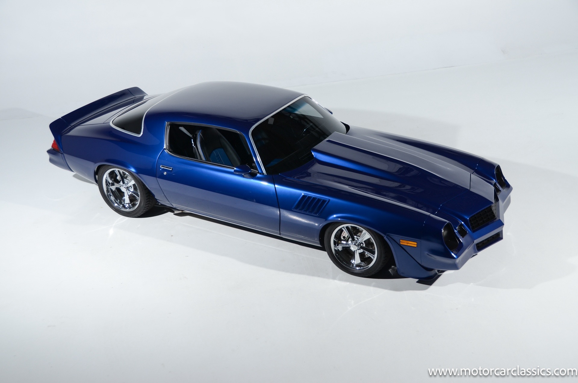 1979 Chevrolet Camaro Z28 for sale! Motorcar Classics is pleased to present this awesome 1979 Camaro Z28 restomod featured in metallic blue with a black custom interior, with blue inserts. This is a professionally built car with the highest quality components, including: 350 CI 5.7L Chevrolet V8 with Brodix aluminum heads and intake manifold and Edelbrock carburetor mated to a Turbo 350 automatic transmission. The engine was built by McBetts racing engine and stroked to 383 CI with approximately 650 HP! The engine has a TrueTrac Billet Specialities serpentine system and polished aluminum water pump. Under the hood you will find a BeCool 4-row aluminum radiator, MSD ignition, stainless steel braided AC lines and heater hoses, American Racing stainless steel headers, and Vintage Air Heat & AC System. There is a 3" stainless steel exhaust with X pipe and Magnaflow mufflers, and an electric Dual Y Dump exhaust cutouts that exit forward of the rear tires. The car rides on Air Ride suspension, with 4-Link rear suspension and Baer 4-wheel disc brakes. The interior features power windows, Ididit billet aluminum tilt steering column and a Pioneer sound system.The car has been fully-sorted and is a thrill to drive. Your inspection is invited.