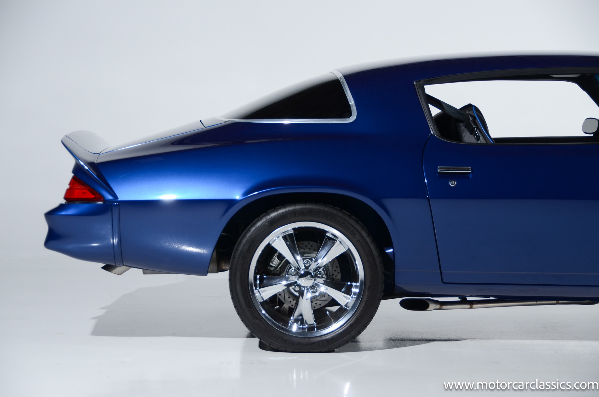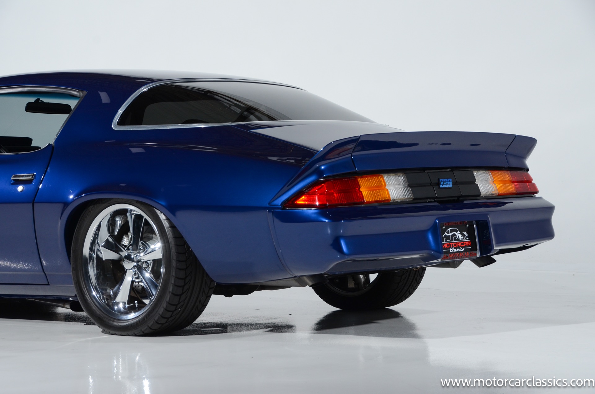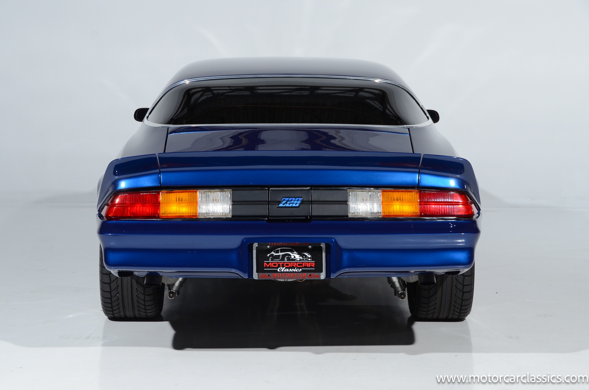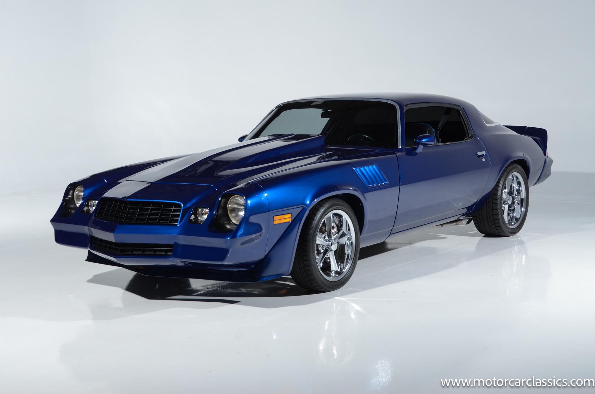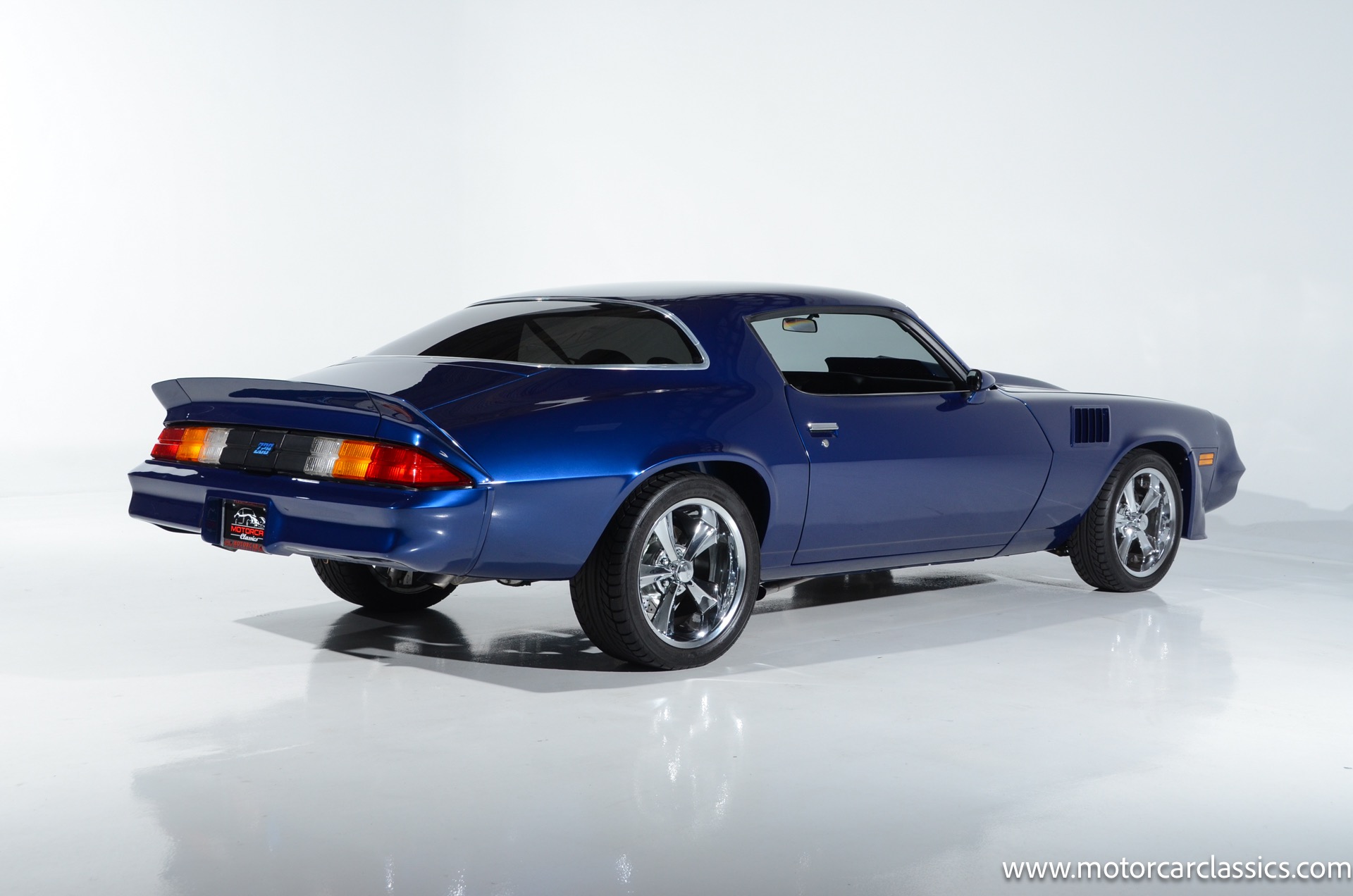 1979 Chevrolet Camaro Z28 for sale! Motorcar Classics is pleased to present this awesome 1979 Camaro Z28 restomod featured in metallic blue with a black custom interior, with blue inserts. This is a professionally built car with the highest quality components, including: 350 CI 5.7L Chevrolet V8 with Brodix aluminum heads and intake manifold and Edelbrock carburetor mated to a Turbo 350 automatic transmission. The engine was built by McBetts racing engine and stroked to 383 CI with approximately 650 HP! The engine has a TrueTrac Billet Specialities serpentine system and polished aluminum water pump. Under the hood you will find a BeCool 4-row aluminum radiator, MSD ignition, stainless steel braided AC lines and heater hoses, American Racing stainless steel headers, and Vintage Air Heat & AC System. There is a 3" stainless steel exhaust with X pipe and Magnaflow mufflers, and an electric Dual Y Dump exhaust cutouts that exit forward of the rear tires. The car rides on Air Ride suspension, with 4-Link rear suspension and Baer 4-wheel disc brakes. The interior features power windows, Ididit billet aluminum tilt steering column and a Pioneer sound system.The car has been fully-sorted and is a thrill to drive. Your inspection is invited.