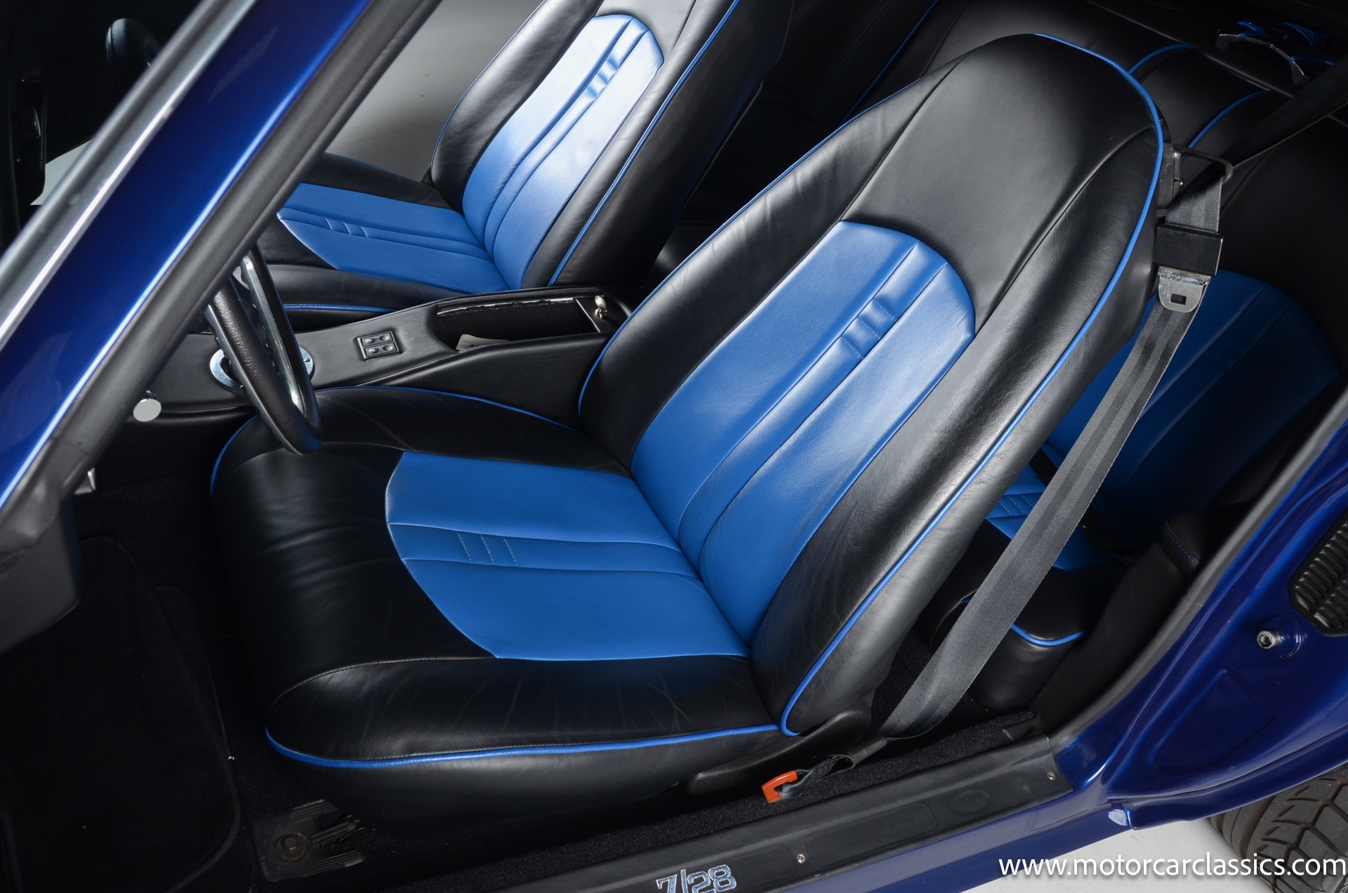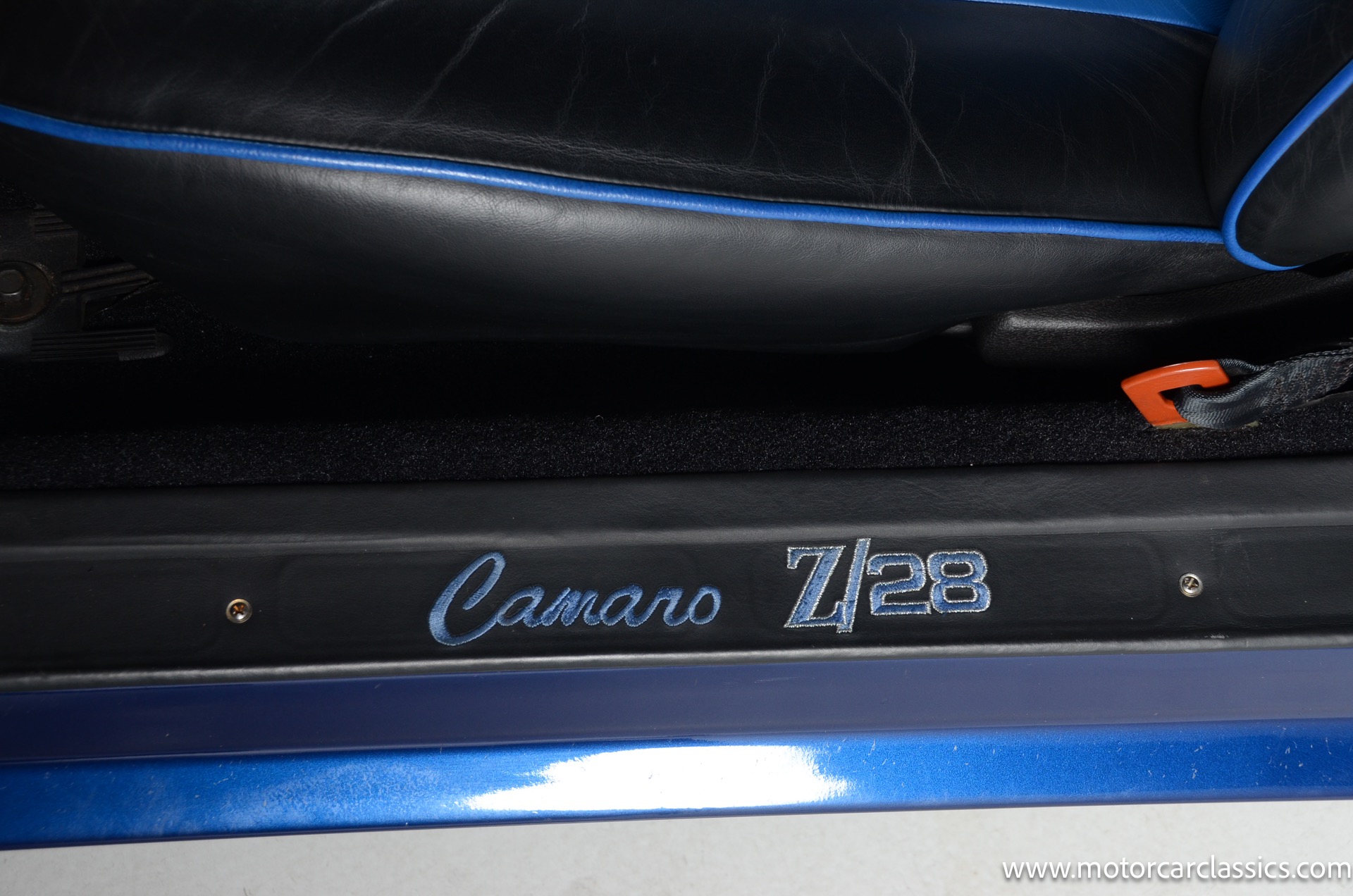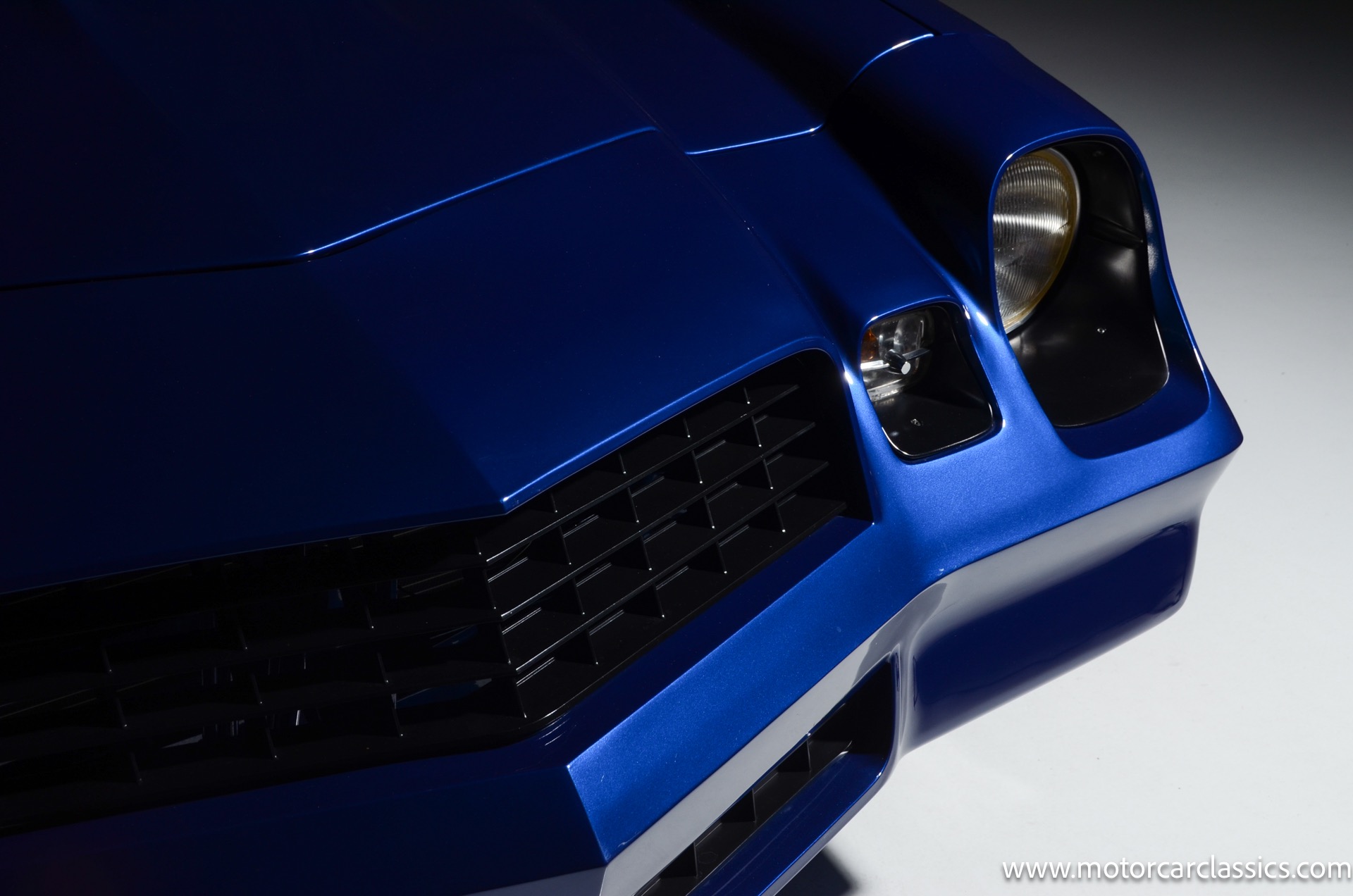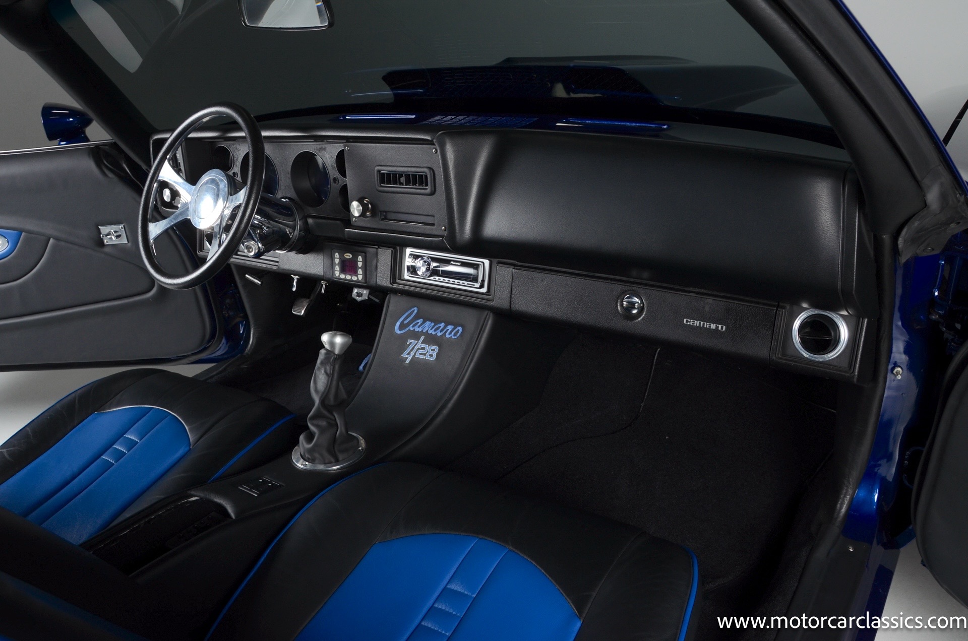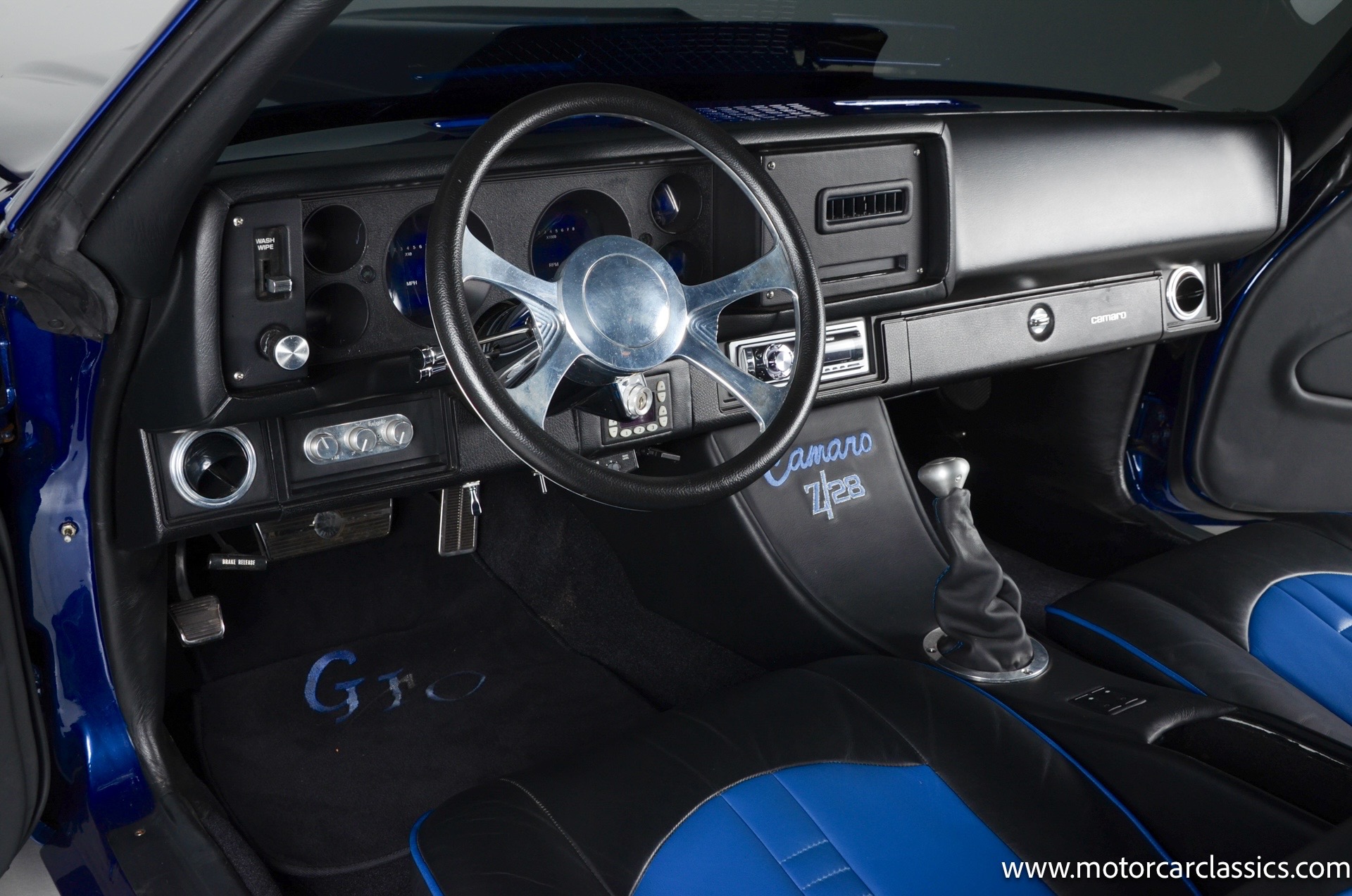 1979 Chevrolet Camaro Z28 for sale! Motorcar Classics is pleased to present this awesome 1979 Camaro Z28 restomod featured in metallic blue with a black custom interior, with blue inserts. This is a professionally built car with the highest quality components, including: 350 CI 5.7L Chevrolet V8 with Brodix aluminum heads and intake manifold and Edelbrock carburetor mated to a Turbo 350 automatic transmission. The engine was built by McBetts racing engine and stroked to 383 CI with approximately 650 HP! The engine has a TrueTrac Billet Specialities serpentine system and polished aluminum water pump. Under the hood you will find a BeCool 4-row aluminum radiator, MSD ignition, stainless steel braided AC lines and heater hoses, American Racing stainless steel headers, and Vintage Air Heat & AC System. There is a 3" stainless steel exhaust with X pipe and Magnaflow mufflers, and an electric Dual Y Dump exhaust cutouts that exit forward of the rear tires. The car rides on Air Ride suspension, with 4-Link rear suspension and Baer 4-wheel disc brakes. The interior features power windows, Ididit billet aluminum tilt steering column and a Pioneer sound system.The car has been fully-sorted and is a thrill to drive. Your inspection is invited.