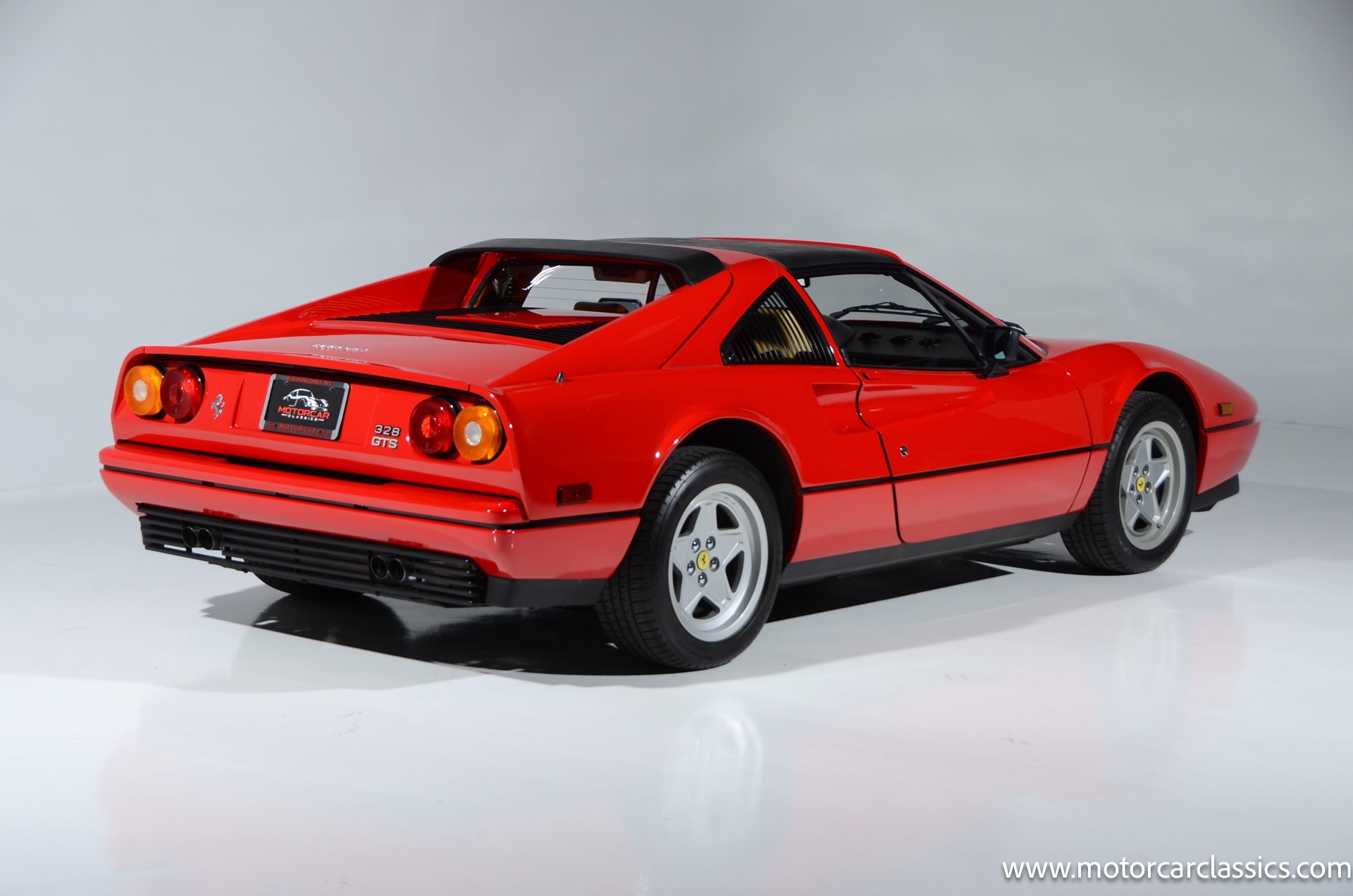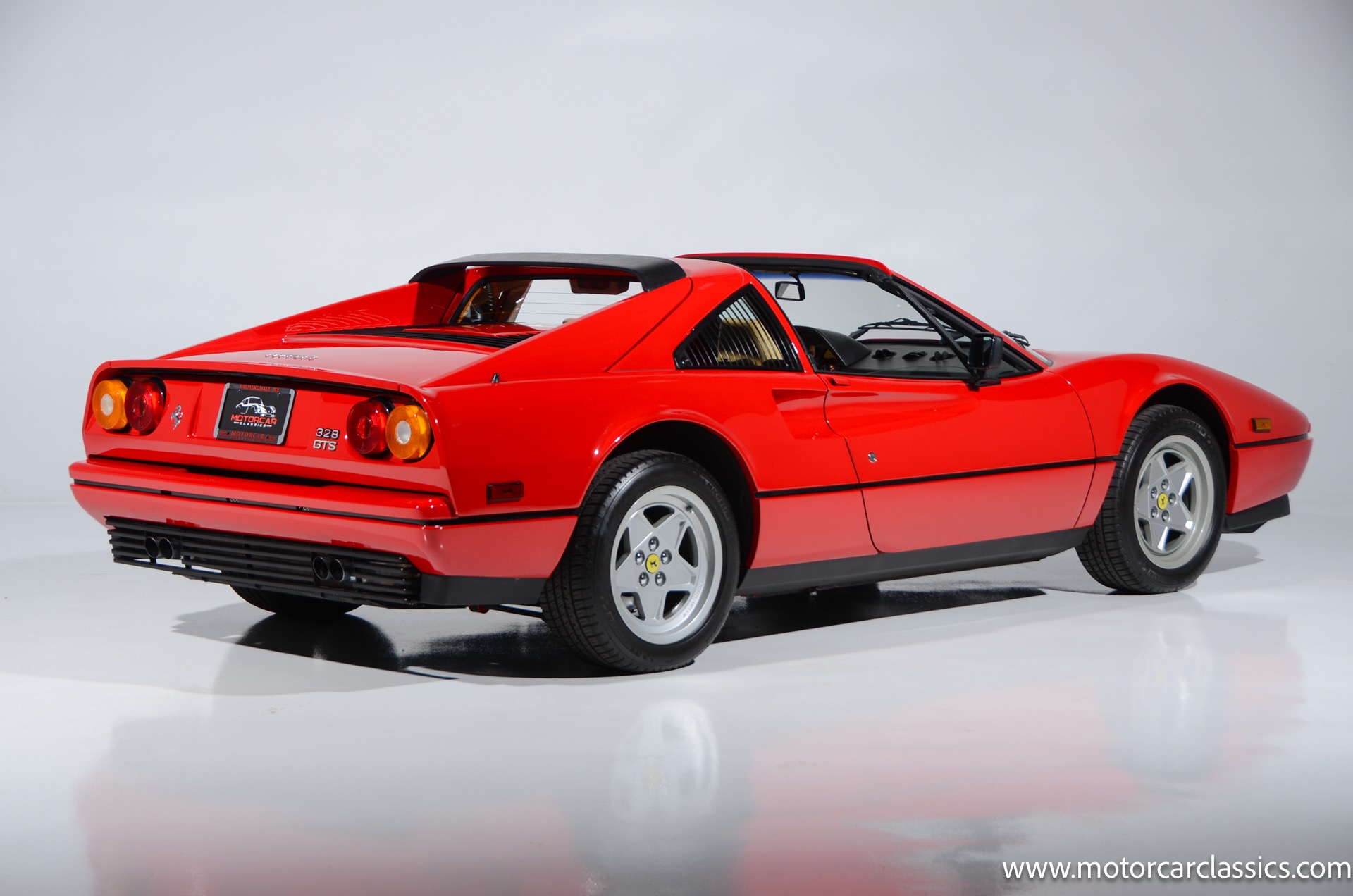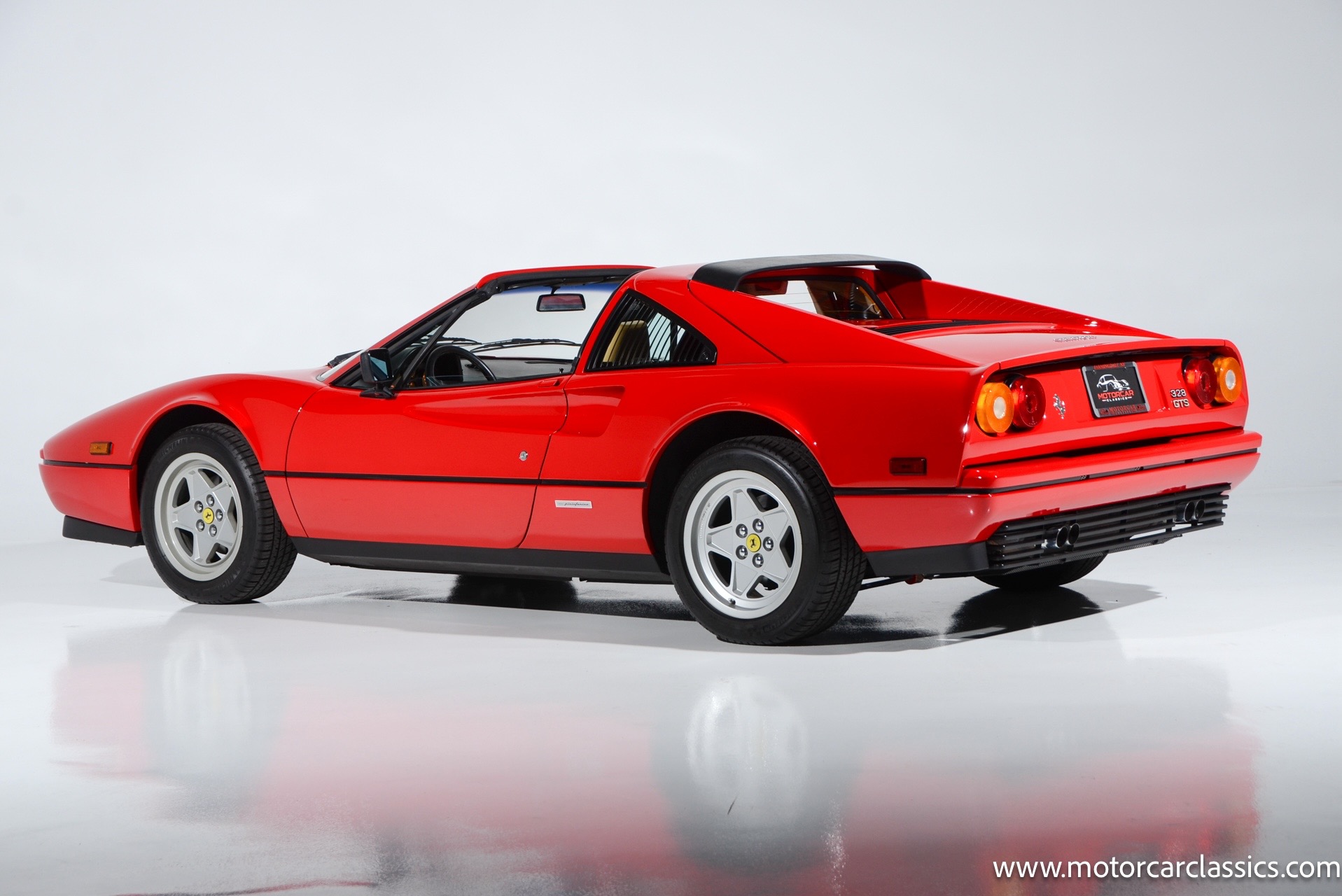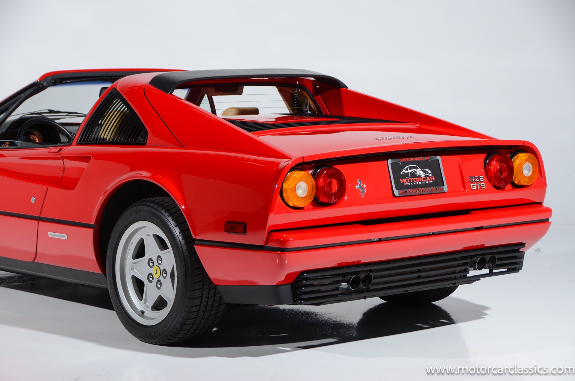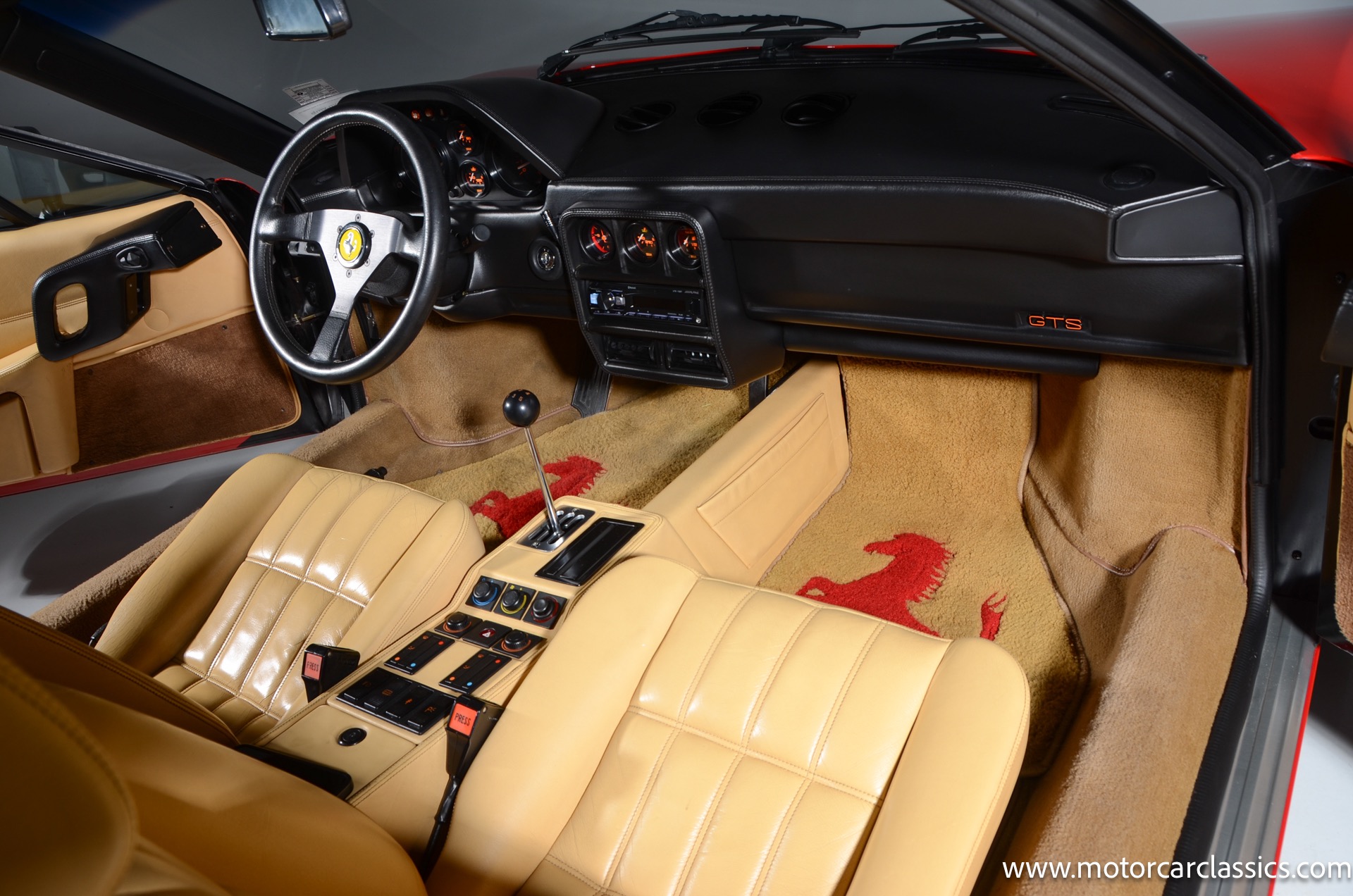 1987 Ferrari 328GTS for sale! Motorcar Classics is proud to present this beautiful 1987 Ferrari 328GTS. With iconic styling by Pininfarina, the 328 GTS showcases a timeless design characterized by sleek lines and an aerodynamic body. The car's exterior is finished in Rosso Corsa, a classic Ferrari red, complemented by 16 five-spoke alloy wheels with yellow Prancing Horse center caps. It features a removable black Targa top, black roof spoiler, louvered rear side windows, and a black rear valance discreetly housing twin-pipe dual exhaust pipes.The interior features tan leather seats with matching carpeting, accented by black & chrome trim. It includes powered windows, the iconic gated 5-speed shifter, a three-spoke MOMO steering wheel, and an Alpine 738T radio with Bluetooth and hands-free capability.
