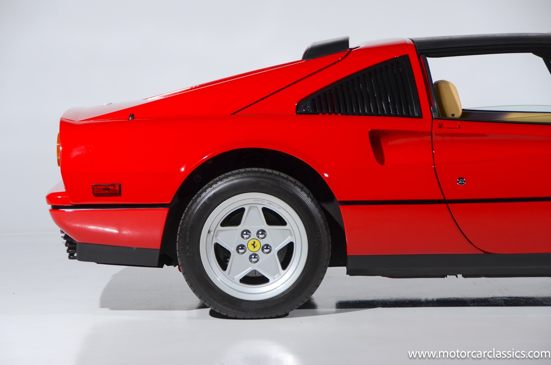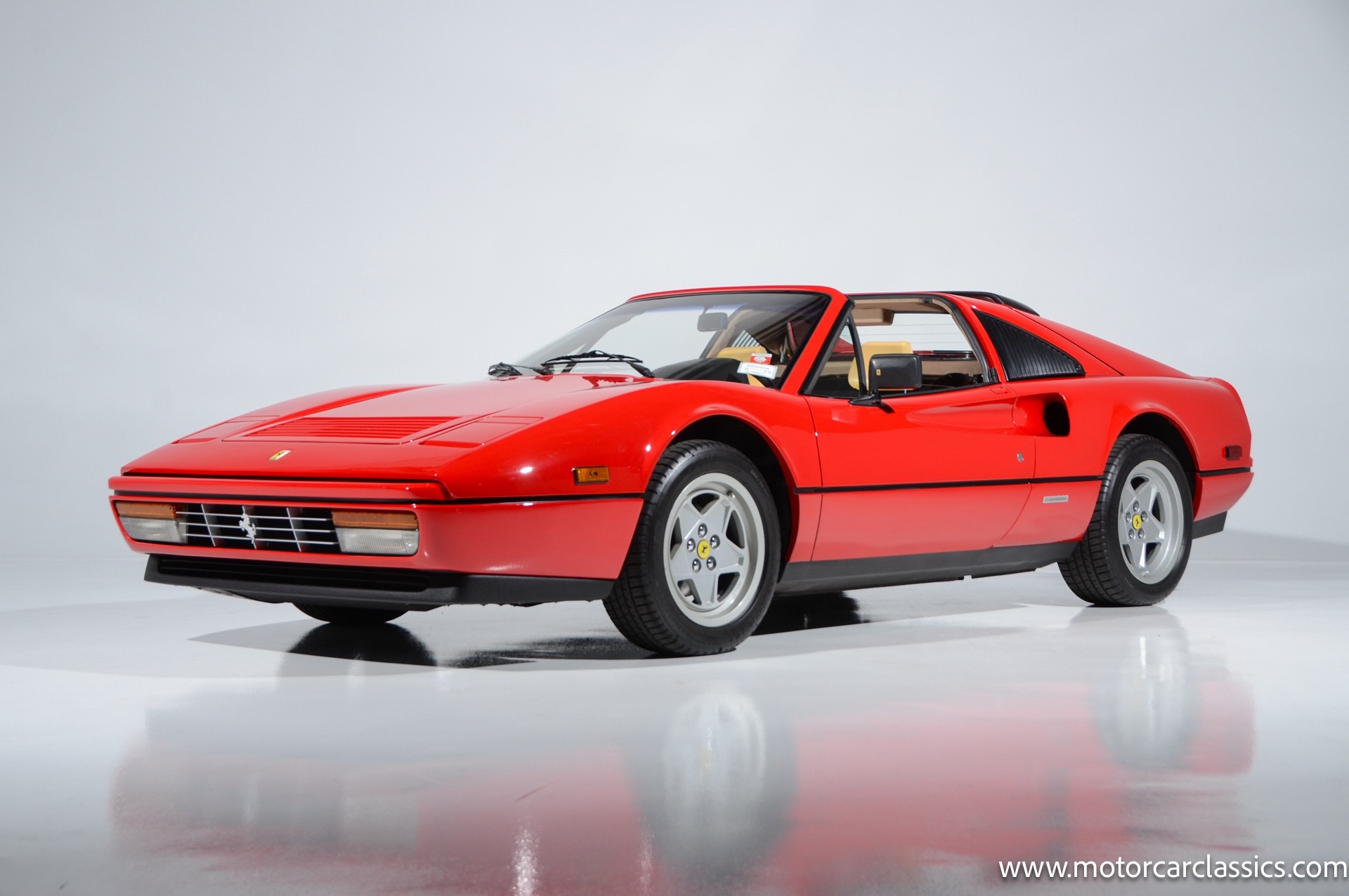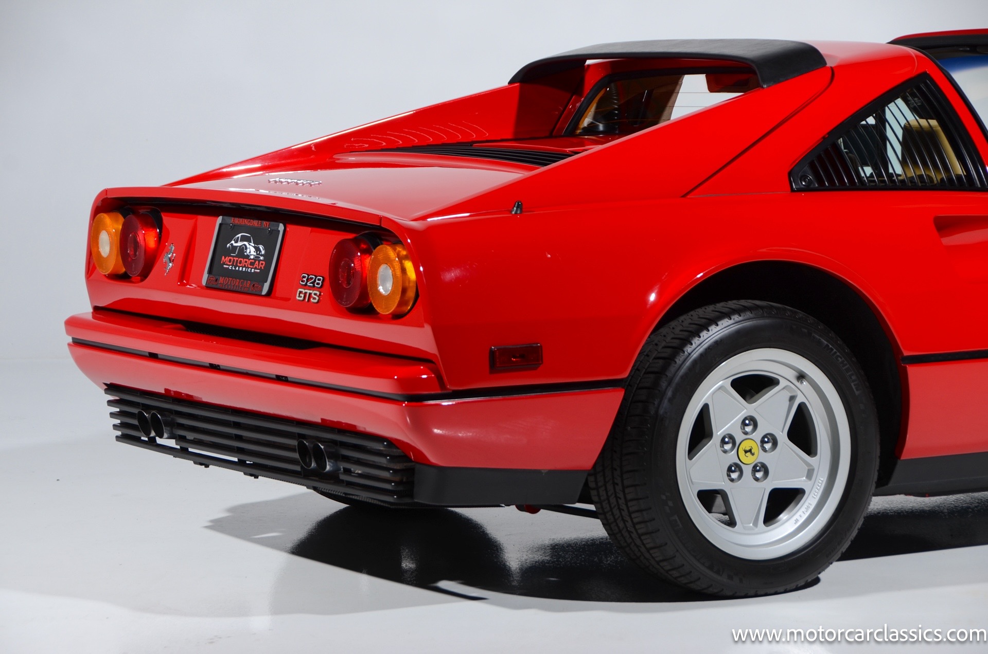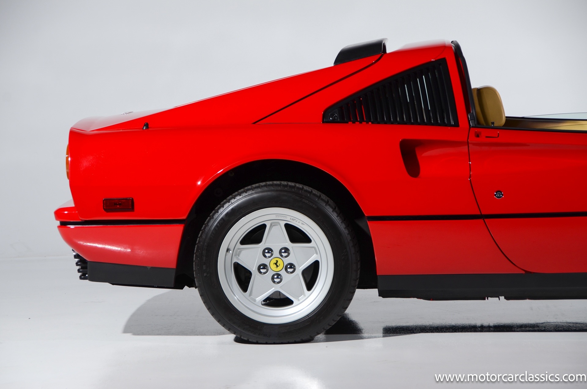 1987 Ferrari 328GTS for sale! Motorcar Classics is proud to present this beautiful 1987 Ferrari 328GTS. With iconic styling by Pininfarina, the 328 GTS showcases a timeless design characterized by sleek lines and an aerodynamic body. The car's exterior is finished in Rosso Corsa, a classic Ferrari red, complemented by 16 five-spoke alloy wheels with yellow Prancing Horse center caps. It features a removable black Targa top, black roof spoiler, louvered rear side windows, and a black rear valance discreetly housing twin-pipe dual exhaust pipes.The interior features tan leather seats with matching carpeting, accented by black & chrome trim. It includes powered windows, the iconic gated 5-speed shifter, a three-spoke MOMO steering wheel, and an Alpine 738T radio with Bluetooth and hands-free capability.