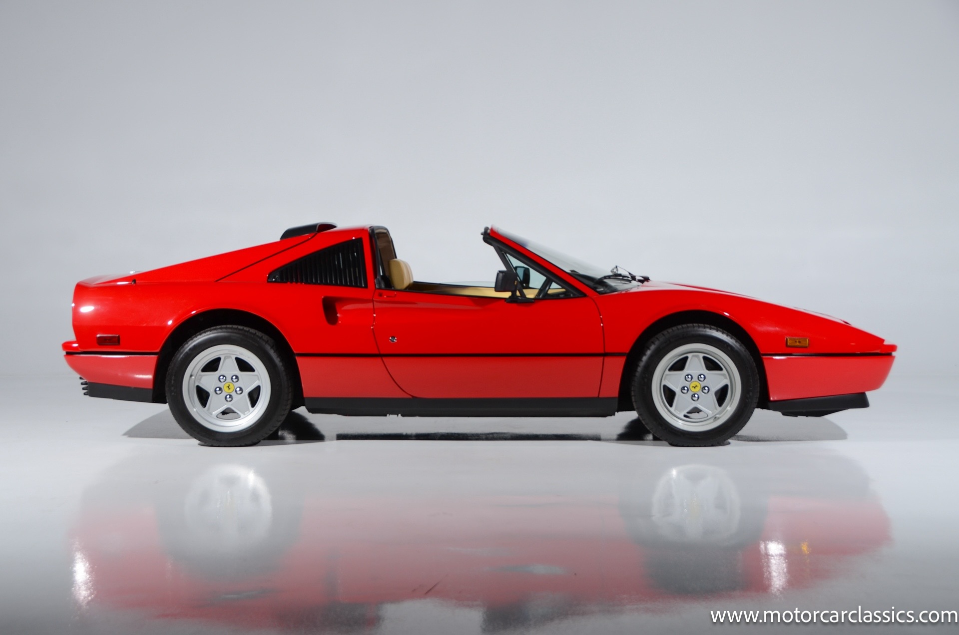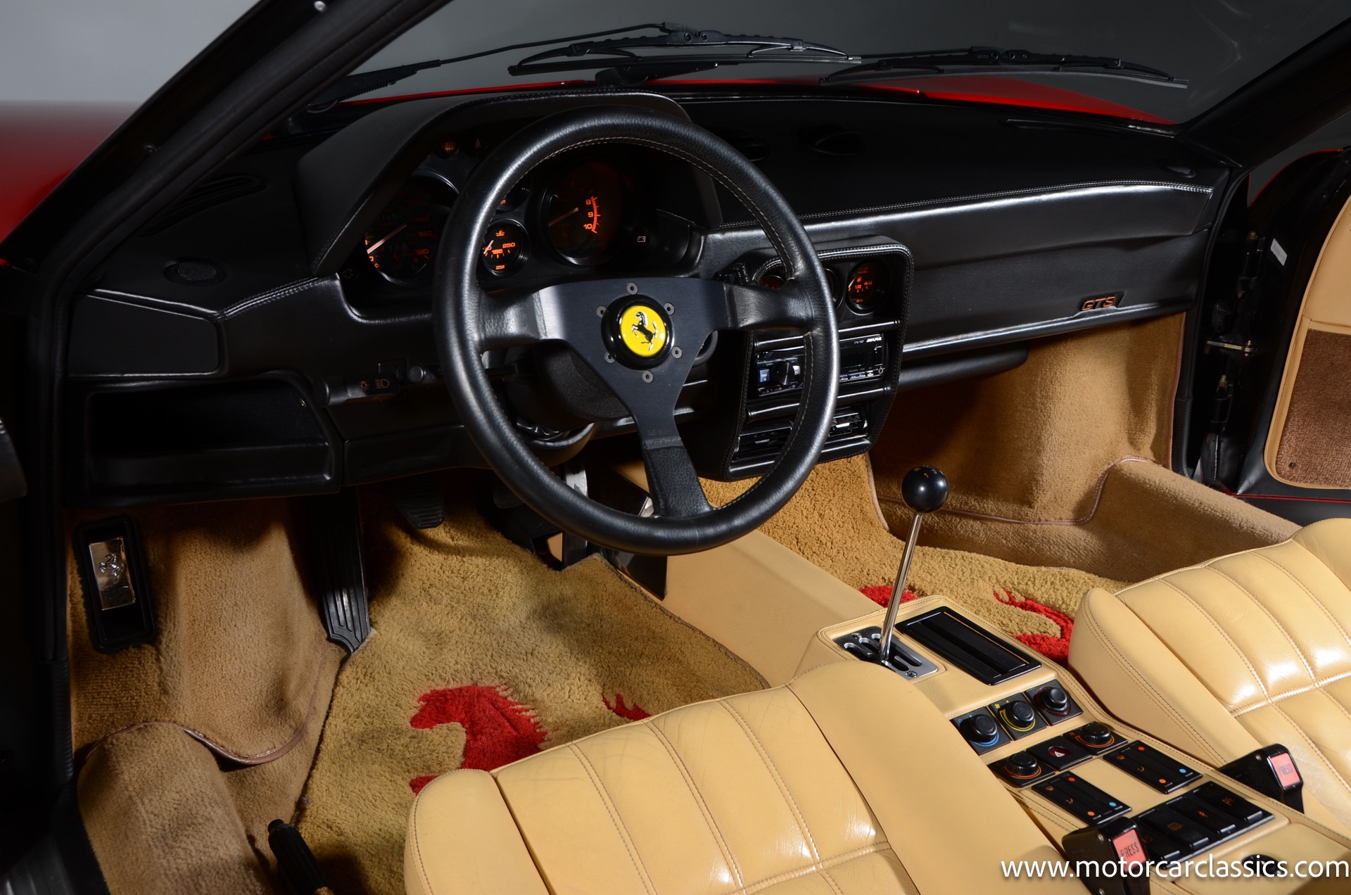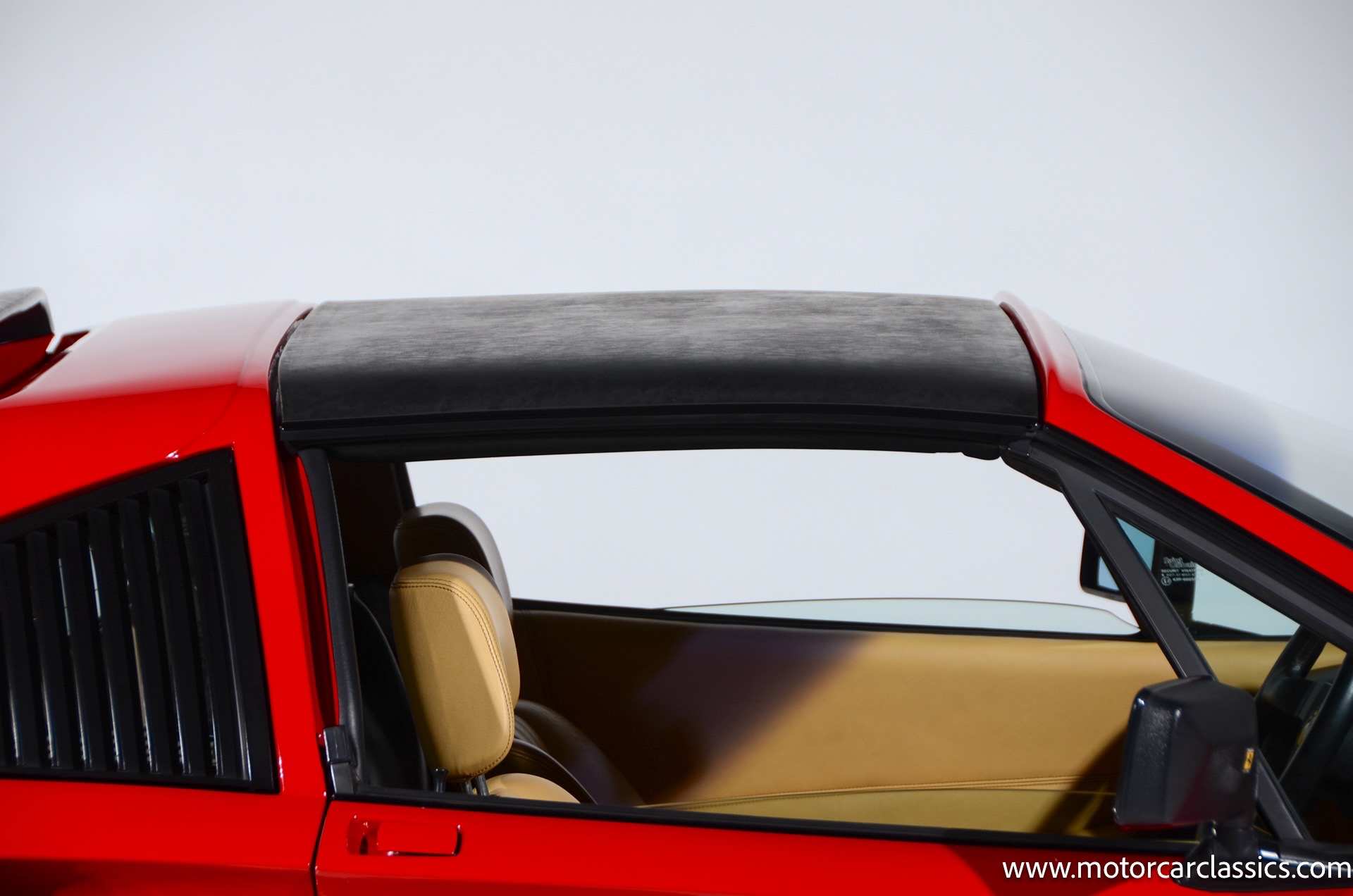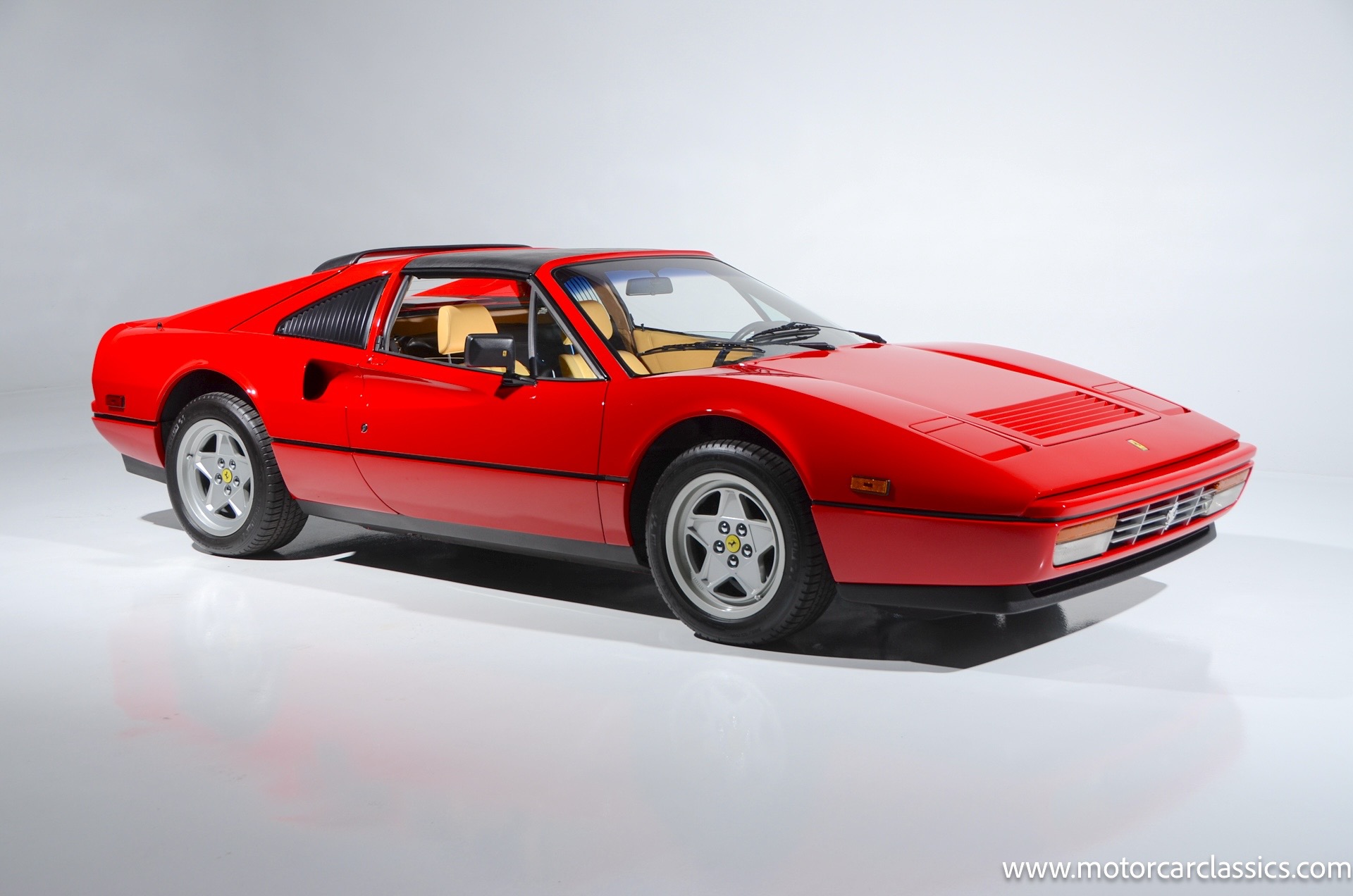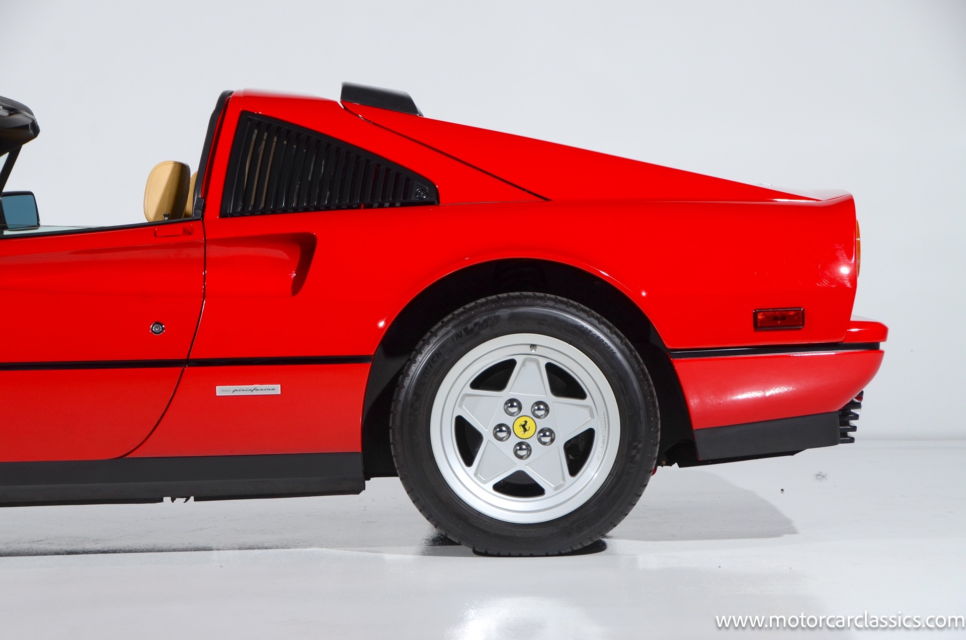1987 Ferrari 328GTS for sale! Motorcar Classics is proud to present this beautiful 1987 Ferrari 328GTS. With iconic styling by Pininfarina, the 328 GTS showcases a timeless design characterized by sleek lines and an aerodynamic body. The car's exterior is finished in Rosso Corsa, a classic Ferrari red, complemented by 16 five-spoke alloy wheels with yellow Prancing Horse center caps. It features a removable black Targa top, black roof spoiler, louvered rear side windows, and a black rear valance discreetly housing twin-pipe dual exhaust pipes.The interior features tan leather seats with matching carpeting, accented by black & chrome trim. It includes powered windows, the iconic gated 5-speed shifter, a three-spoke MOMO steering wheel, and an Alpine 738T radio with Bluetooth and hands-free capability.