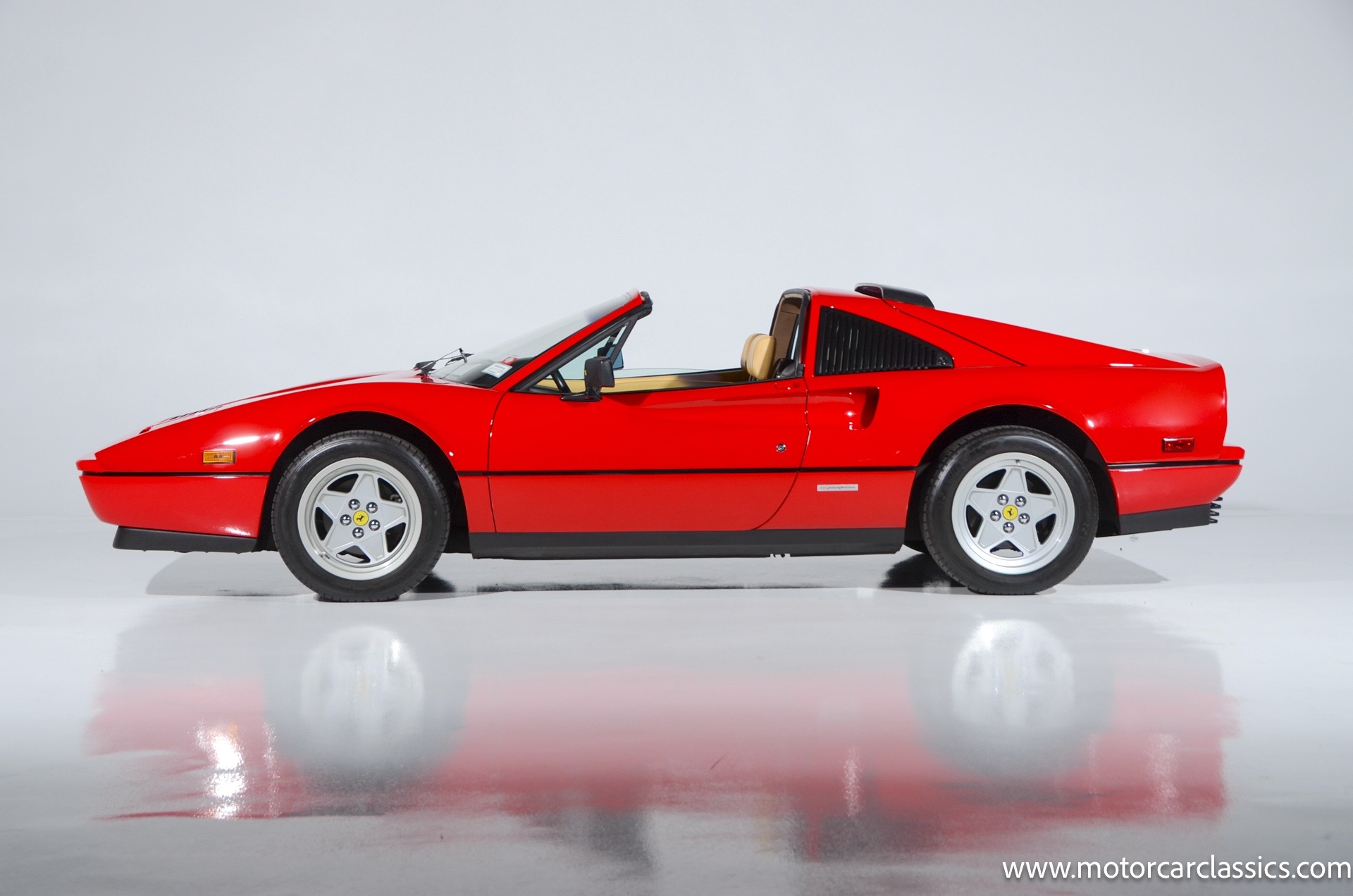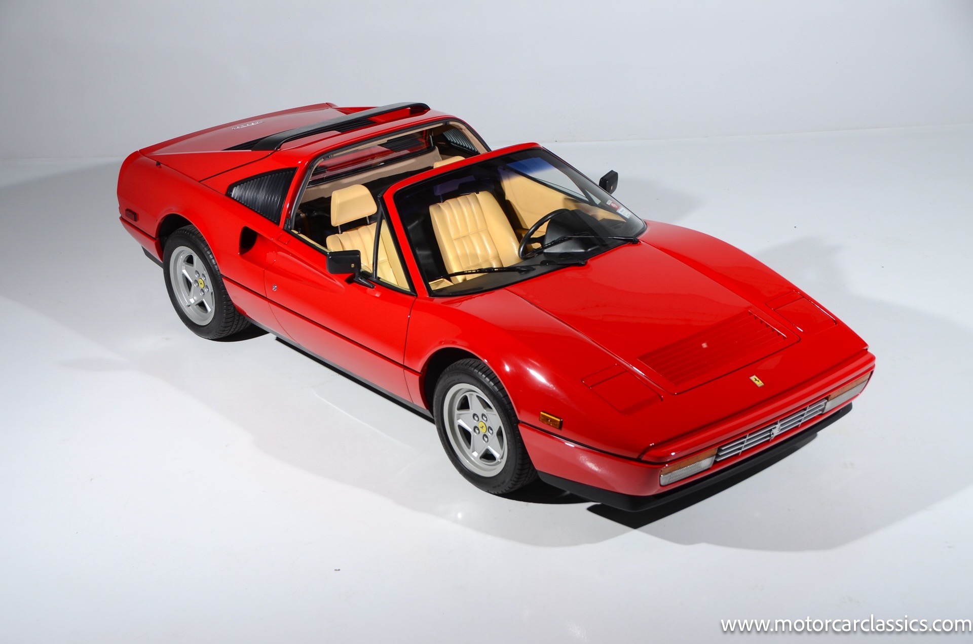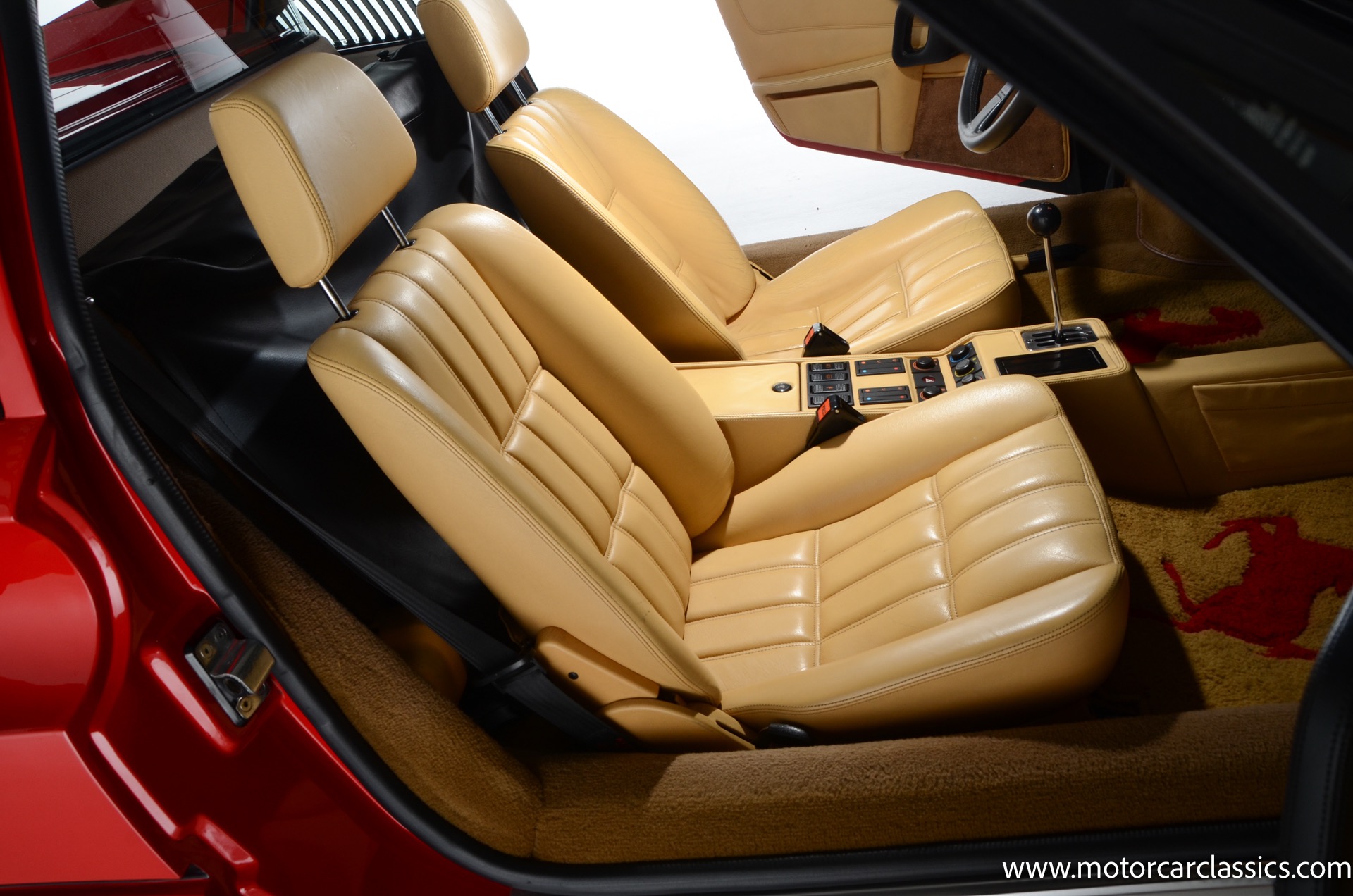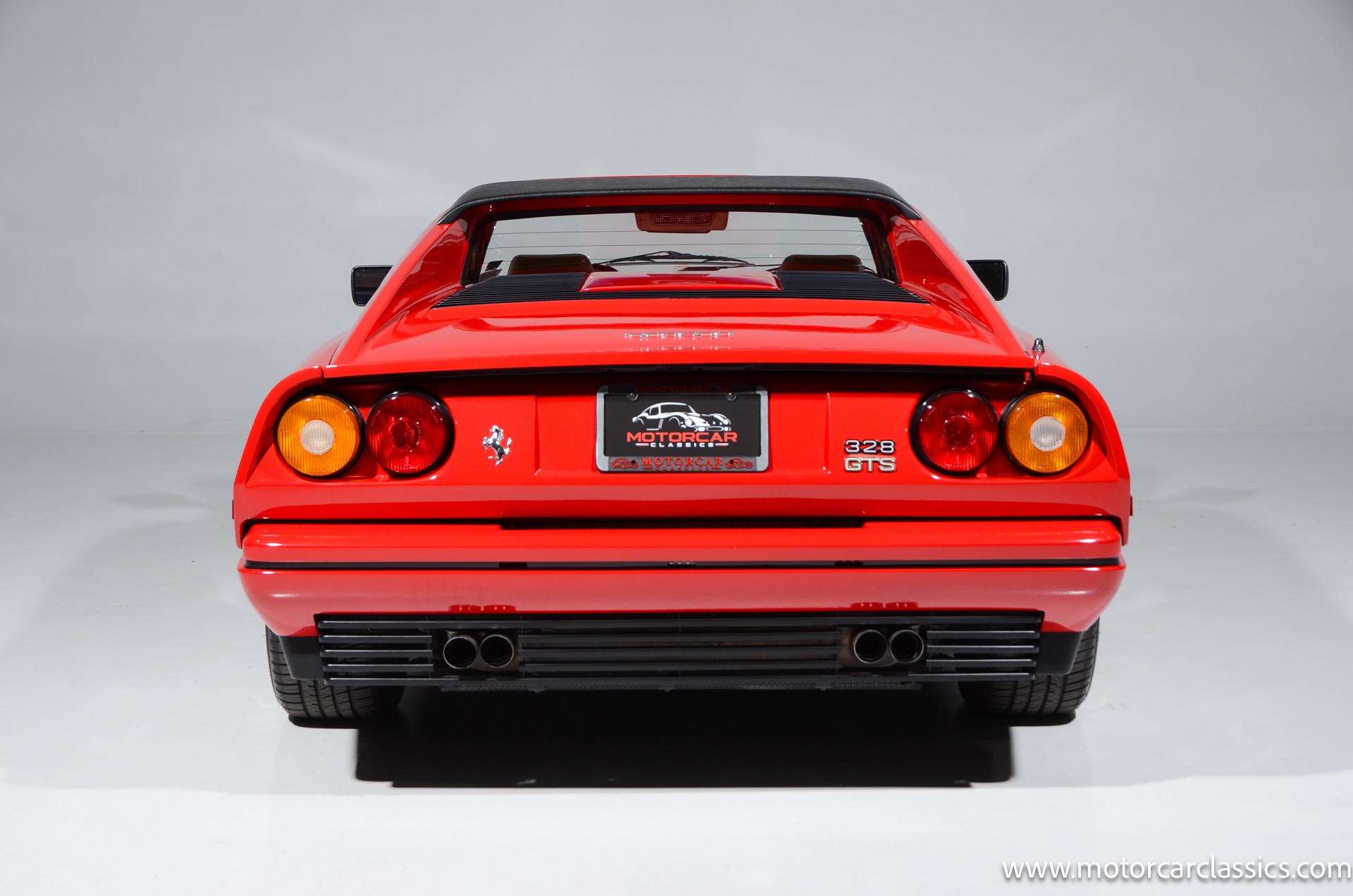 1987 Ferrari 328GTS for sale! Motorcar Classics is proud to present this beautiful 1987 Ferrari 328GTS. With iconic styling by Pininfarina, the 328 GTS showcases a timeless design characterized by sleek lines and an aerodynamic body. The car's exterior is finished in Rosso Corsa, a classic Ferrari red, complemented by 16 five-spoke alloy wheels with yellow Prancing Horse center caps. It features a removable black Targa top, black roof spoiler, louvered rear side windows, and a black rear valance discreetly housing twin-pipe dual exhaust pipes.The interior features tan leather seats with matching carpeting, accented by black & chrome trim. It includes powered windows, the iconic gated 5-speed shifter, a three-spoke MOMO steering wheel, and an Alpine 738T radio with Bluetooth and hands-free capability.
