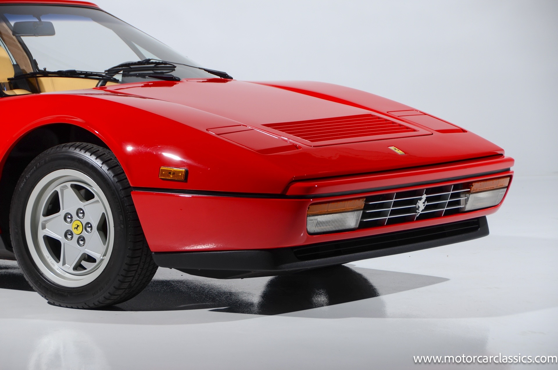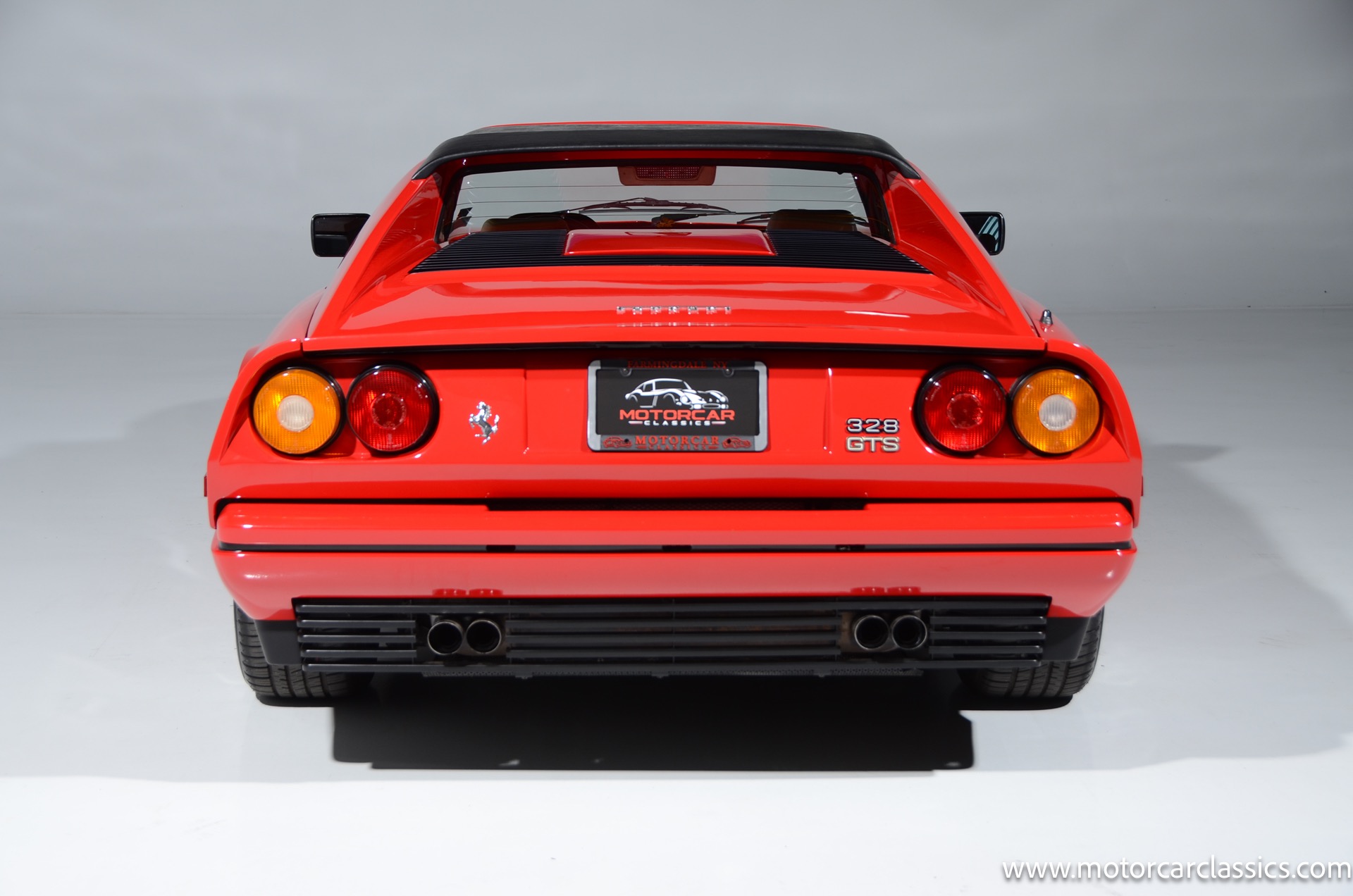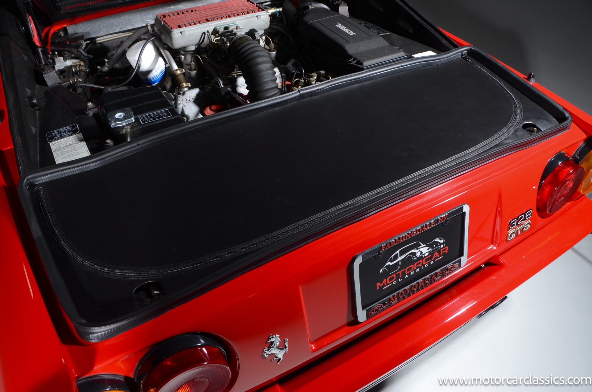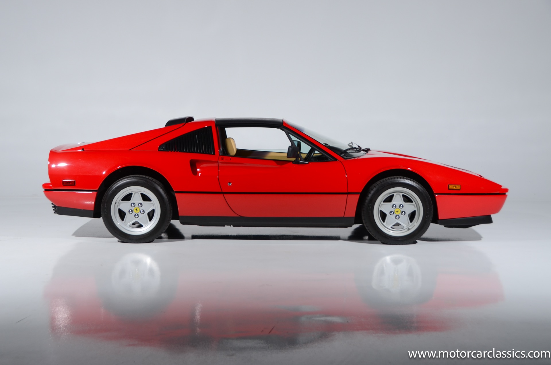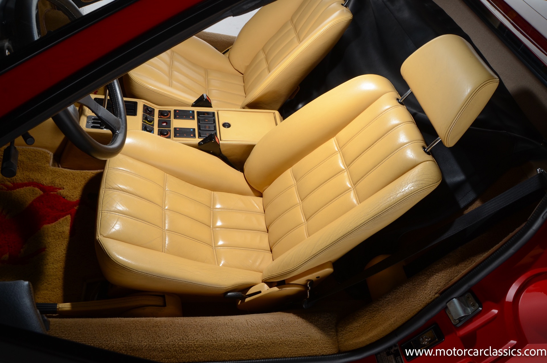 1987 Ferrari 328GTS for sale! Motorcar Classics is proud to present this beautiful 1987 Ferrari 328GTS. With iconic styling by Pininfarina, the 328 GTS showcases a timeless design characterized by sleek lines and an aerodynamic body. The car's exterior is finished in Rosso Corsa, a classic Ferrari red, complemented by 16 five-spoke alloy wheels with yellow Prancing Horse center caps. It features a removable black Targa top, black roof spoiler, louvered rear side windows, and a black rear valance discreetly housing twin-pipe dual exhaust pipes.The interior features tan leather seats with matching carpeting, accented by black & chrome trim. It includes powered windows, the iconic gated 5-speed shifter, a three-spoke MOMO steering wheel, and an Alpine 738T radio with Bluetooth and hands-free capability.
