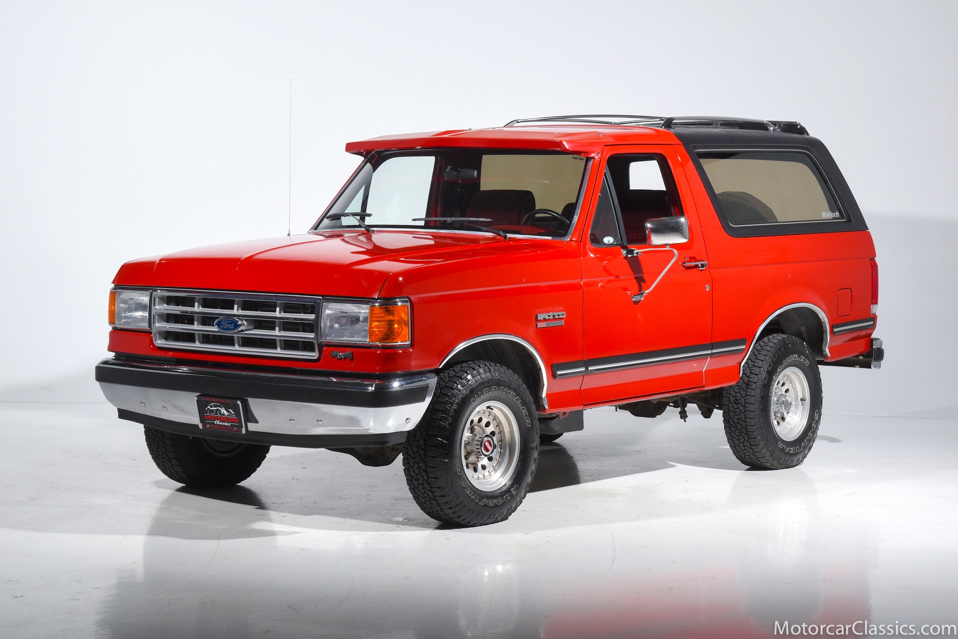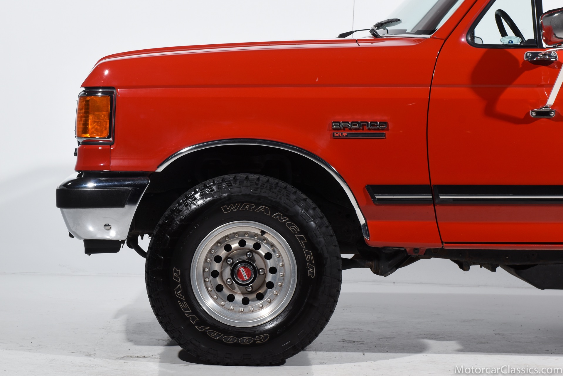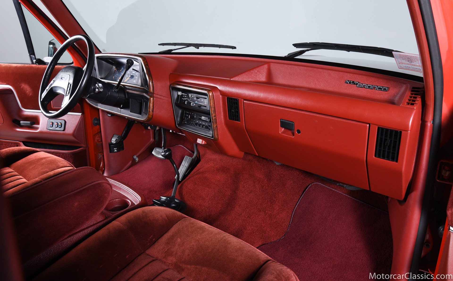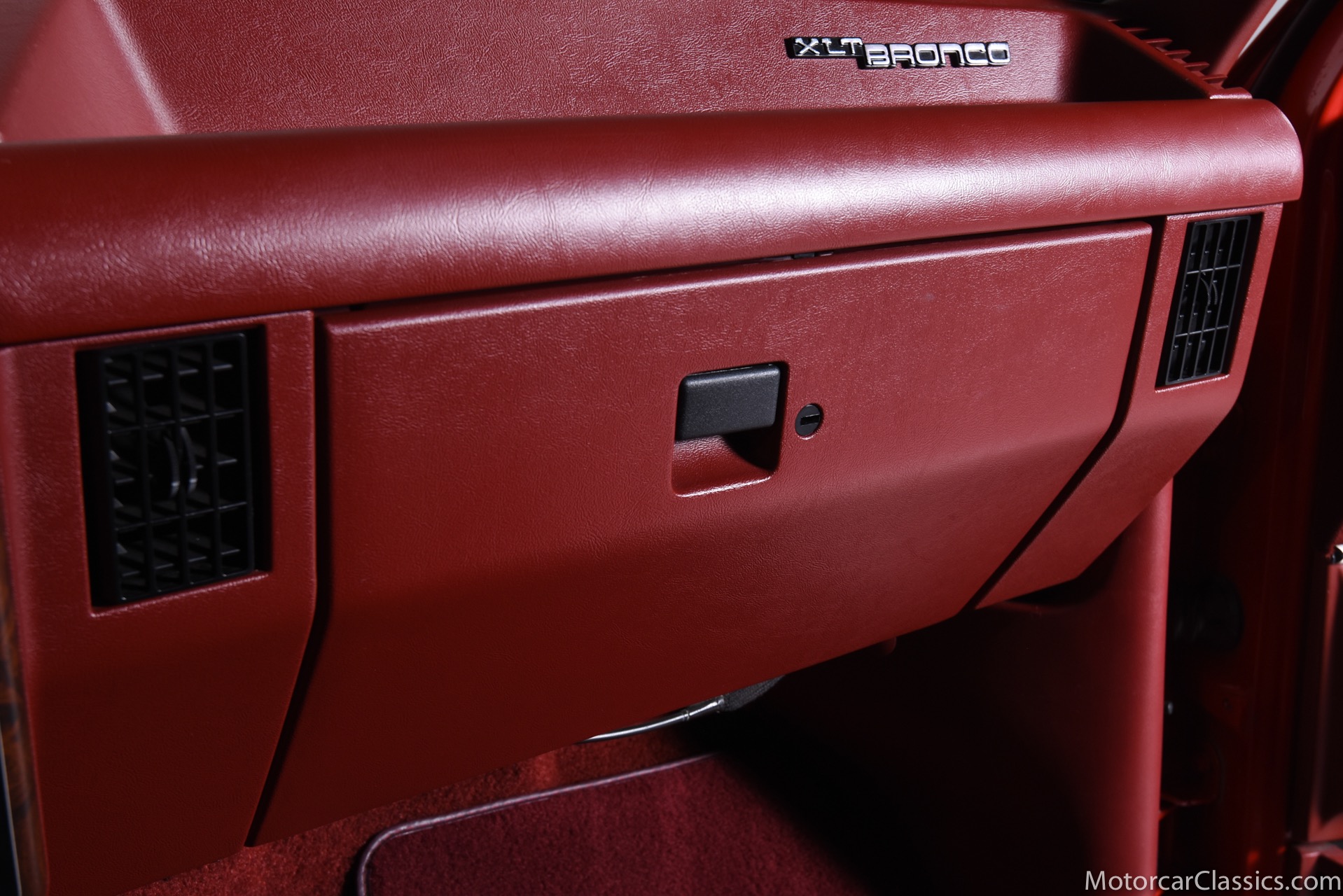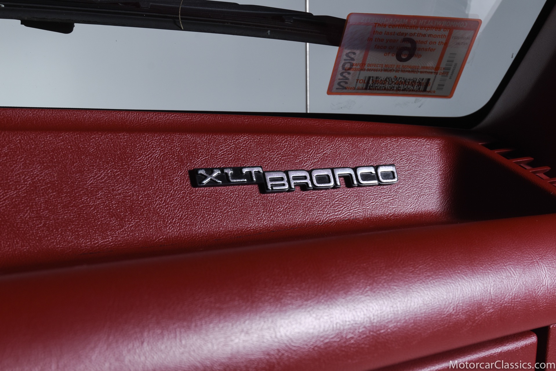 1987 Ford Bronco XLT for sale! Motorcar Classics is proud to present this handsome 1987 Ford Bronco XLT featured in red with black hard top and red velour interior. This loaded Bronco XLT is an all-original two-owner truck that has covered only 43,316 miles. The XLT is loaded with factory amenities including Fords 5.0L V8, automatic transmission, all-wheel drive, power steering, brakes, windows, door locks, cruise control, factory AC, and more. This Bronco is both very usable, and very collectible. Your inspection is invited.