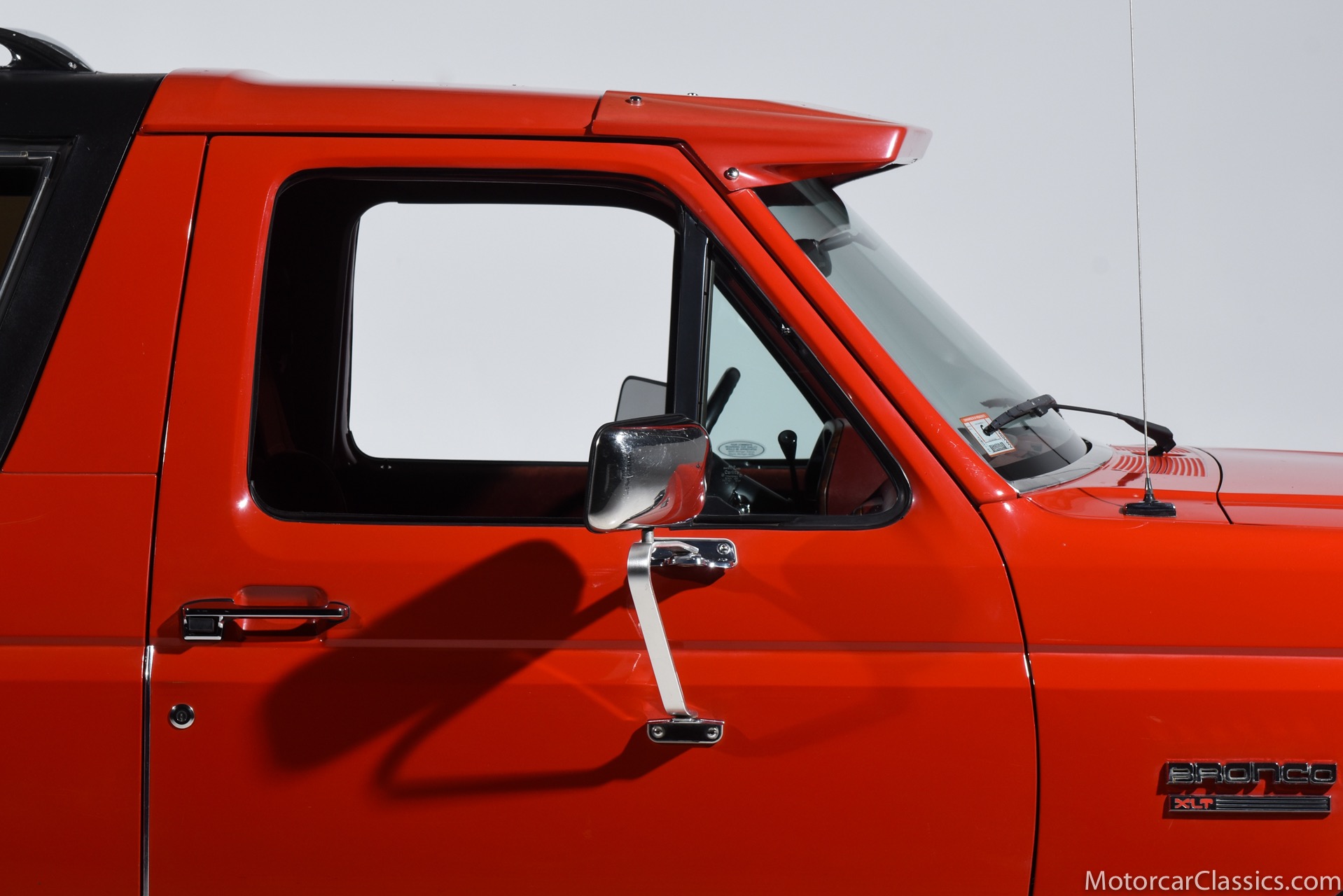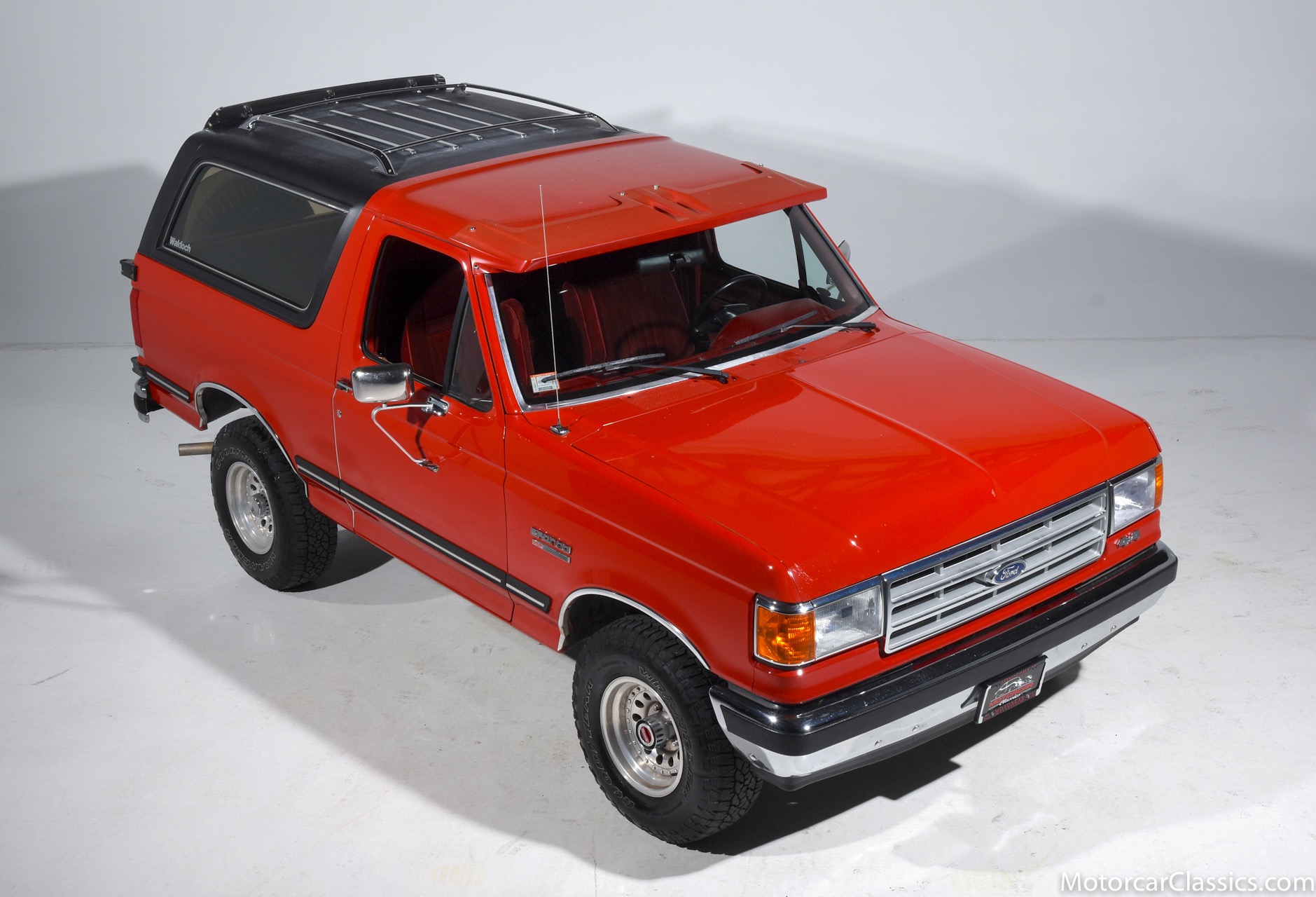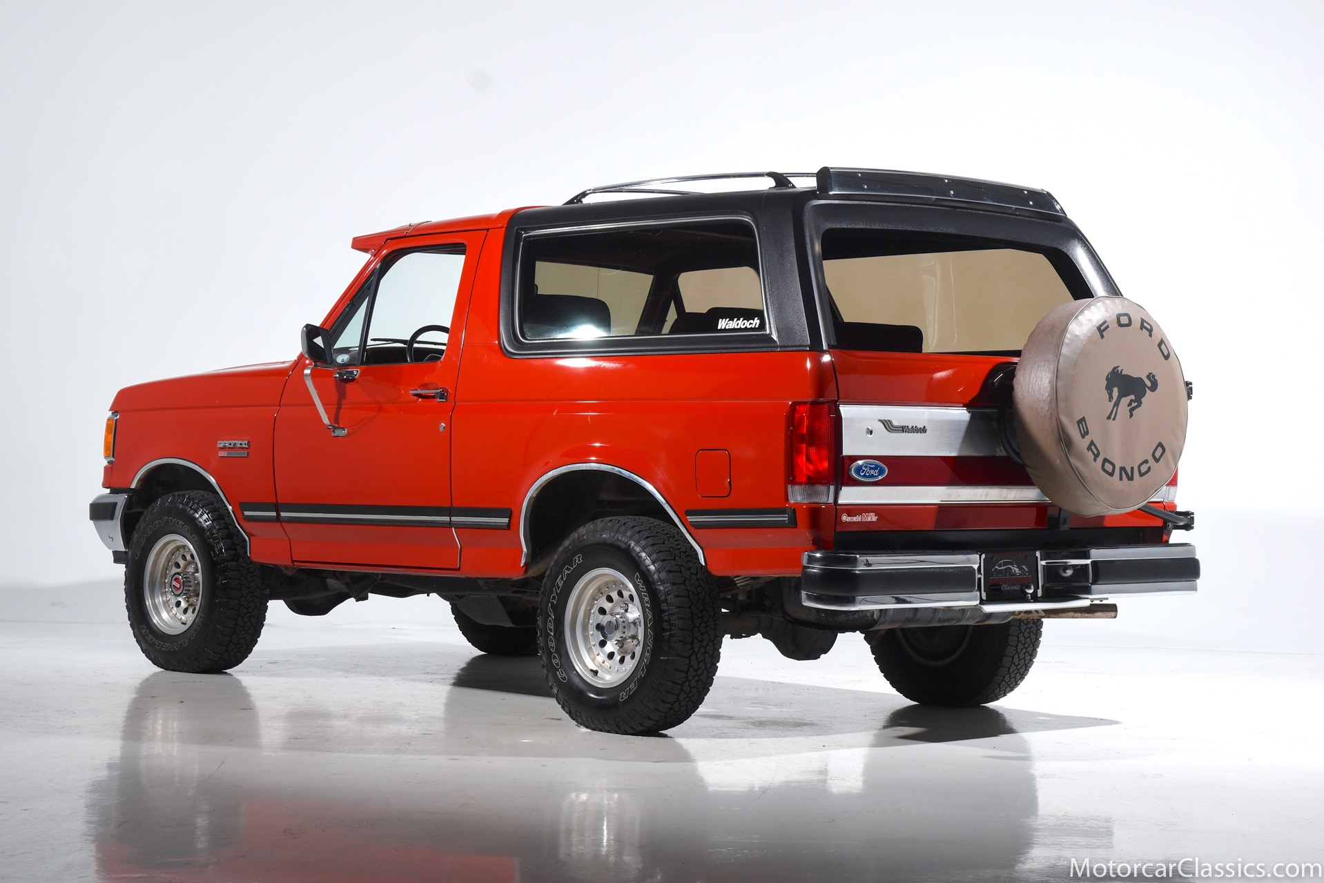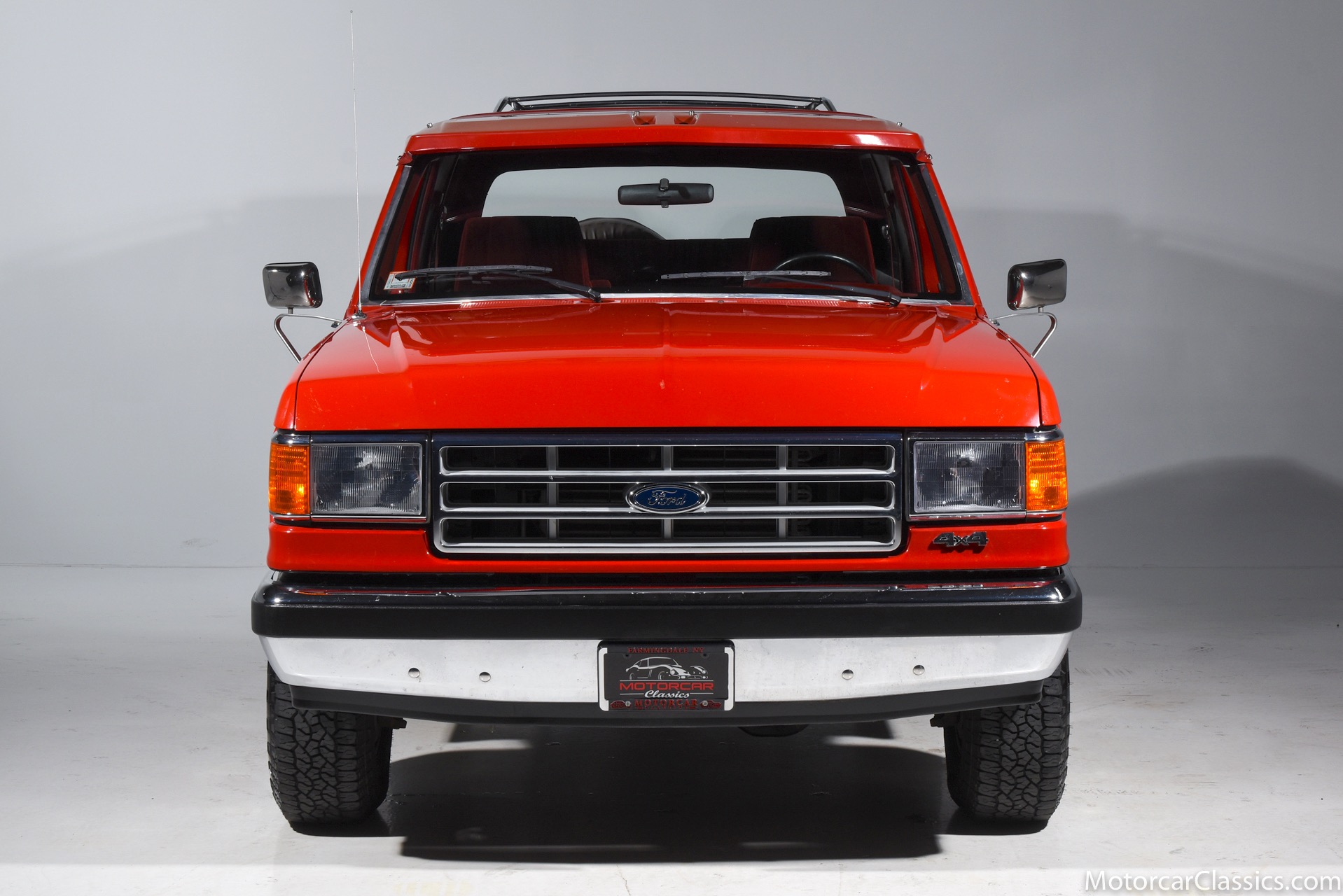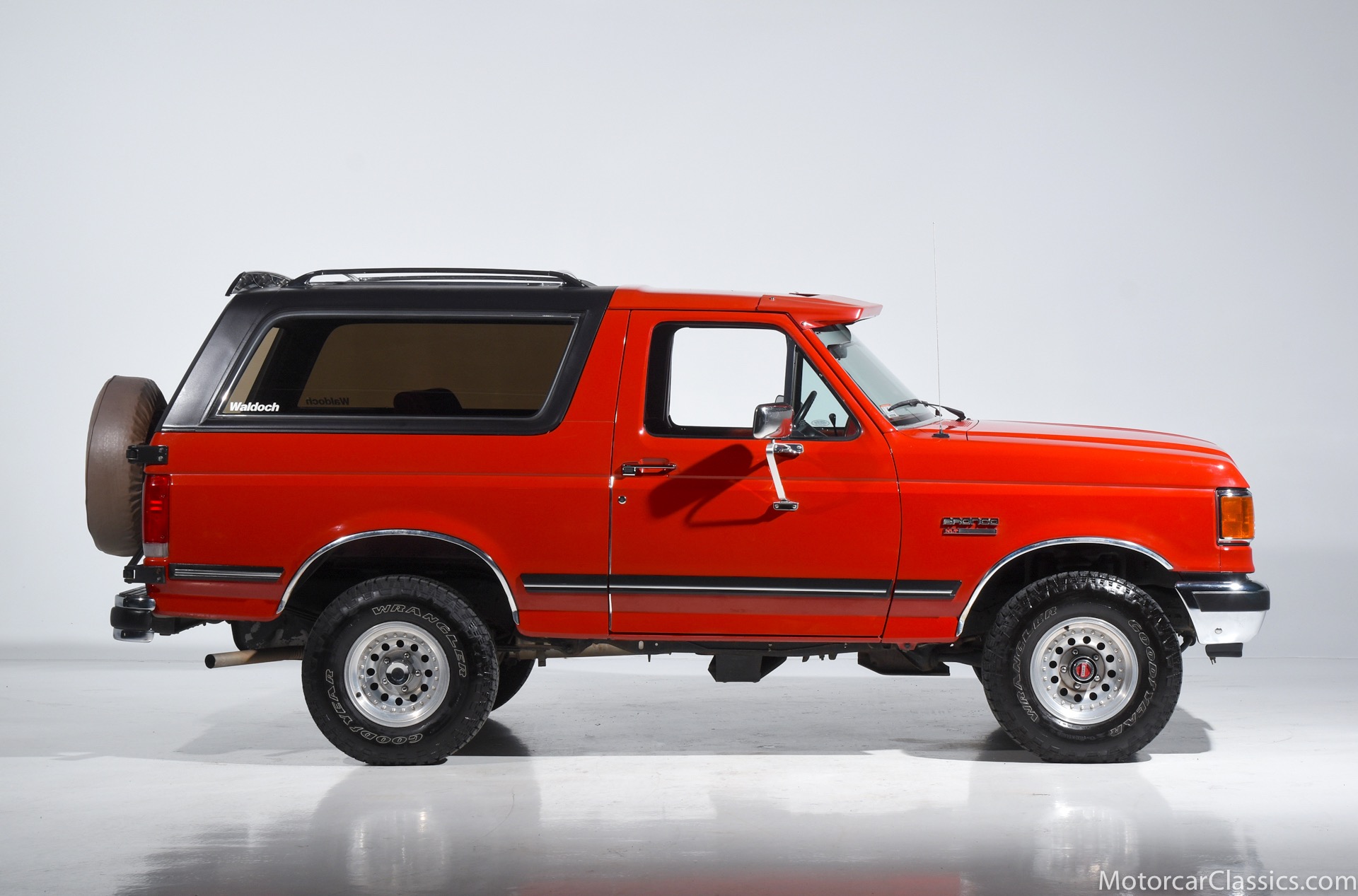 1987 Ford Bronco XLT for sale! Motorcar Classics is proud to present this handsome 1987 Ford Bronco XLT featured in red with black hard top and red velour interior. This loaded Bronco XLT is an all-original two-owner truck that has covered only 43,316 miles. The XLT is loaded with factory amenities including Fords 5.0L V8, automatic transmission, all-wheel drive, power steering, brakes, windows, door locks, cruise control, factory AC, and more. This Bronco is both very usable, and very collectible. Your inspection is invited.