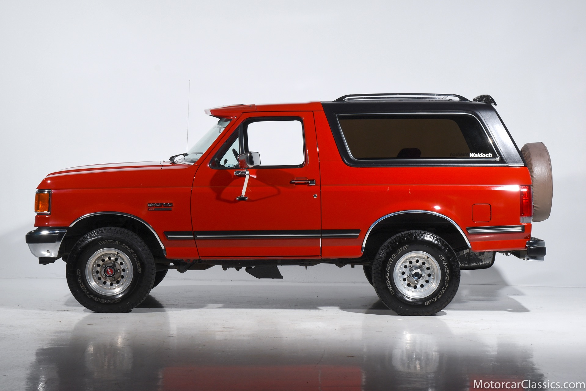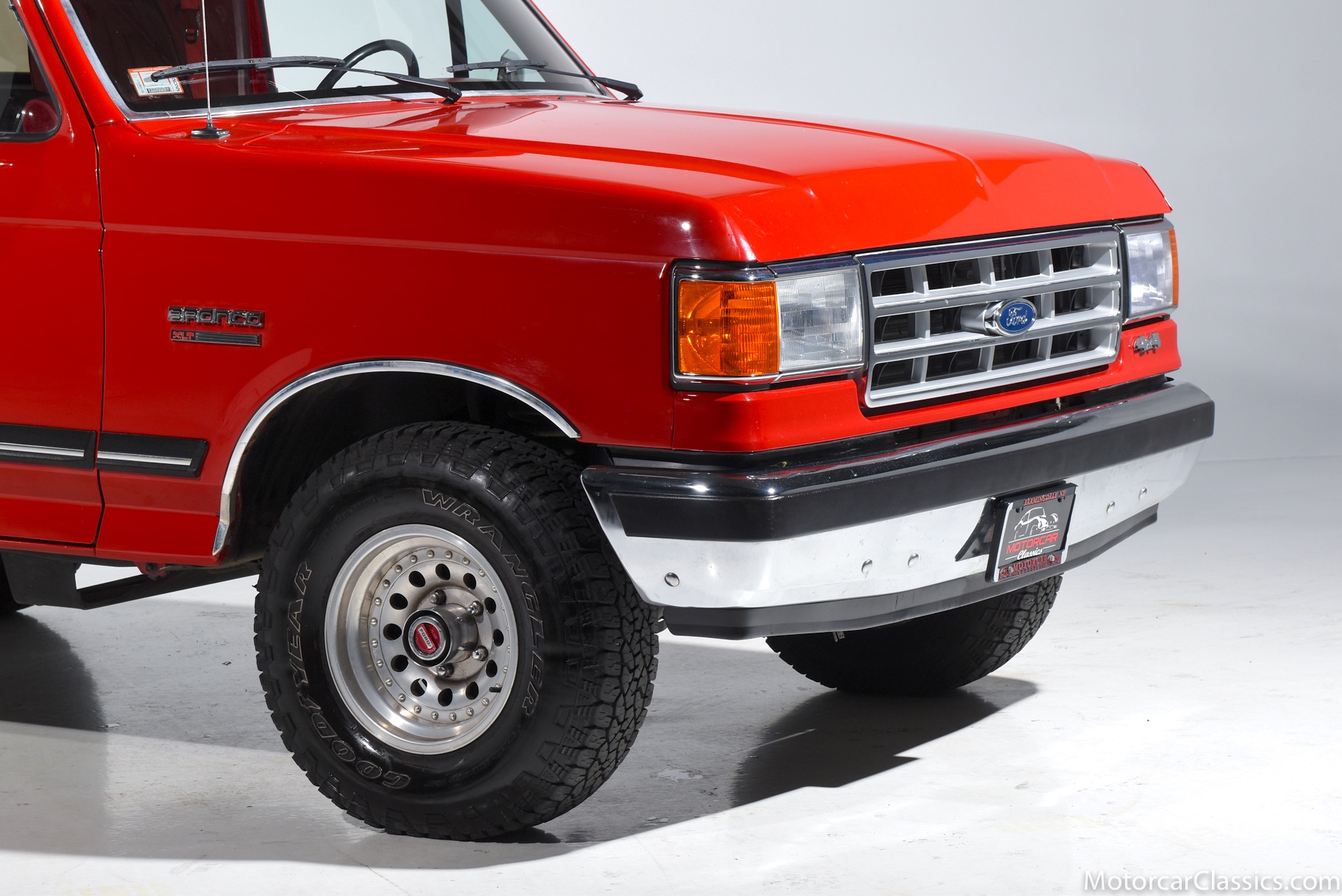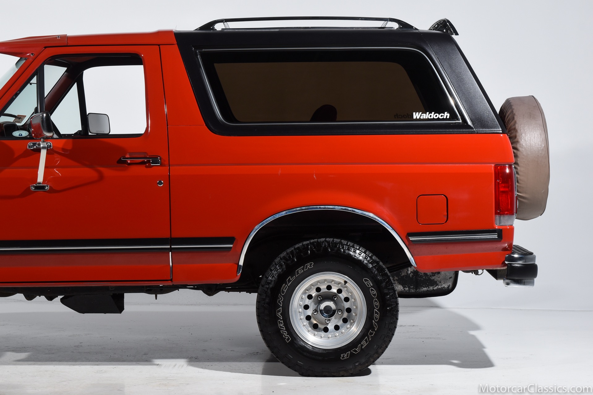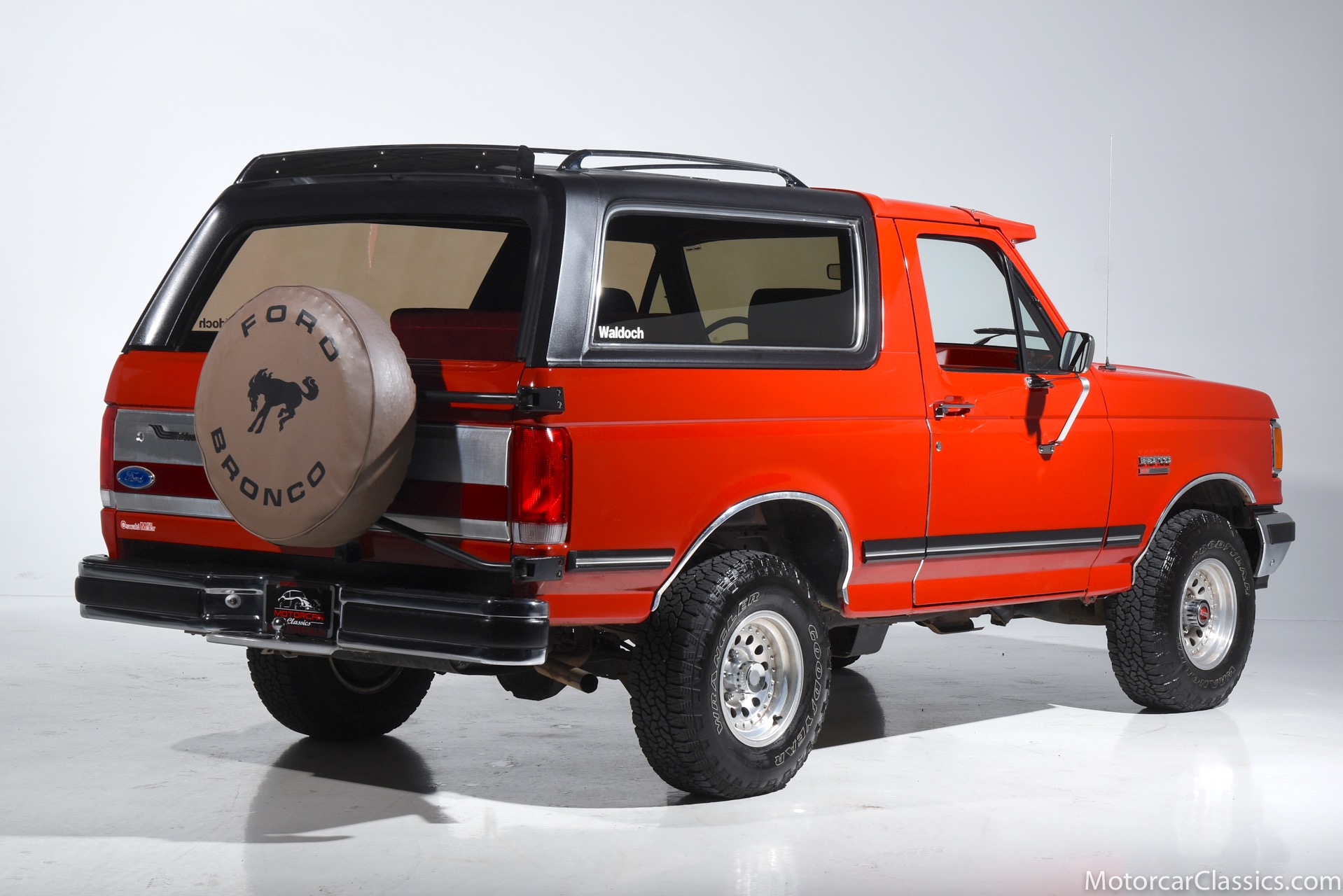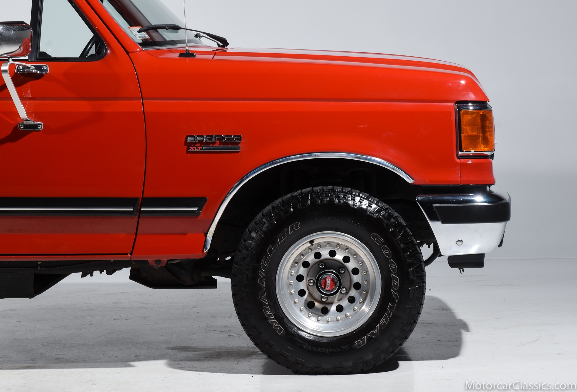 1987 Ford Bronco XLT for sale! Motorcar Classics is proud to present this handsome 1987 Ford Bronco XLT featured in red with black hard top and red velour interior. This loaded Bronco XLT is an all-original two-owner truck that has covered only 43,316 miles. The XLT is loaded with factory amenities including Fords 5.0L V8, automatic transmission, all-wheel drive, power steering, brakes, windows, door locks, cruise control, factory AC, and more. This Bronco is both very usable, and very collectible. Your inspection is invited.