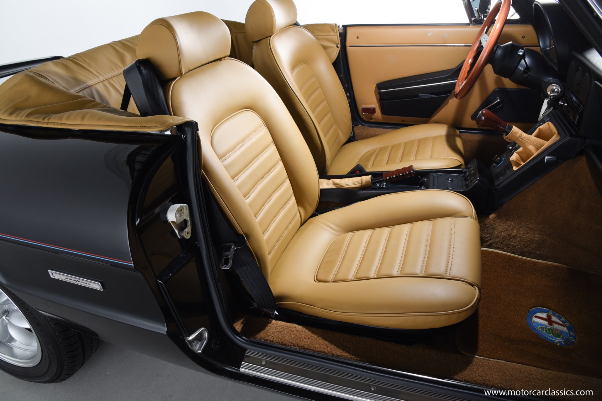 1988 Alfa Romeo Spider Graduate for sale! Motorcar Classics is pleased to present this 1988 Alfa Romeo Spider Graduate roadster featured in black with a tan interior, black convertible top, and black removable hard top. The Graduate is powered by Alfas fuel-injected 2.0-liter DOHC inline-four paired with a five-speed manual transmission. Additional features include front and rear spoilers, a black tonneau cover, factory AC, AM/FM/Cassette stereo, and a center outlet exhaust. The car has covered only 29,571k miles, and it has been recently serviced including brakes, suspension bushings, tires, motor mounts and fluids. It is ready for your summer driving pleasure.