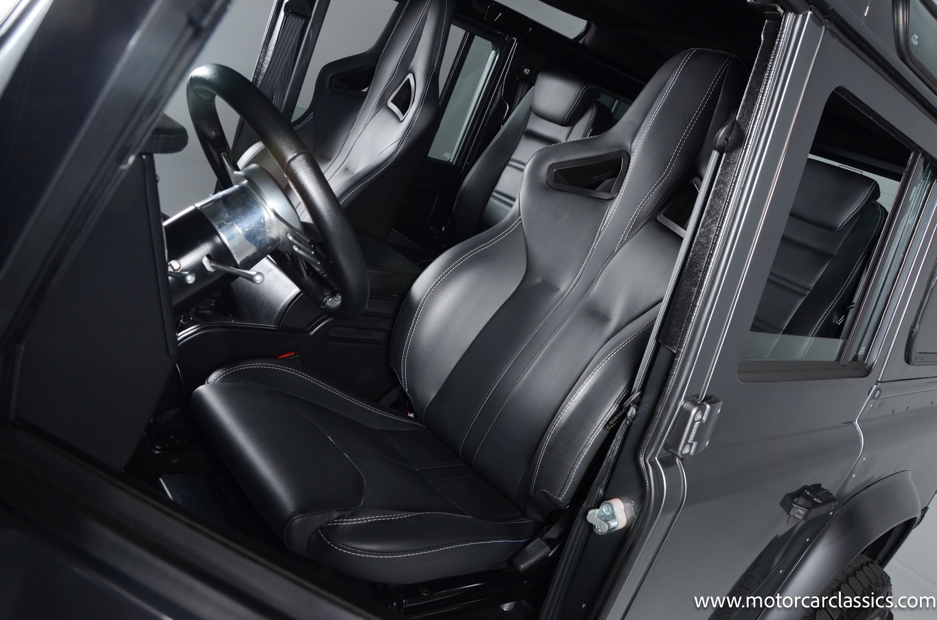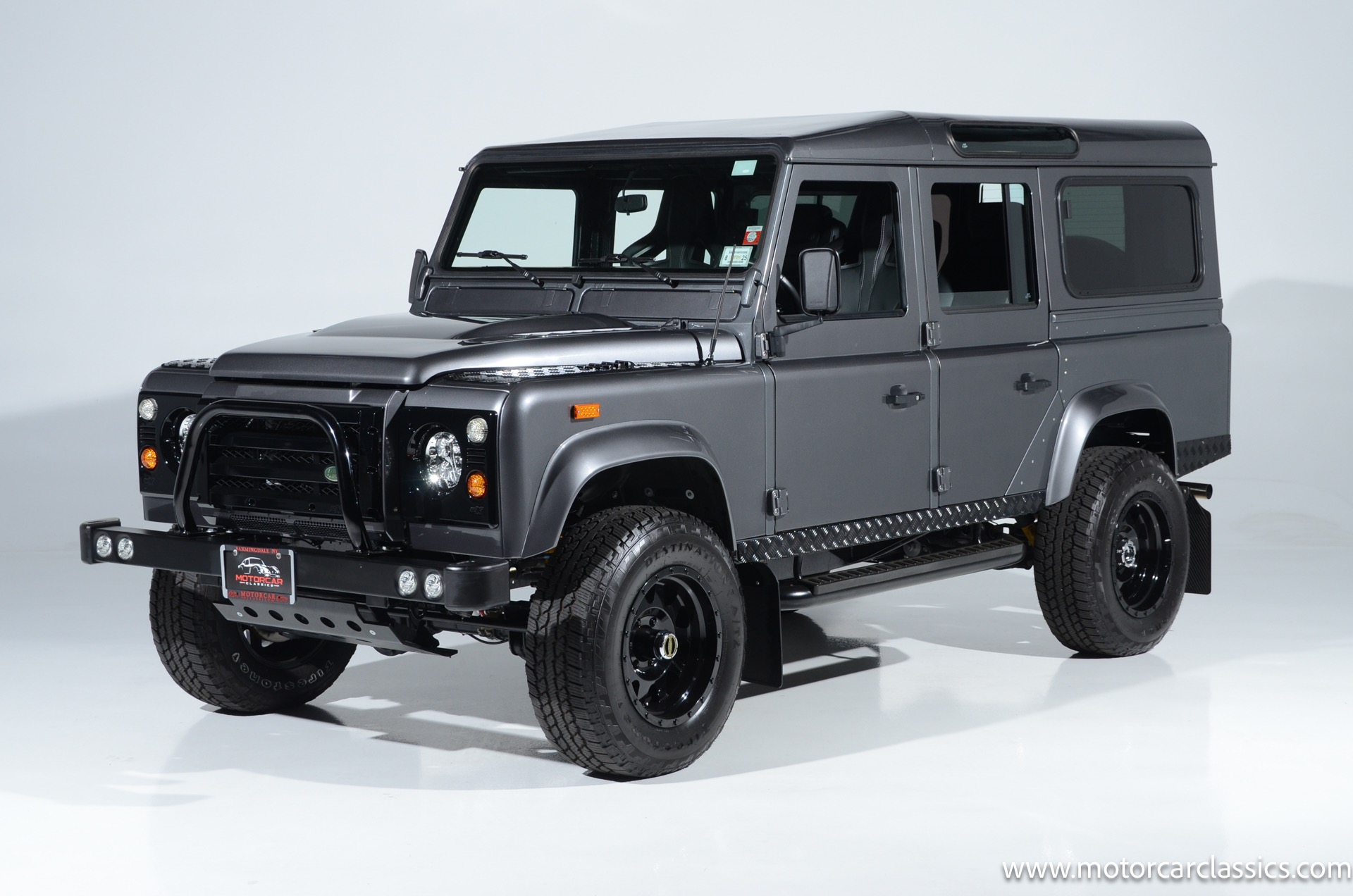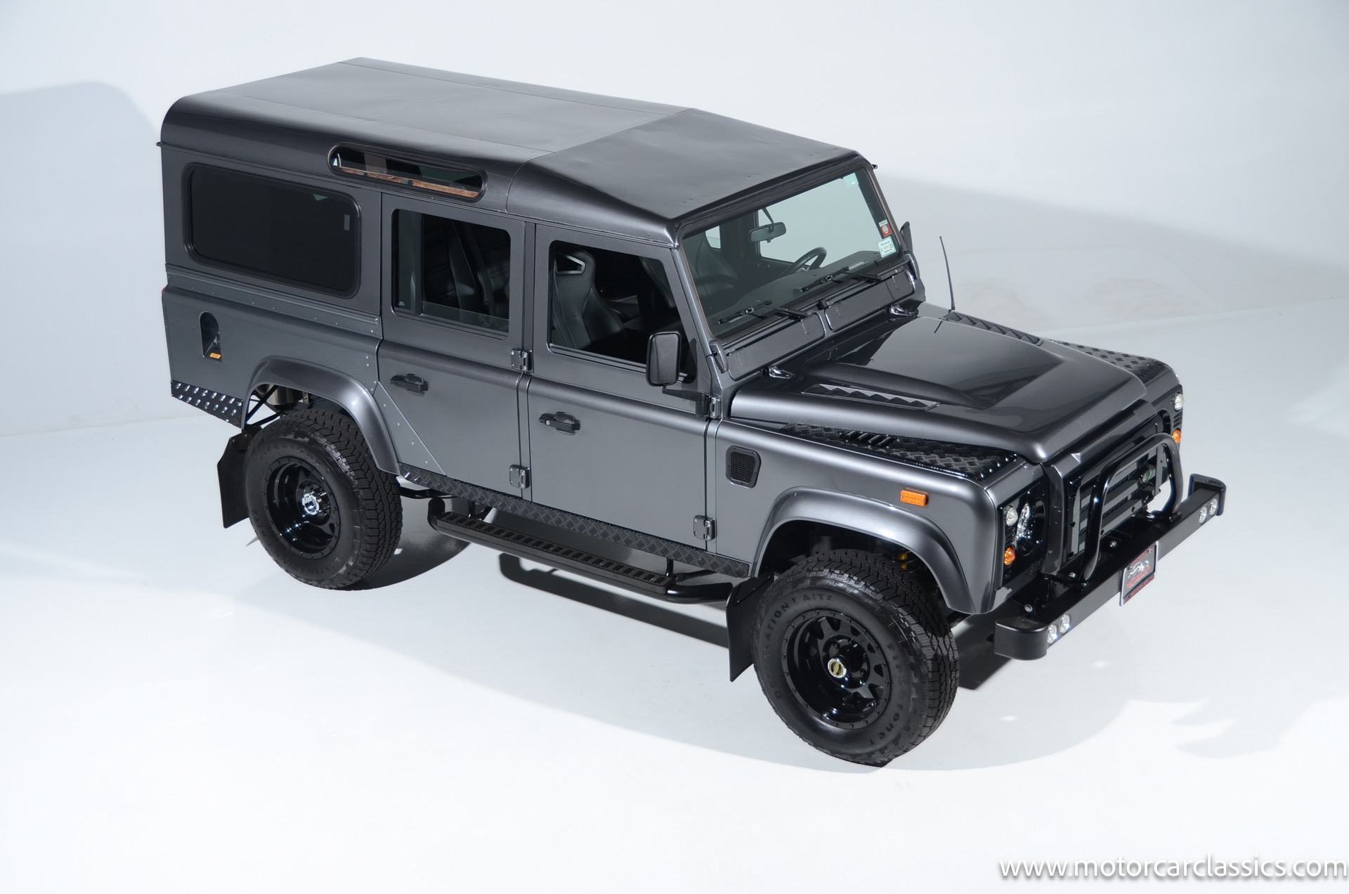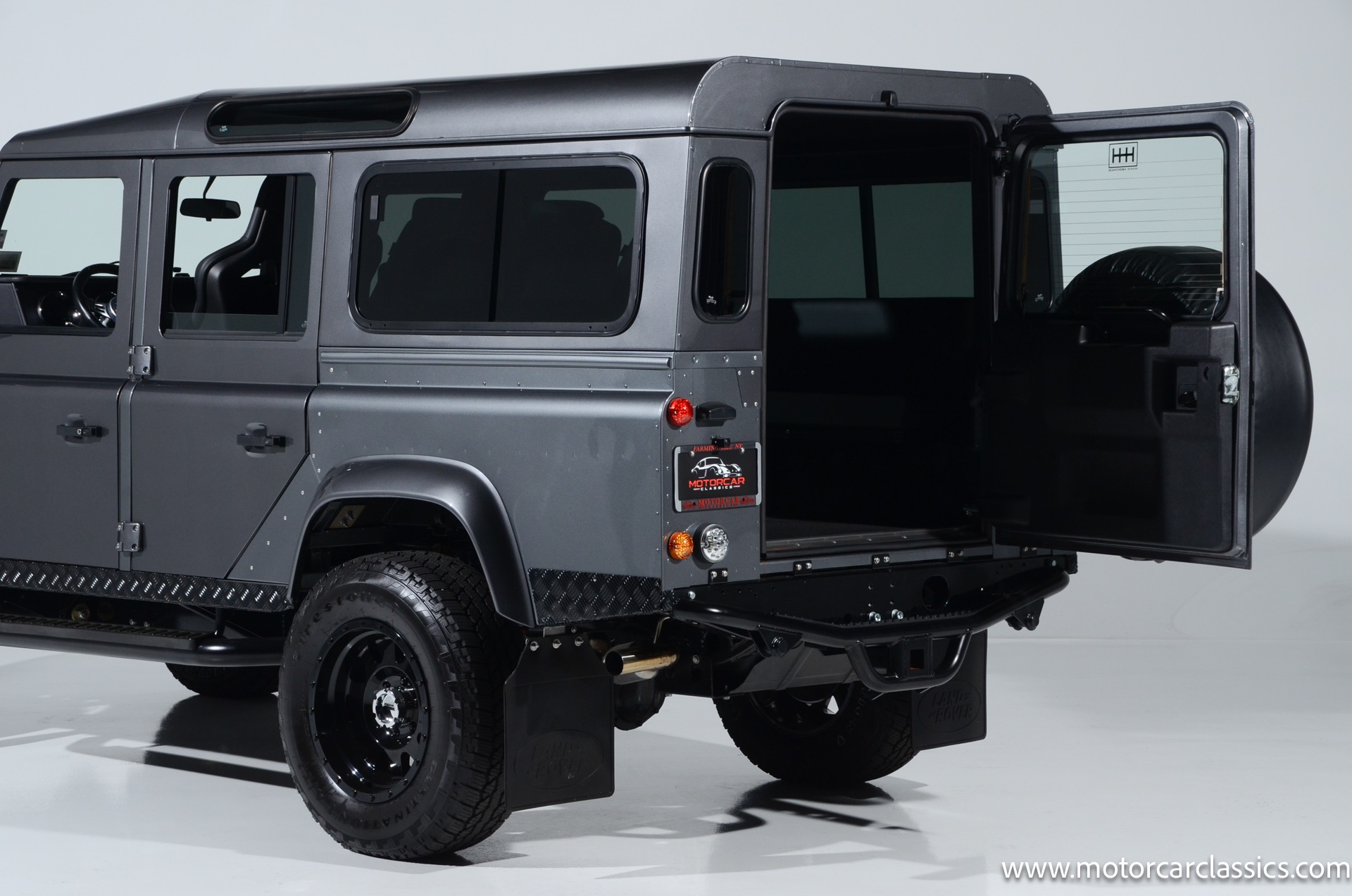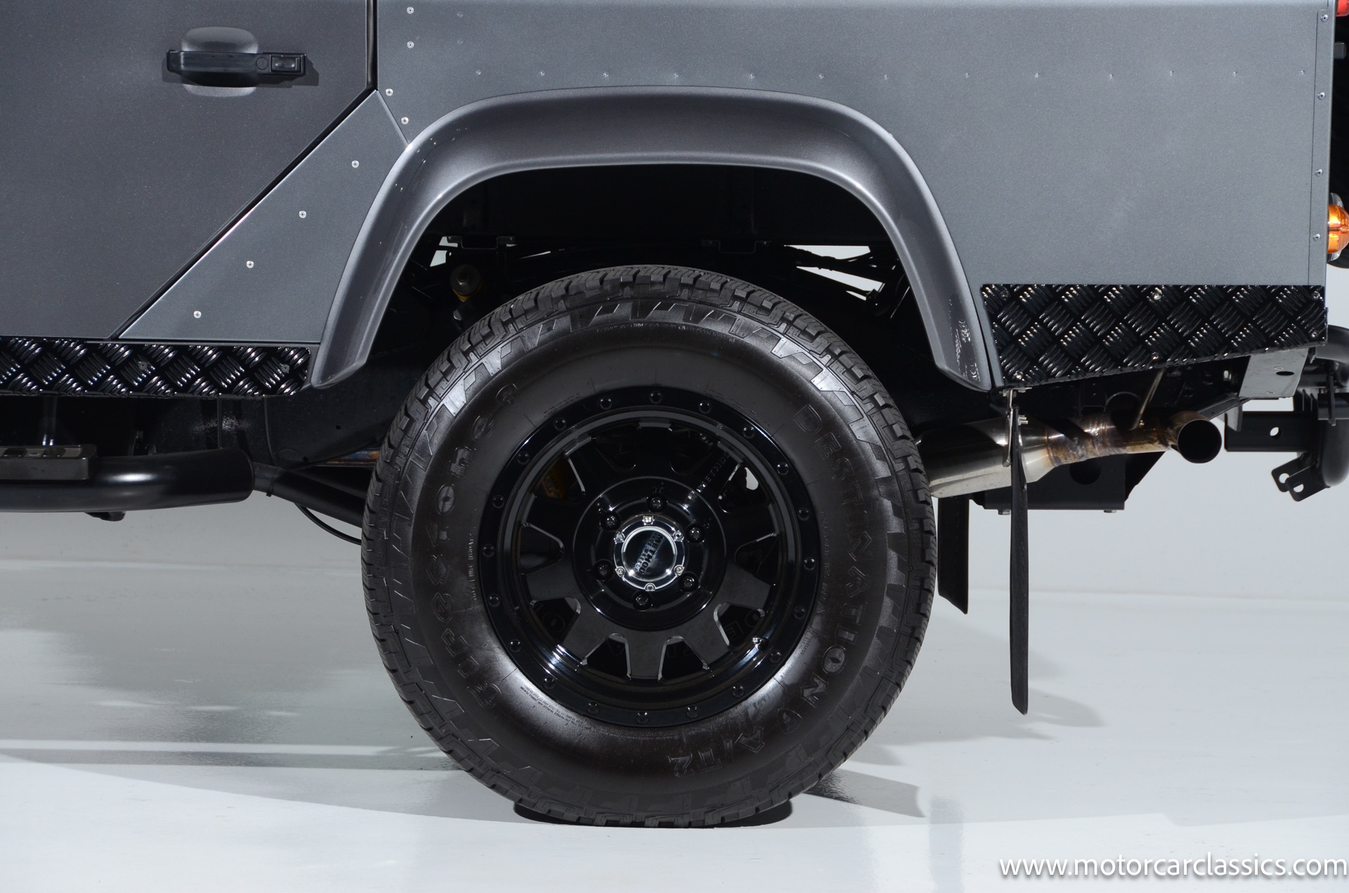 1988 Land Rover Defender 110 for sale! Motorcar Classics is proud to present this 1988 Defender 110 restored and upgraded by the legendary HHH Heritage out of Kenosha Wisconsin. Finished in Dark Grey Metallic over black leather with silver stitching this vehicle has been painstakingly restored to what you see today. Under the hood is a brand new 350CI Chevrolet engine making 420HP and 408Ft lbs of Torque attached to an Atlas transfer case ( 3.0:1 ratio ). The 4x4 system is equipped with Dana 44 Front and Rear Axles with 3.73 gears Options include: Premium carpeting, Dynamat through out as sound deadening, Custom bulkhead system, Premium Sound/ Screen system with front power door locks, 2nd row power windows, Steering guard, Front sport seats, high back seats for the second row and leather door panels, Wing top protectors, Puma hood upgrades, Shelby Intakes, Bull bar with bumper extensions, diamond plate sides and much much more. Why wait to have one built when this is ready to go with only 2591 break in miles. Your inspection is invited!