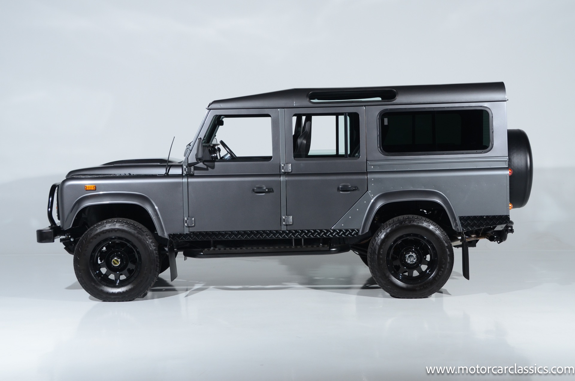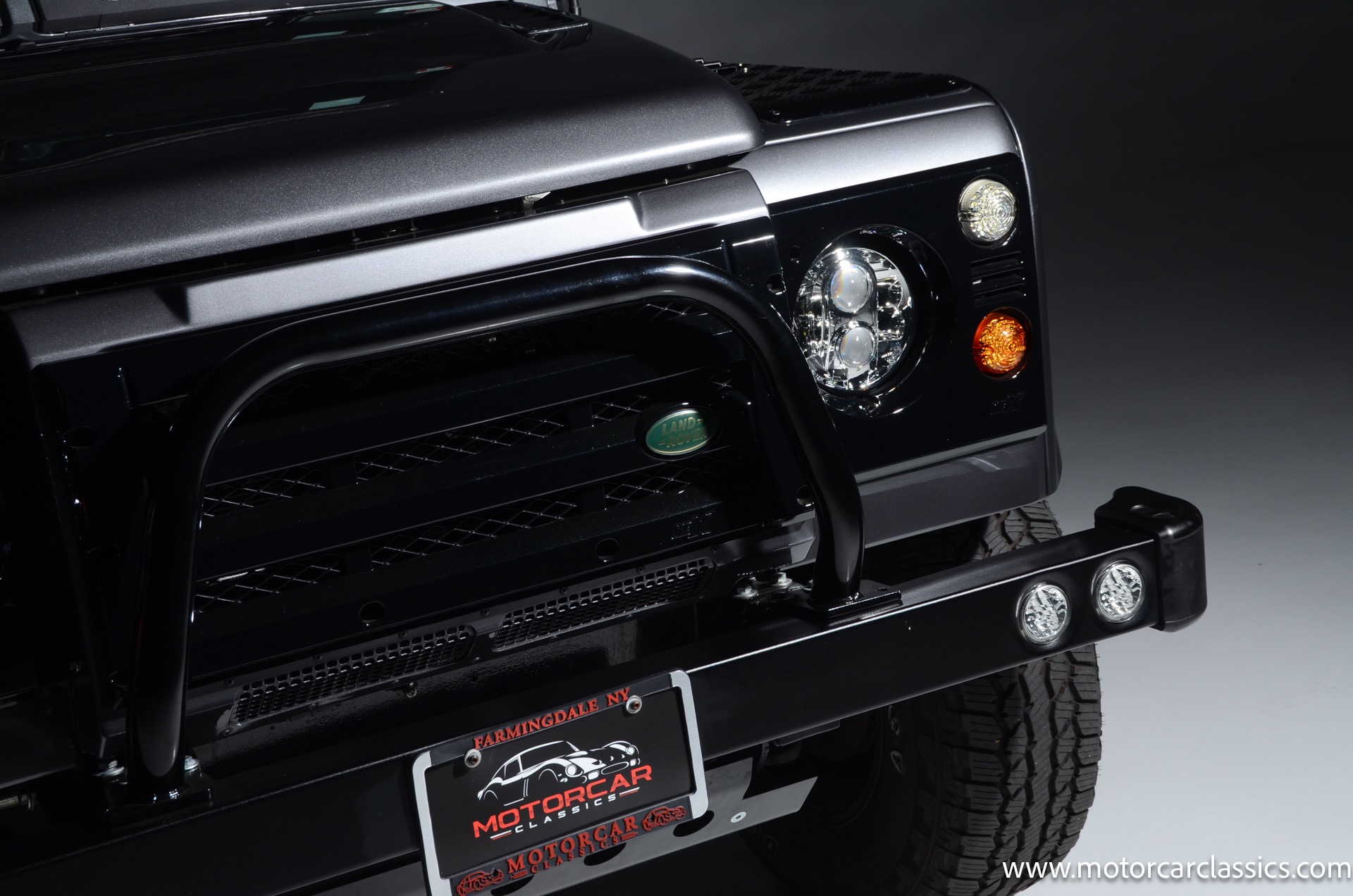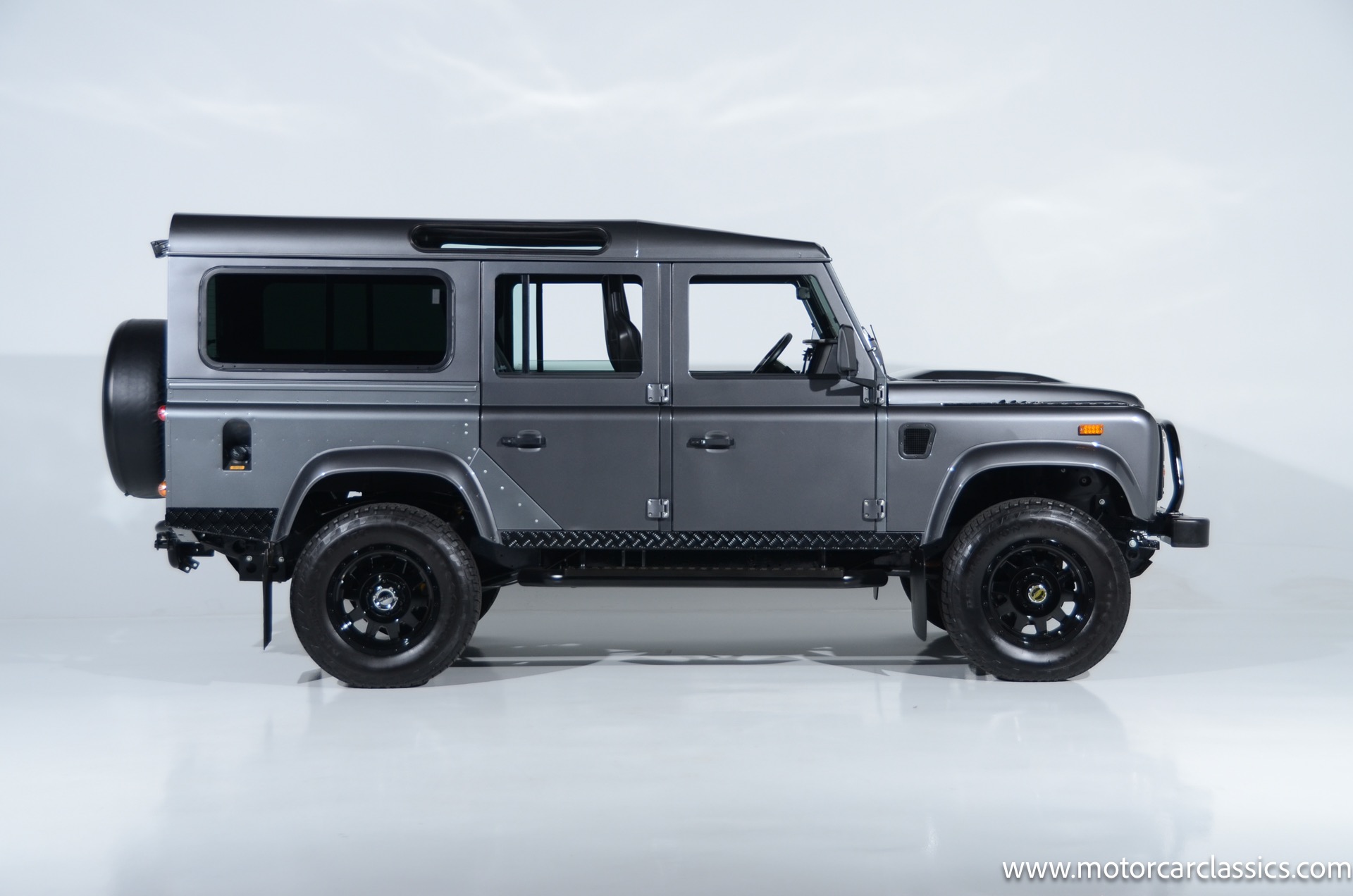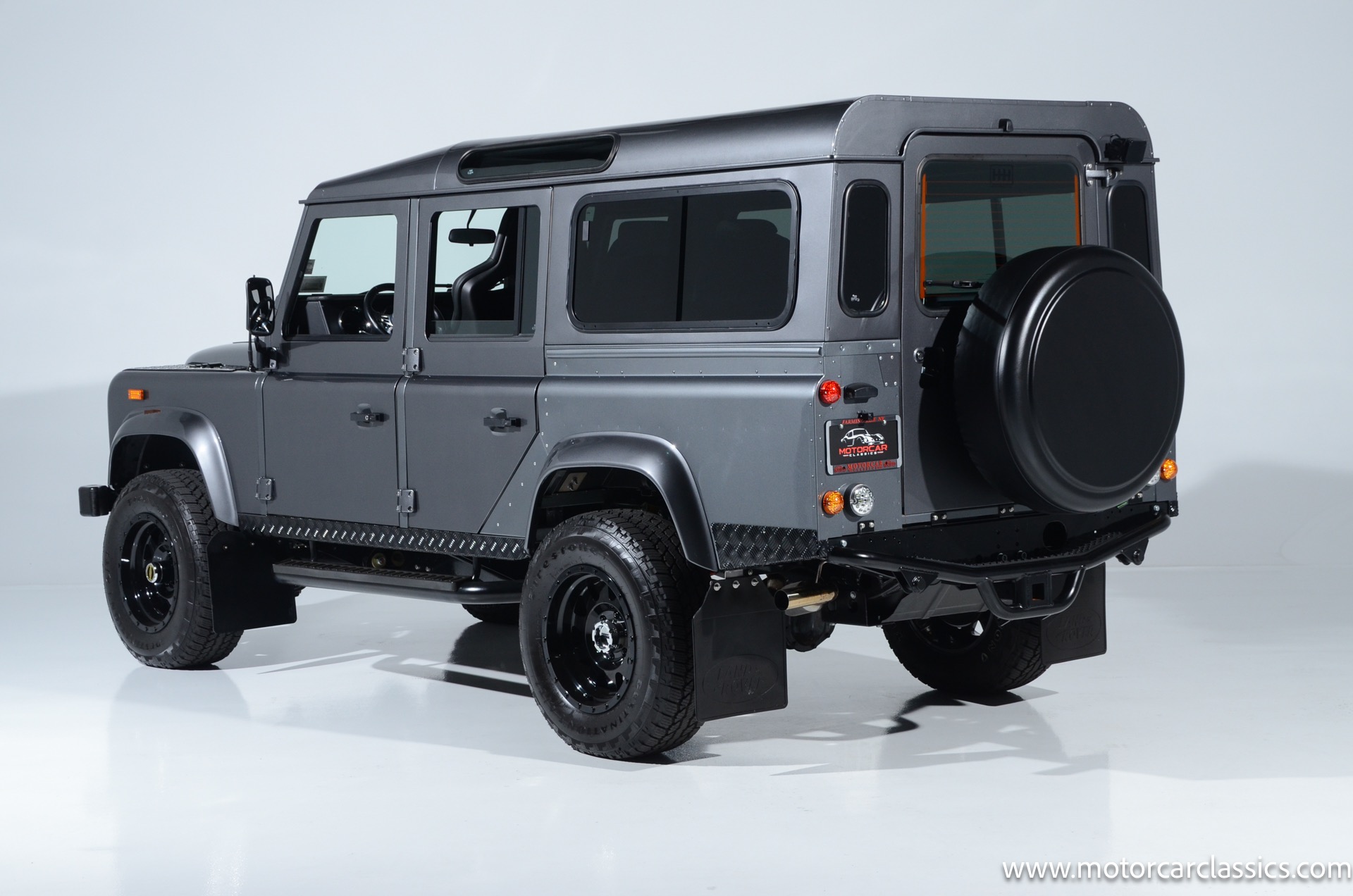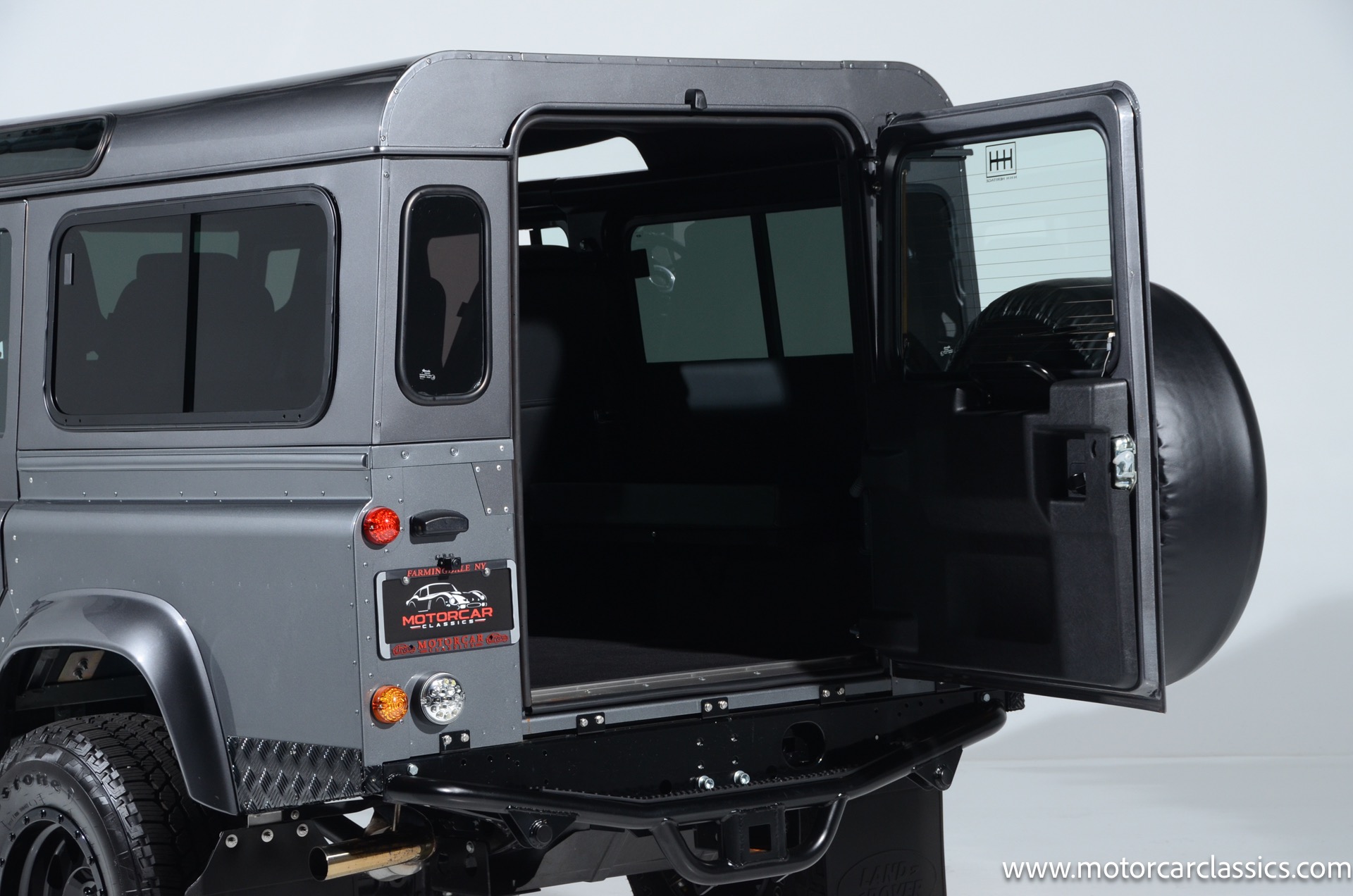 1988 Land Rover Defender 110 for sale! Motorcar Classics is proud to present this 1988 Defender 110 restored and upgraded by the legendary HHH Heritage out of Kenosha Wisconsin. Finished in Dark Grey Metallic over black leather with silver stitching this vehicle has been painstakingly restored to what you see today. Under the hood is a brand new 350CI Chevrolet engine making 420HP and 408Ft lbs of Torque attached to an Atlas transfer case ( 3.0:1 ratio ). The 4x4 system is equipped with Dana 44 Front and Rear Axles with 3.73 gears Options include: Premium carpeting, Dynamat through out as sound deadening, Custom bulkhead system, Premium Sound/ Screen system with front power door locks, 2nd row power windows, Steering guard, Front sport seats, high back seats for the second row and leather door panels, Wing top protectors, Puma hood upgrades, Shelby Intakes, Bull bar with bumper extensions, diamond plate sides and much much more. Why wait to have one built when this is ready to go with only 2591 break in miles. Your inspection is invited!