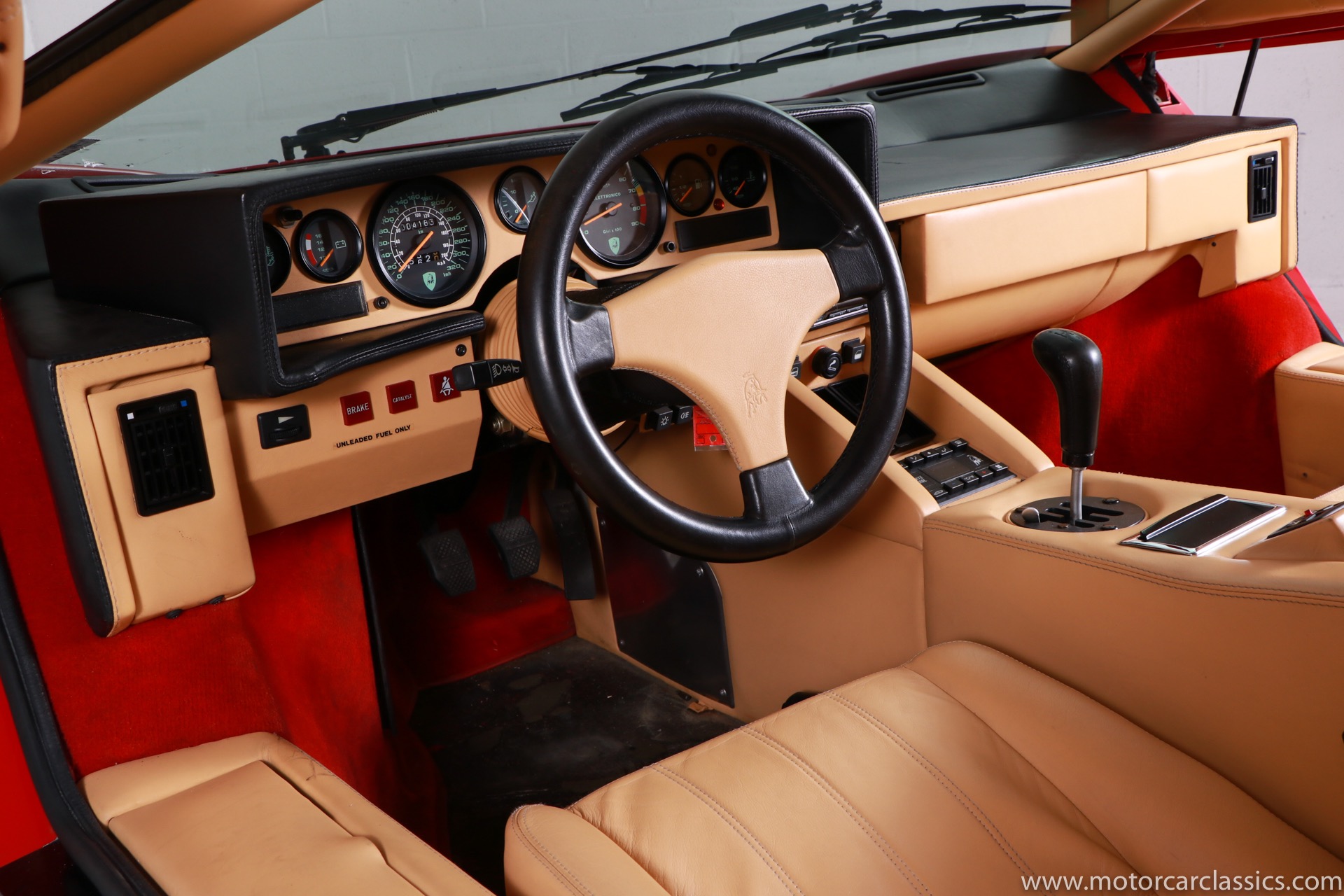 1989 Lamborghini Countach for sale! Motorcar Classics is thrilled to present this stunning 1989 Lamborghini 25th Anniversary Edition Countach featured in red with tan leather interior. For Lamborghinis 25th anniversary, what would be the final and most highly developed edition of the Countach was built in a run of just 657 examples. The car gained new elegance with the addition of a front air dam and completely redesigned engine and cooling intakes that were now integrated into the body lines. New lower body work integrated with the fender flares and blended with a redesigned rear bumper. Repositioning the radiators and using larger fans improved cooling, which was among the most crucial of a wide range of internal improvements. And while the driveline was unchanged, new OZ modular wheels were used and new Pirelli Zero Asymmetrical tires replaced the old P7s. The model is powered by Lamborghinis beautiful 455 HP V-12 with a 5-speed manual gearbox. Ours is a one-owner car from new that has covered only 2,599 miles. It features the optional large rear wing. The car has all-original paint and is in museum condition throughout. Service records are included.