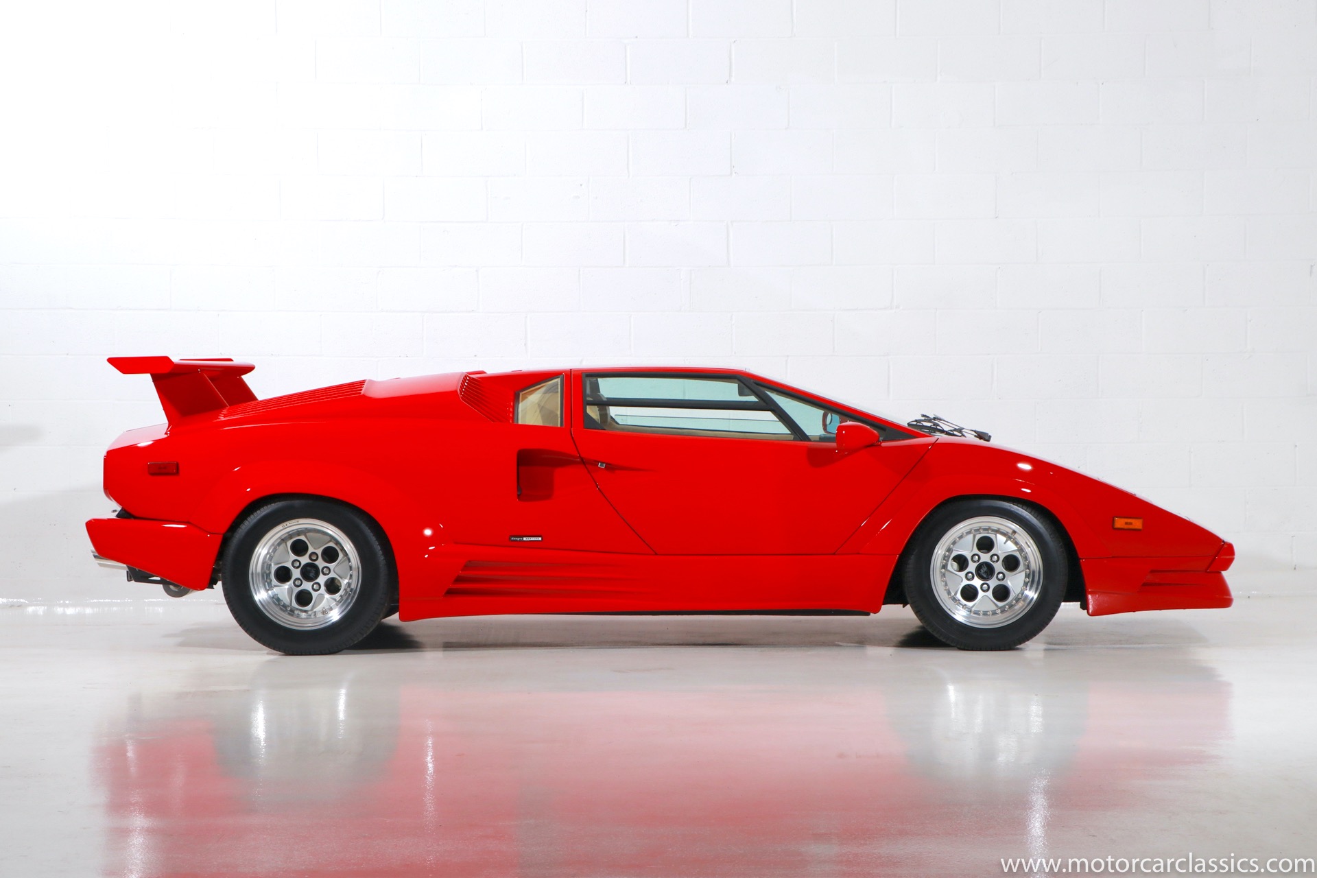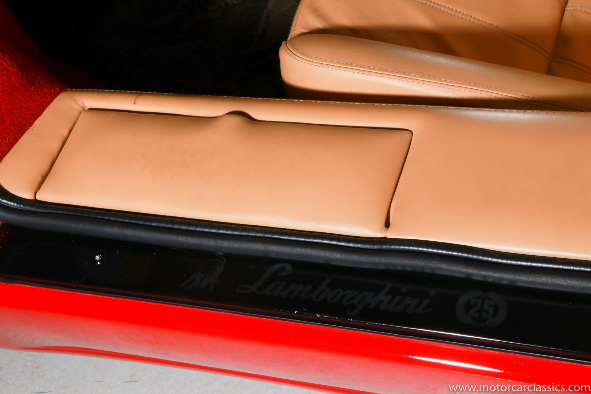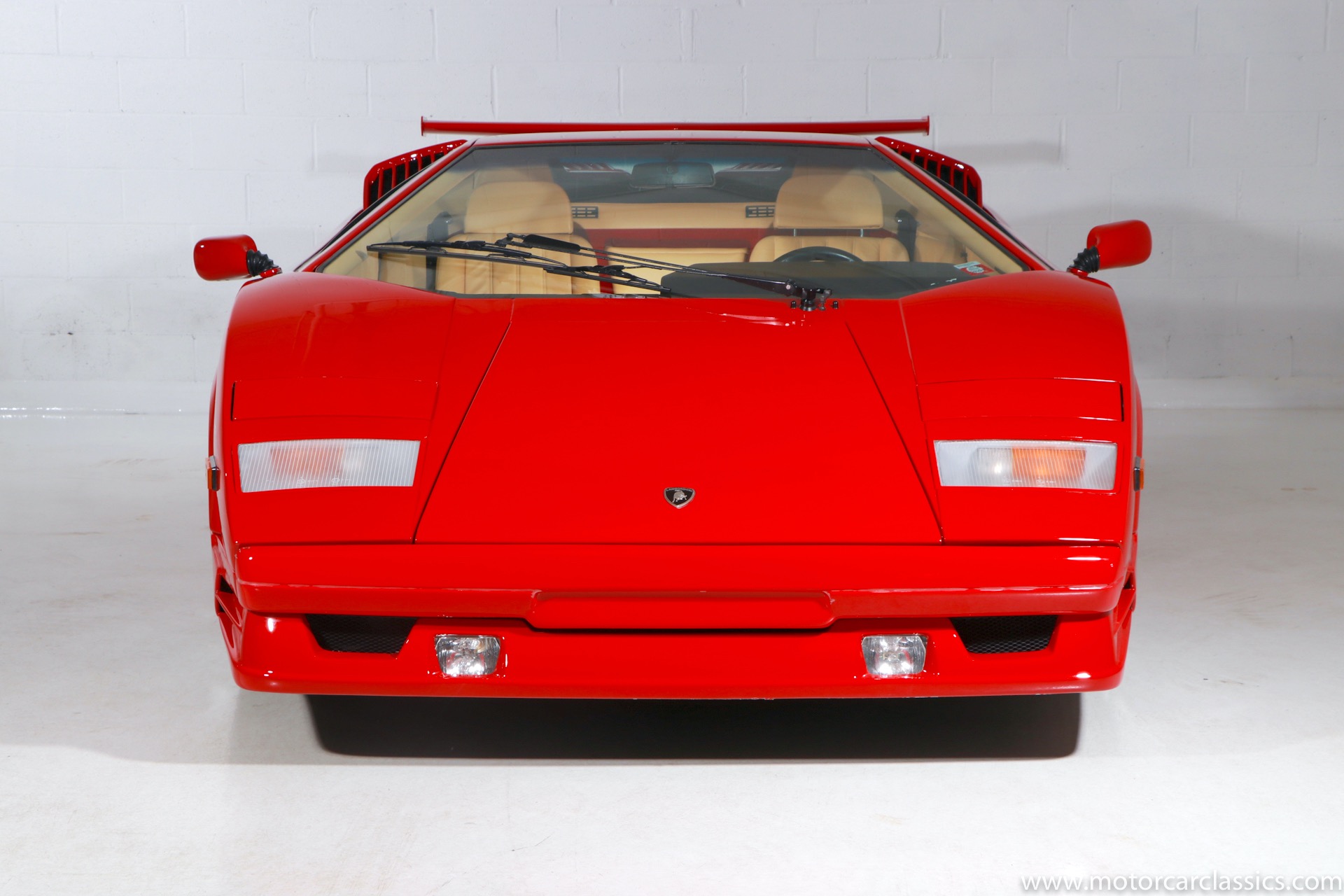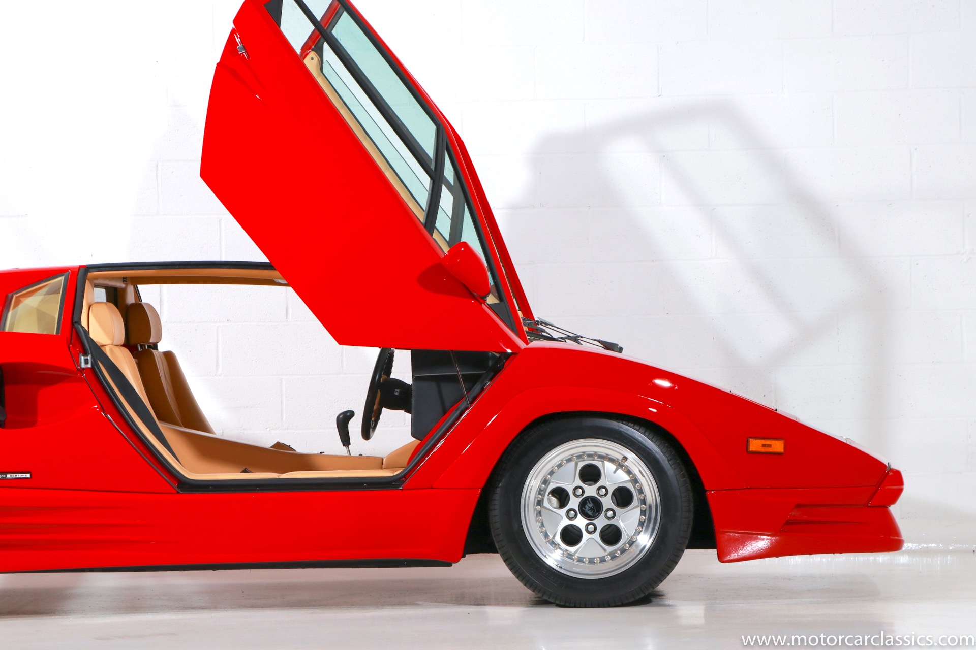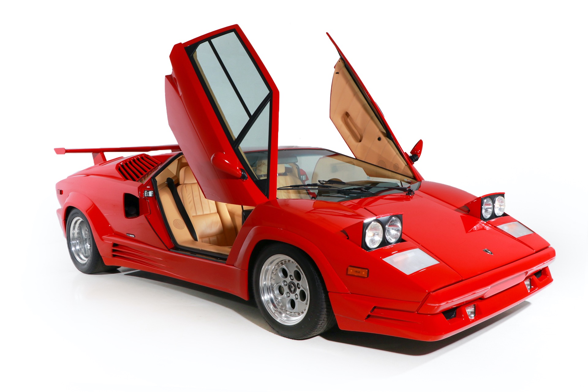 1989 Lamborghini Countach for sale! Motorcar Classics is thrilled to present this stunning 1989 Lamborghini 25th Anniversary Edition Countach featured in red with tan leather interior. For Lamborghinis 25th anniversary, what would be the final and most highly developed edition of the Countach was built in a run of just 657 examples. The car gained new elegance with the addition of a front air dam and completely redesigned engine and cooling intakes that were now integrated into the body lines. New lower body work integrated with the fender flares and blended with a redesigned rear bumper. Repositioning the radiators and using larger fans improved cooling, which was among the most crucial of a wide range of internal improvements. And while the driveline was unchanged, new OZ modular wheels were used and new Pirelli Zero Asymmetrical tires replaced the old P7s. The model is powered by Lamborghinis beautiful 455 HP V-12 with a 5-speed manual gearbox. Ours is a one-owner car from new that has covered only 2,599 miles. It features the optional large rear wing. The car has all-original paint and is in museum condition throughout. Service records are included.