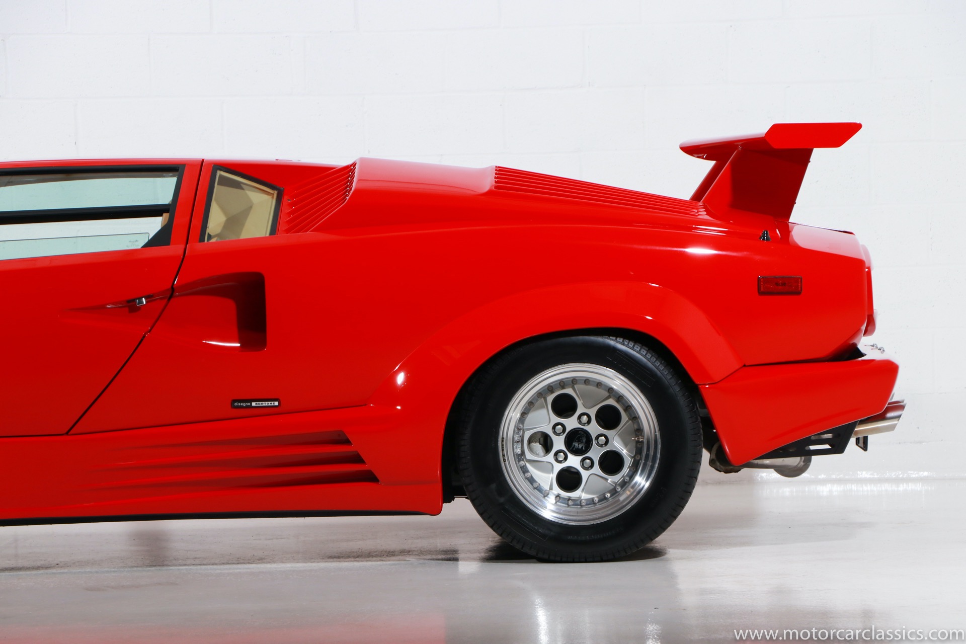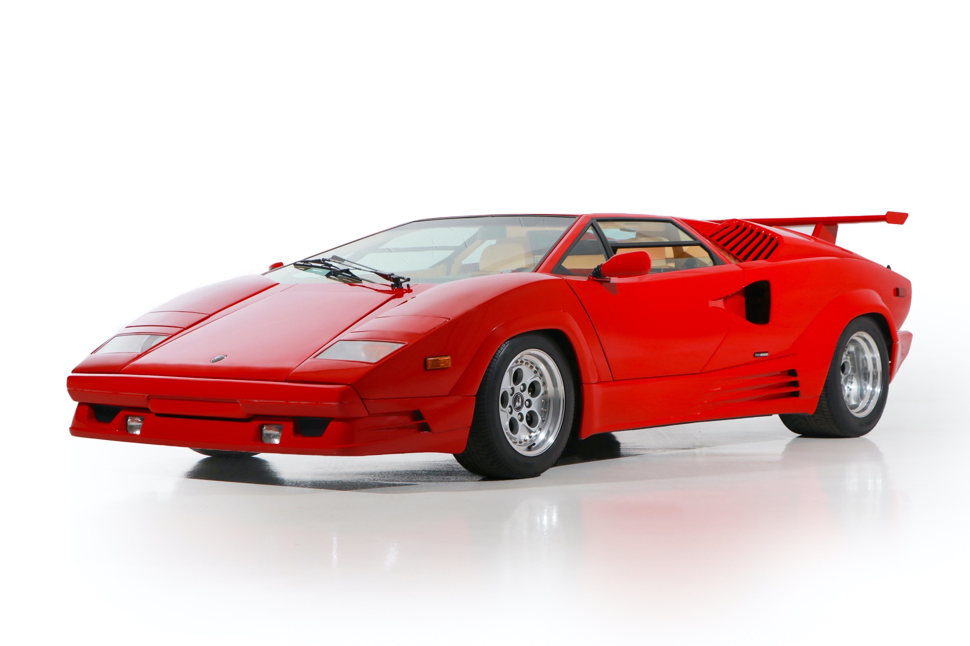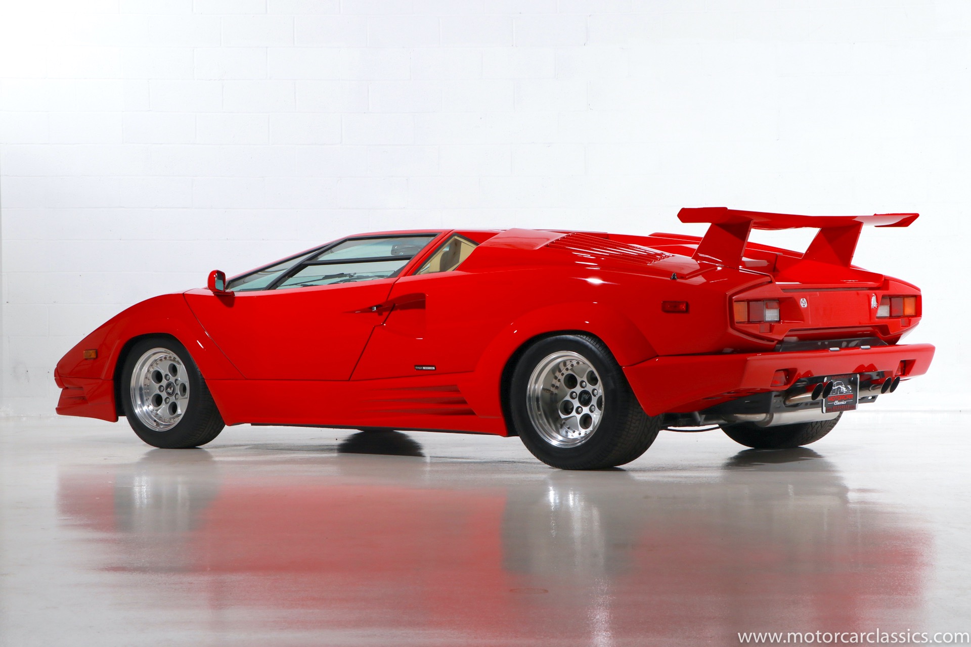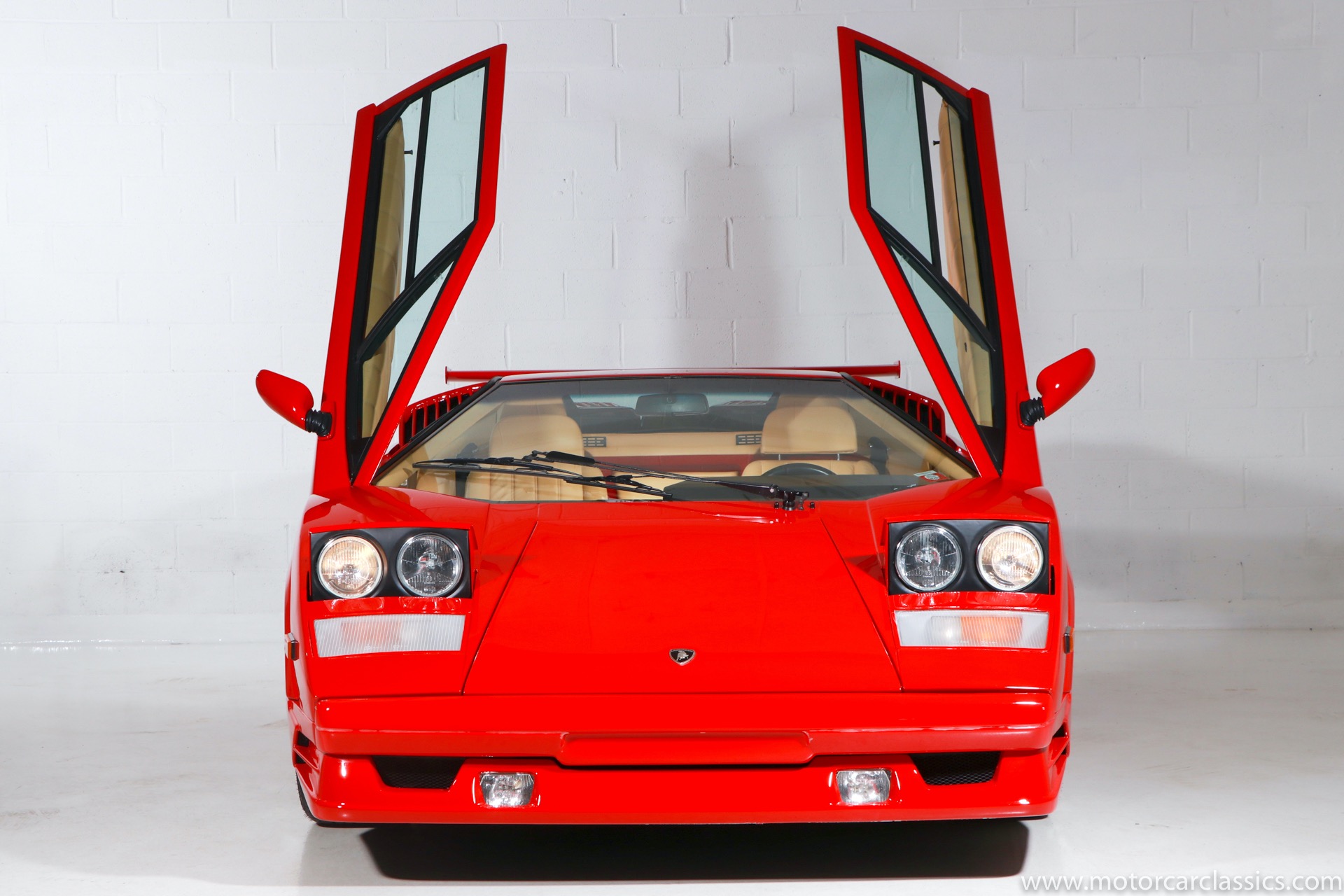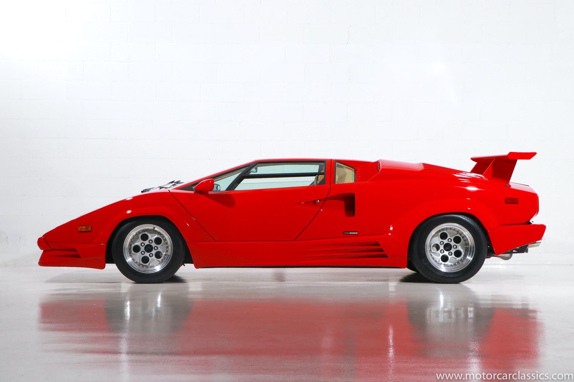 1989 Lamborghini Countach for sale! Motorcar Classics is thrilled to present this stunning 1989 Lamborghini 25th Anniversary Edition Countach featured in red with tan leather interior. For Lamborghinis 25th anniversary, what would be the final and most highly developed edition of the Countach was built in a run of just 657 examples. The car gained new elegance with the addition of a front air dam and completely redesigned engine and cooling intakes that were now integrated into the body lines. New lower body work integrated with the fender flares and blended with a redesigned rear bumper. Repositioning the radiators and using larger fans improved cooling, which was among the most crucial of a wide range of internal improvements. And while the driveline was unchanged, new OZ modular wheels were used and new Pirelli Zero Asymmetrical tires replaced the old P7s. The model is powered by Lamborghinis beautiful 455 HP V-12 with a 5-speed manual gearbox. Ours is a one-owner car from new that has covered only 2,599 miles. It features the optional large rear wing. The car has all-original paint and is in museum condition throughout. Service records are included.