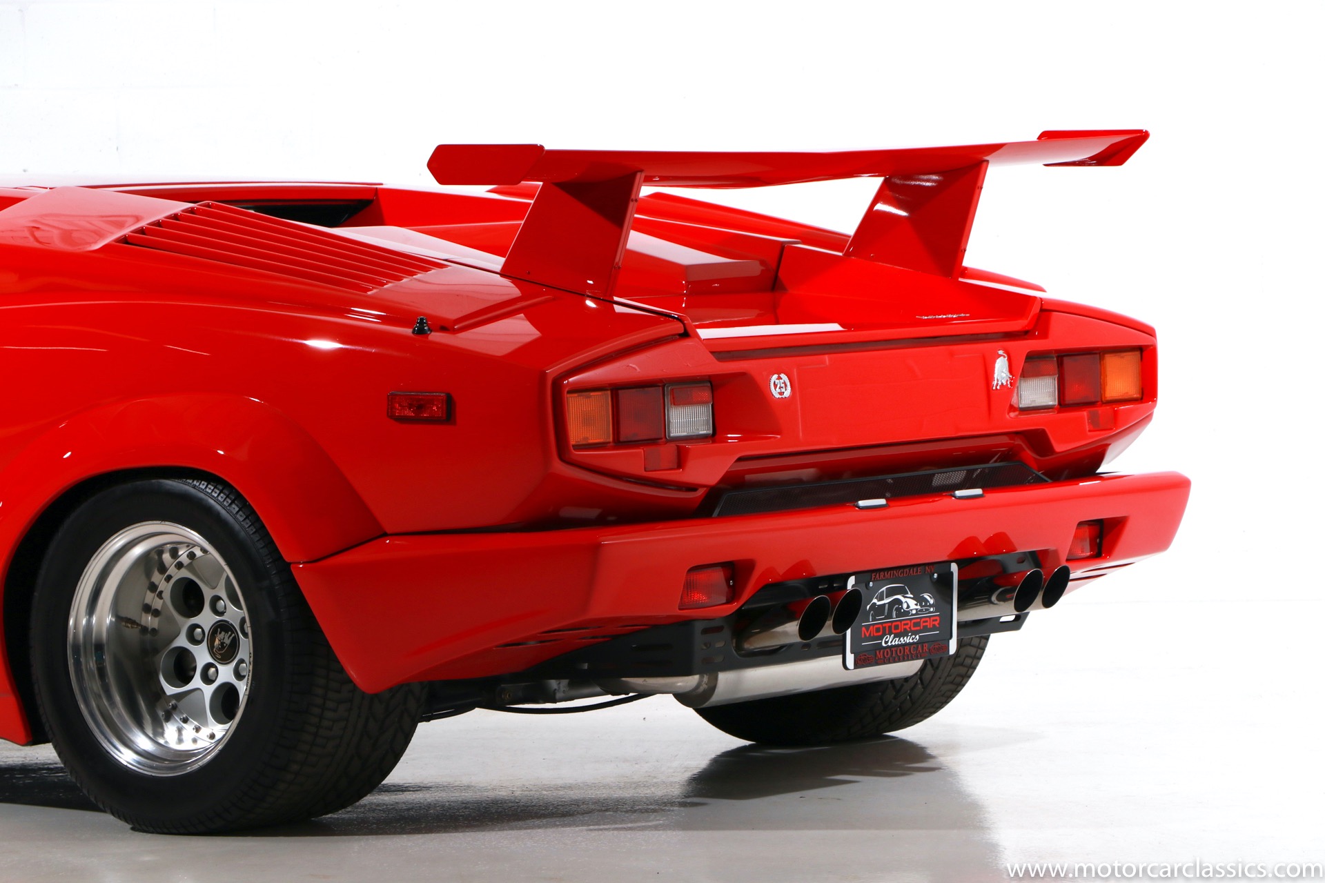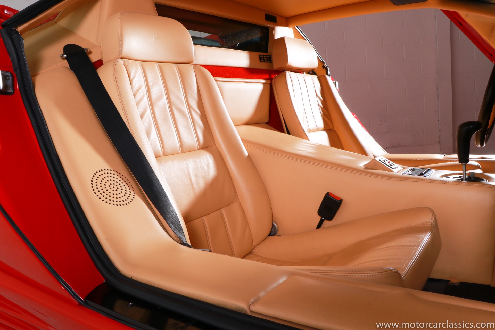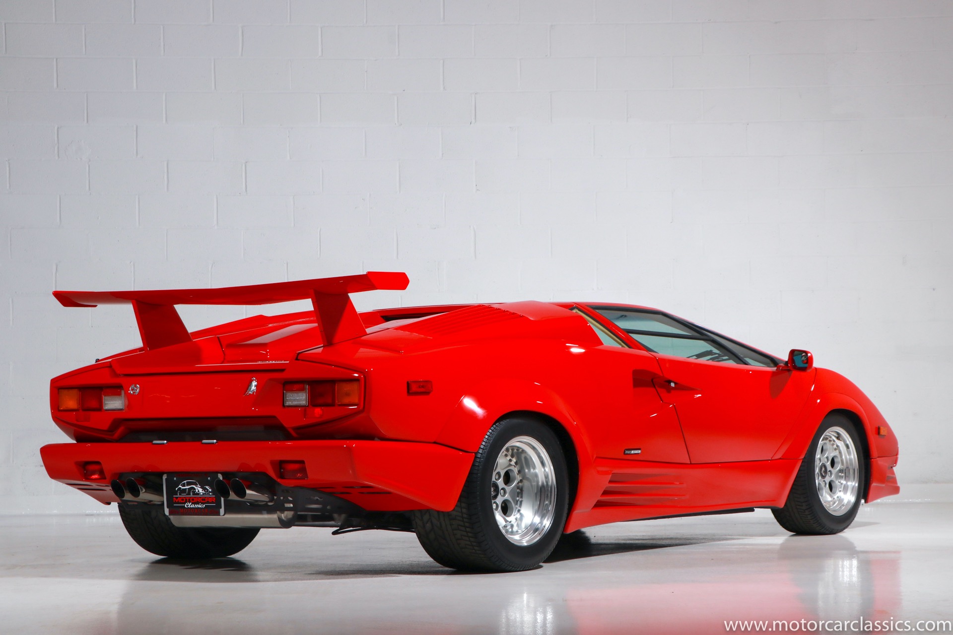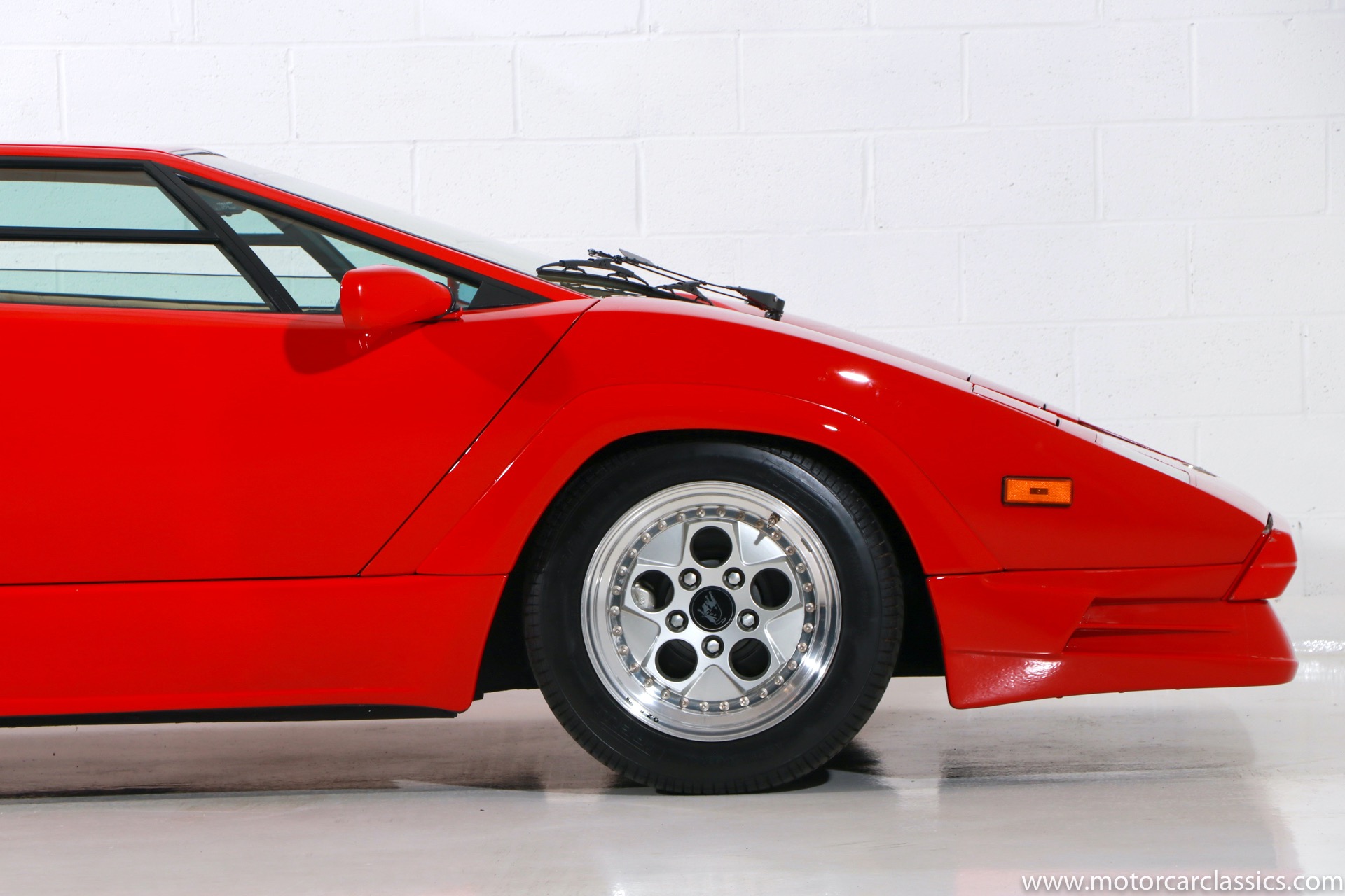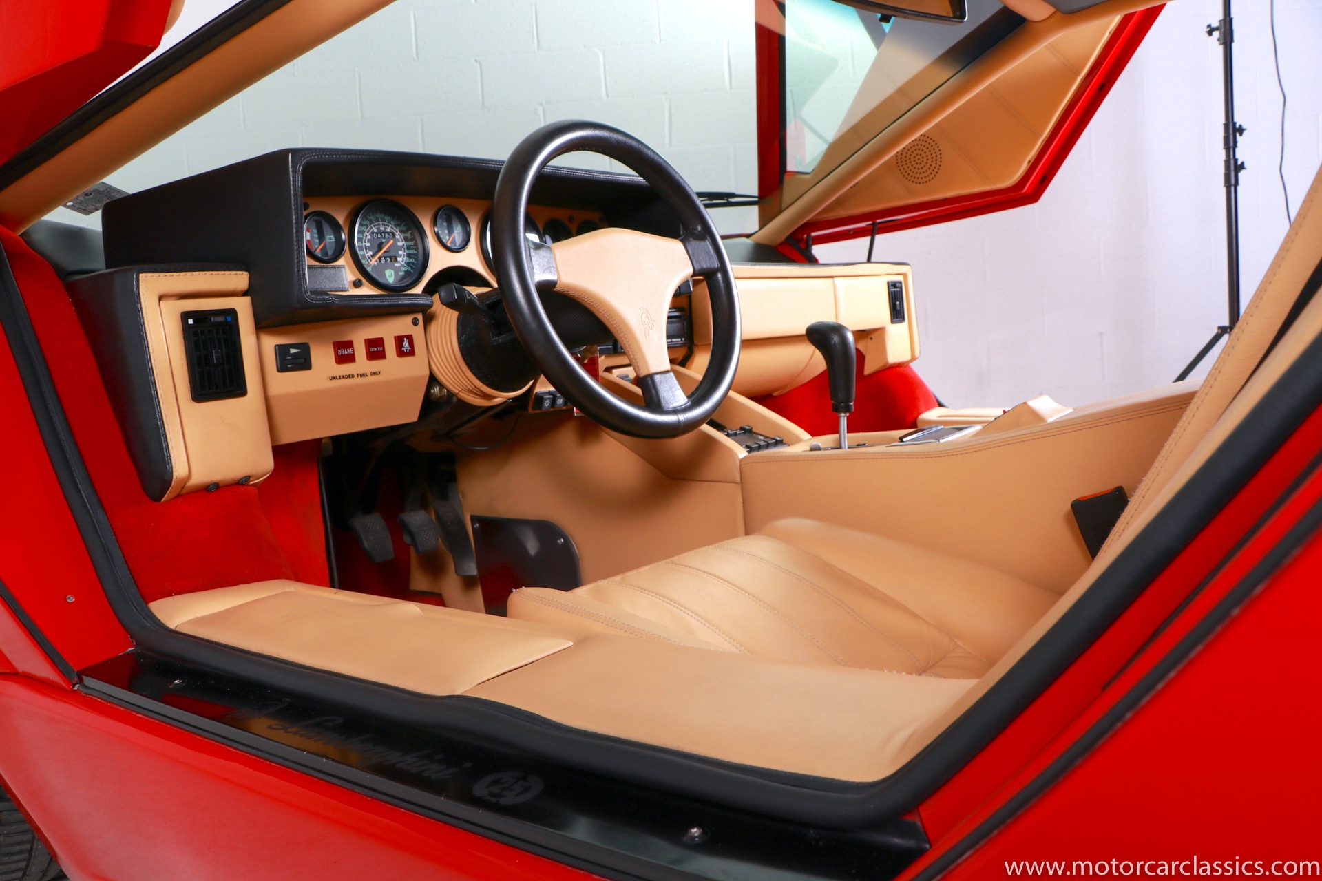 1989 Lamborghini Countach for sale! Motorcar Classics is thrilled to present this stunning 1989 Lamborghini 25th Anniversary Edition Countach featured in red with tan leather interior. For Lamborghinis 25th anniversary, what would be the final and most highly developed edition of the Countach was built in a run of just 657 examples. The car gained new elegance with the addition of a front air dam and completely redesigned engine and cooling intakes that were now integrated into the body lines. New lower body work integrated with the fender flares and blended with a redesigned rear bumper. Repositioning the radiators and using larger fans improved cooling, which was among the most crucial of a wide range of internal improvements. And while the driveline was unchanged, new OZ modular wheels were used and new Pirelli Zero Asymmetrical tires replaced the old P7s. The model is powered by Lamborghinis beautiful 455 HP V-12 with a 5-speed manual gearbox. Ours is a one-owner car from new that has covered only 2,599 miles. It features the optional large rear wing. The car has all-original paint and is in museum condition throughout. Service records are included.