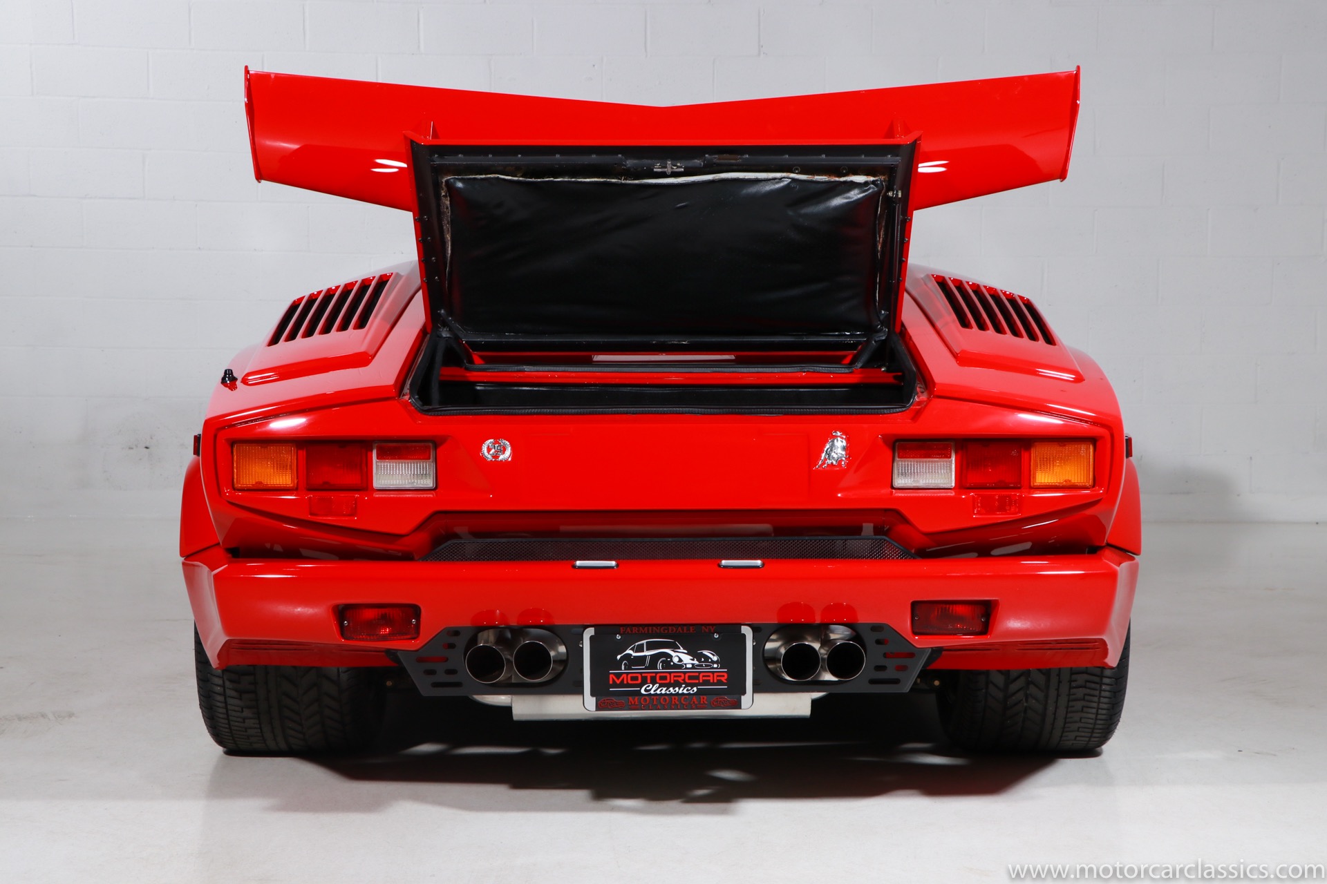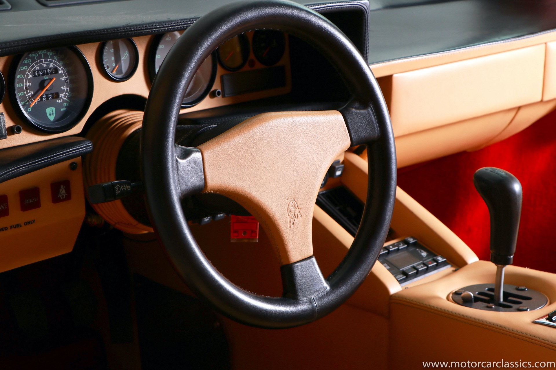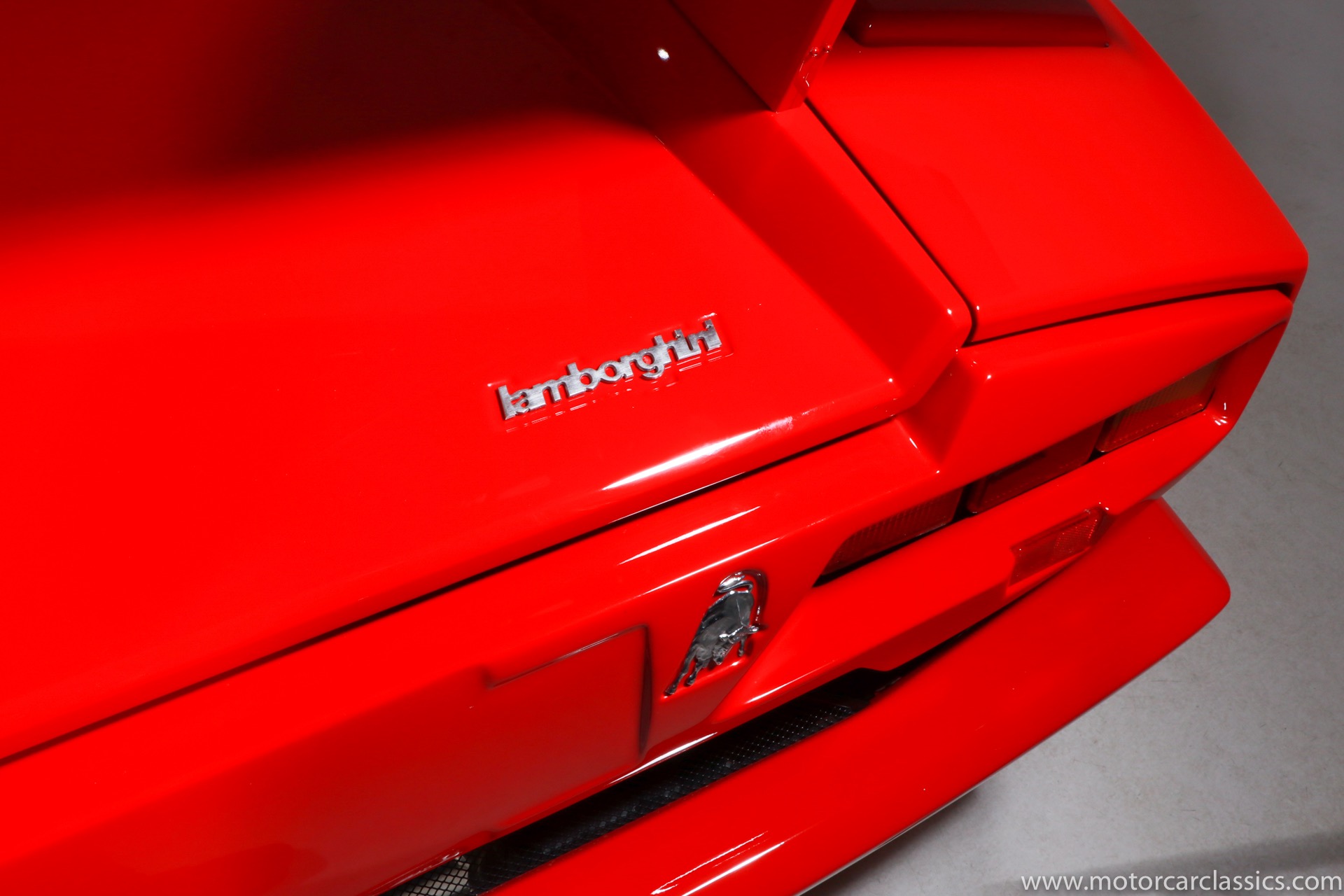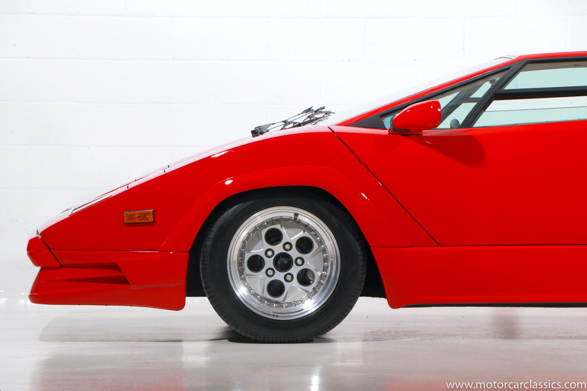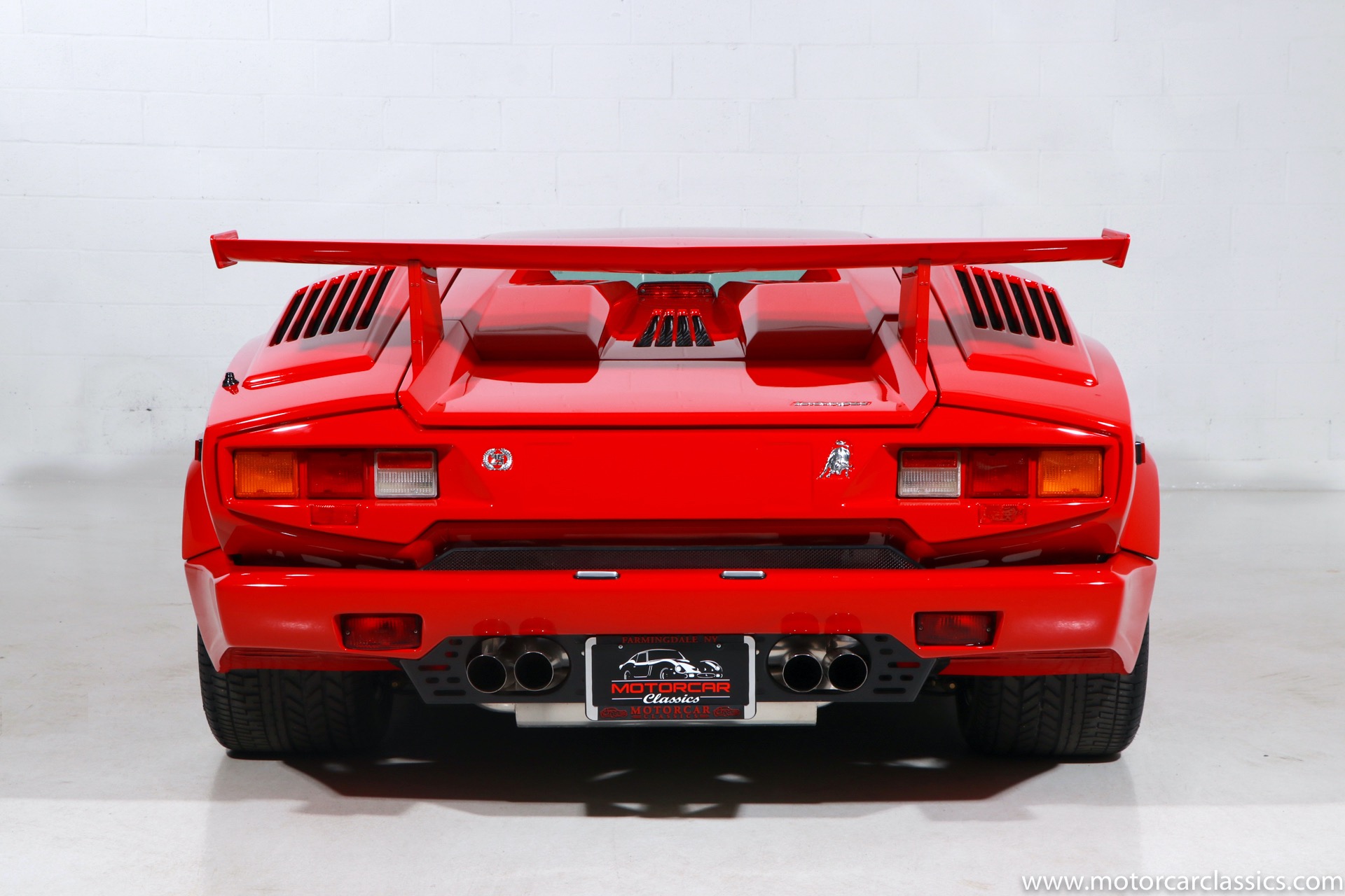 1989 Lamborghini Countach for sale! Motorcar Classics is thrilled to present this stunning 1989 Lamborghini 25th Anniversary Edition Countach featured in red with tan leather interior. For Lamborghinis 25th anniversary, what would be the final and most highly developed edition of the Countach was built in a run of just 657 examples. The car gained new elegance with the addition of a front air dam and completely redesigned engine and cooling intakes that were now integrated into the body lines. New lower body work integrated with the fender flares and blended with a redesigned rear bumper. Repositioning the radiators and using larger fans improved cooling, which was among the most crucial of a wide range of internal improvements. And while the driveline was unchanged, new OZ modular wheels were used and new Pirelli Zero Asymmetrical tires replaced the old P7s. The model is powered by Lamborghinis beautiful 455 HP V-12 with a 5-speed manual gearbox. Ours is a one-owner car from new that has covered only 2,599 miles. It features the optional large rear wing. The car has all-original paint and is in museum condition throughout. Service records are included.