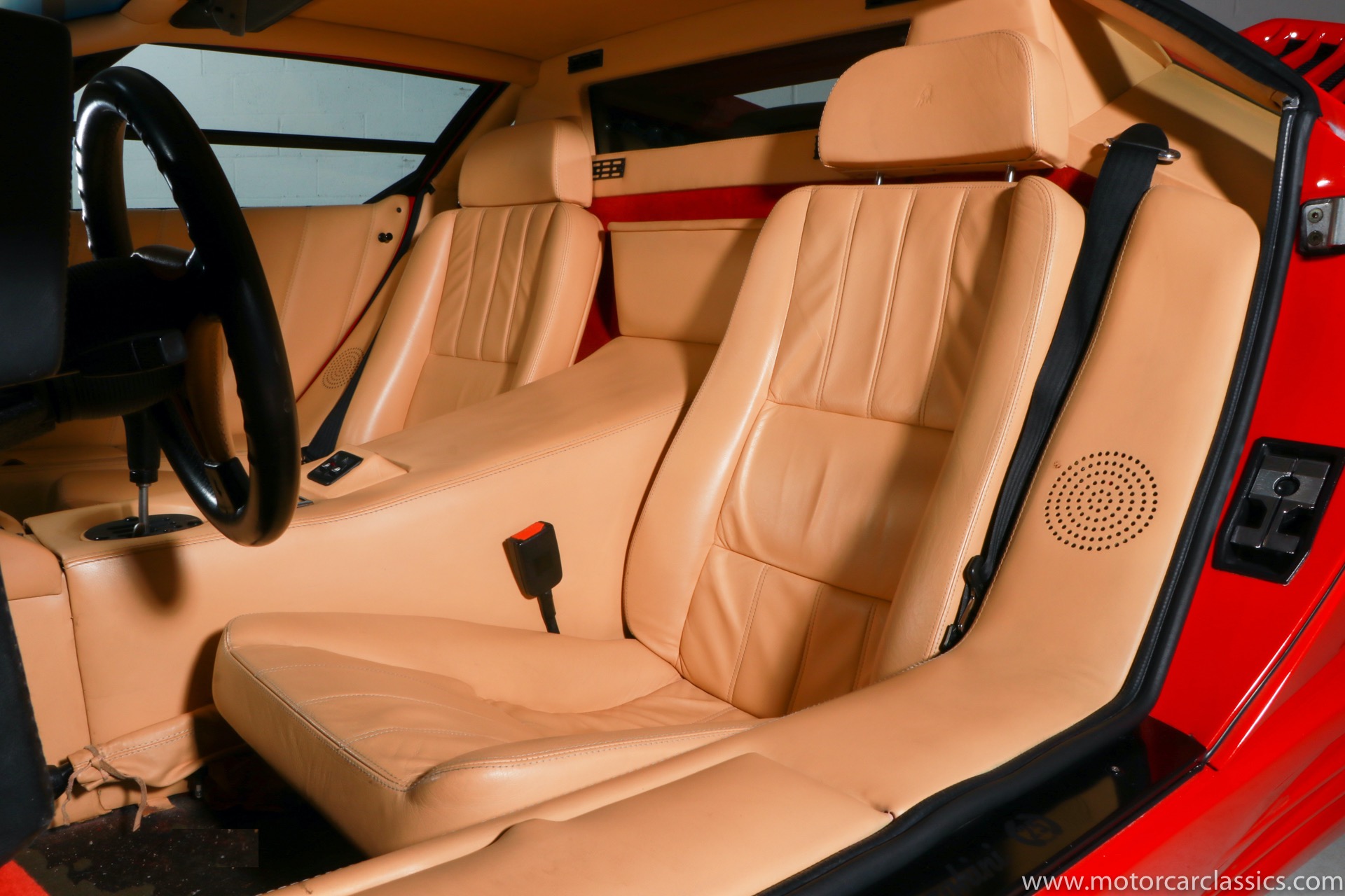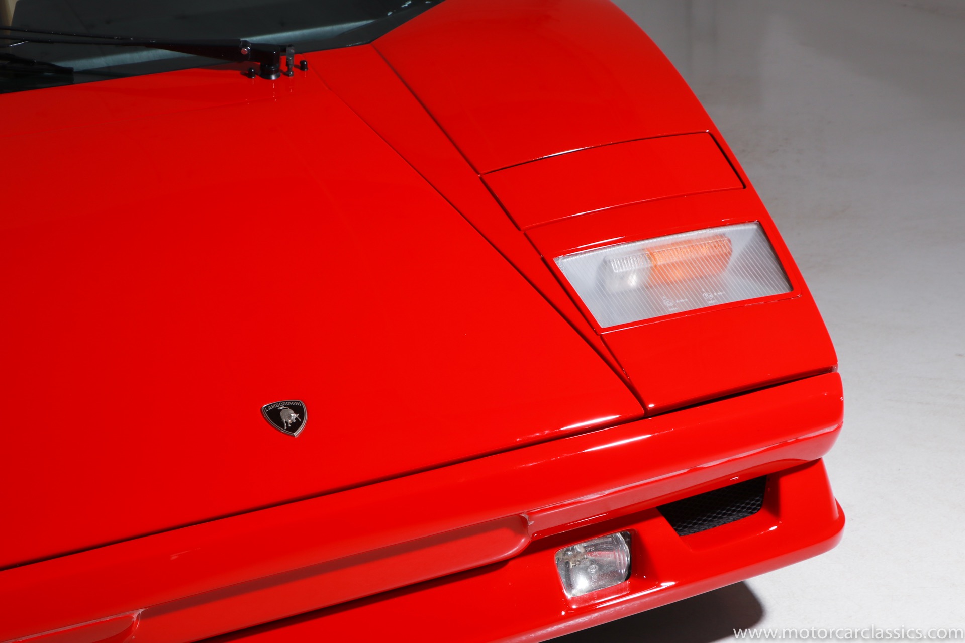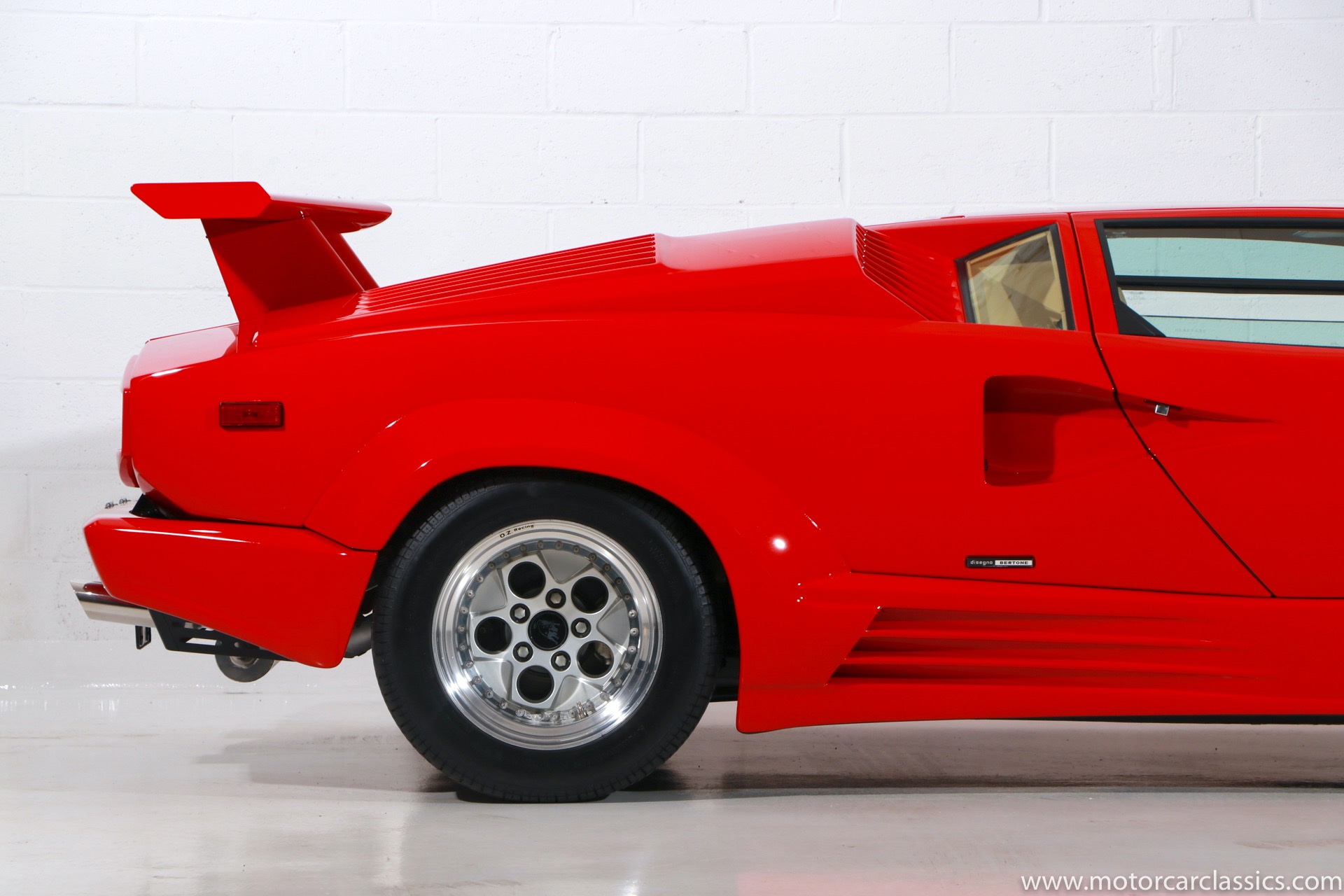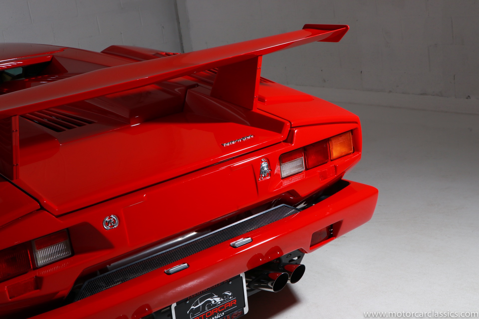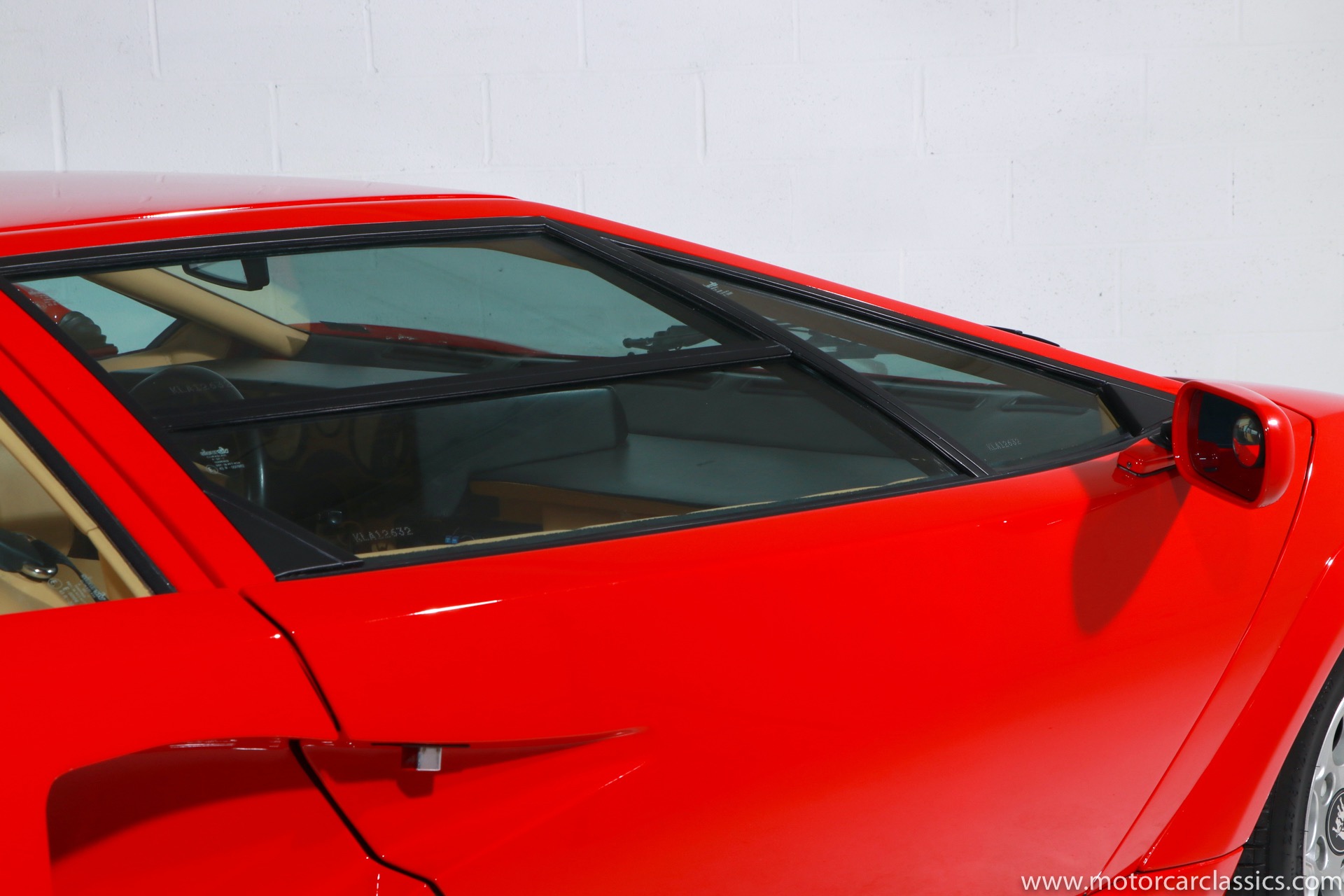 1989 Lamborghini Countach for sale! Motorcar Classics is thrilled to present this stunning 1989 Lamborghini 25th Anniversary Edition Countach featured in red with tan leather interior. For Lamborghinis 25th anniversary, what would be the final and most highly developed edition of the Countach was built in a run of just 657 examples. The car gained new elegance with the addition of a front air dam and completely redesigned engine and cooling intakes that were now integrated into the body lines. New lower body work integrated with the fender flares and blended with a redesigned rear bumper. Repositioning the radiators and using larger fans improved cooling, which was among the most crucial of a wide range of internal improvements. And while the driveline was unchanged, new OZ modular wheels were used and new Pirelli Zero Asymmetrical tires replaced the old P7s. The model is powered by Lamborghinis beautiful 455 HP V-12 with a 5-speed manual gearbox. Ours is a one-owner car from new that has covered only 2,599 miles. It features the optional large rear wing. The car has all-original paint and is in museum condition throughout. Service records are included.