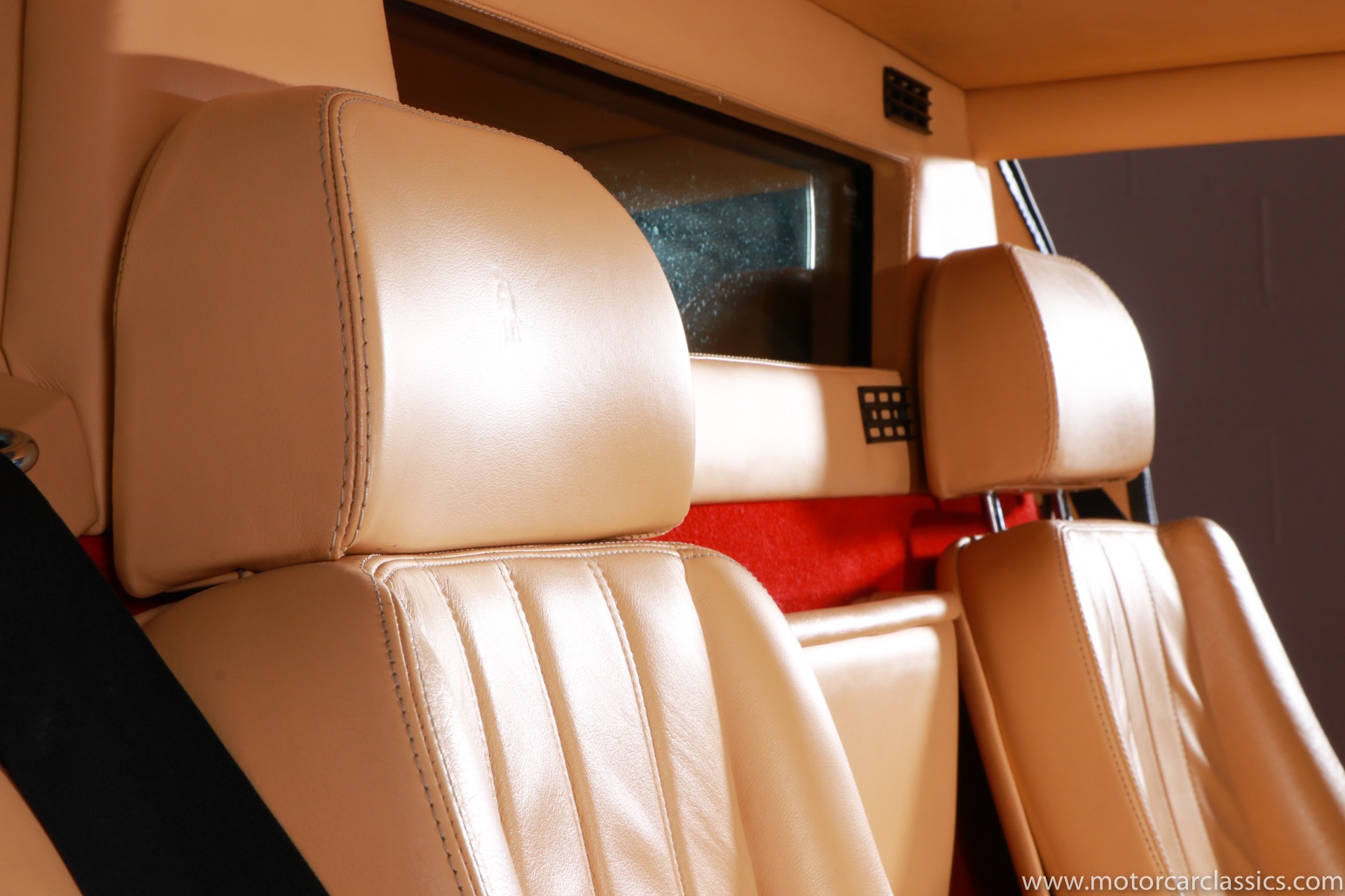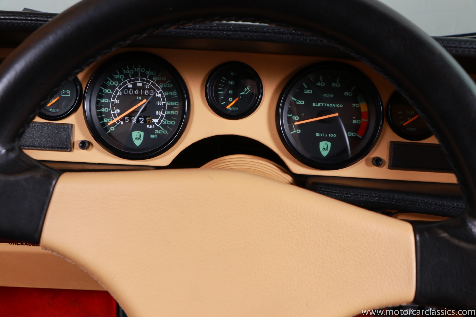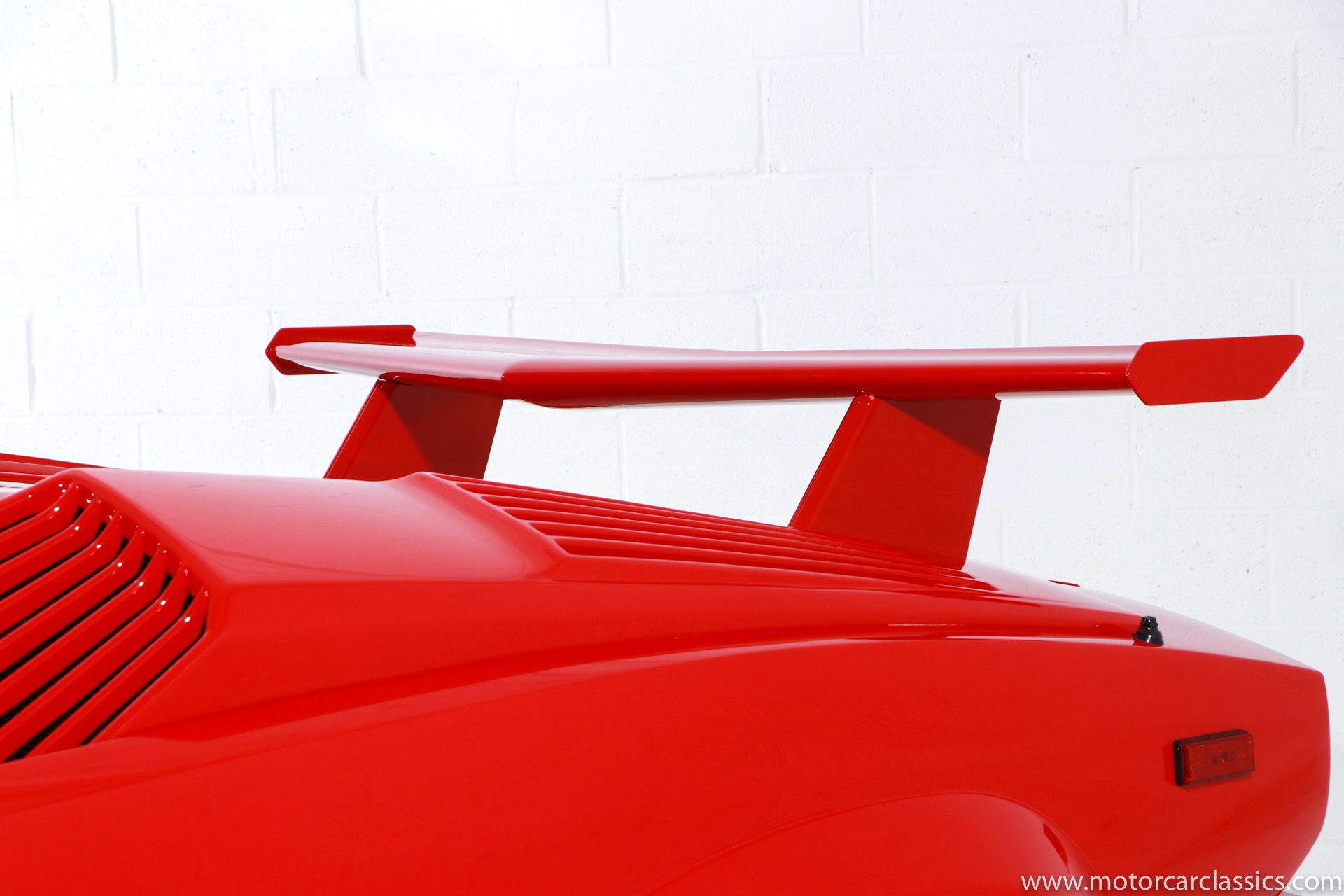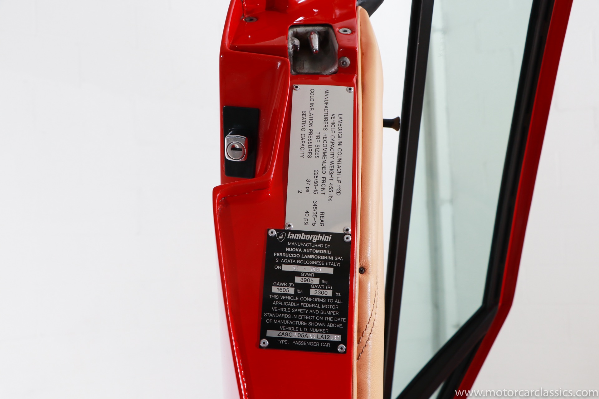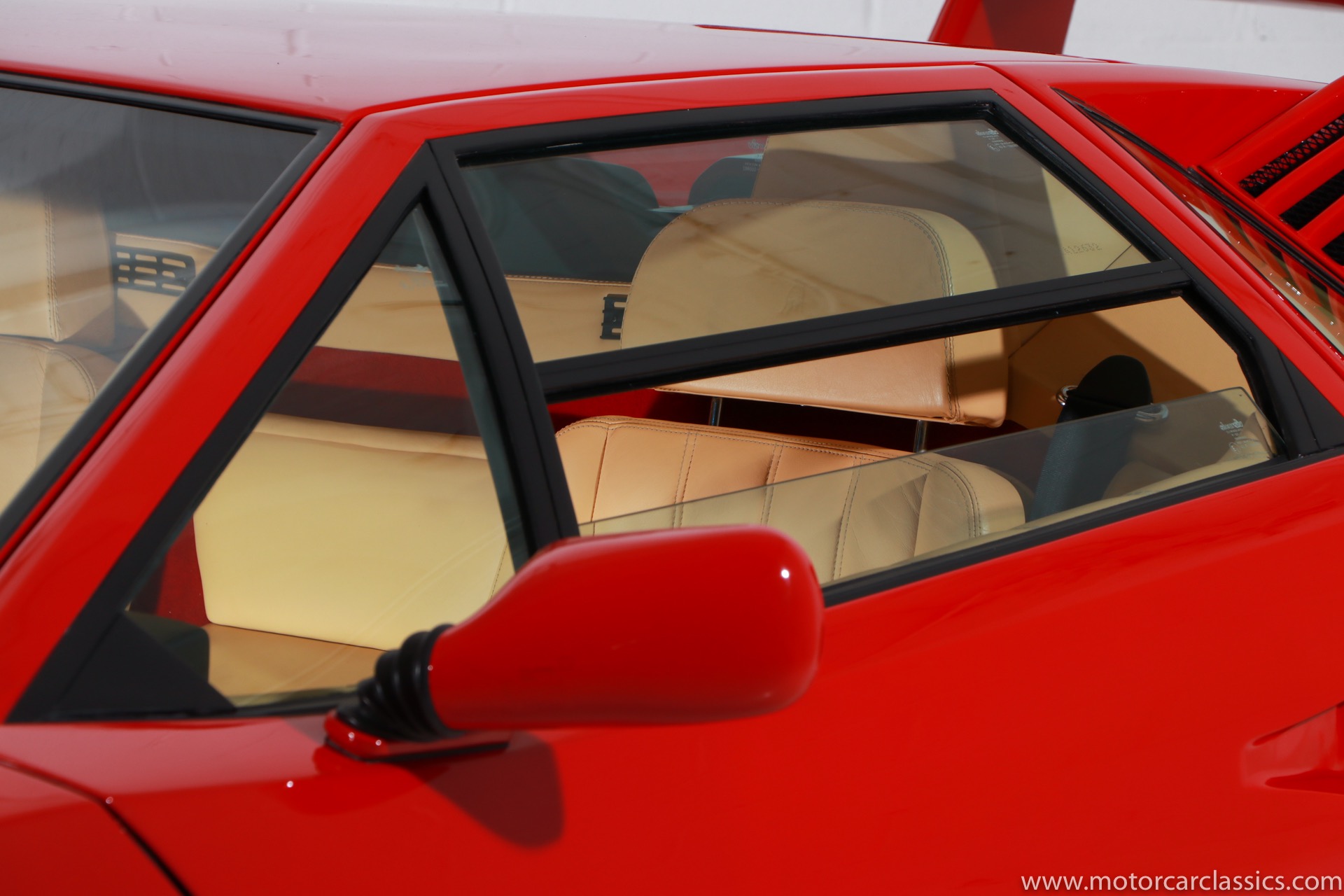 1989 Lamborghini Countach for sale! Motorcar Classics is thrilled to present this stunning 1989 Lamborghini 25th Anniversary Edition Countach featured in red with tan leather interior. For Lamborghinis 25th anniversary, what would be the final and most highly developed edition of the Countach was built in a run of just 657 examples. The car gained new elegance with the addition of a front air dam and completely redesigned engine and cooling intakes that were now integrated into the body lines. New lower body work integrated with the fender flares and blended with a redesigned rear bumper. Repositioning the radiators and using larger fans improved cooling, which was among the most crucial of a wide range of internal improvements. And while the driveline was unchanged, new OZ modular wheels were used and new Pirelli Zero Asymmetrical tires replaced the old P7s. The model is powered by Lamborghinis beautiful 455 HP V-12 with a 5-speed manual gearbox. Ours is a one-owner car from new that has covered only 2,599 miles. It features the optional large rear wing. The car has all-original paint and is in museum condition throughout. Service records are included.