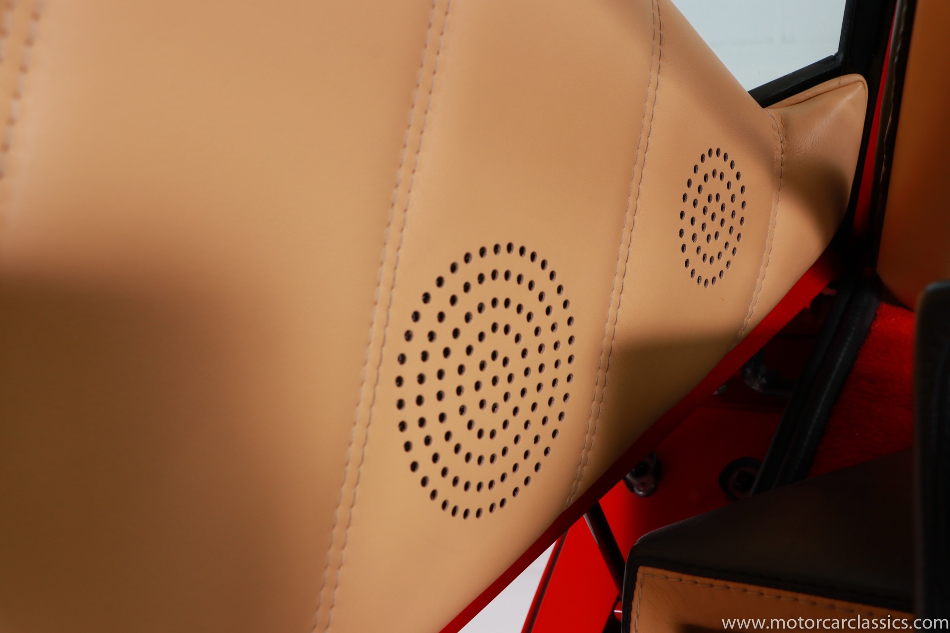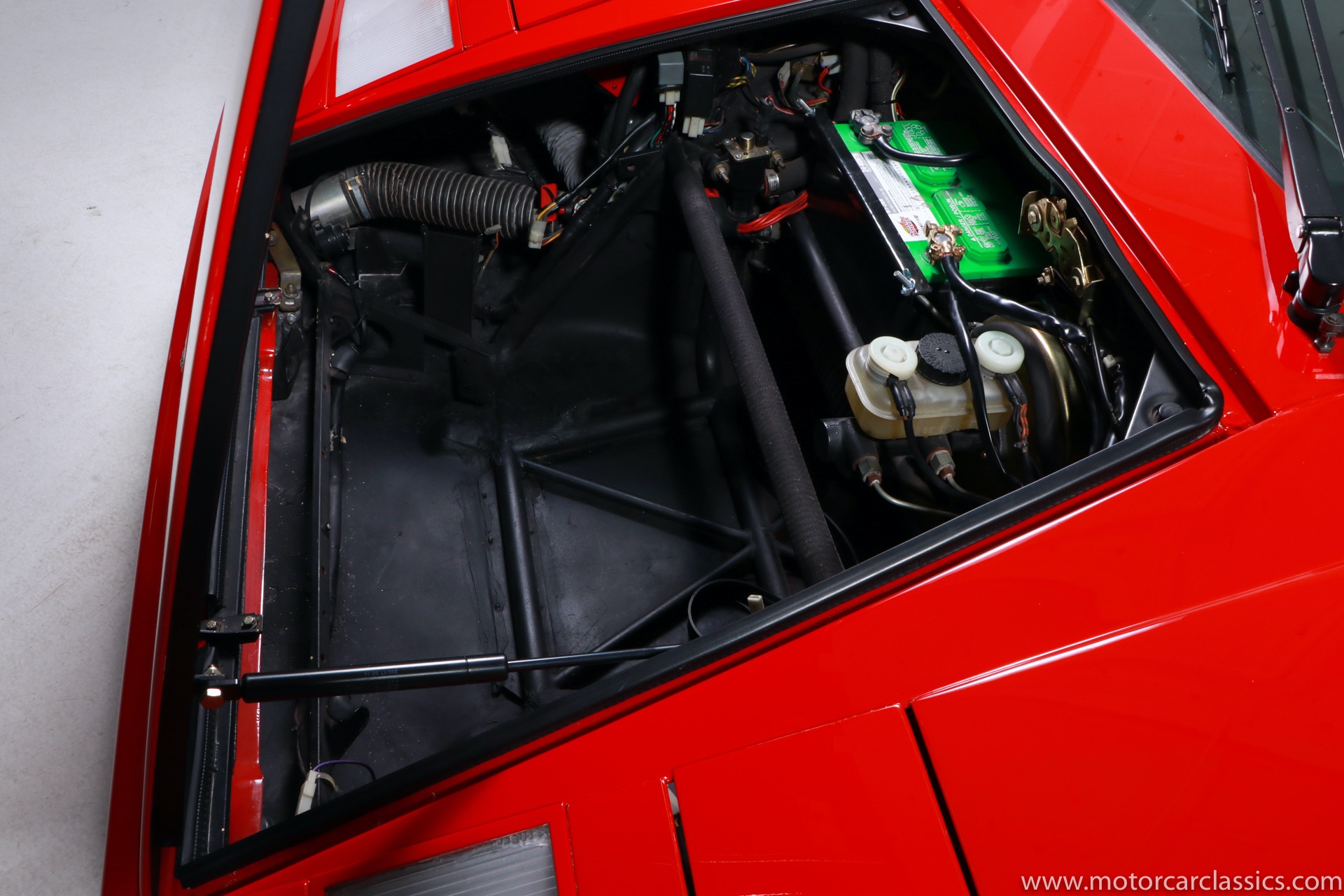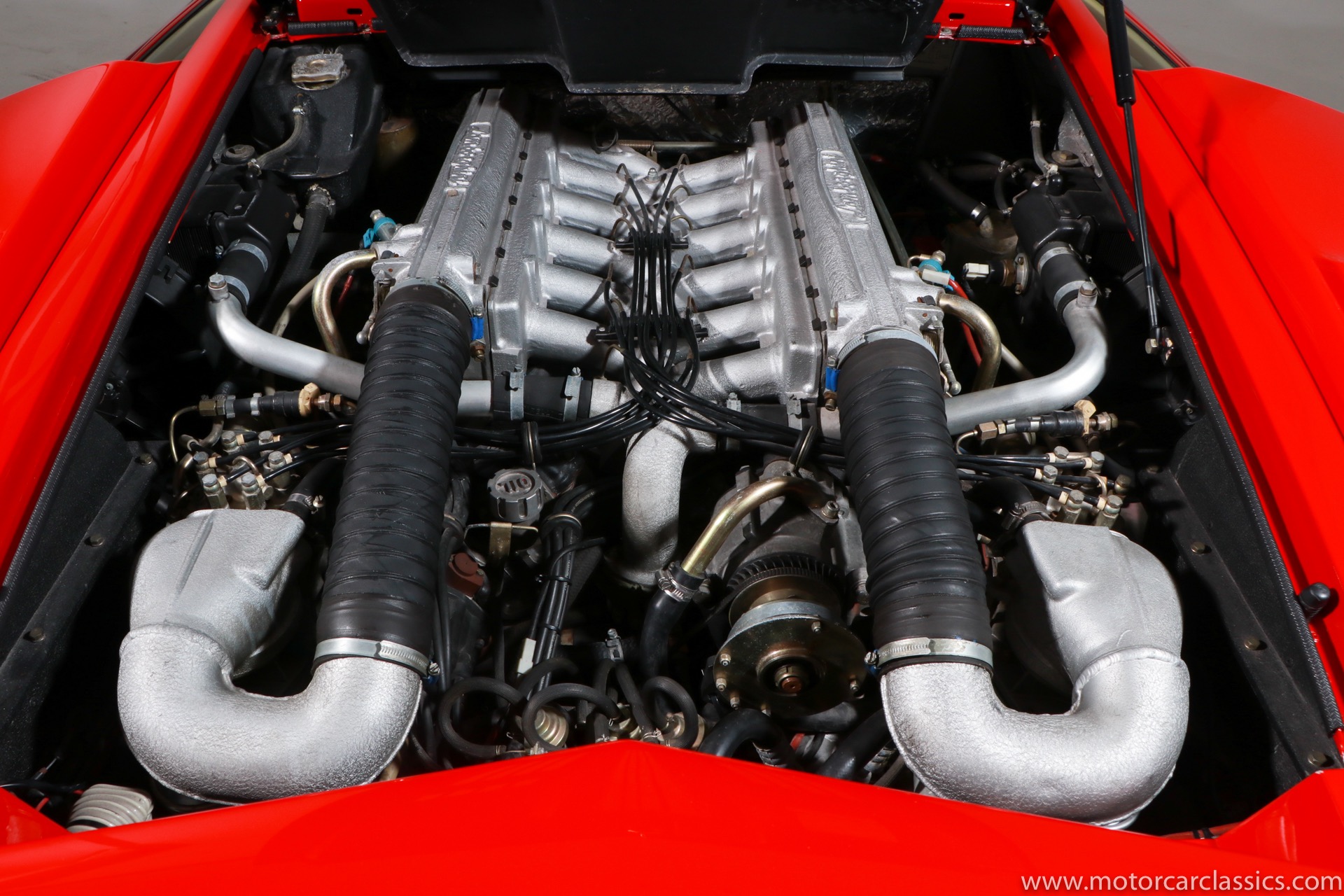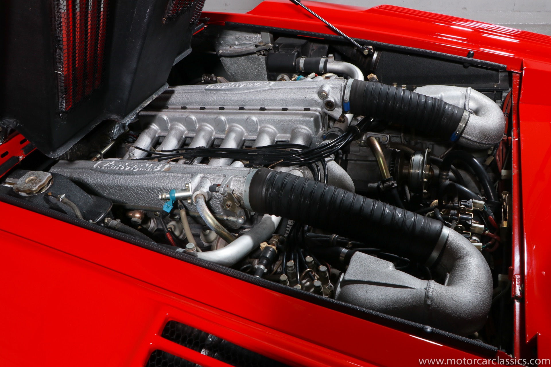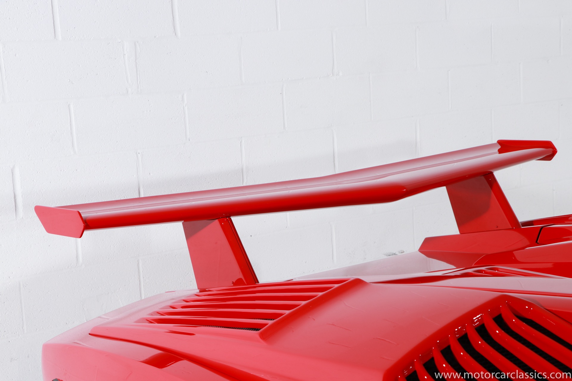 1989 Lamborghini Countach for sale! Motorcar Classics is thrilled to present this stunning 1989 Lamborghini 25th Anniversary Edition Countach featured in red with tan leather interior. For Lamborghinis 25th anniversary, what would be the final and most highly developed edition of the Countach was built in a run of just 657 examples. The car gained new elegance with the addition of a front air dam and completely redesigned engine and cooling intakes that were now integrated into the body lines. New lower body work integrated with the fender flares and blended with a redesigned rear bumper. Repositioning the radiators and using larger fans improved cooling, which was among the most crucial of a wide range of internal improvements. And while the driveline was unchanged, new OZ modular wheels were used and new Pirelli Zero Asymmetrical tires replaced the old P7s. The model is powered by Lamborghinis beautiful 455 HP V-12 with a 5-speed manual gearbox. Ours is a one-owner car from new that has covered only 2,599 miles. It features the optional large rear wing. The car has all-original paint and is in museum condition throughout. Service records are included.