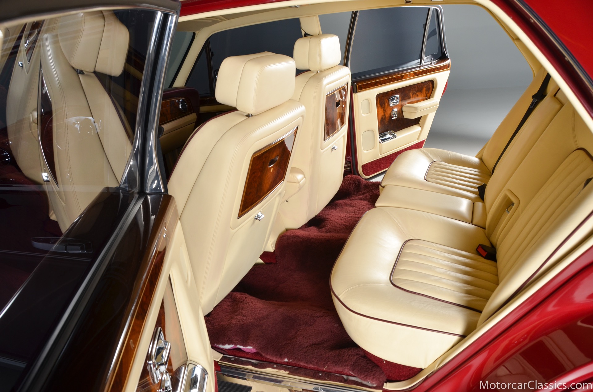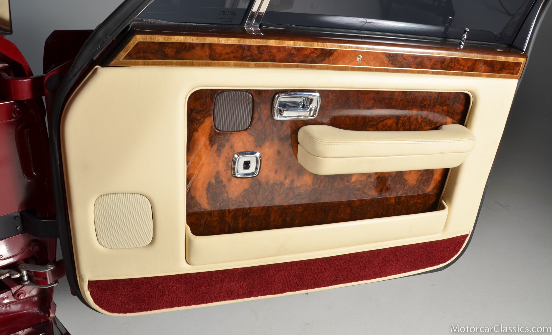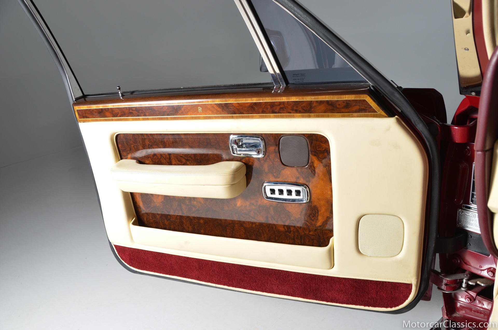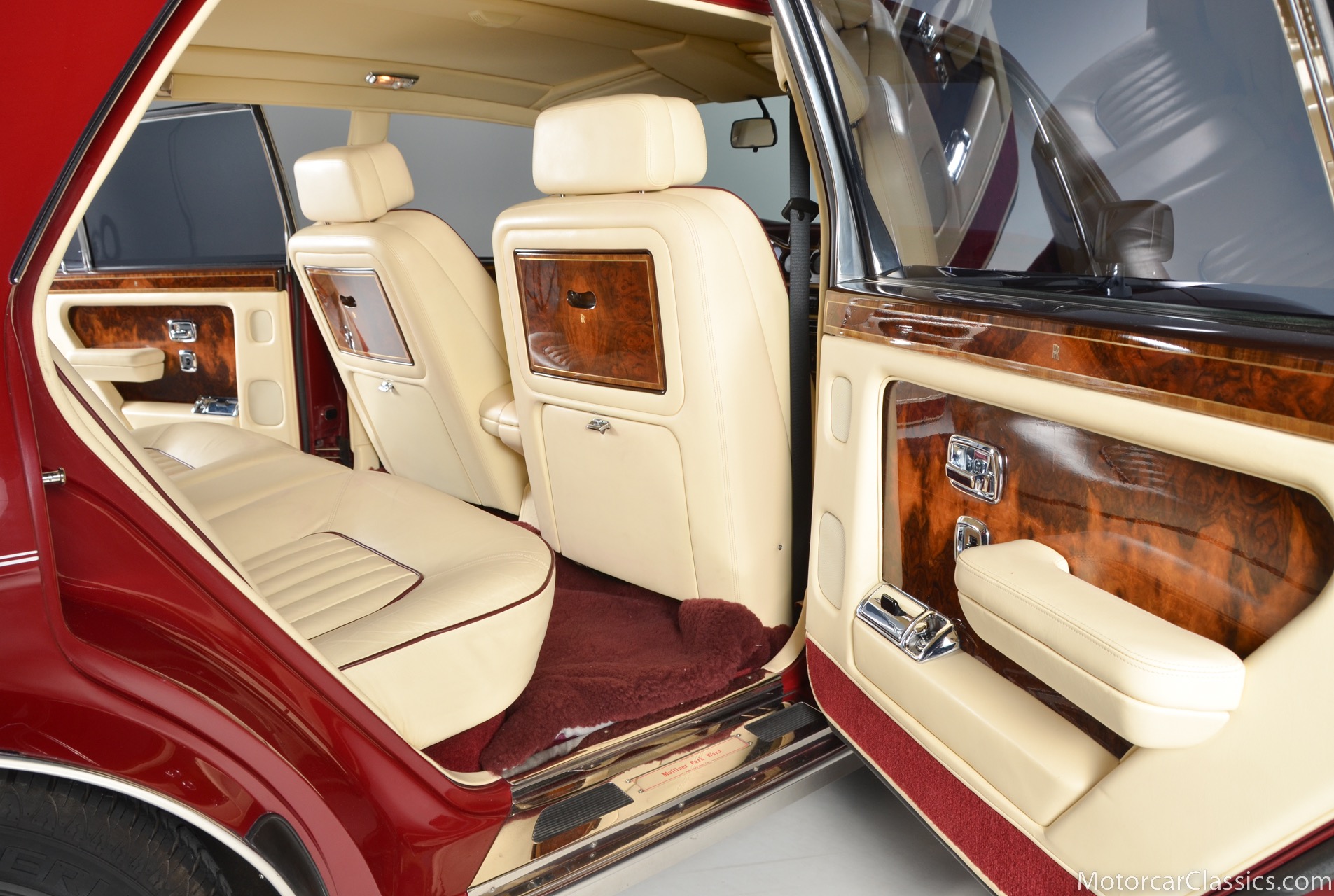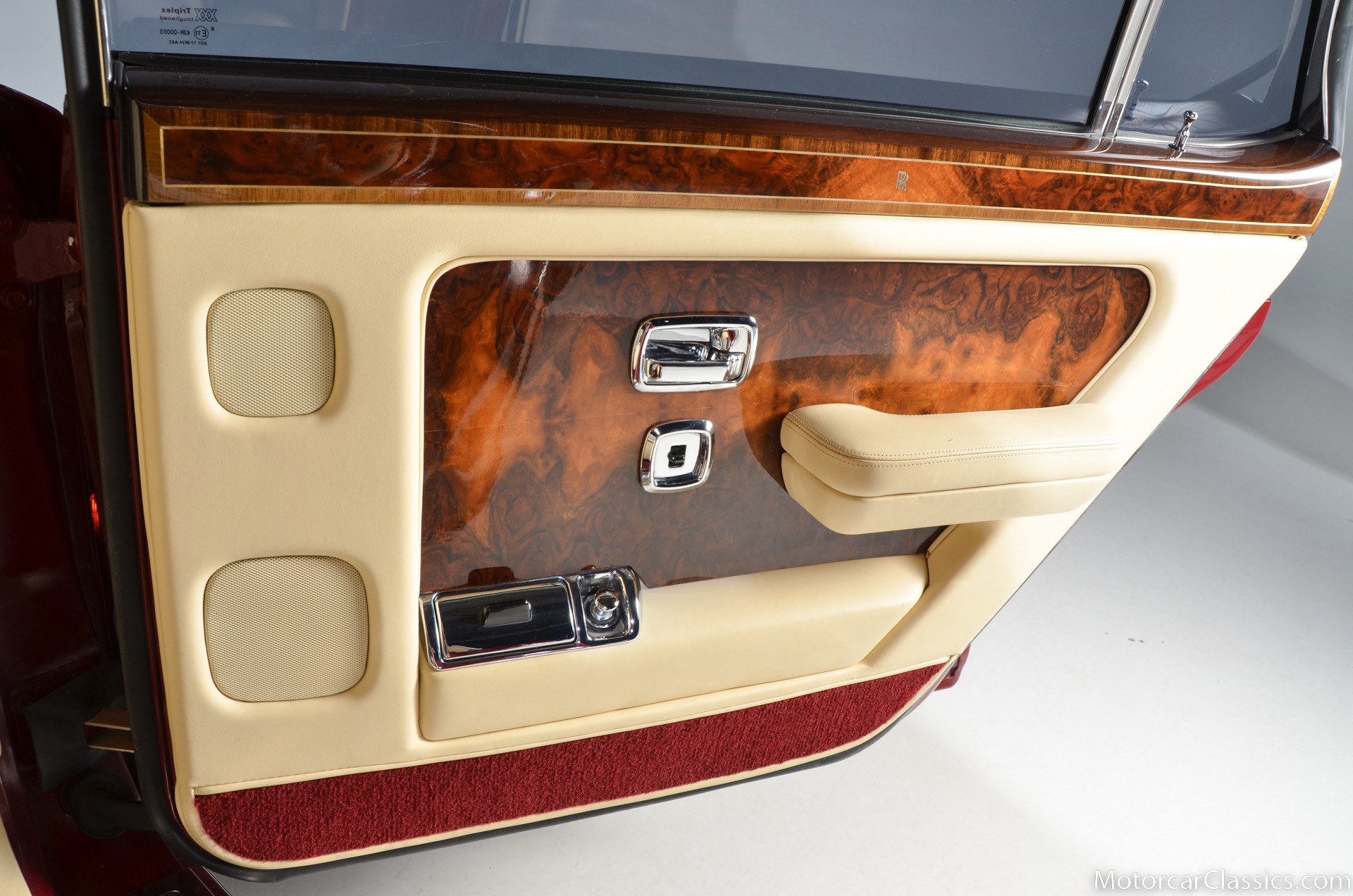 All of these MPW edition cars are finished in Bordeaux red without the Everflex roof. The bumpers and headlight surrounds are color-coded, polished stainless steel bumper inserts, stainless steel body trim running the entire length of the body sills and continuing around both wheel arches and along the lower portions of the rear wings, twin magnolia coachlines, chrome badge bar mounted on the front bumper, unique badge on the boot lid proclaiming the car's coachbuilding lineage, specially selected American burr walnut veneers, and complemented by silver inlays and Rolls-Royce monograms.