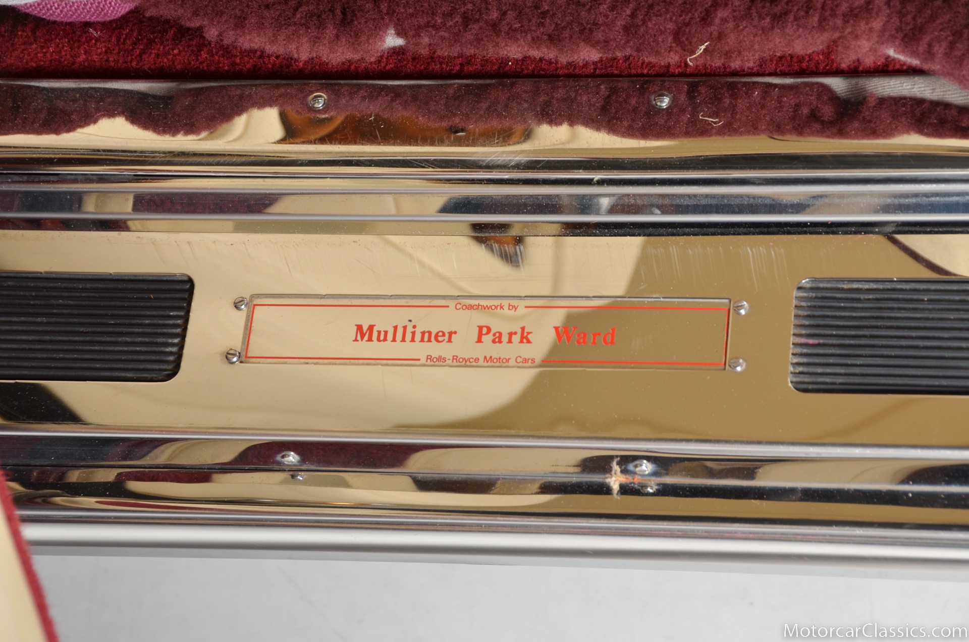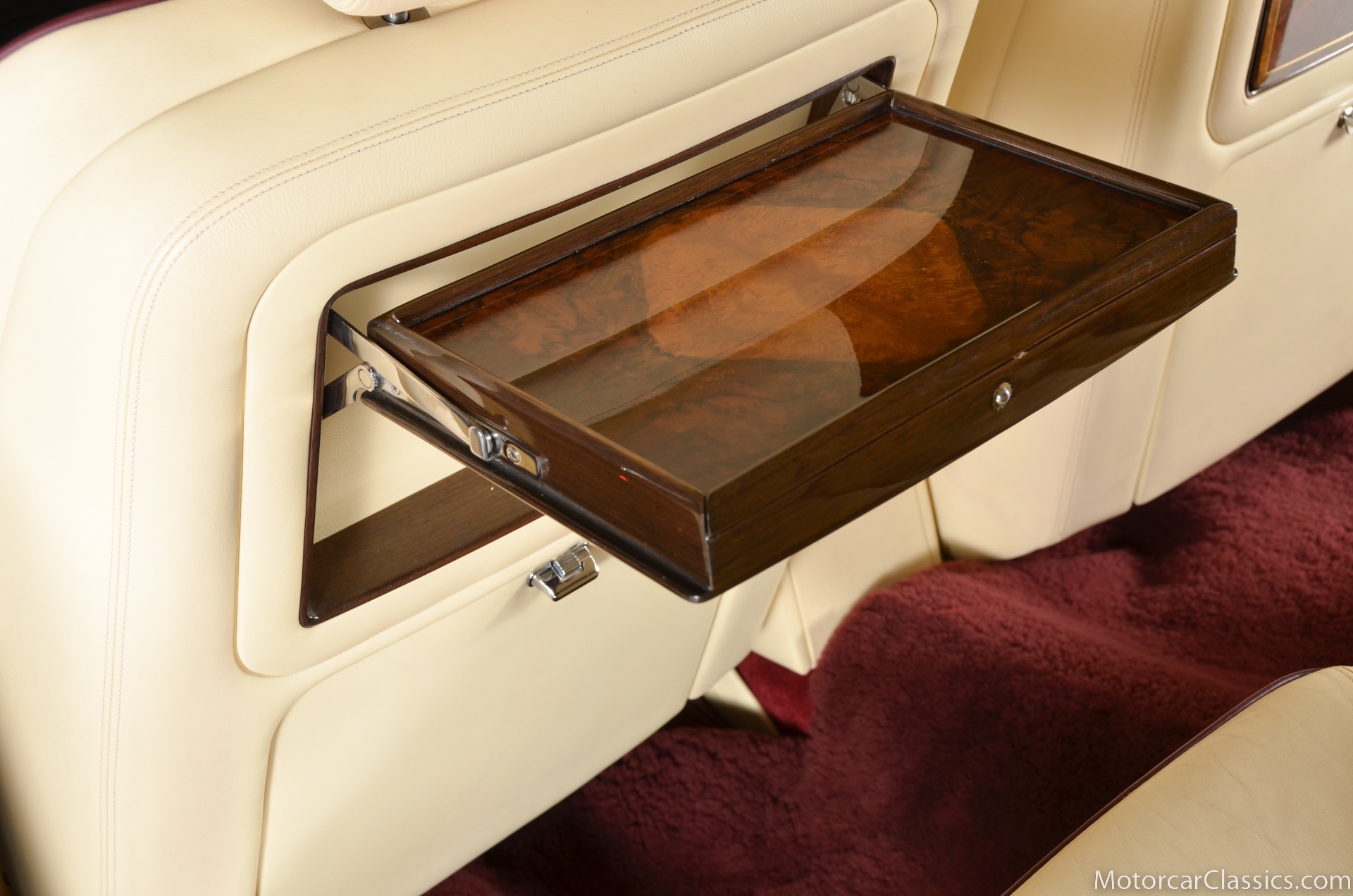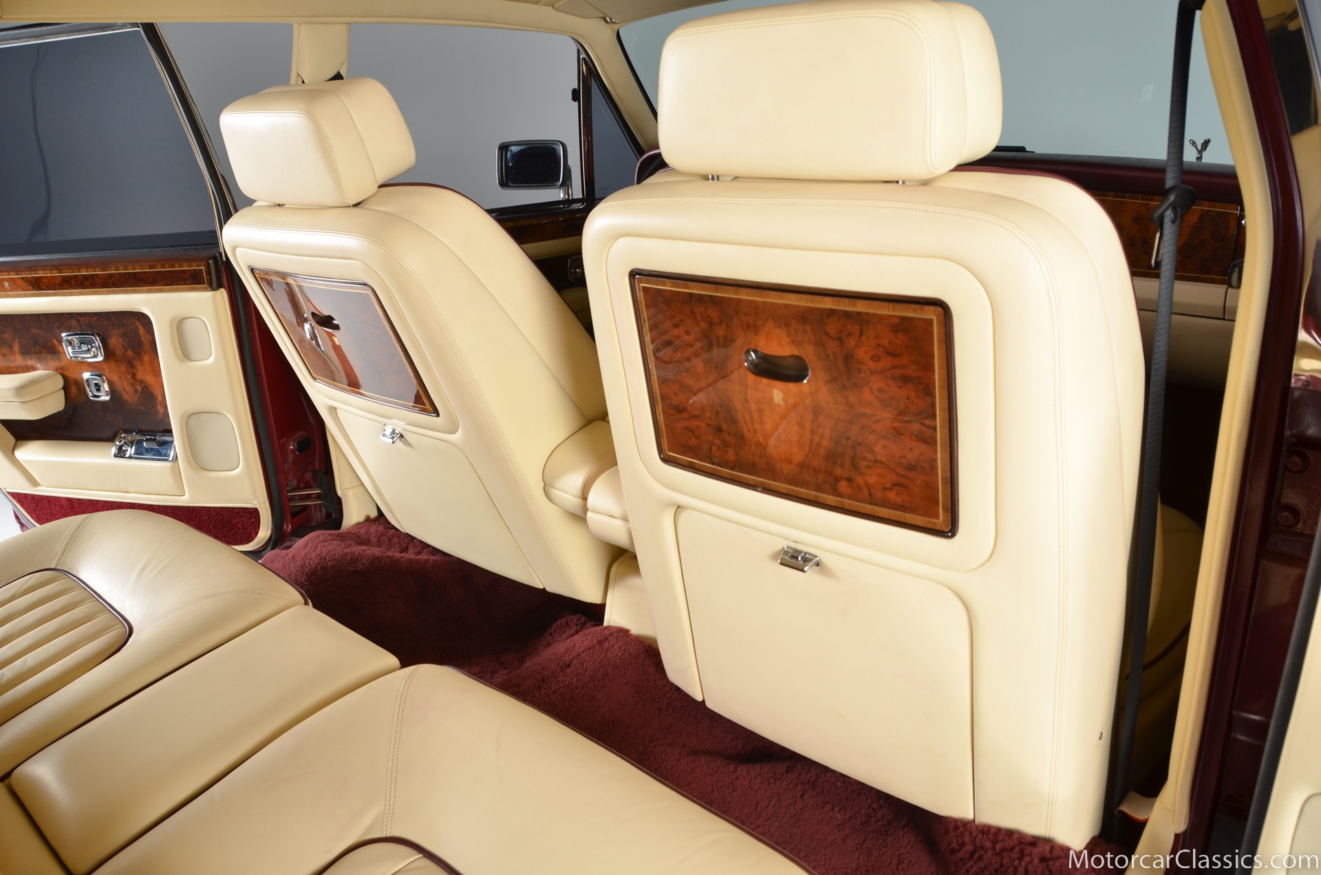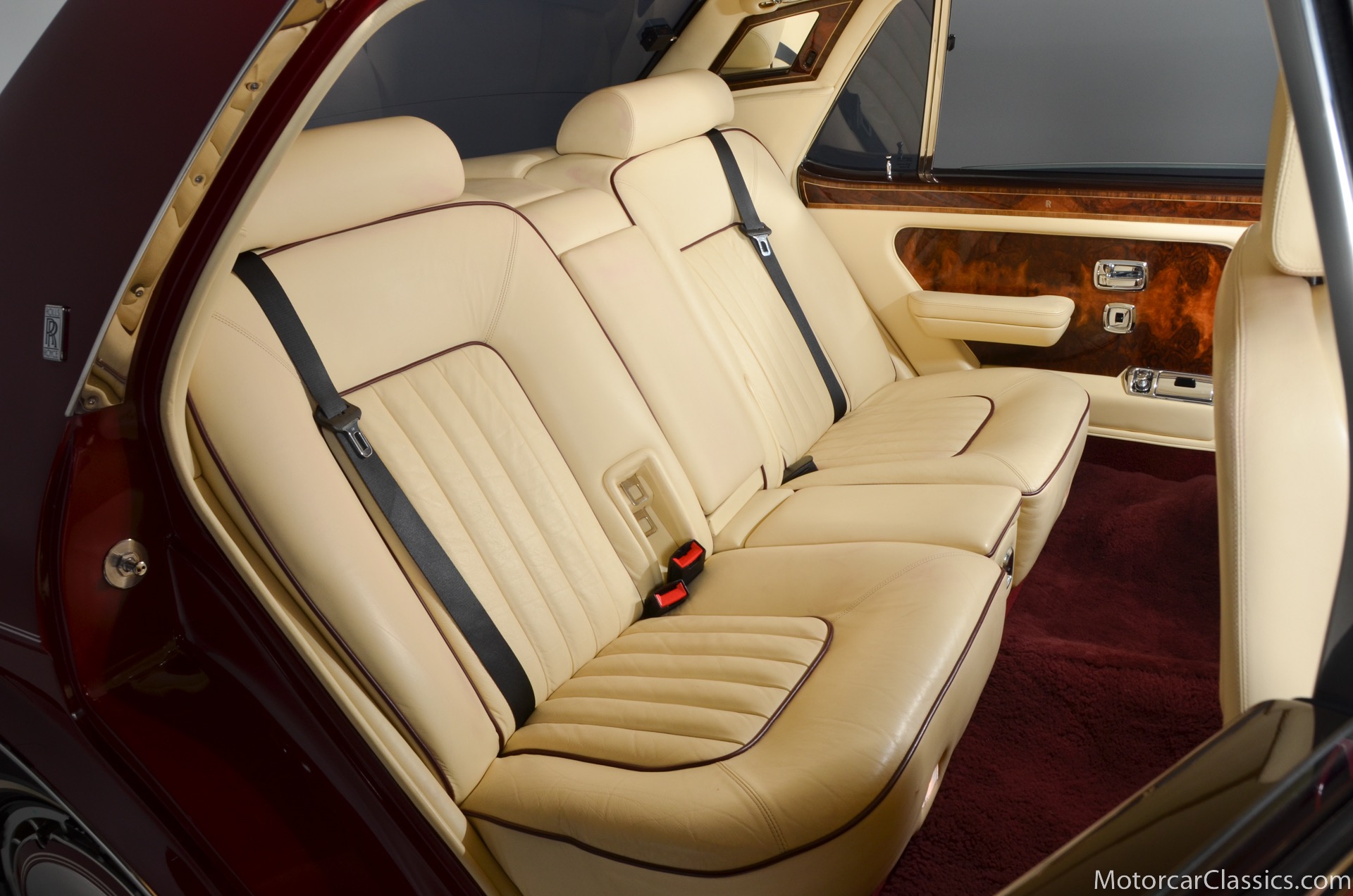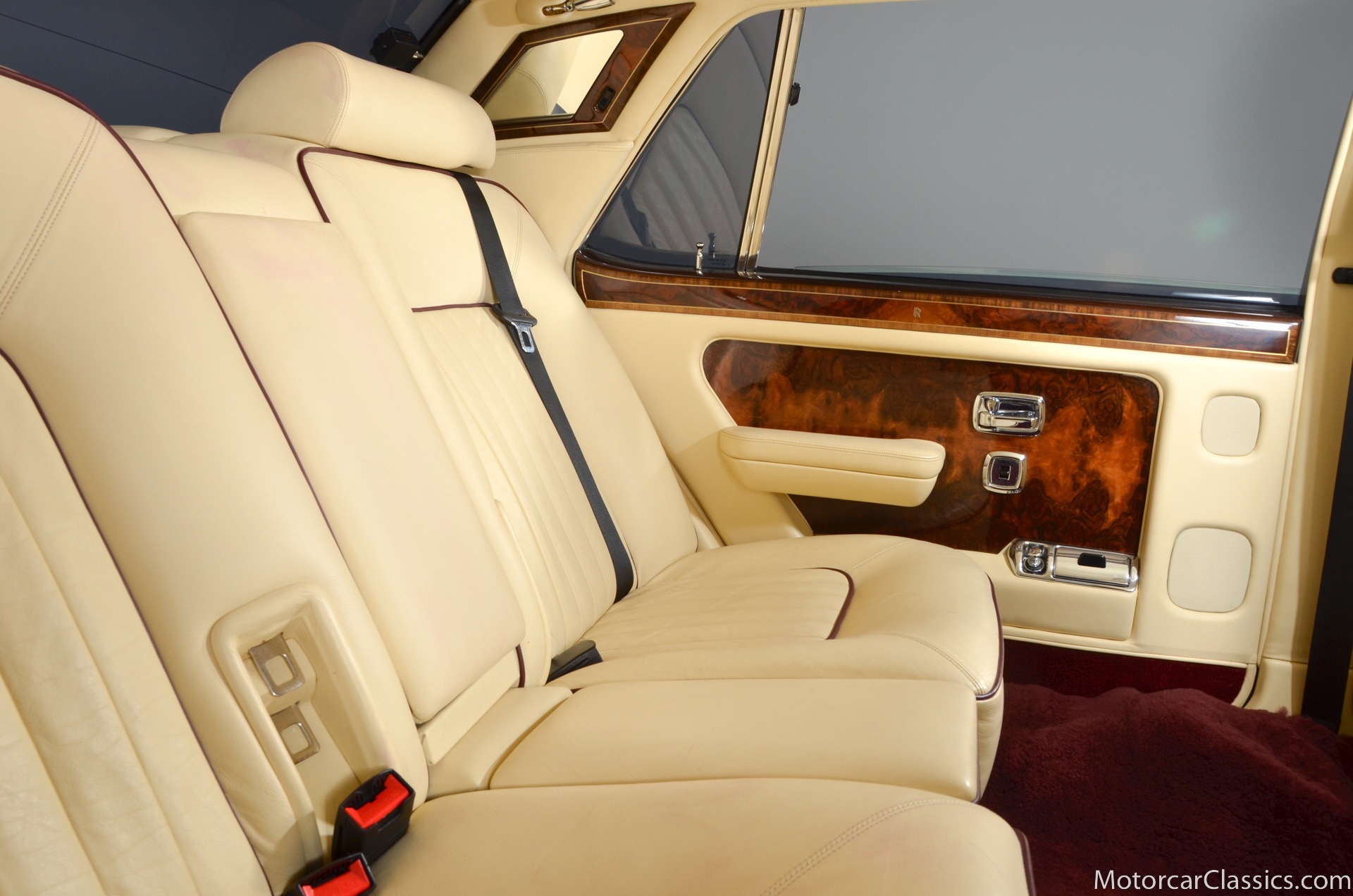 All of these MPW edition cars are finished in Bordeaux red without the Everflex roof. The bumpers and headlight surrounds are color-coded, polished stainless steel bumper inserts, stainless steel body trim running the entire length of the body sills and continuing around both wheel arches and along the lower portions of the rear wings, twin magnolia coachlines, chrome badge bar mounted on the front bumper, unique badge on the boot lid proclaiming the car's coachbuilding lineage, specially selected American burr walnut veneers, and complemented by silver inlays and Rolls-Royce monograms.