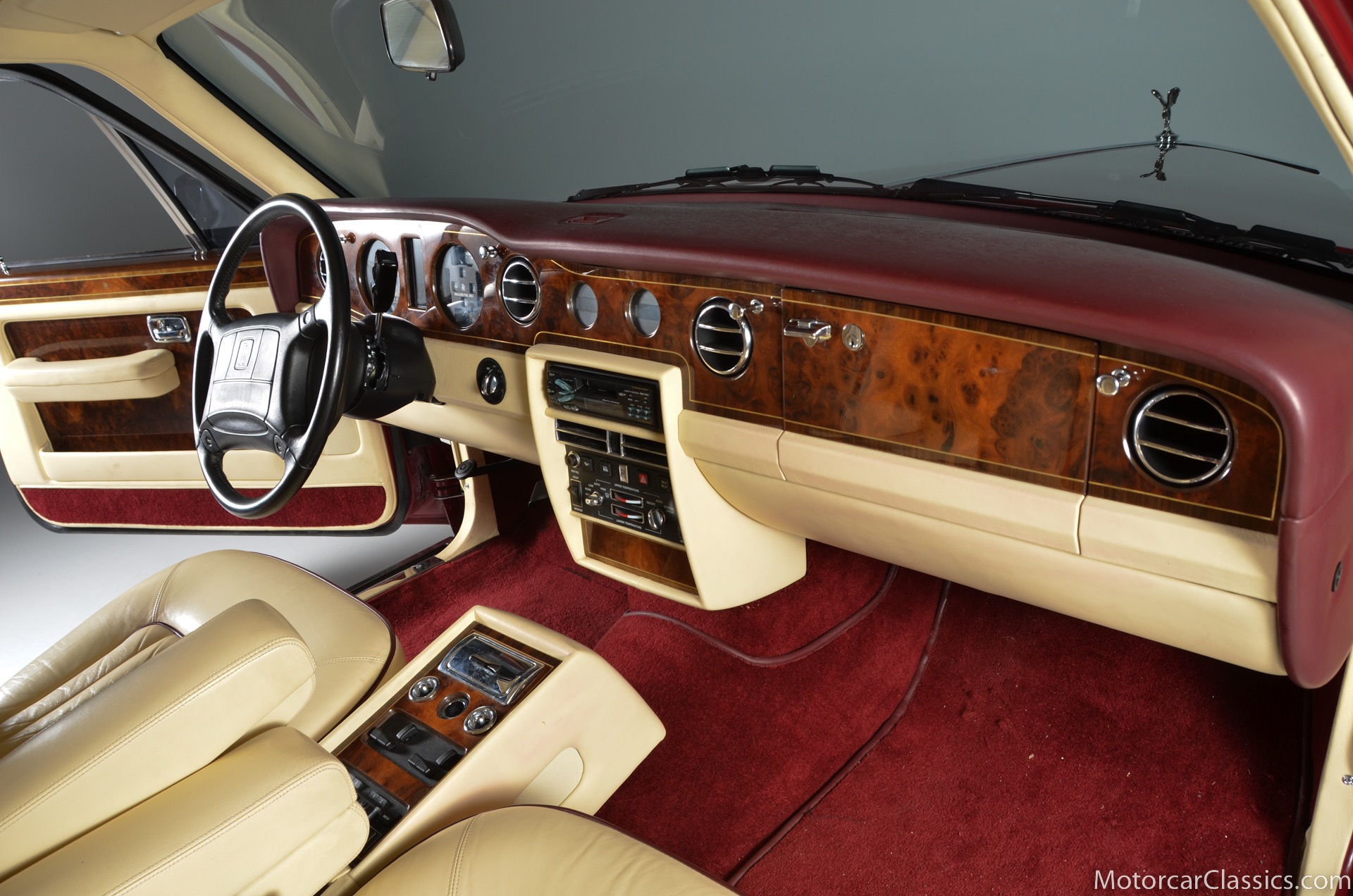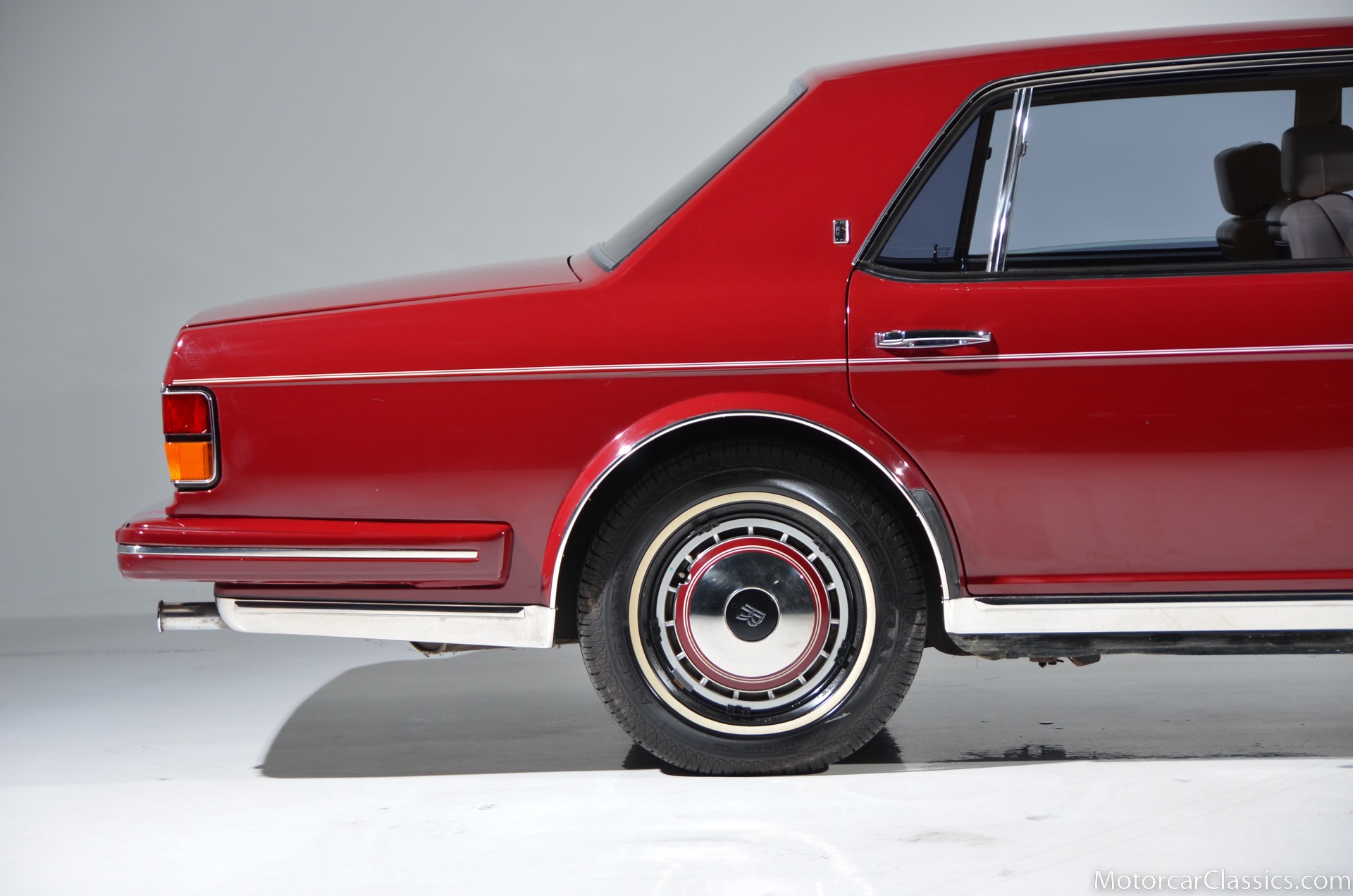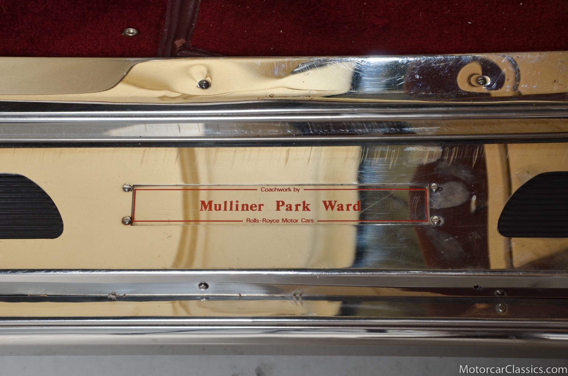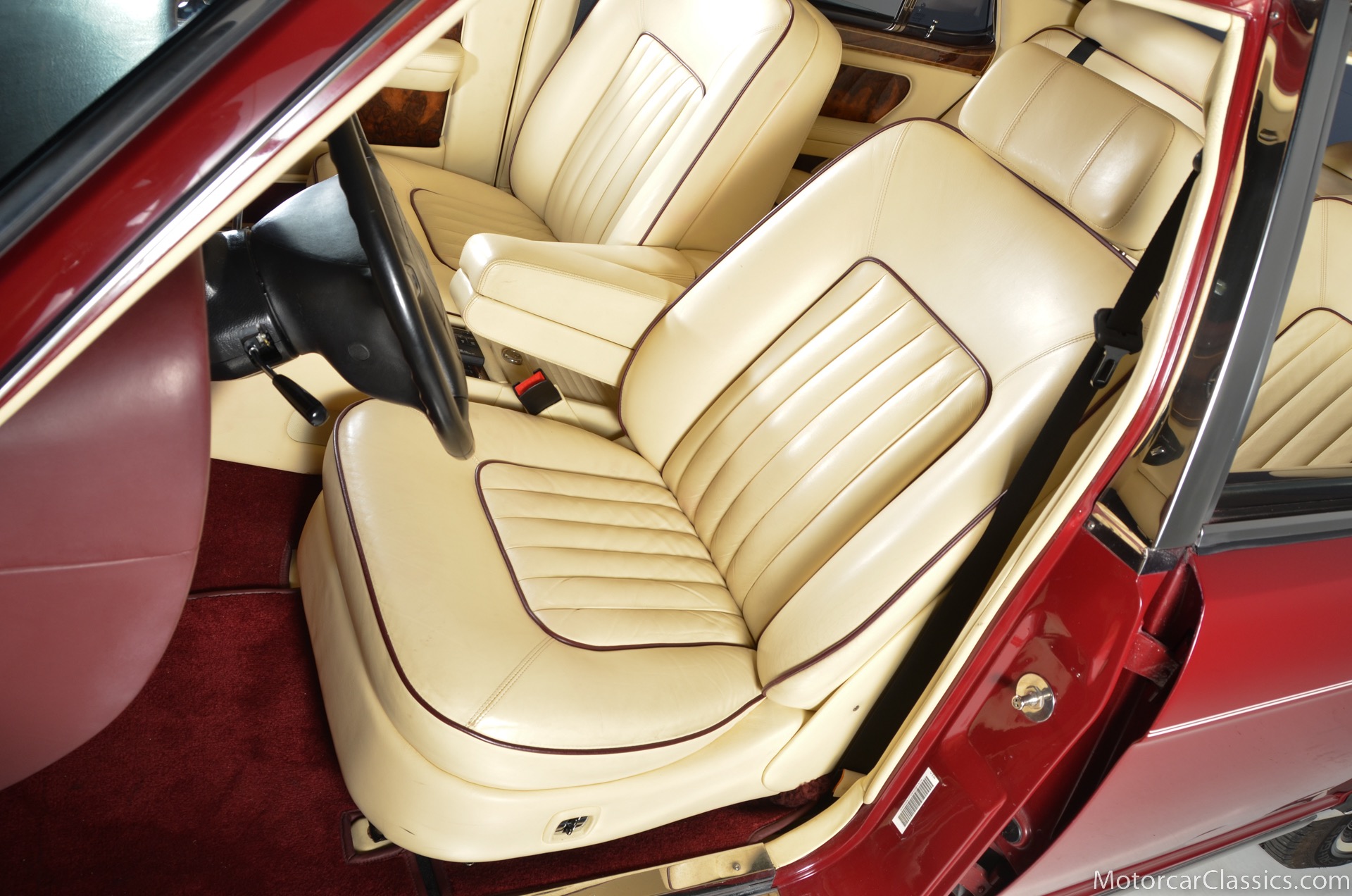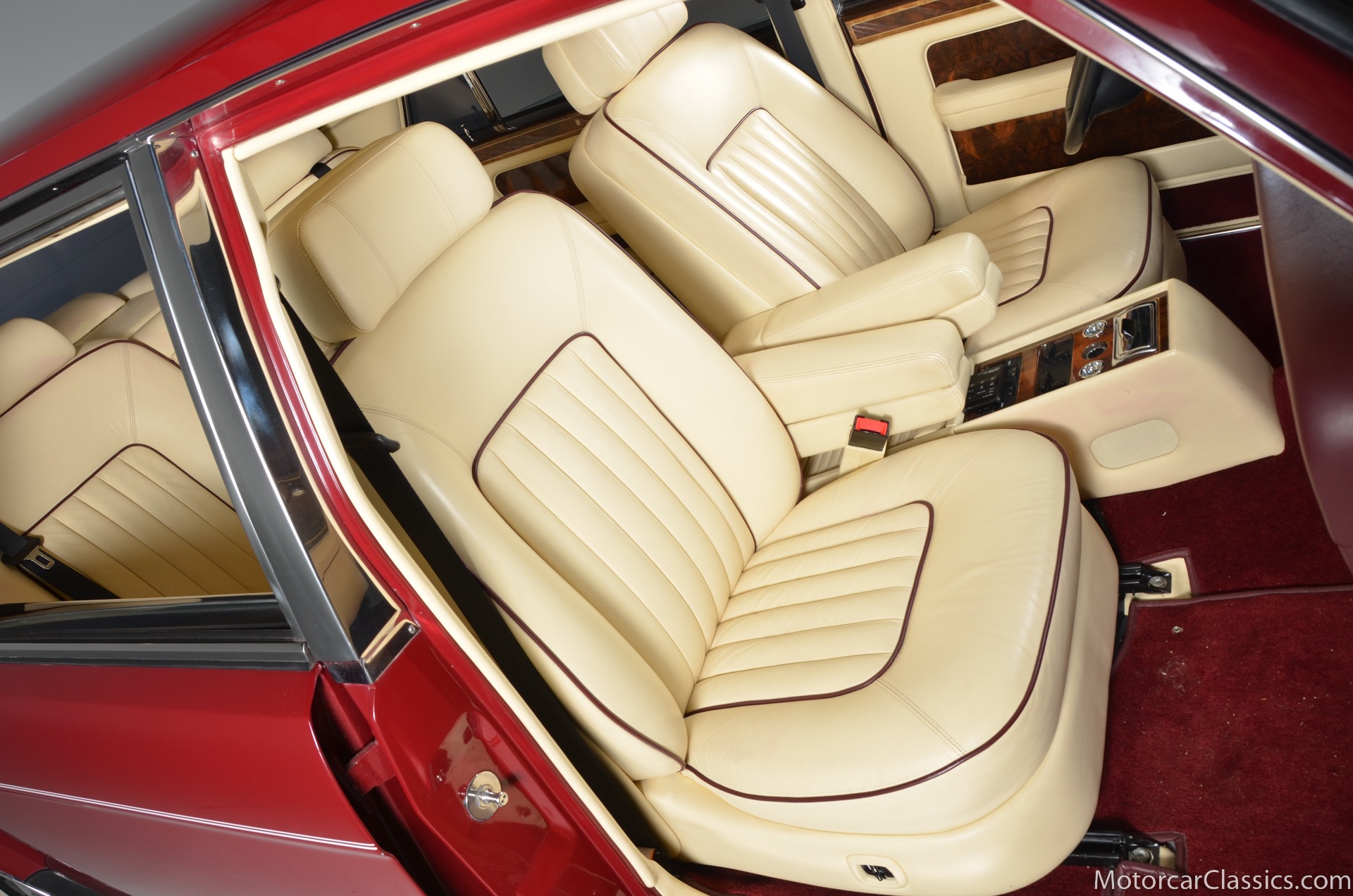 All of these MPW edition cars are finished in Bordeaux red without the Everflex roof. The bumpers and headlight surrounds are color-coded, polished stainless steel bumper inserts, stainless steel body trim running the entire length of the body sills and continuing around both wheel arches and along the lower portions of the rear wings, twin magnolia coachlines, chrome badge bar mounted on the front bumper, unique badge on the boot lid proclaiming the car's coachbuilding lineage, specially selected American burr walnut veneers, and complemented by silver inlays and Rolls-Royce monograms.