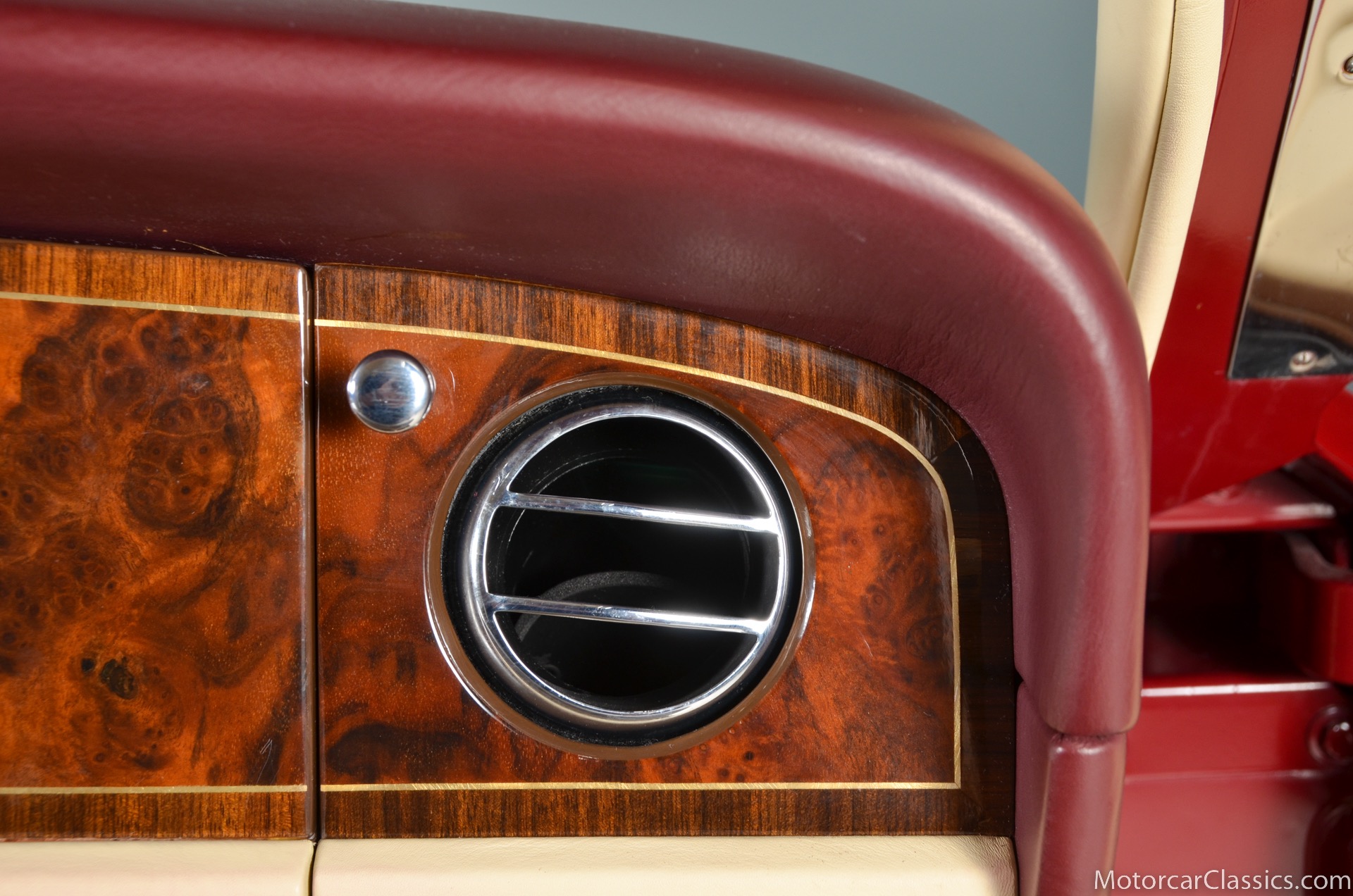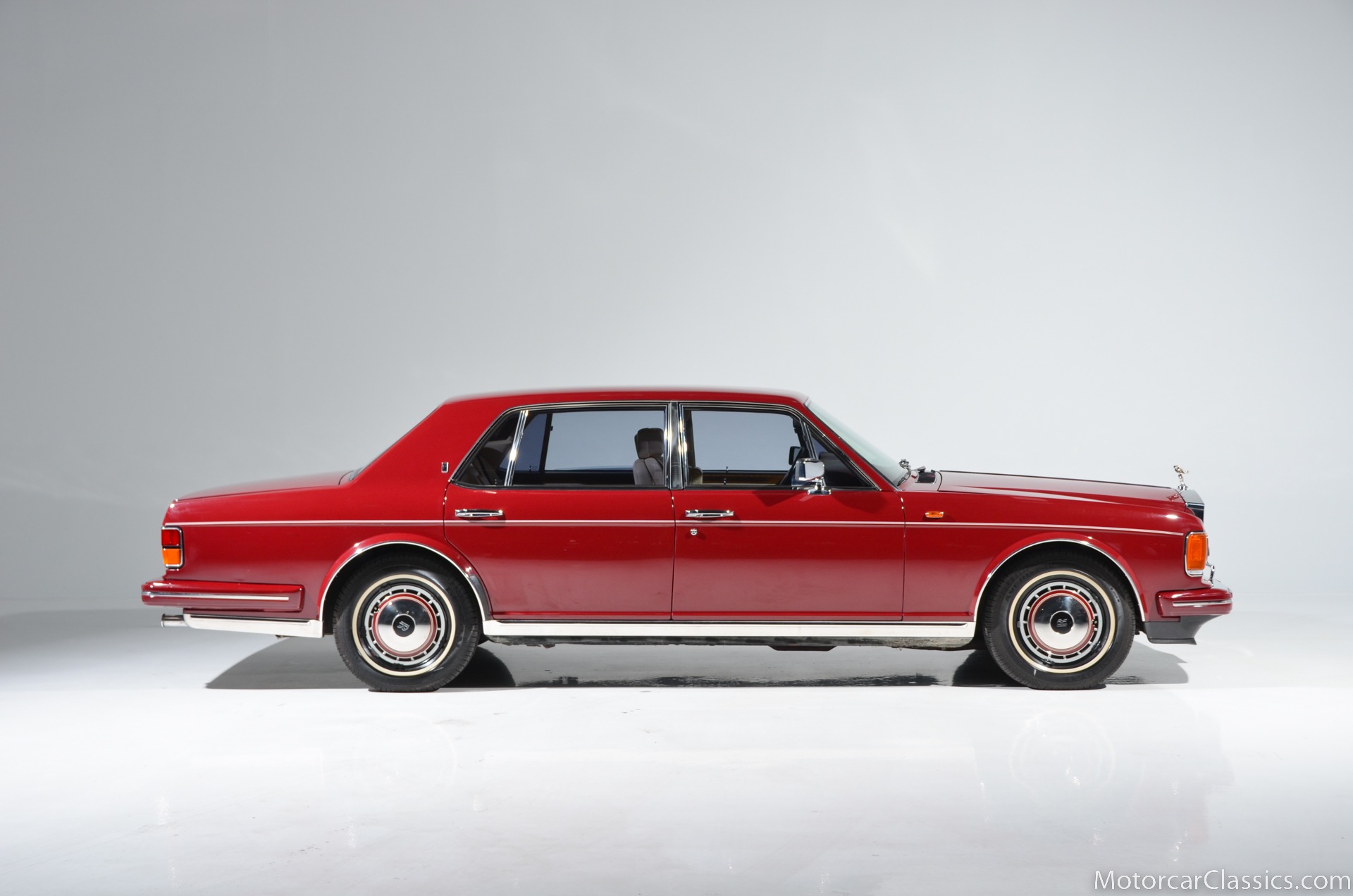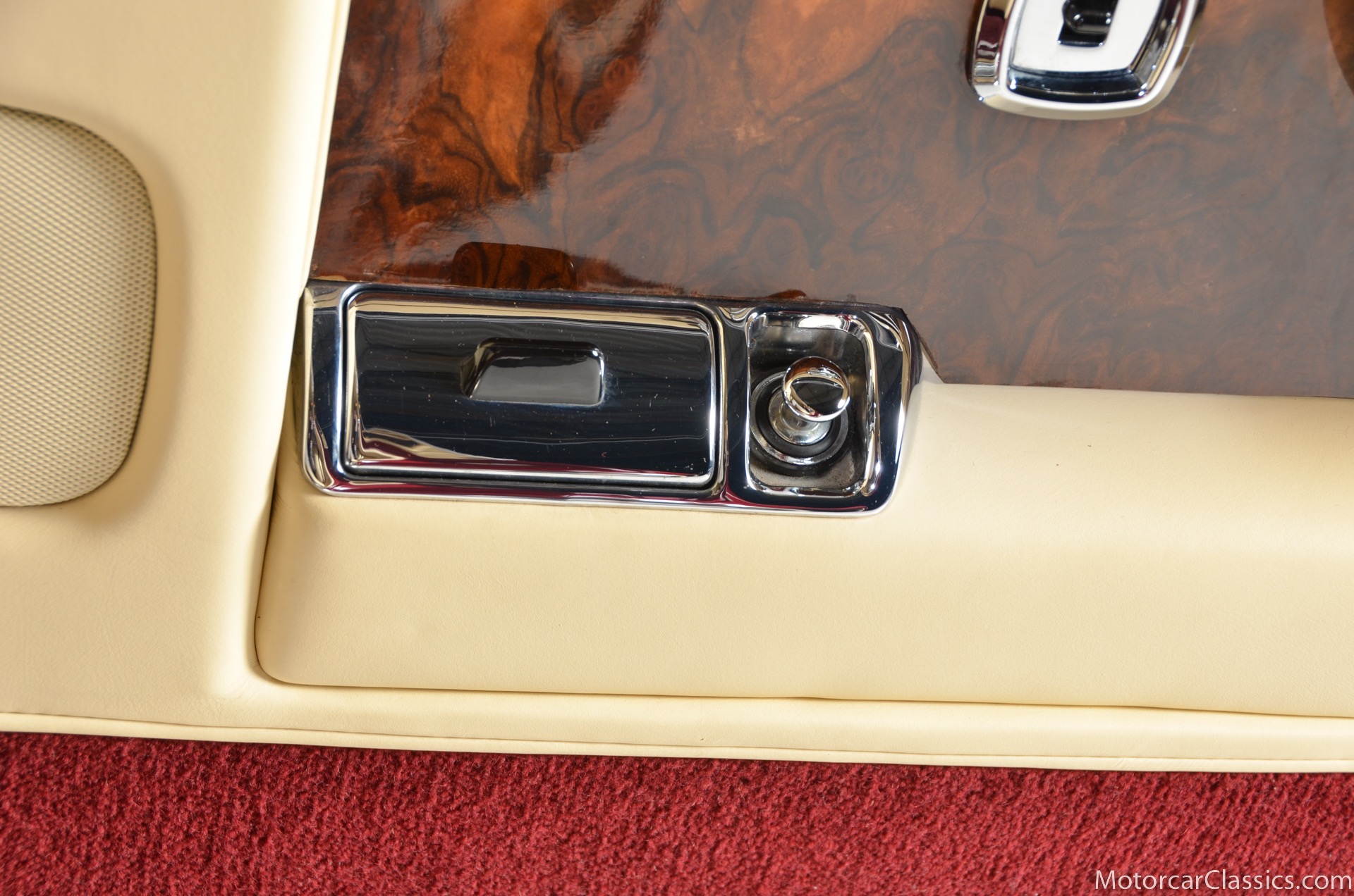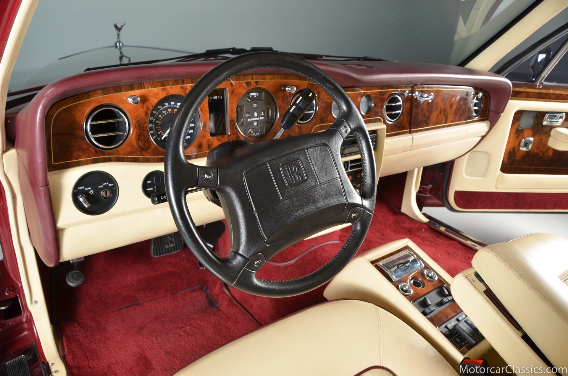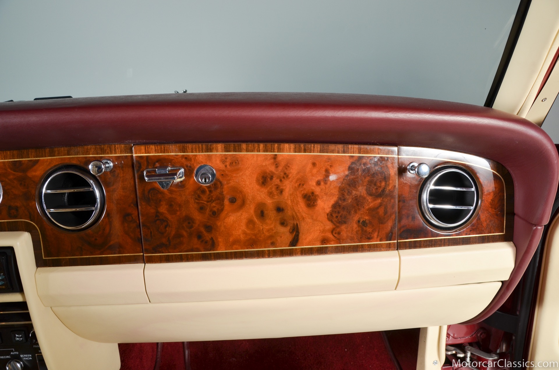 All of these MPW edition cars are finished in Bordeaux red without the Everflex roof. The bumpers and headlight surrounds are color-coded, polished stainless steel bumper inserts, stainless steel body trim running the entire length of the body sills and continuing around both wheel arches and along the lower portions of the rear wings, twin magnolia coachlines, chrome badge bar mounted on the front bumper, unique badge on the boot lid proclaiming the car's coachbuilding lineage, specially selected American burr walnut veneers, and complemented by silver inlays and Rolls-Royce monograms.